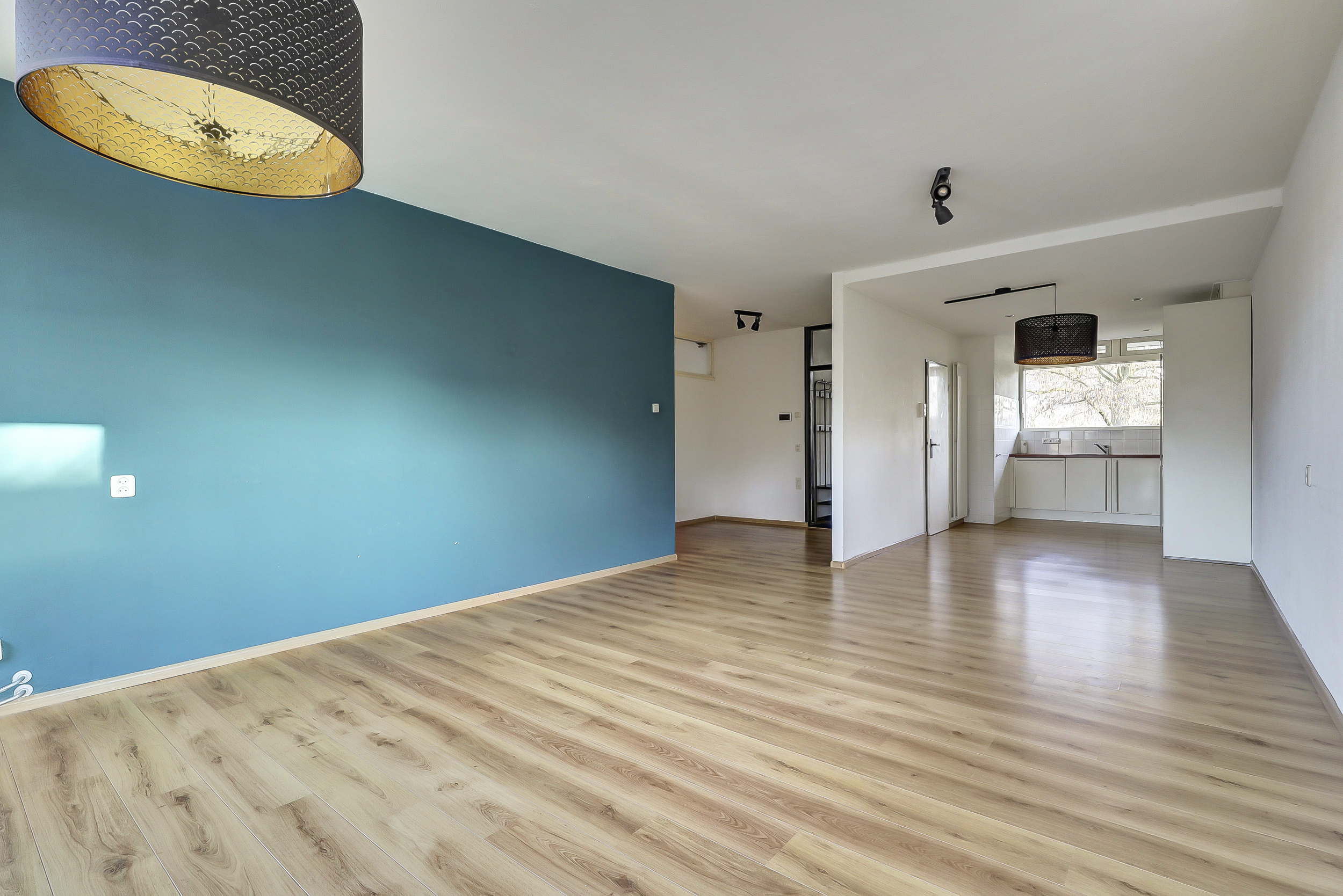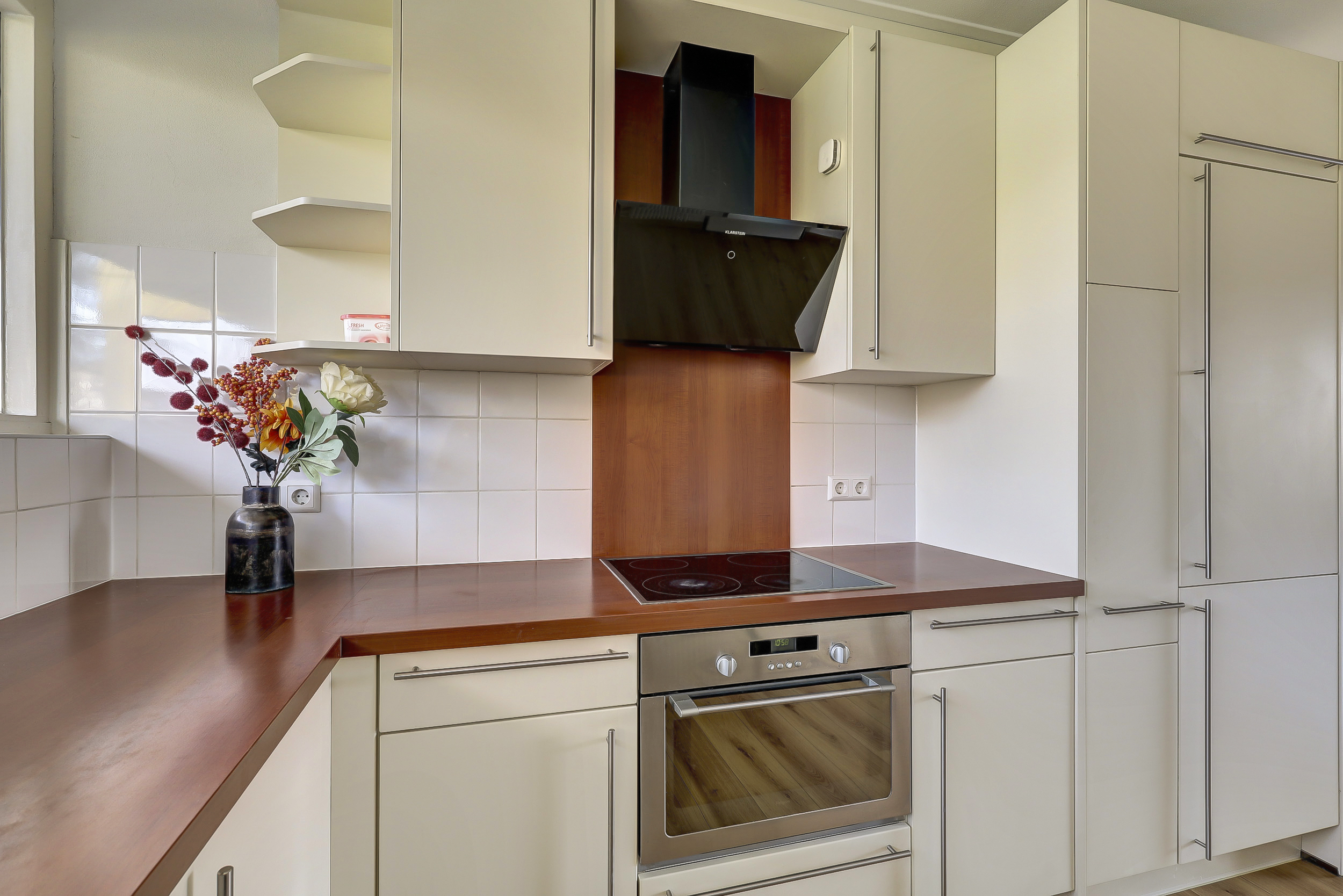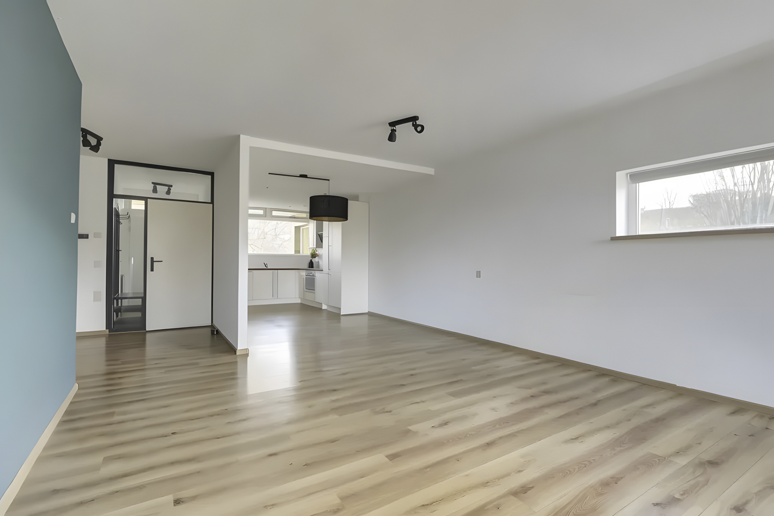De ruime woonkamer vormt het hart van het appartement en biedt volop plek voor zowel een comfortabele zithoek als een eethoek. , De open keuken sluit hier direct op aan en is uitgevoerd in een hoekopstelling met inbouwapparatuur, waardoor koken en wonen prettig samenkomen.