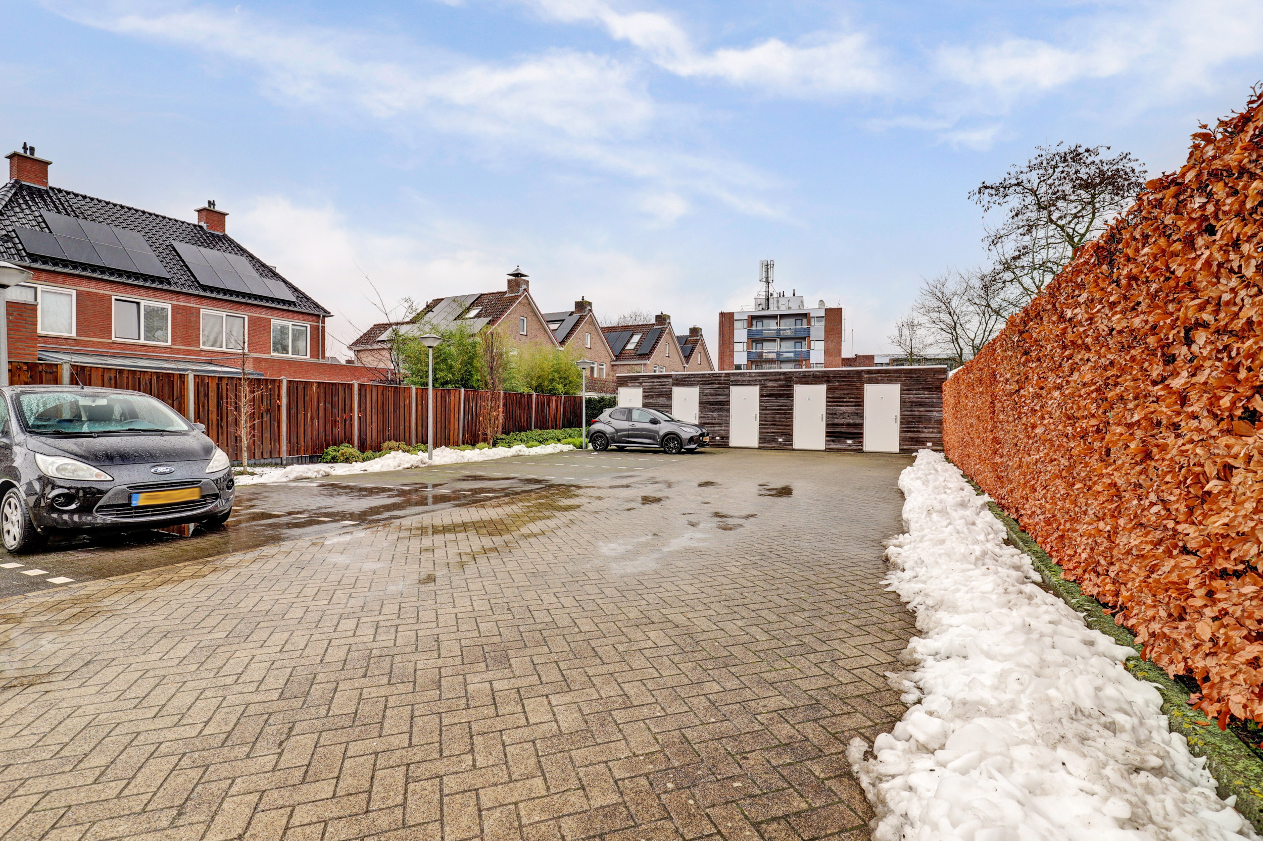 Op het terrein van het complex tref je de separate berging van ca. 4 m² en een eigen parkeerplaats. Ook voor gasten zijn er parkeerplaatsen beschikbaar.