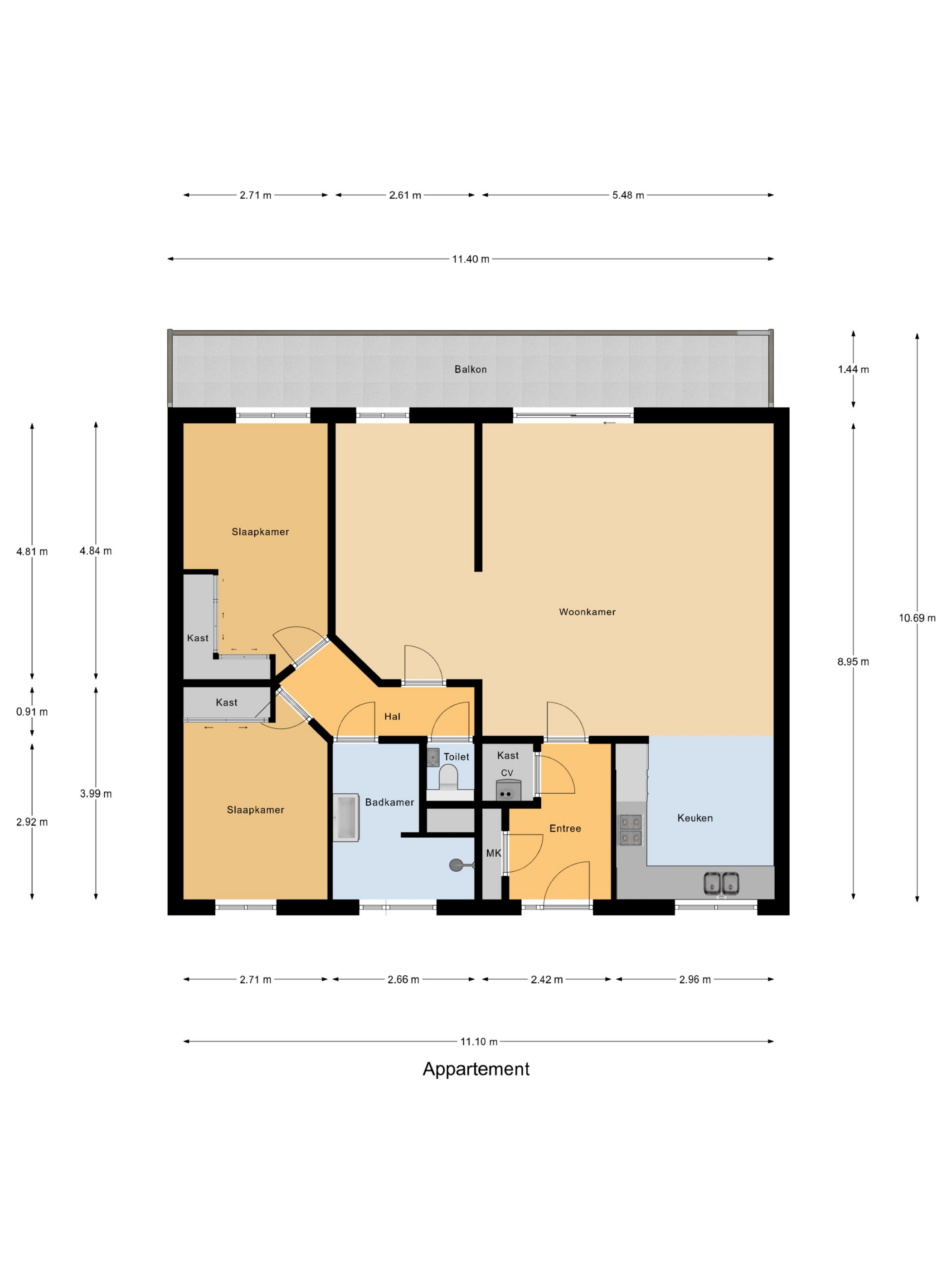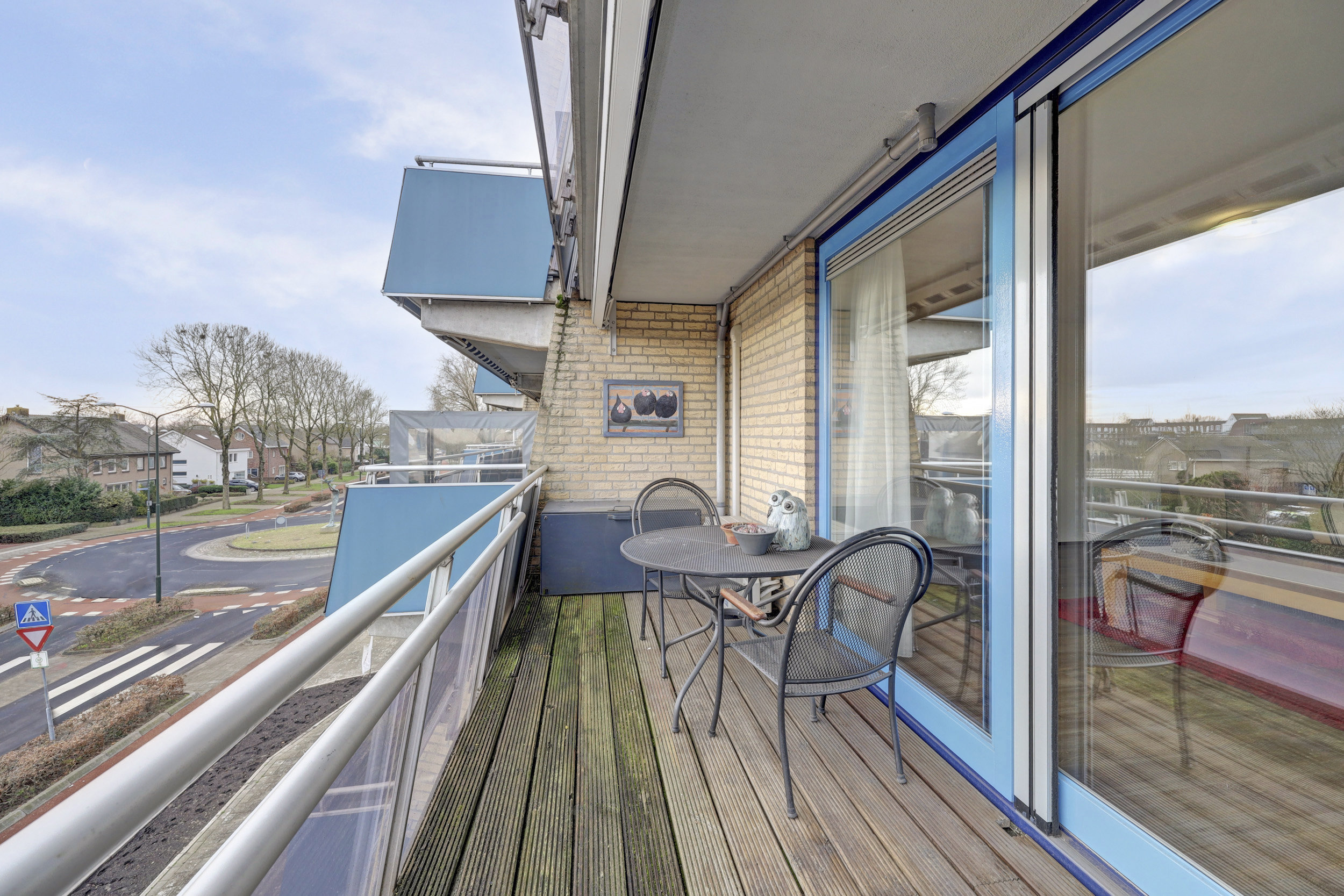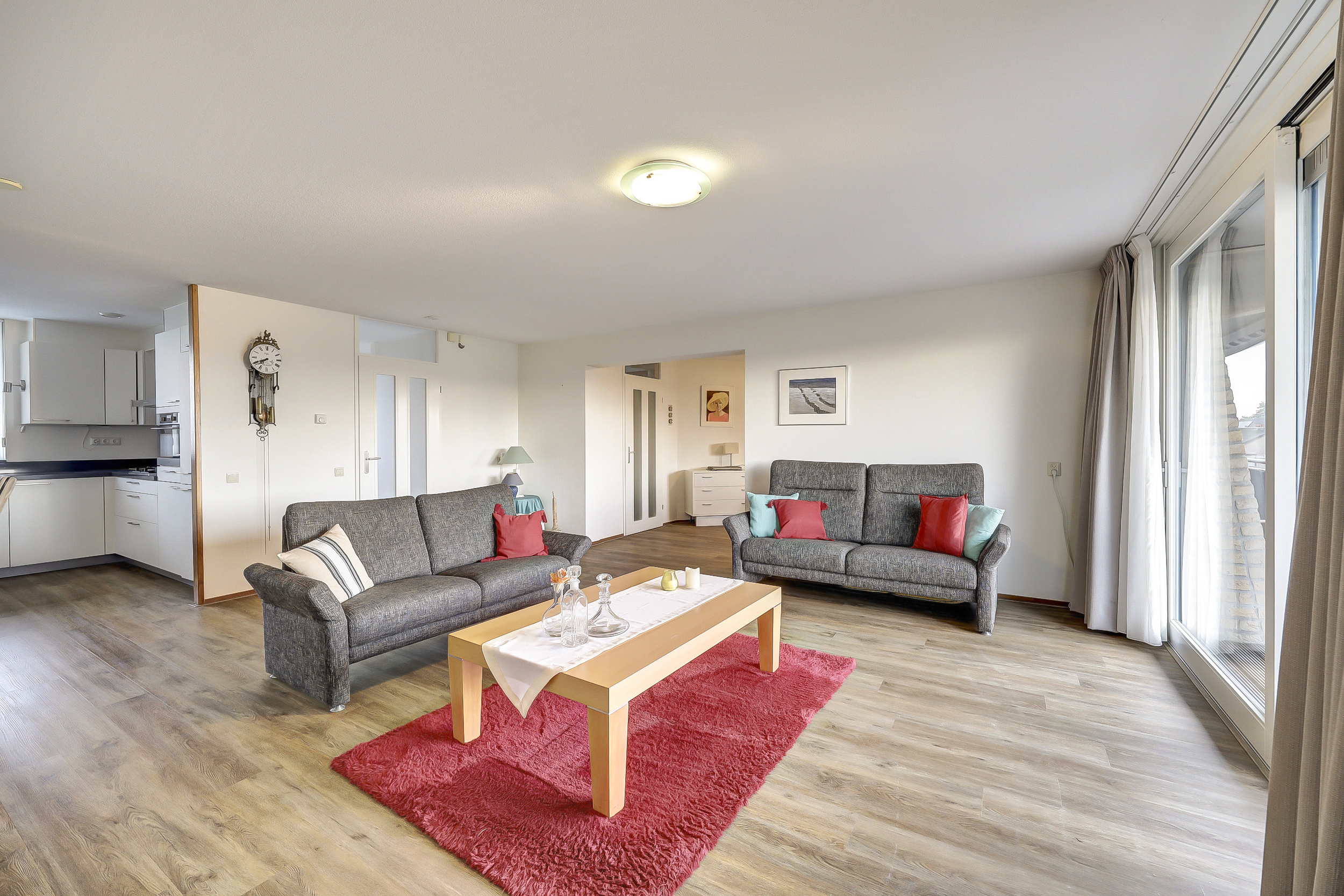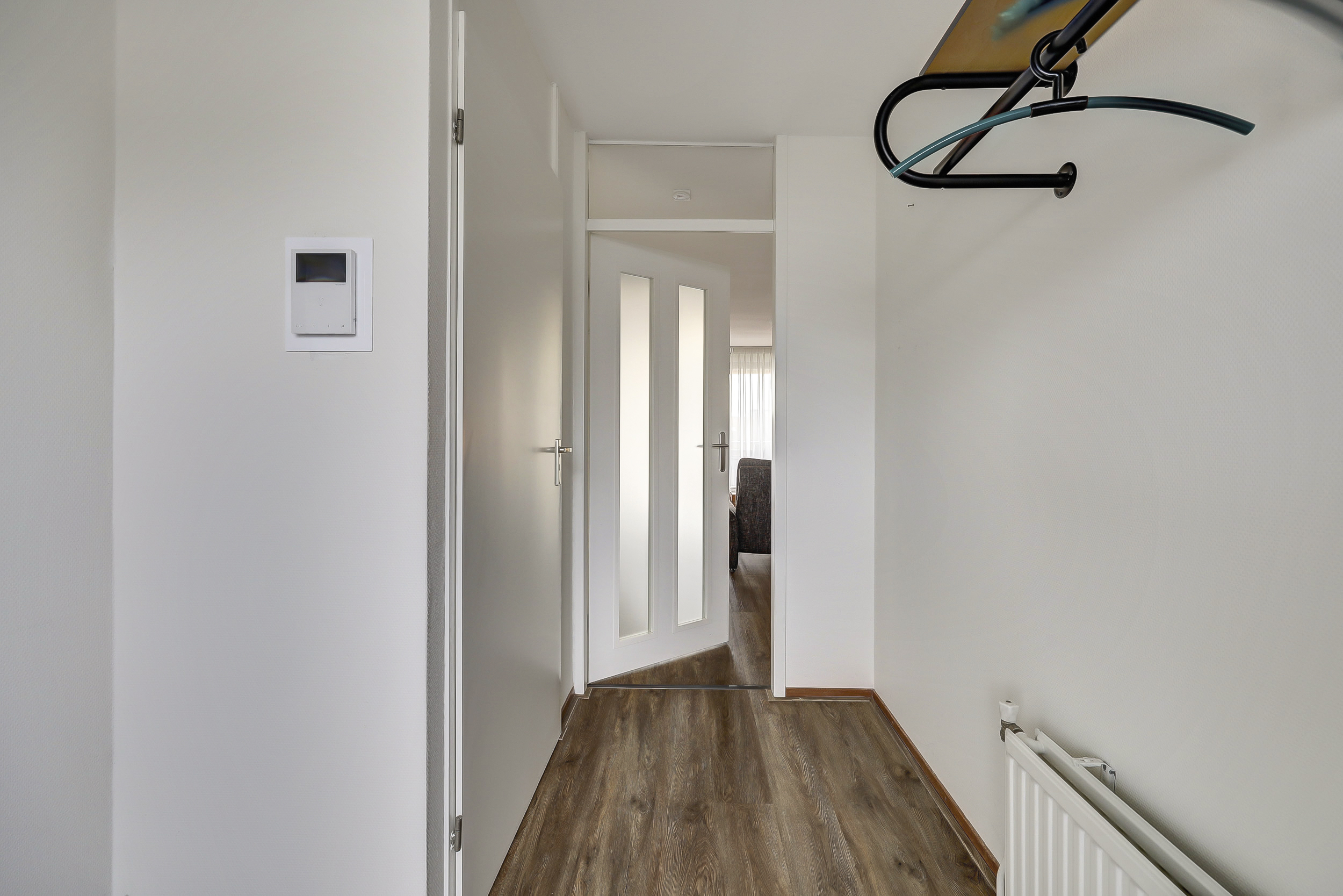 Je komt binnen in een ruime hal met meterkast en garderobe. Aansluitend een praktische provisieruimte met de cv-opstelling (Intergas HRE, 2023, eigendom). De woonkamer is licht en ruim en staat in directe verbinding met het balkon via een grote schuifpui. Het balkon ligt op het oosten, is over de volle breedte van het appartement uitgevoerd en voorzien van twee zonneschermen: een fijne plek om al vroeg van de zon te genieten.