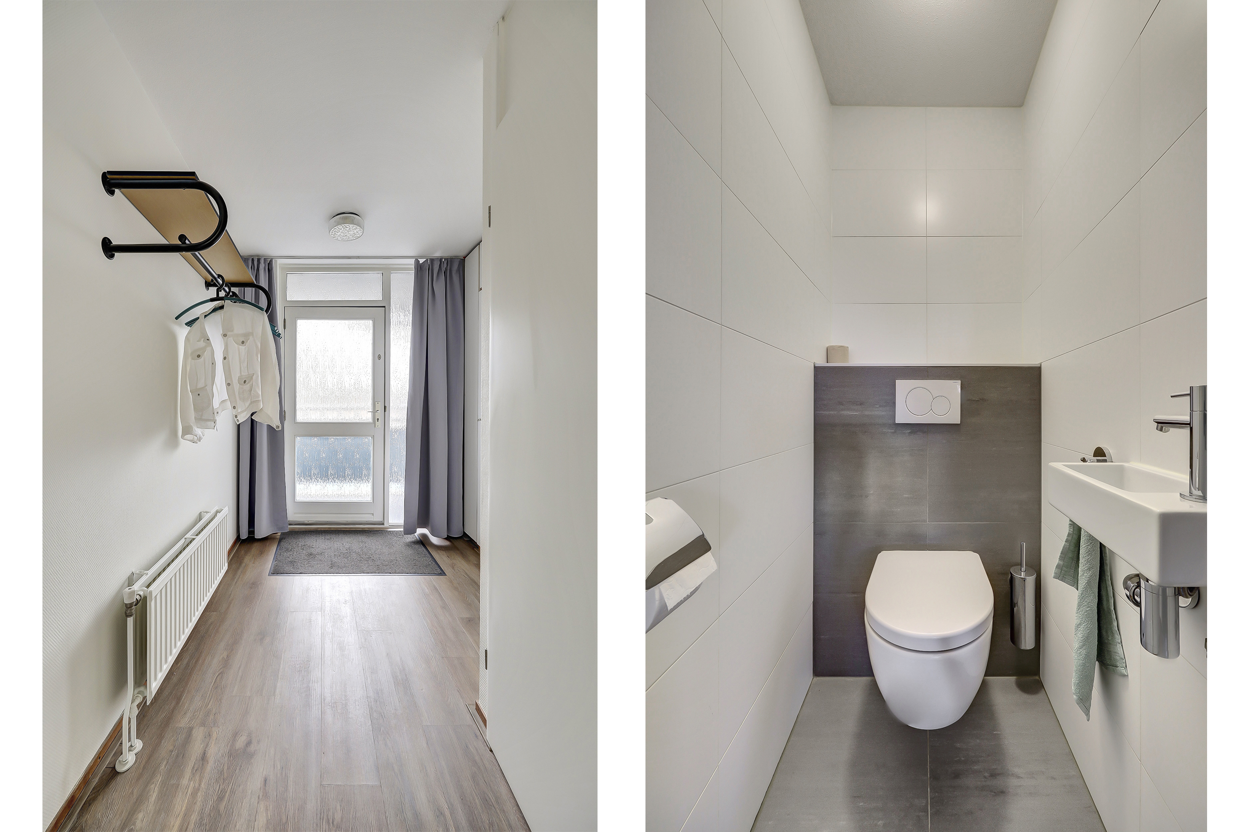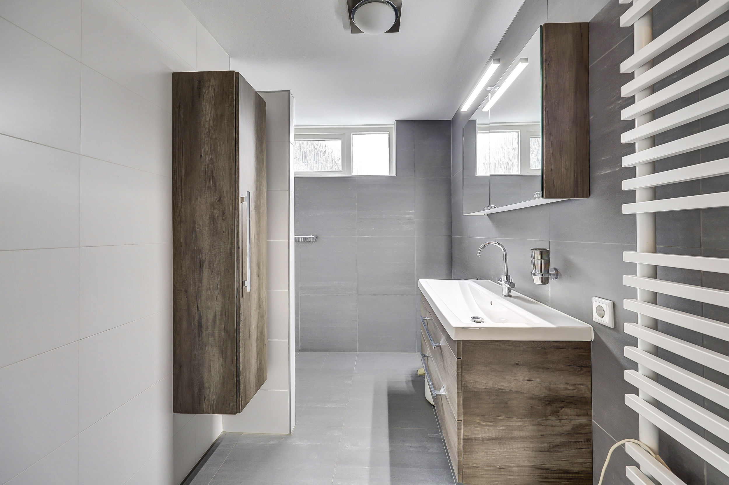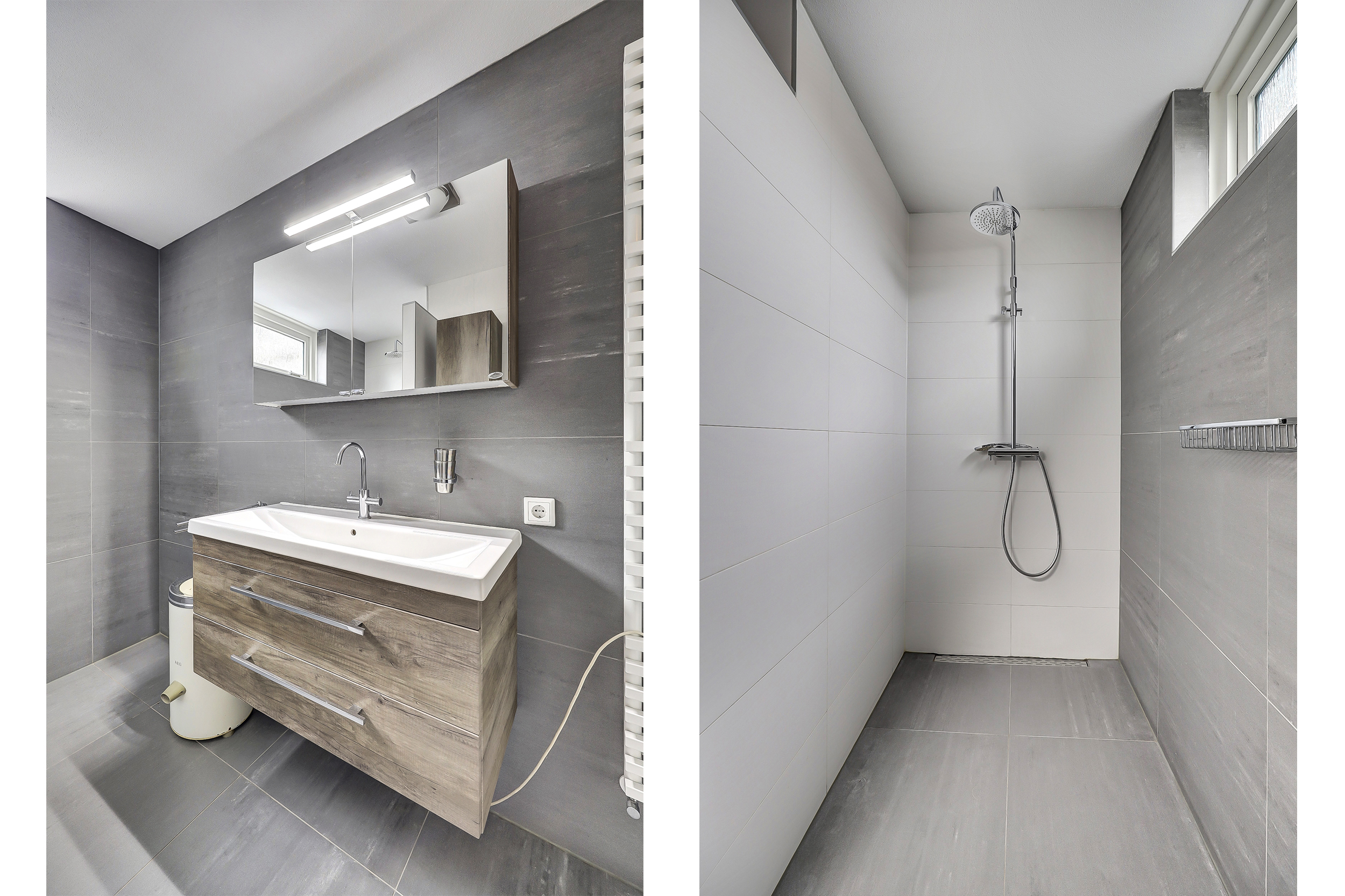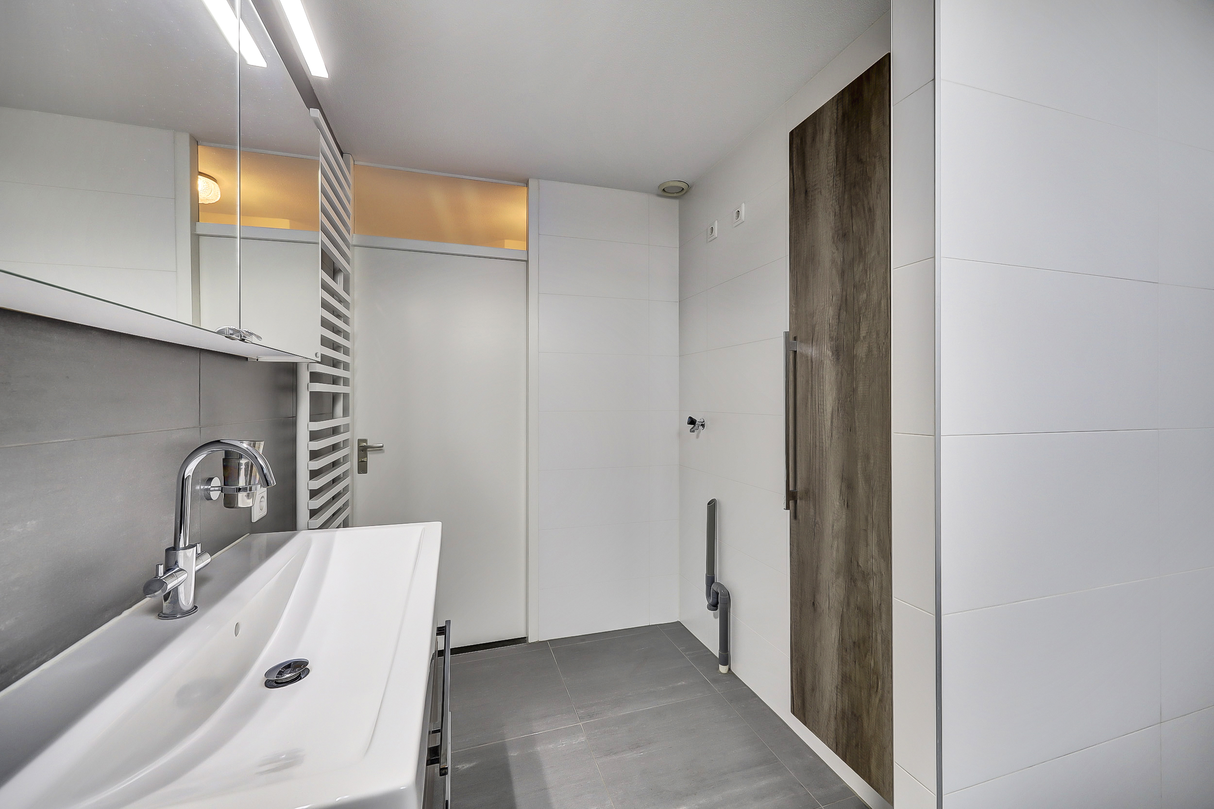 De moderne badkamer (2015) is uitgevoerd met een inloopdouche, wastafelmeubel en aansluitingen voor witgoed. Daarnaast is er een separate toiletruimte met een vrij hangend toilet en fonteintje.