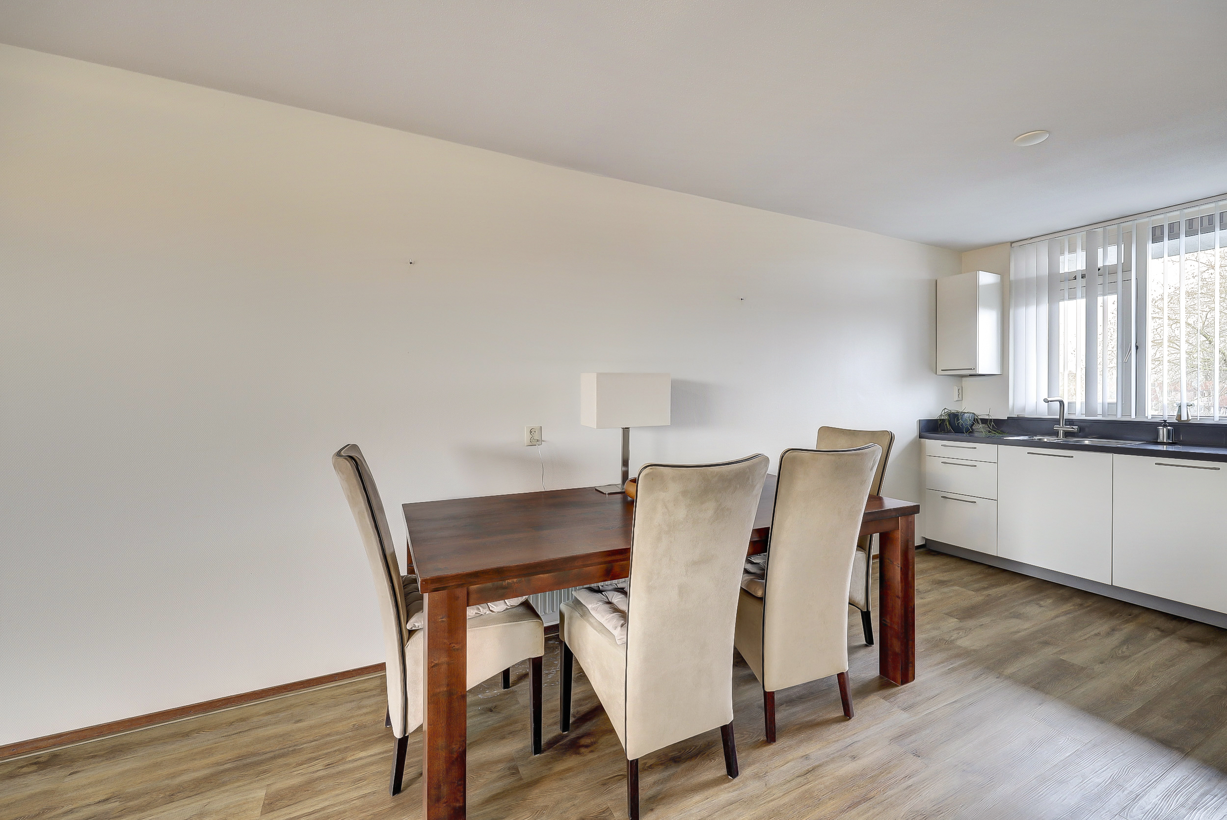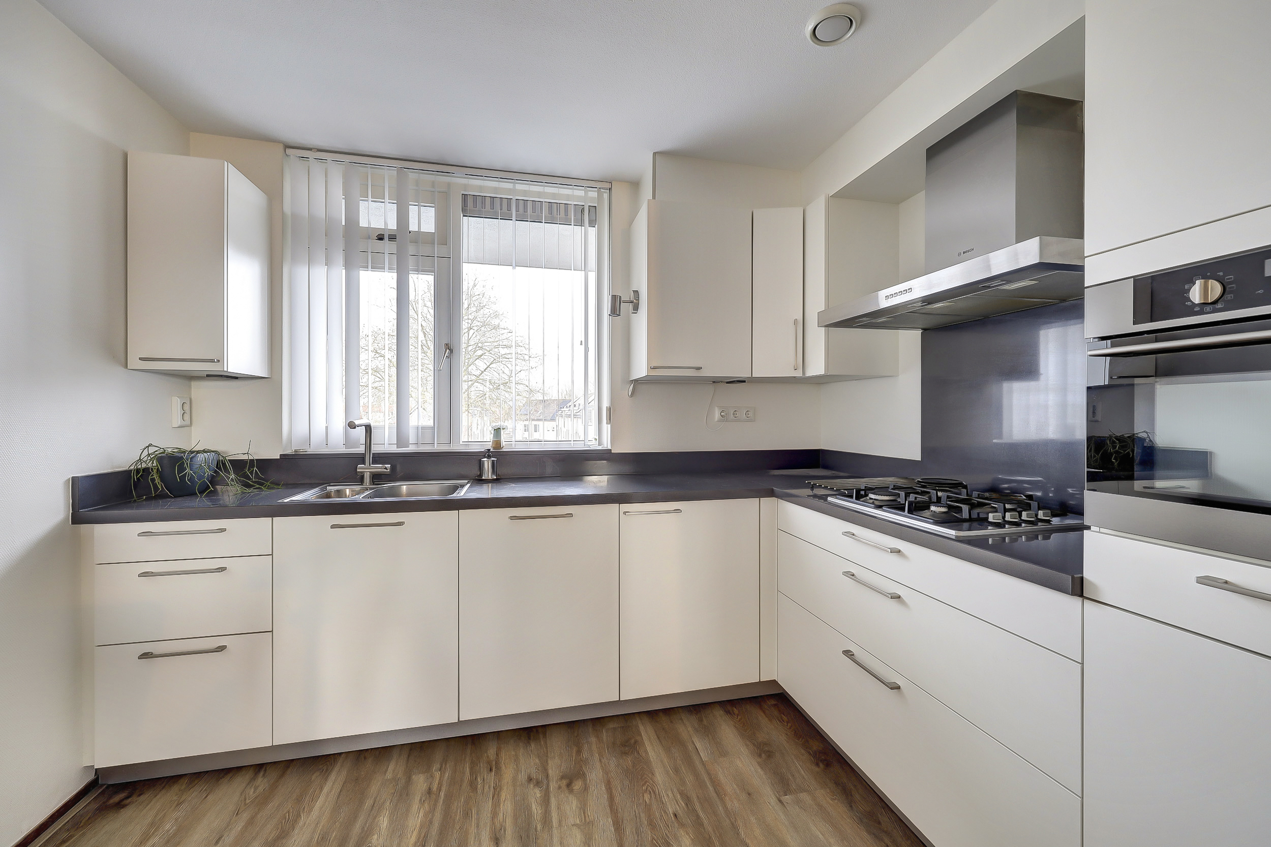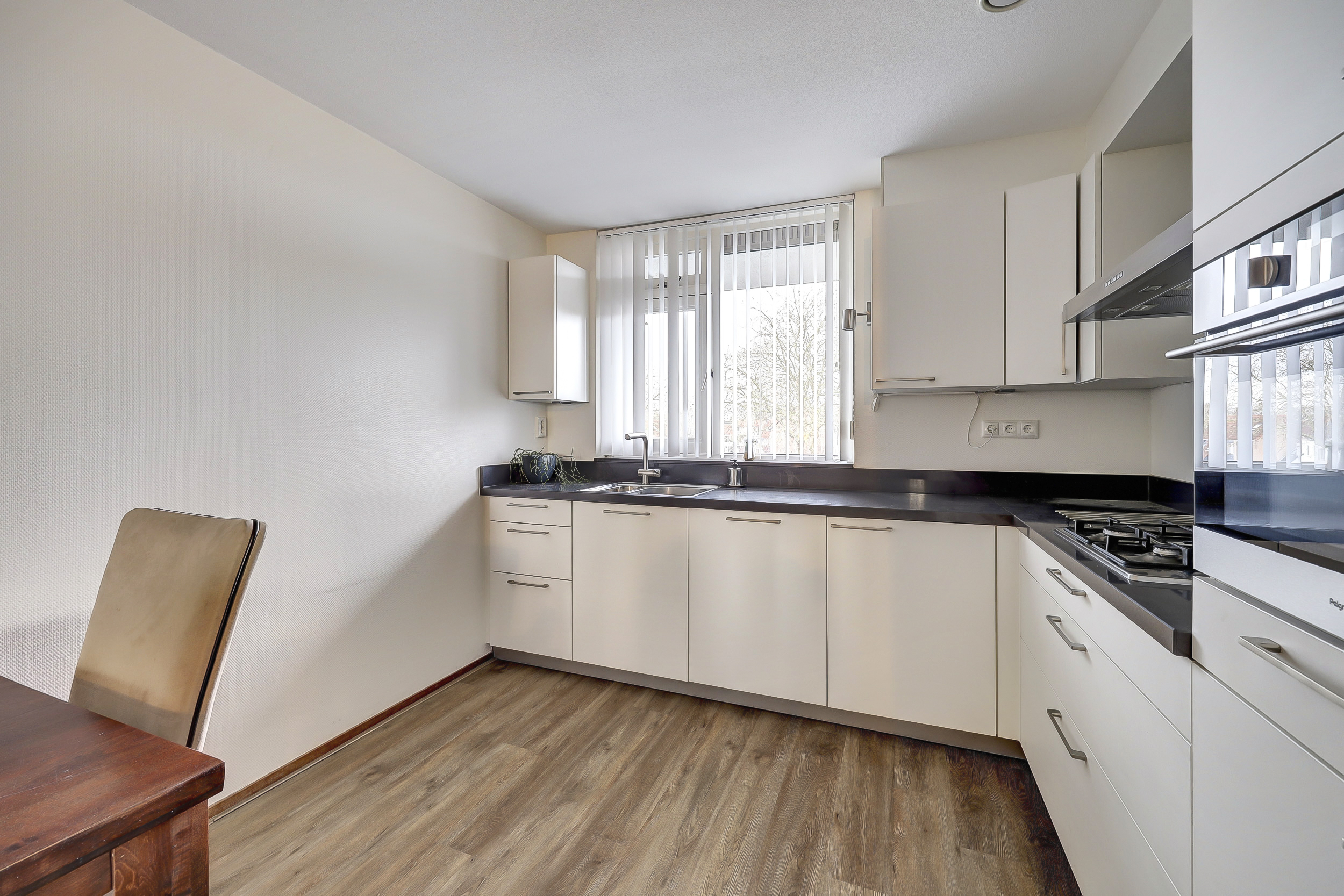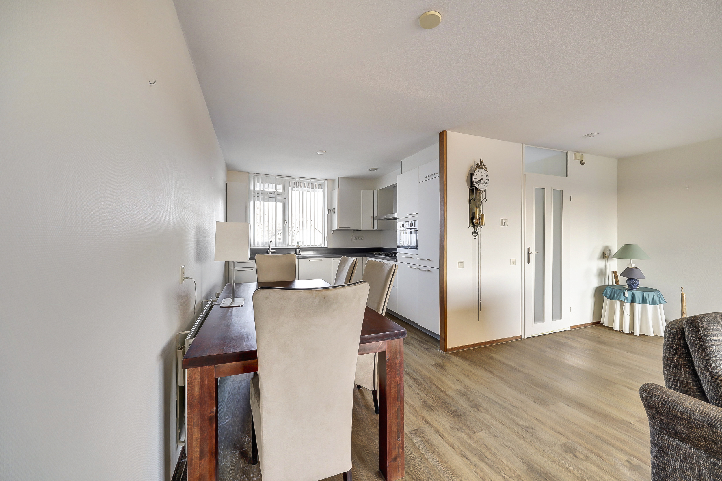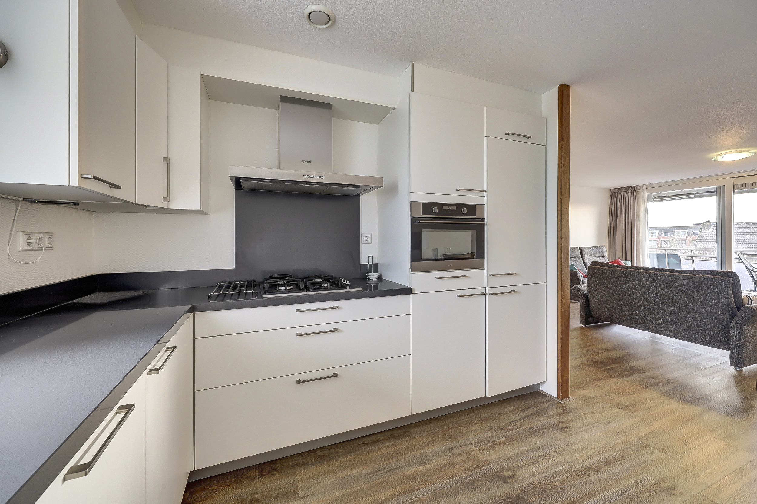 De open, moderne keuken (2015) bevindt zich aan de voorzijde van het appartement en is compleet uitgerust met een 4-pits gaskookplaat, afzuigkap, combimagnetron, koelkast, vriezer, vaatwasser en voldoende kastruimte. Direct grenzend aan de woonkamer is een aparte eetkamer gesitueerd, waardoor wonen en eten prettig van elkaar zijn gescheiden.