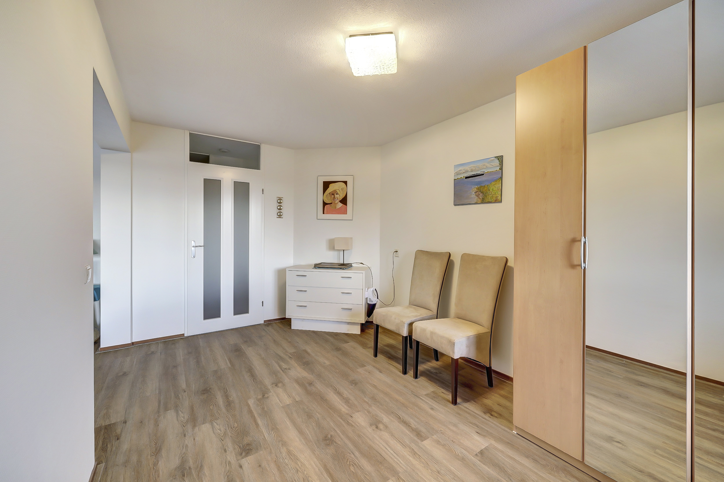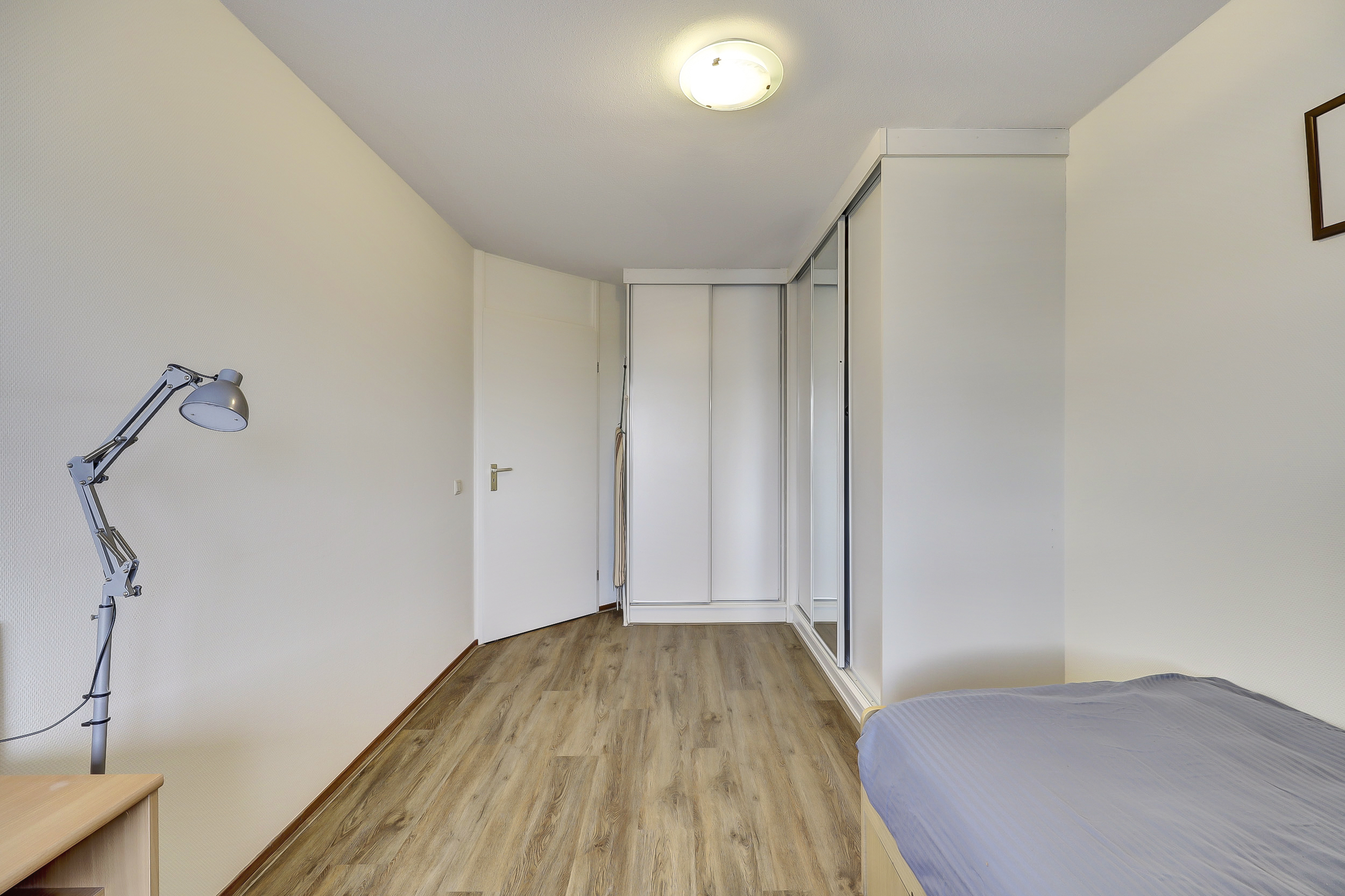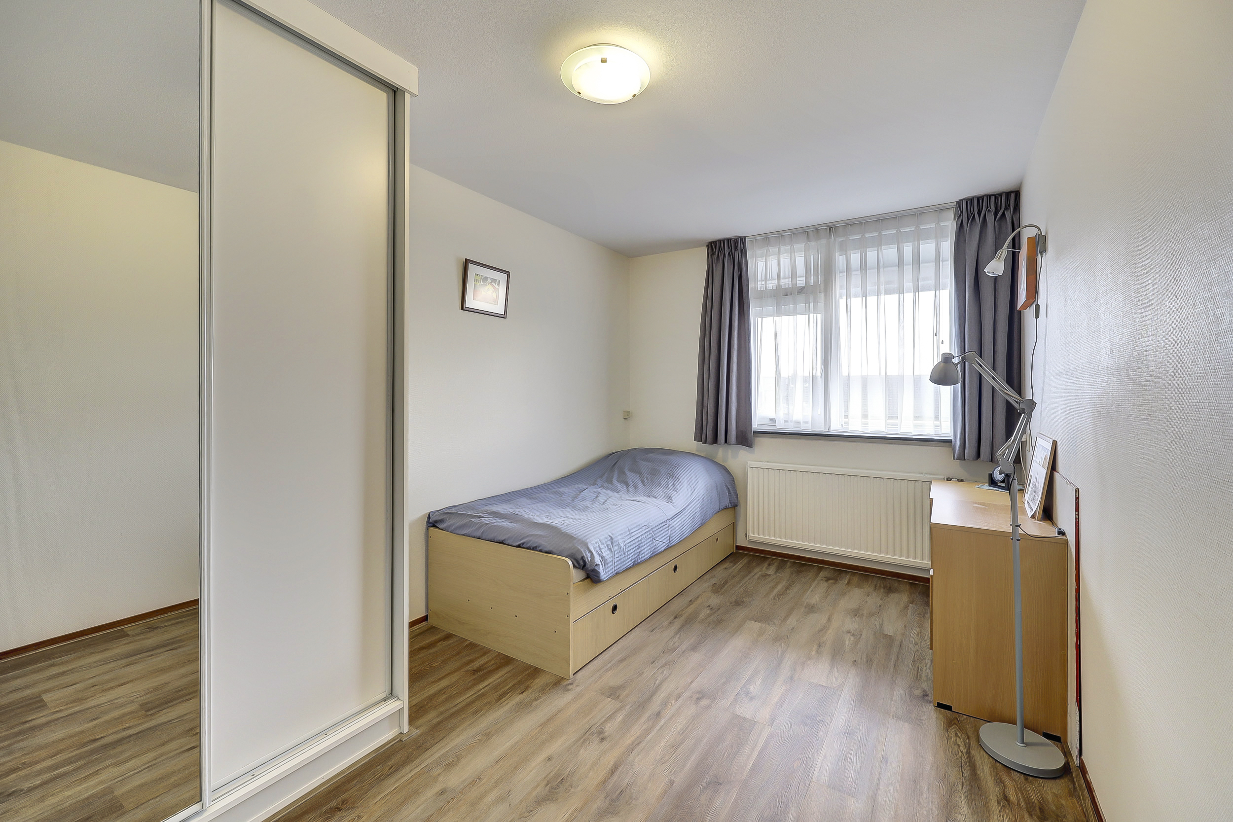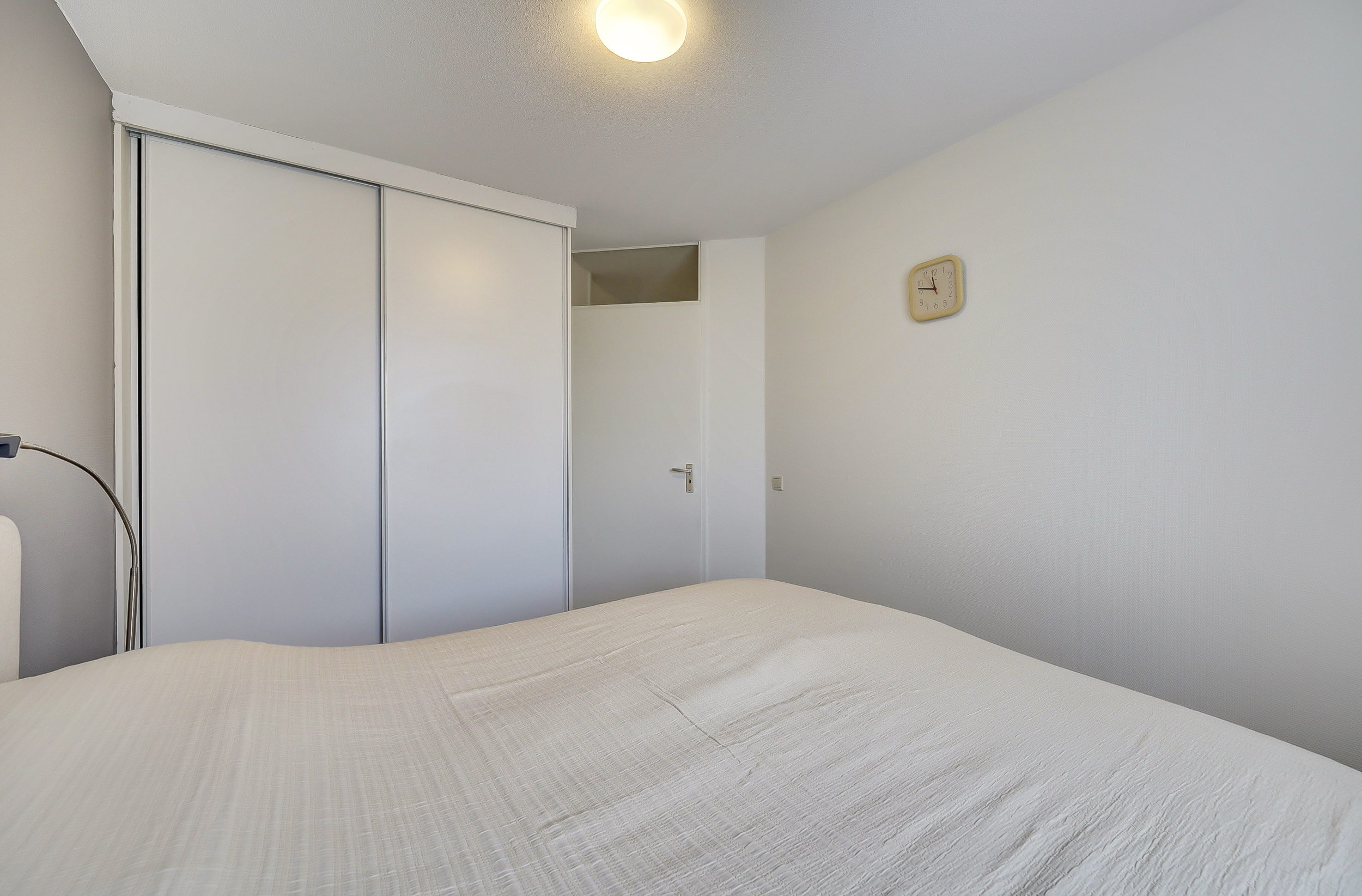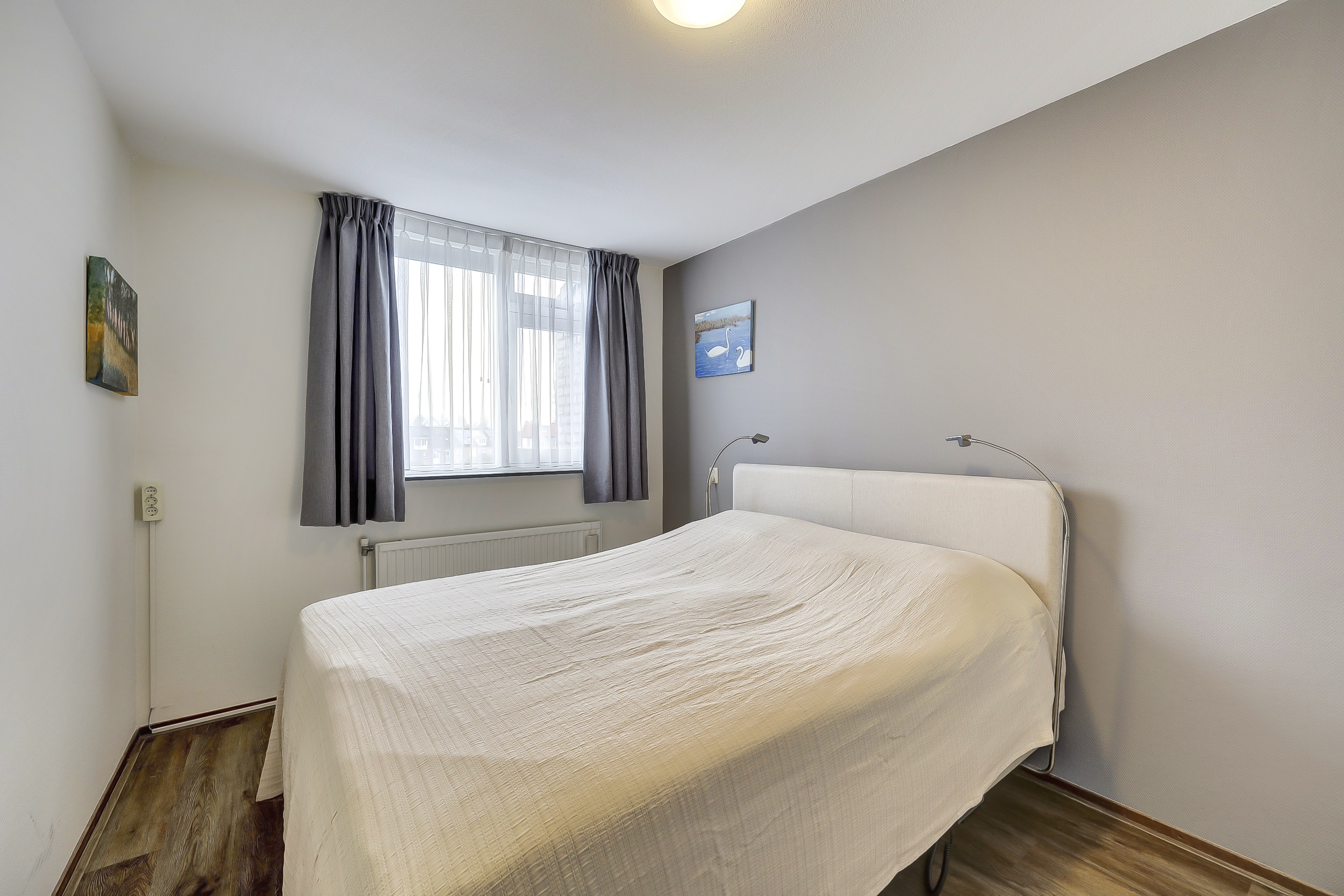 Via een tussenhal bereik je de twee slaapkamers, beide van goed formaat en voorzien van praktische kastruimte. Met een creatieve indeling is zelfs een derde slaapkamer te realiseren, waarbij de woonkamer iets compacter wordt.