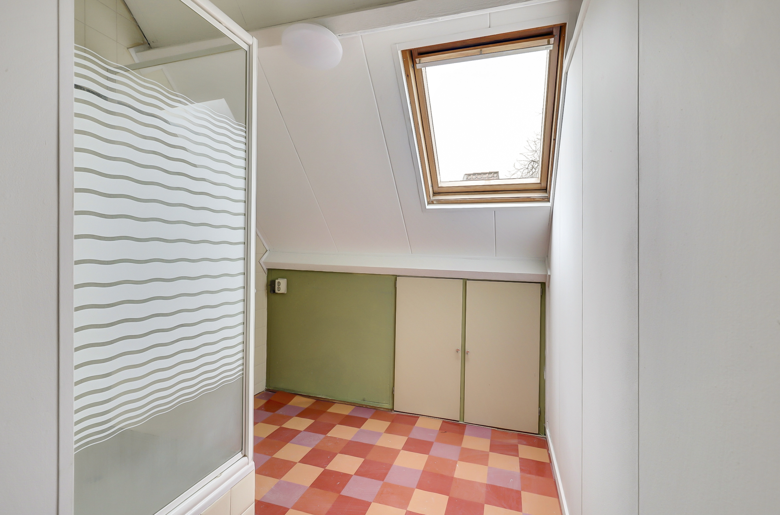 Boven vind je een ruime slaapkamer met voldoende lichtinval en zichtlijnen naar de omgeving. Daarnaast vind je hier de badkamer met douche en vaste wastafel, en een bergkast waar de cv-ketel (Nefit, 2020) is geplaatst.