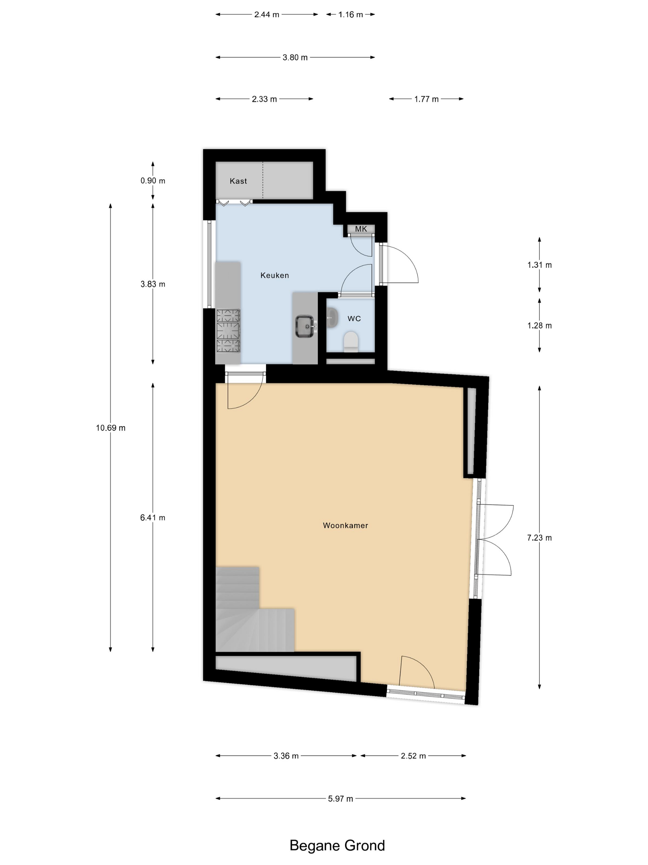 De begane grond opent zich met een sfeervolle woonkamer met openslaande deuren naar de zonnige stadstuin. Hier stroomt het daglicht binnen en loopt het binnenleven moeiteloos over in buiten. Verder geeft deze ruimte toegang tot een dichte keuken en separaat toilet. In de tuin ligt een bijgebouw van maar liefst ca. 39 m² welke is verdeeld in twee ruimtes en hierdoor verrassend veel mogelijkheden biedt: werkruimte, atelier, opslag of zelfs een kleine studio, afhankelijk van je plannen. Dankzij de bestemming 'centrum' zijn verschillende combinaties van wonen en werken toegestaan.