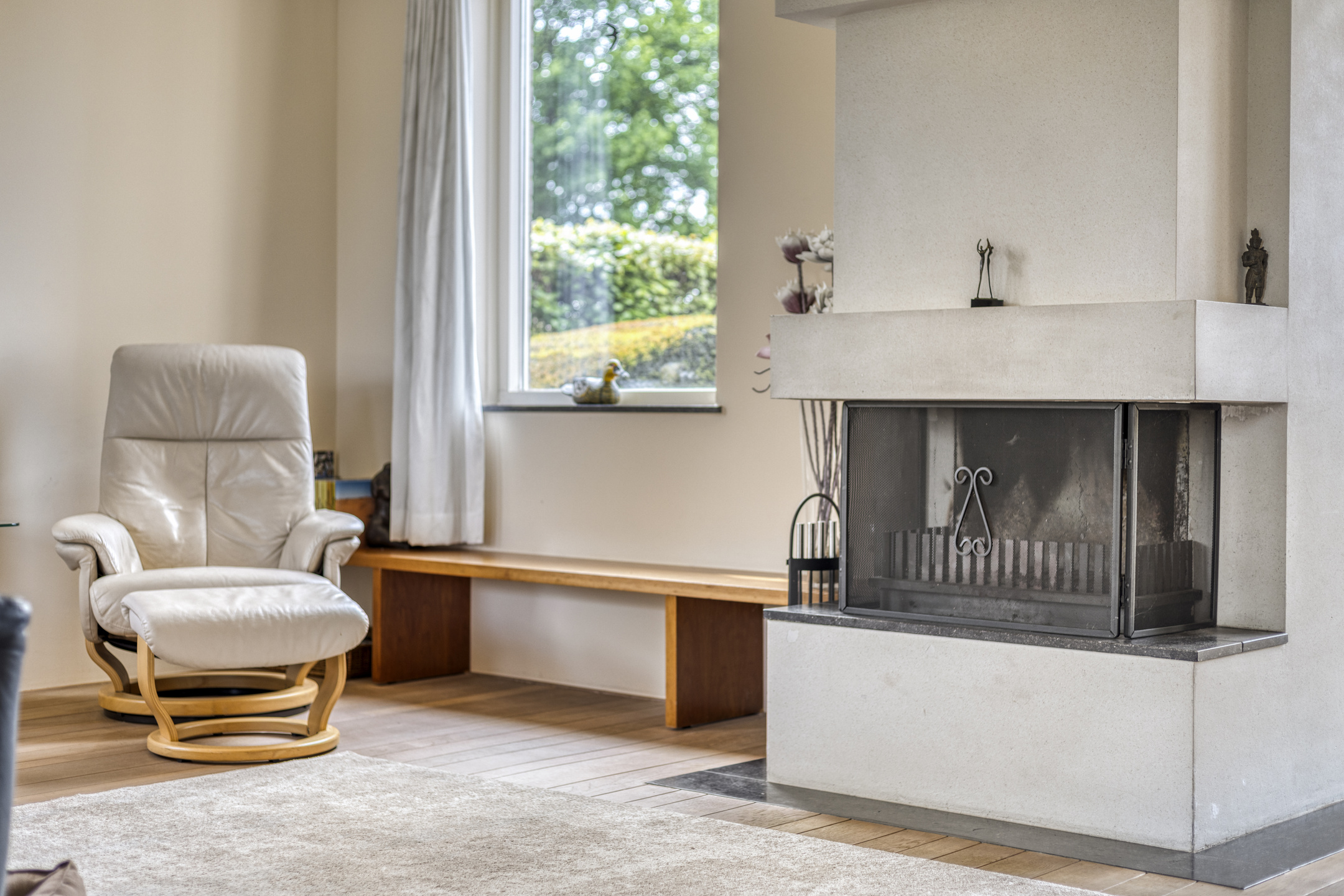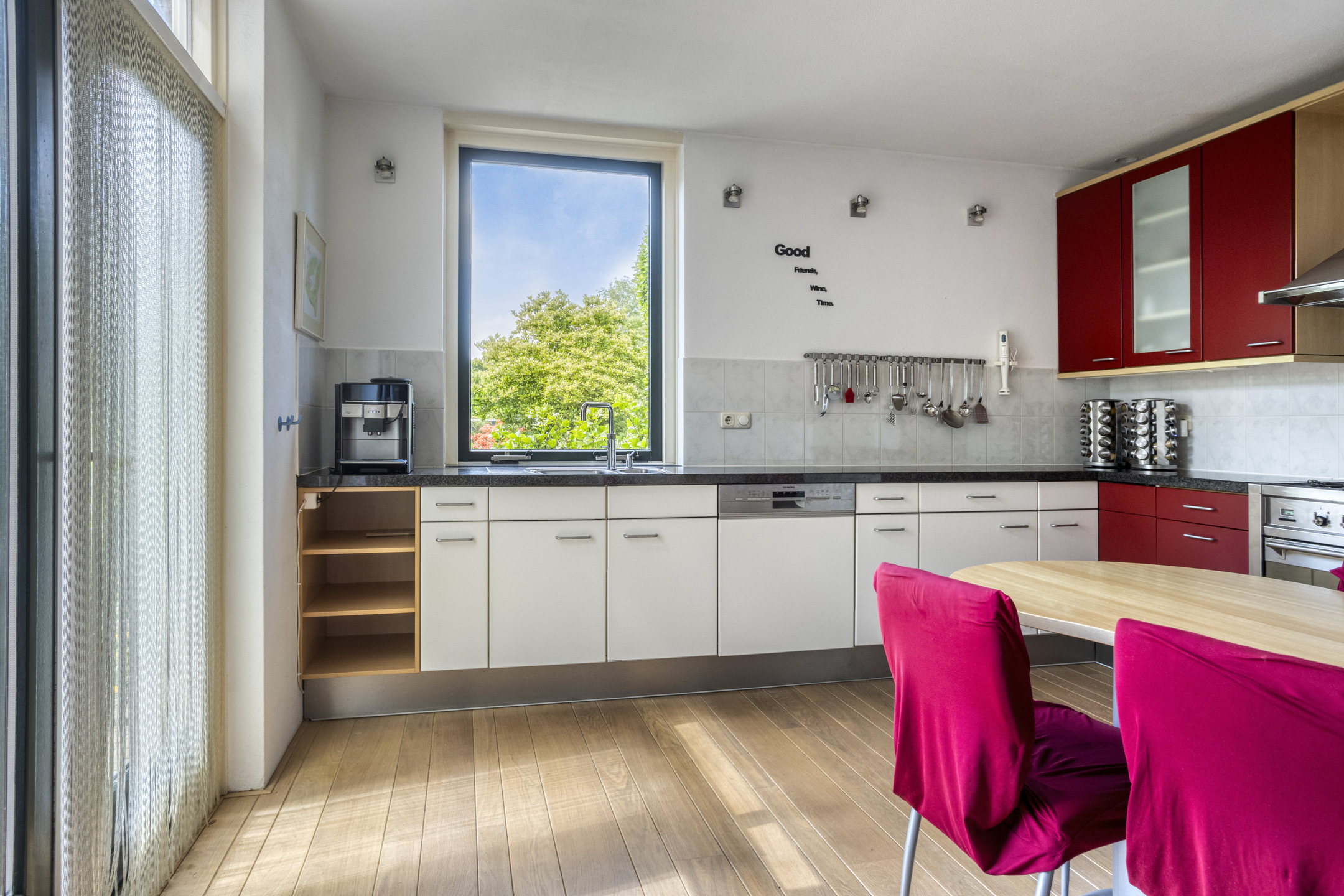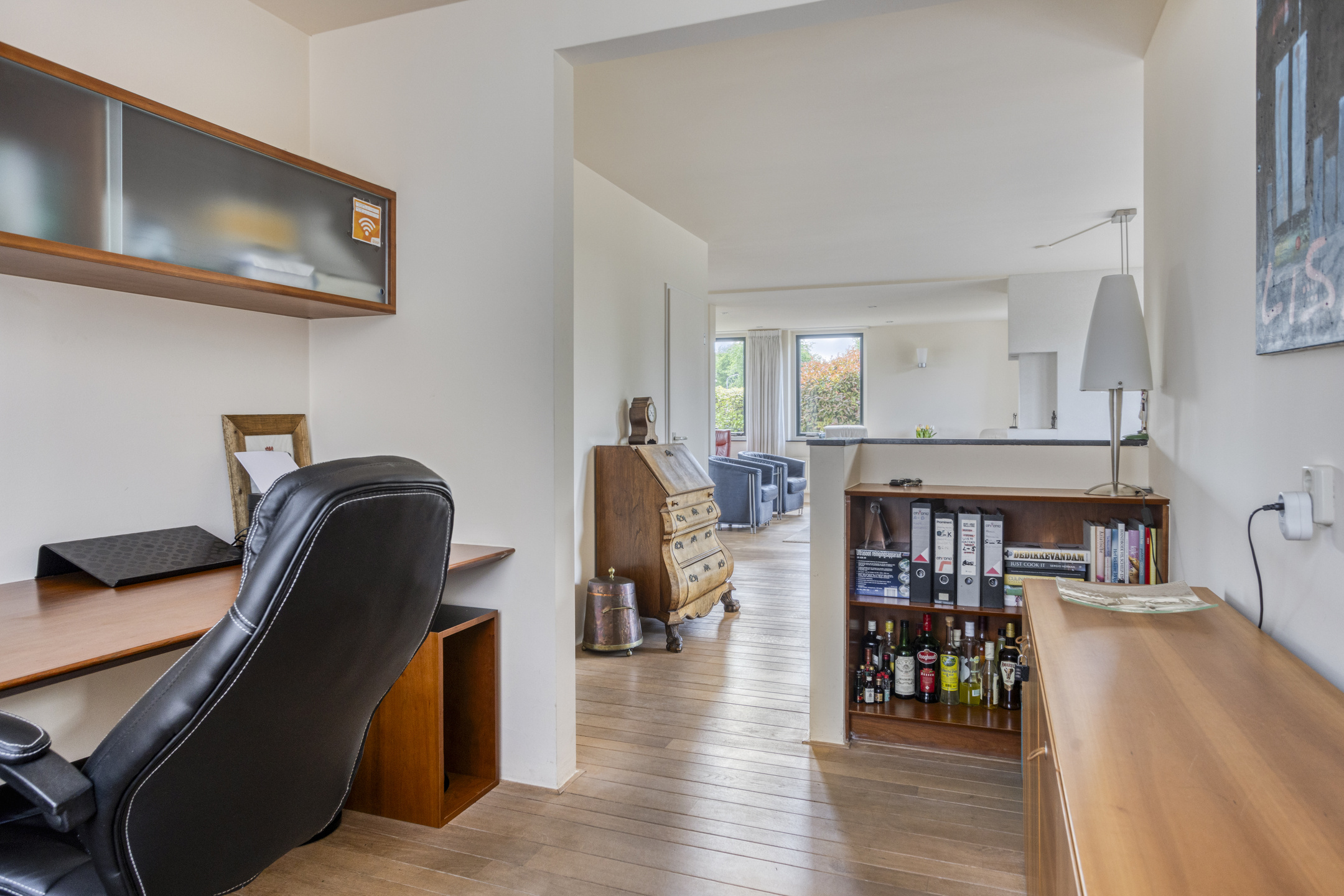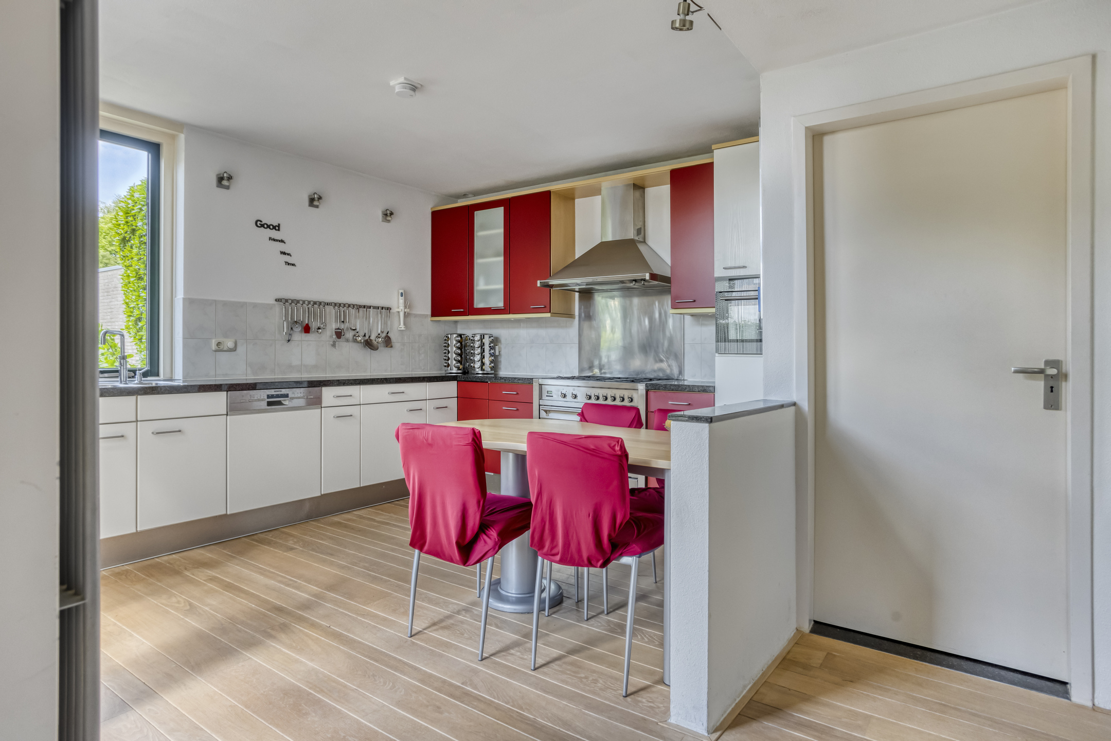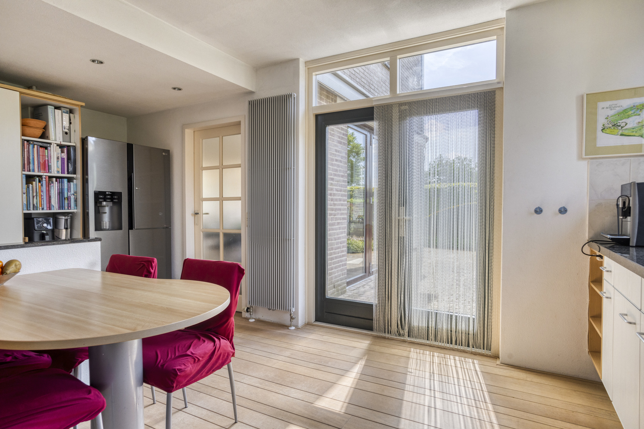 De houthaard en massief houten vloer zorgen daarbij voor een prettige sfeer. Aangrenzend bevindt zich een halfopen werkkamer – perfect als thuiswerkplek of speelkamer en indien gewenst eenvoudig af te sluiten. De dichte keuken is voorzien van inbouwapparatuur en van een goed formaat, waardoor hier ook een eettafel in past. Het raam en de openslaande deuren geven toegang en zicht op de verzorgde tuin. Aangrenzend is er nog een praktische bijkeuken waar zich ook de plek van de wasmachine en droger bevindt.