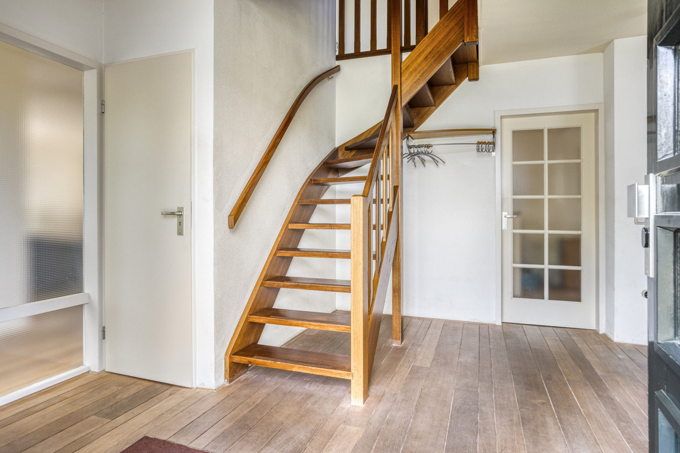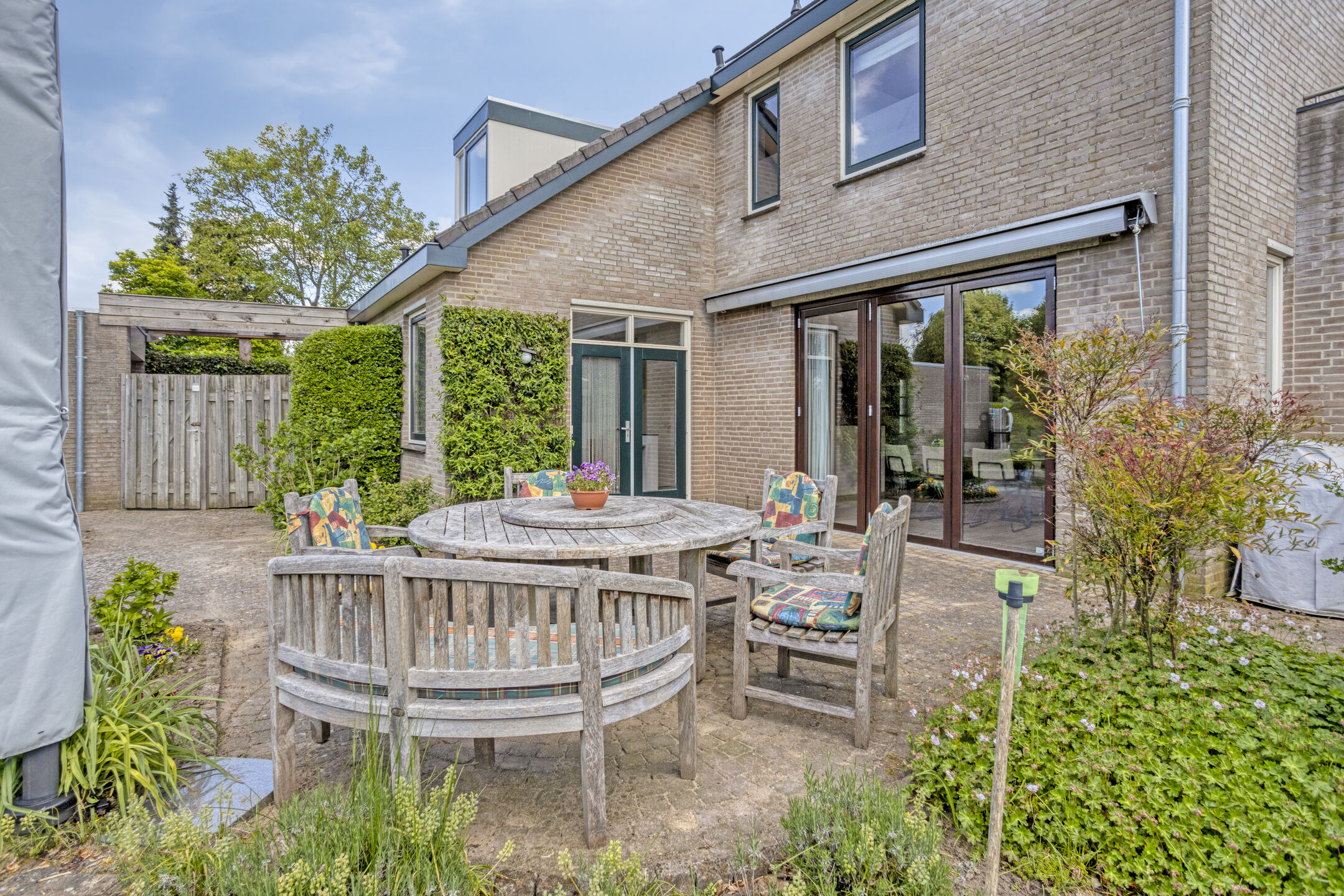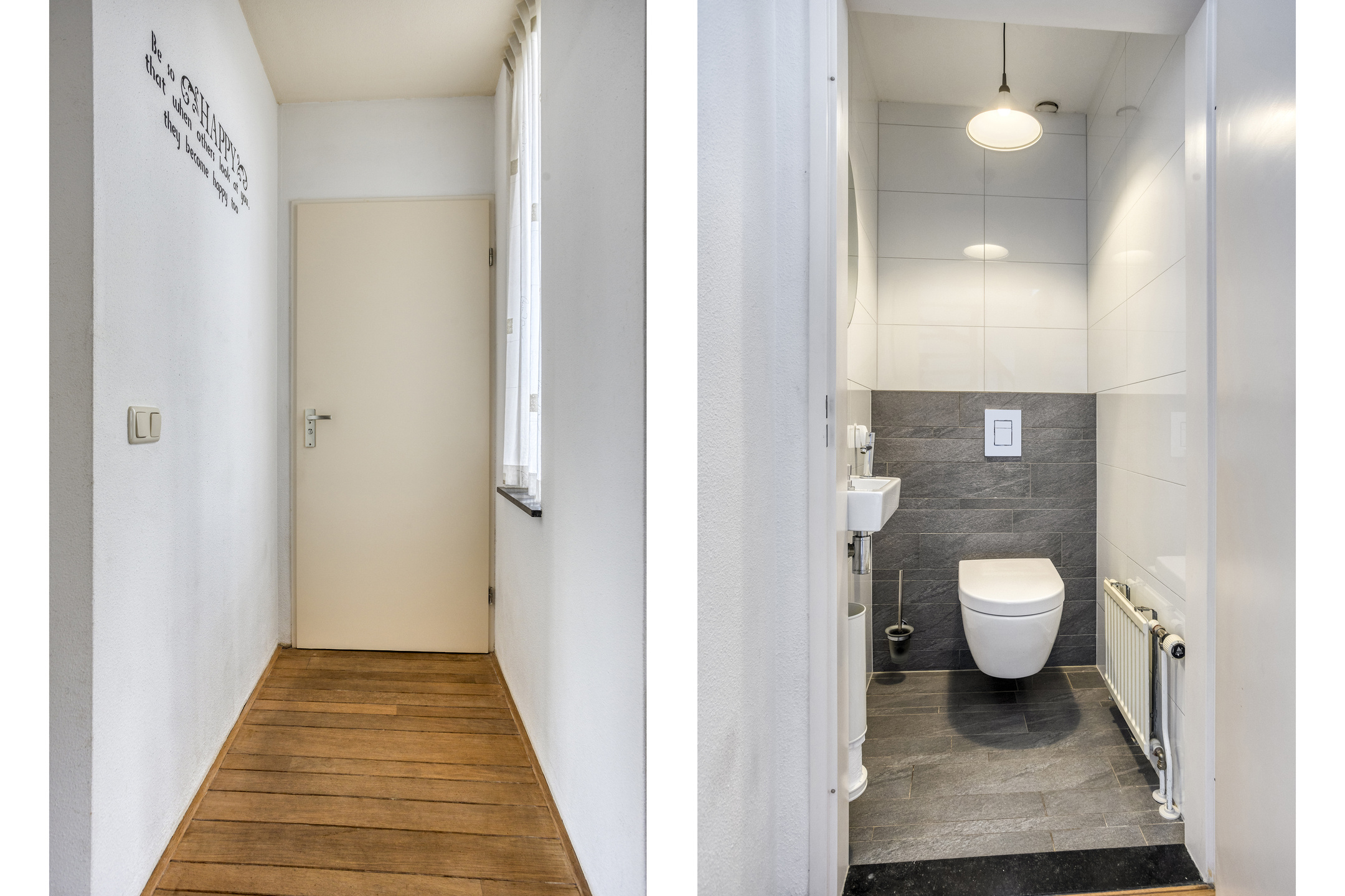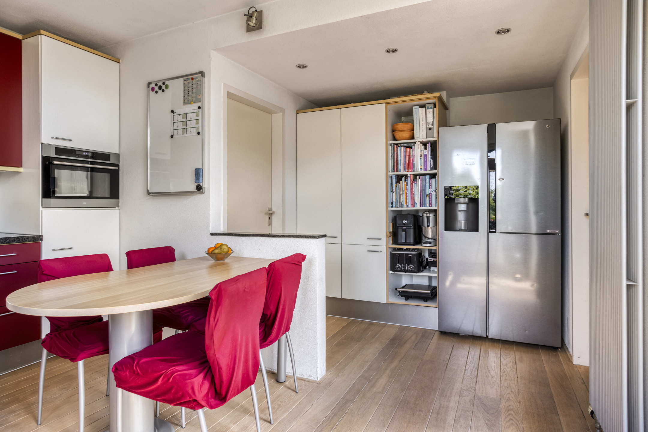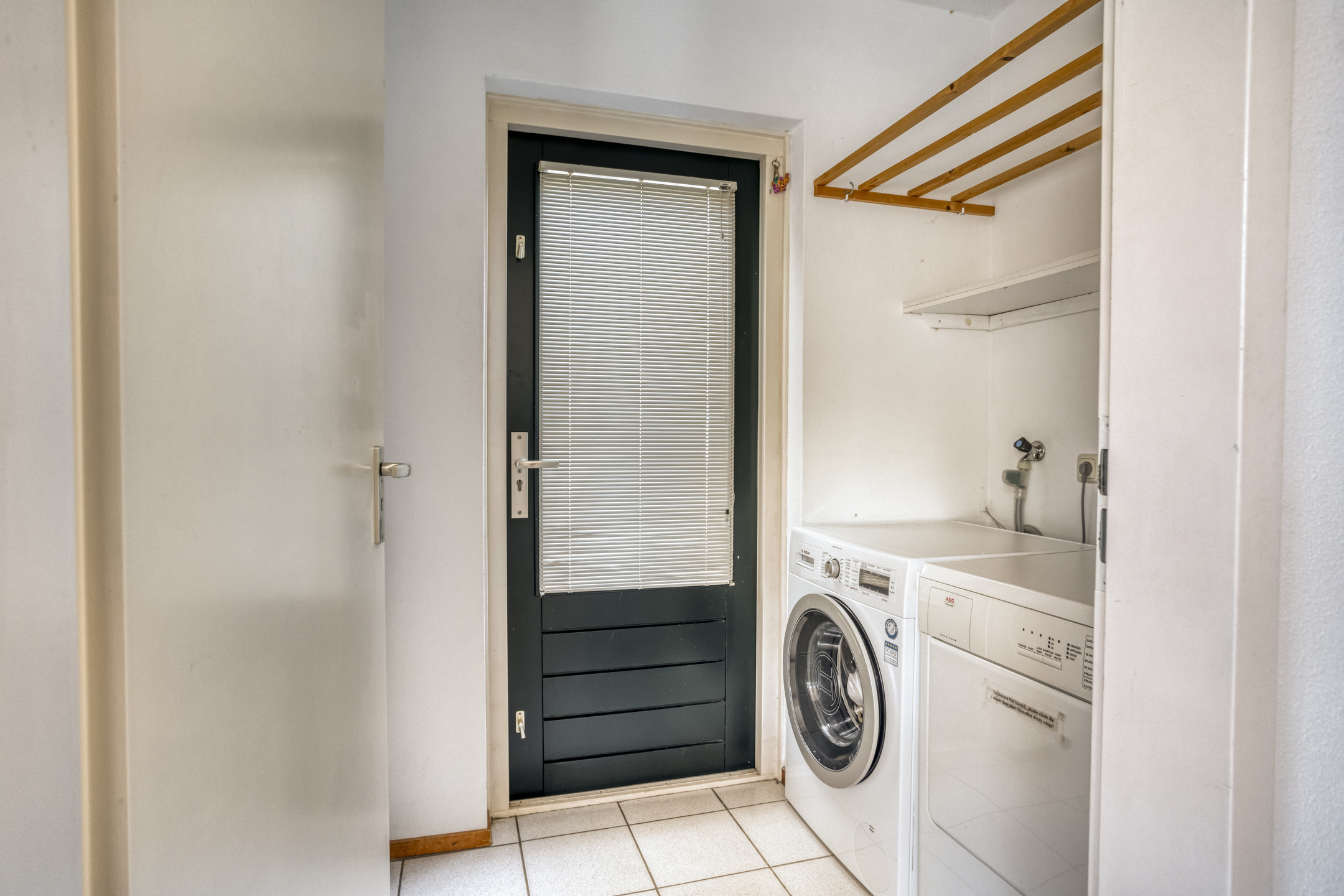 De houthaard en massief houten vloer zorgen daarbij voor een prettige sfeer. Aangrenzend bevindt zich een halfopen werkkamer – perfect als thuiswerkplek of speelkamer en indien gewenst eenvoudig af te sluiten. De dichte keuken is voorzien van inbouwapparatuur en van een goed formaat, waardoor hier ook een eettafel in past. Het raam en de openslaande deuren geven toegang en zicht op de verzorgde tuin. Aangrenzend is er nog een praktische bijkeuken waar zich ook de plek van de wasmachine en droger bevindt.
