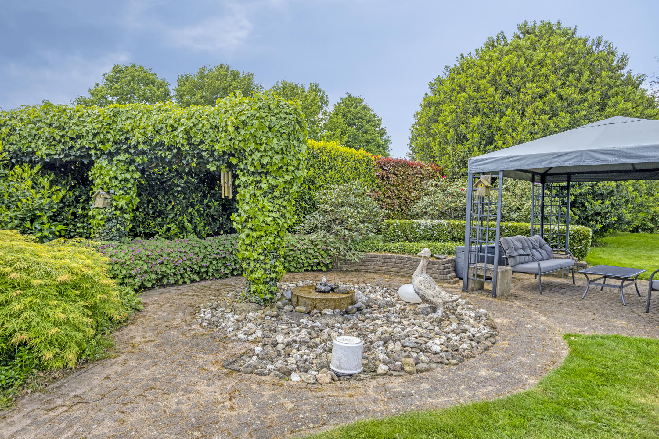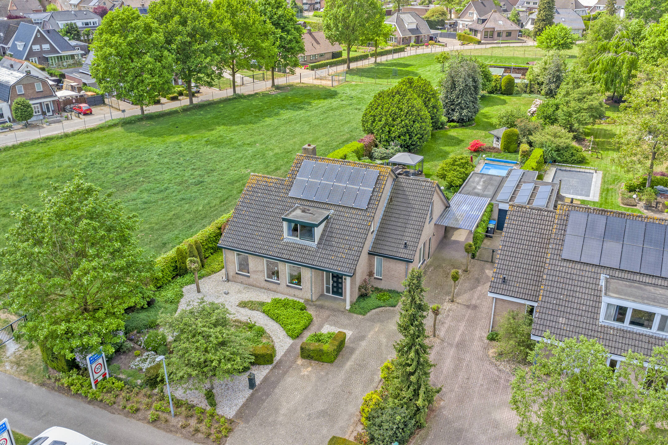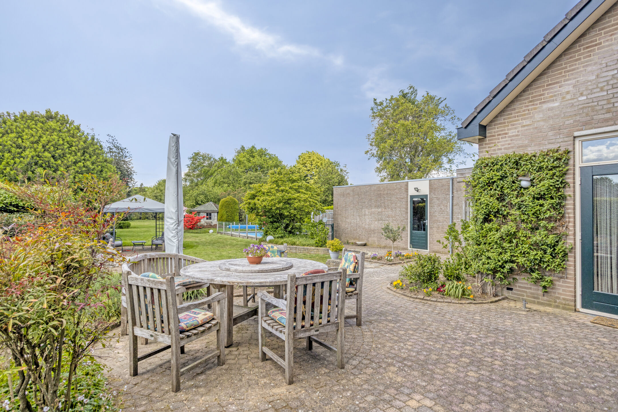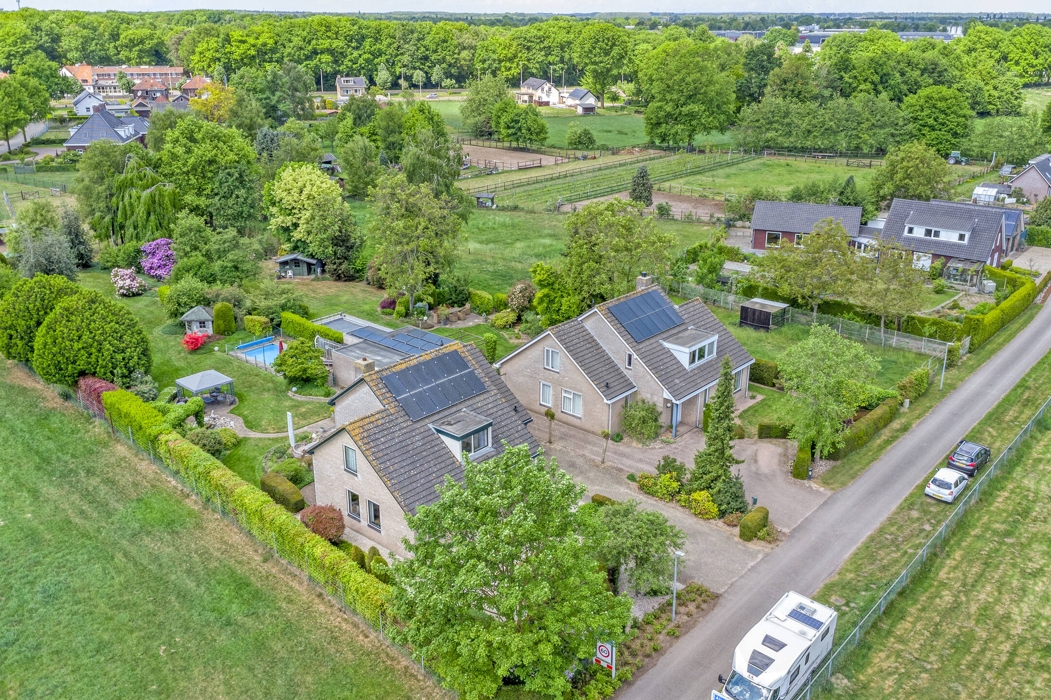Rondom de woning ligt een fraai aangelegde tuin met diverse terrassen, volop privacy én een eigen verwarmd zwembad (warmtepomp) – een vakantiegevoel in je eigen achtertuin. De ruime oprit met carport biedt plek aan meerdere auto’s en is ideaal voor het stallen van een caravan of camper. De vrijstaande stenen garage (met elektra) en houten tuinhuis maken het geheel compleet.