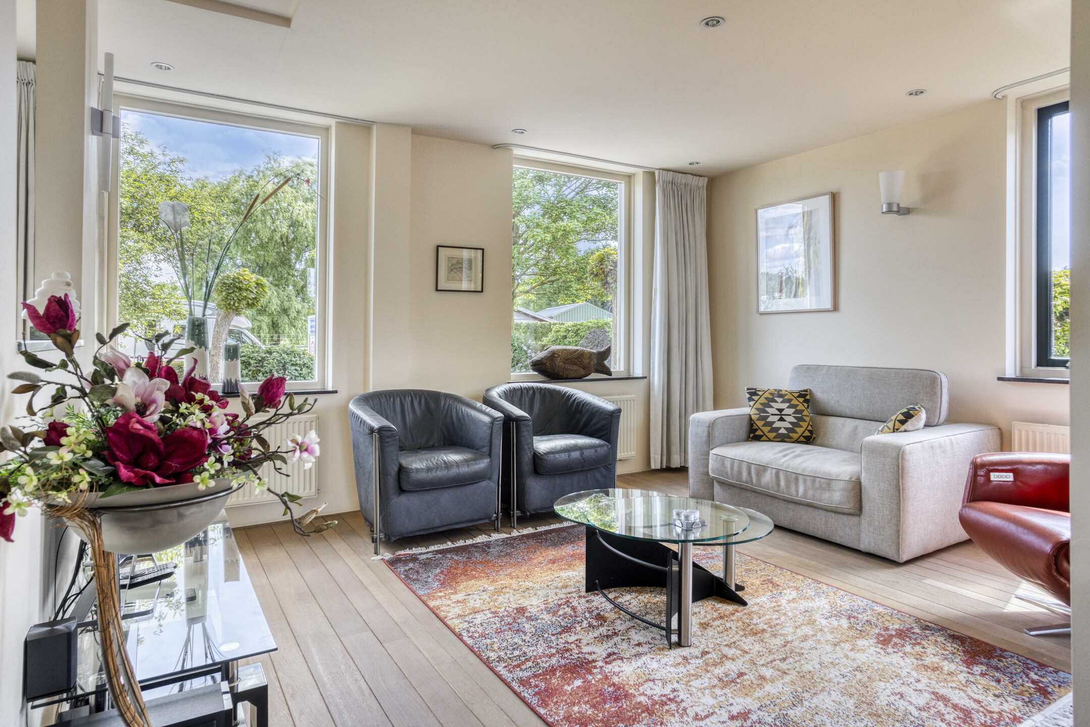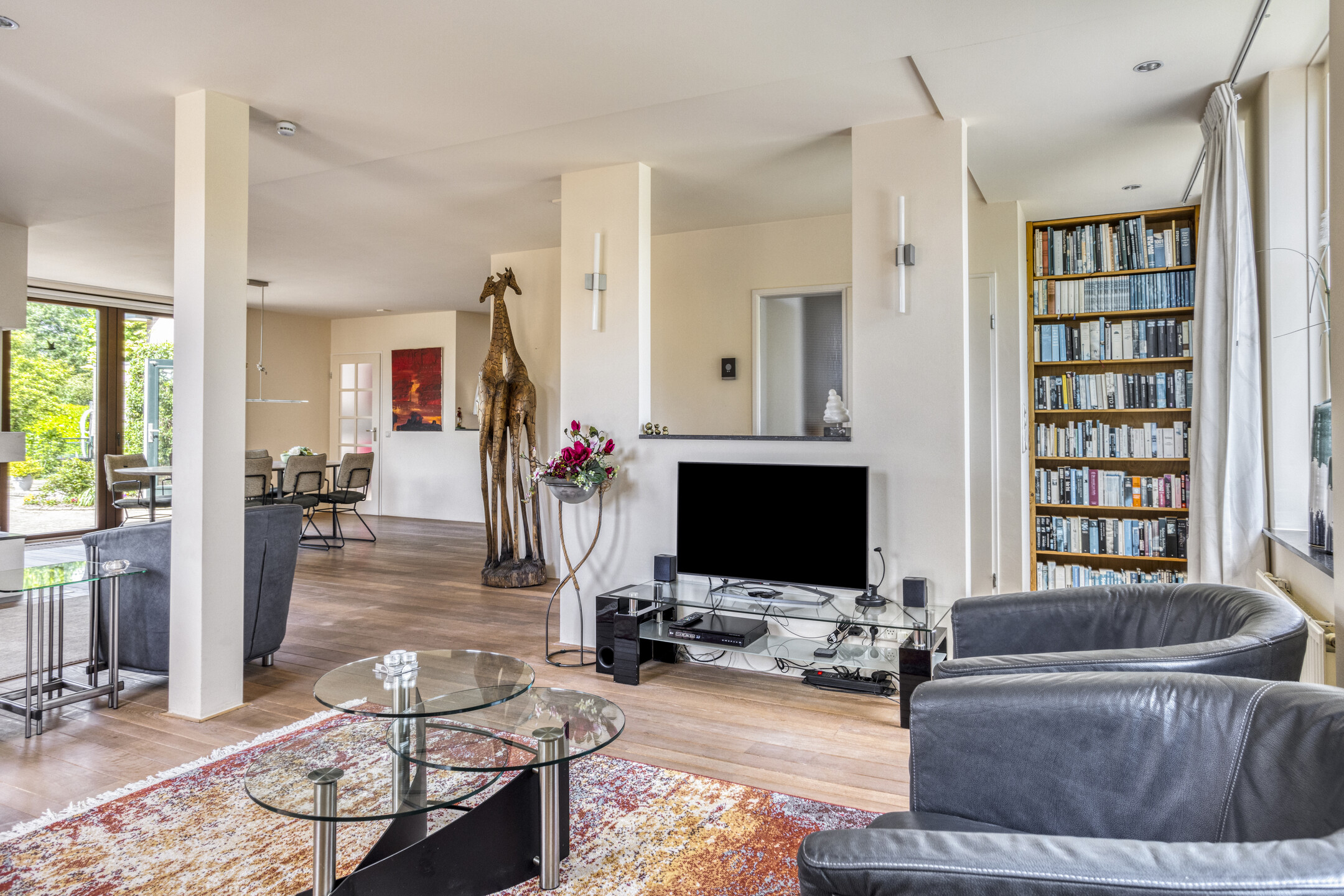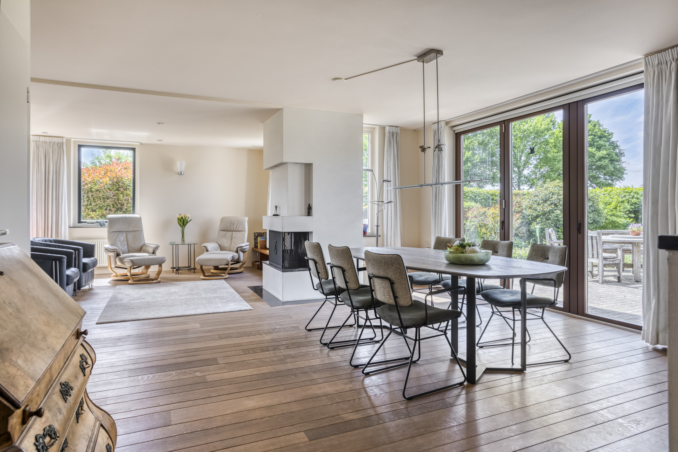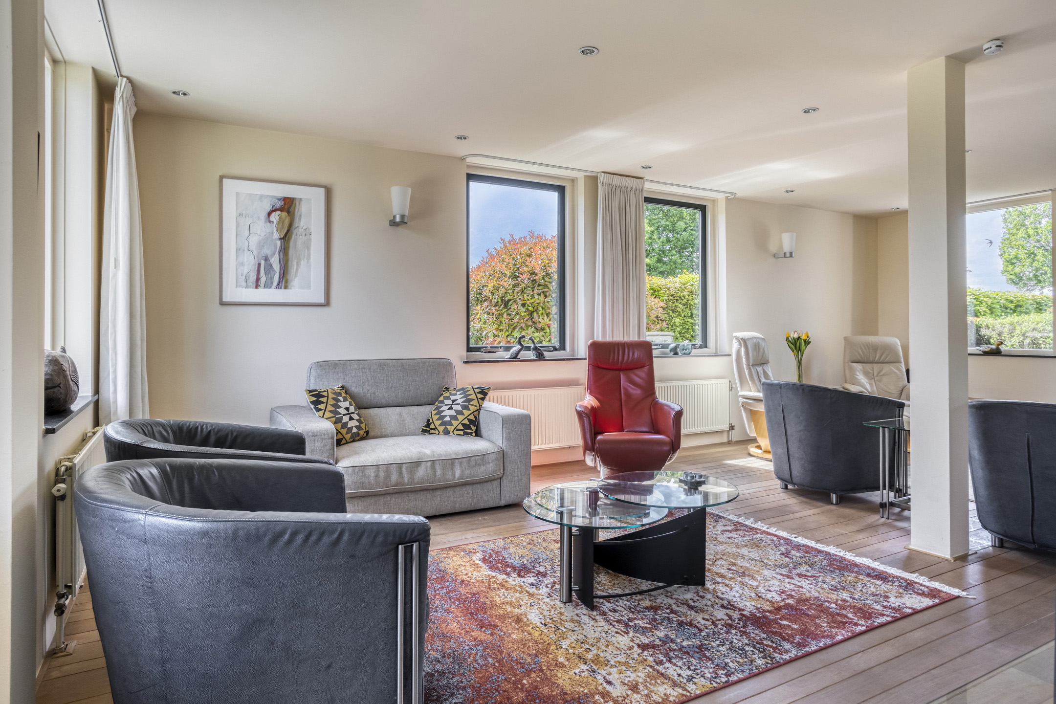 Ruime entree met toilet, vaste kast, meterkast en toegang tot de lichte woonkamer met harmonicadeuren naar de tuin. In de woonkamer valt direct op hoeveel ruimte en licht er is, dankzij de uitbouw aan de voor- en zijkant en de grote raampartijen rondom.