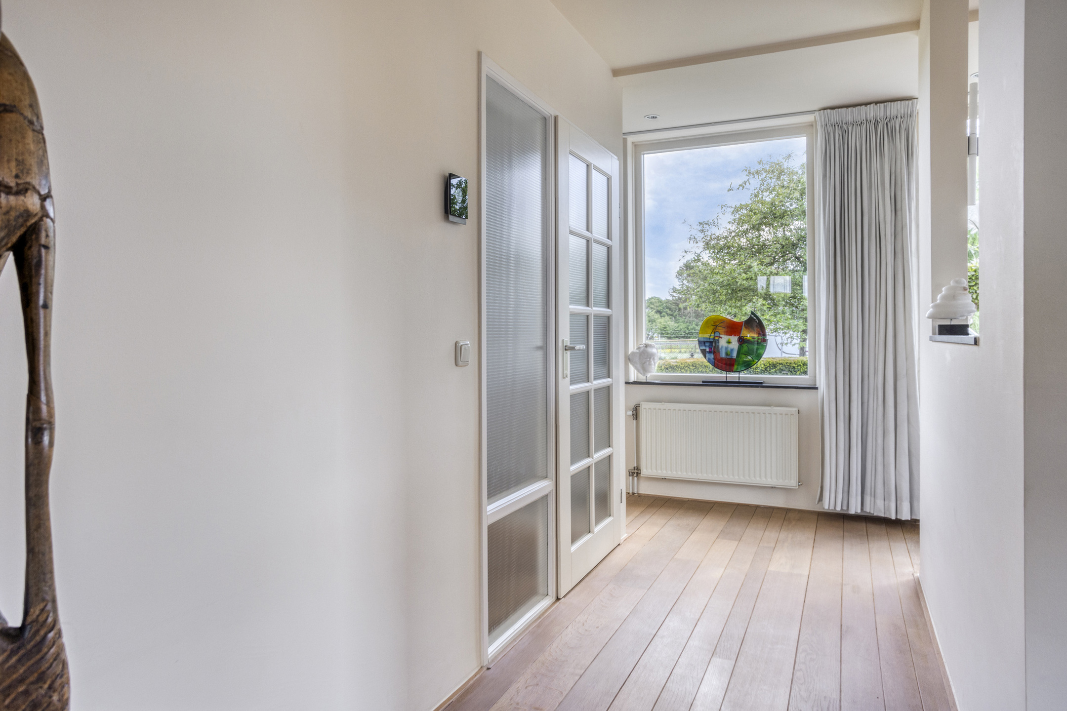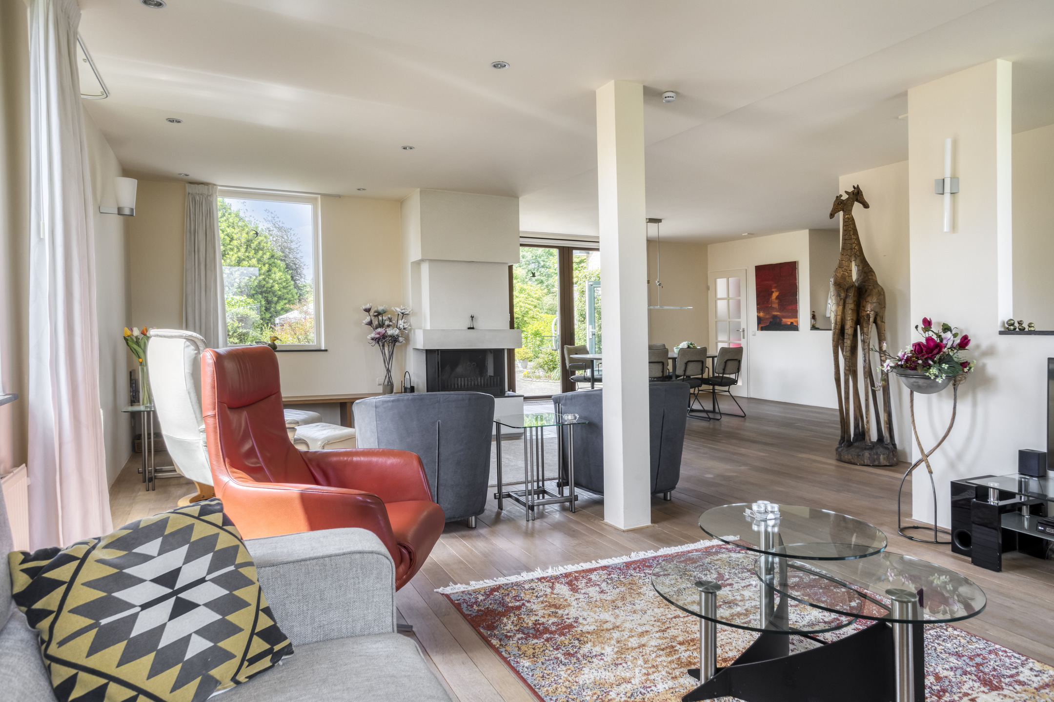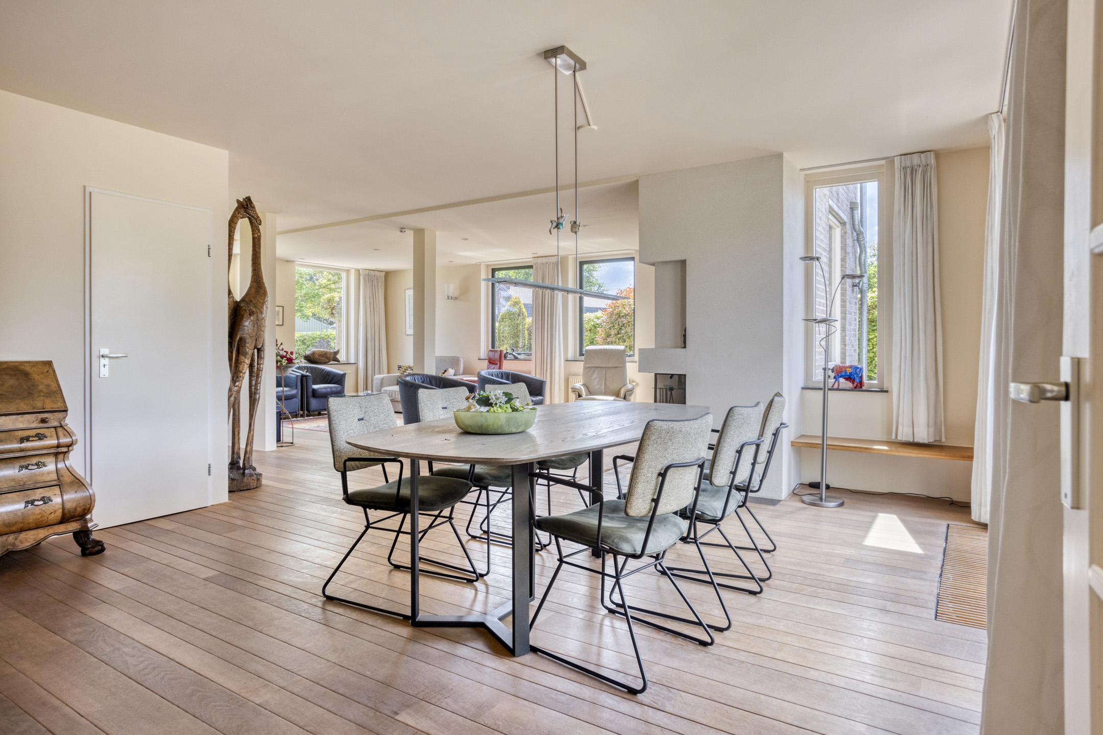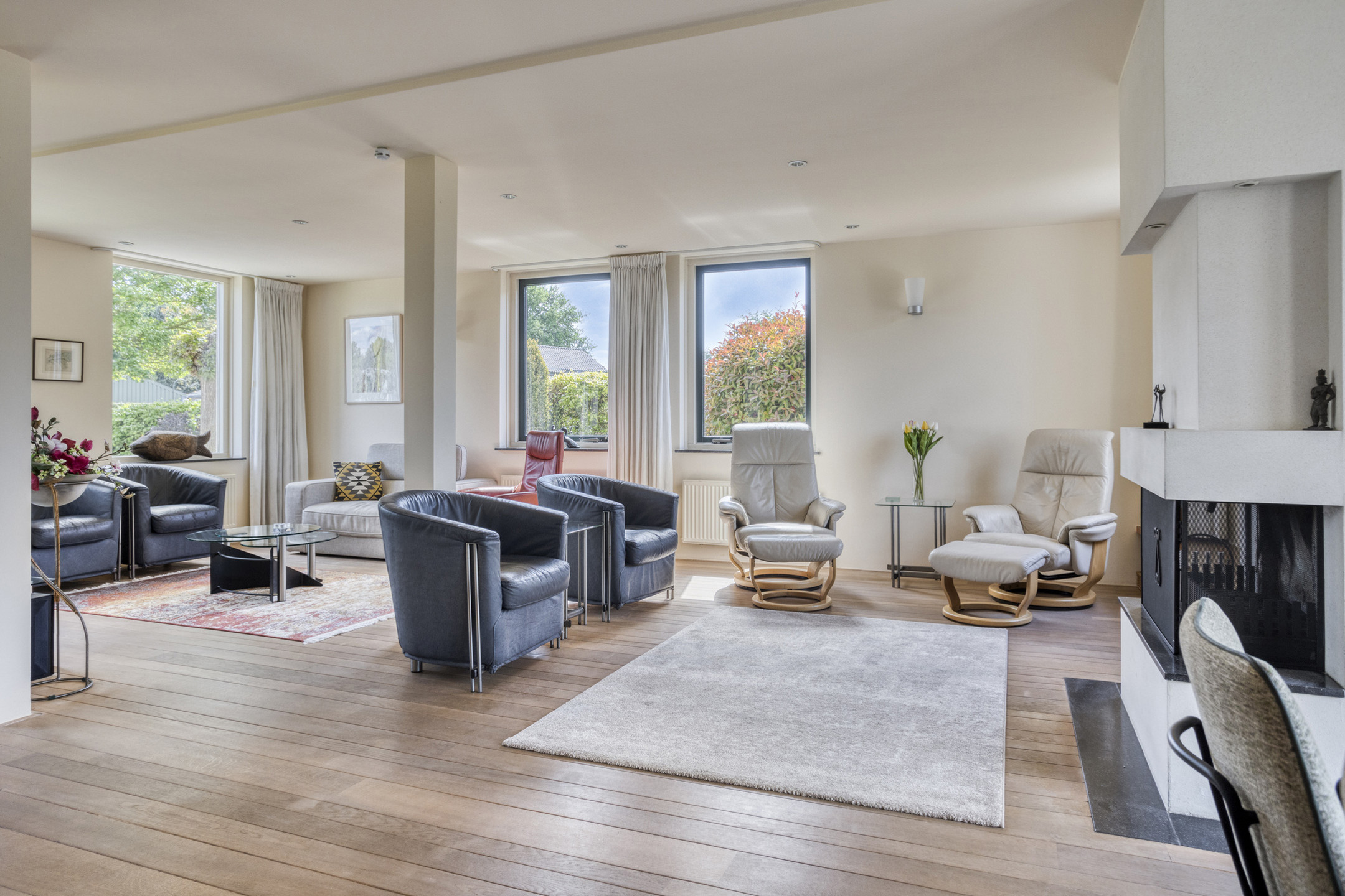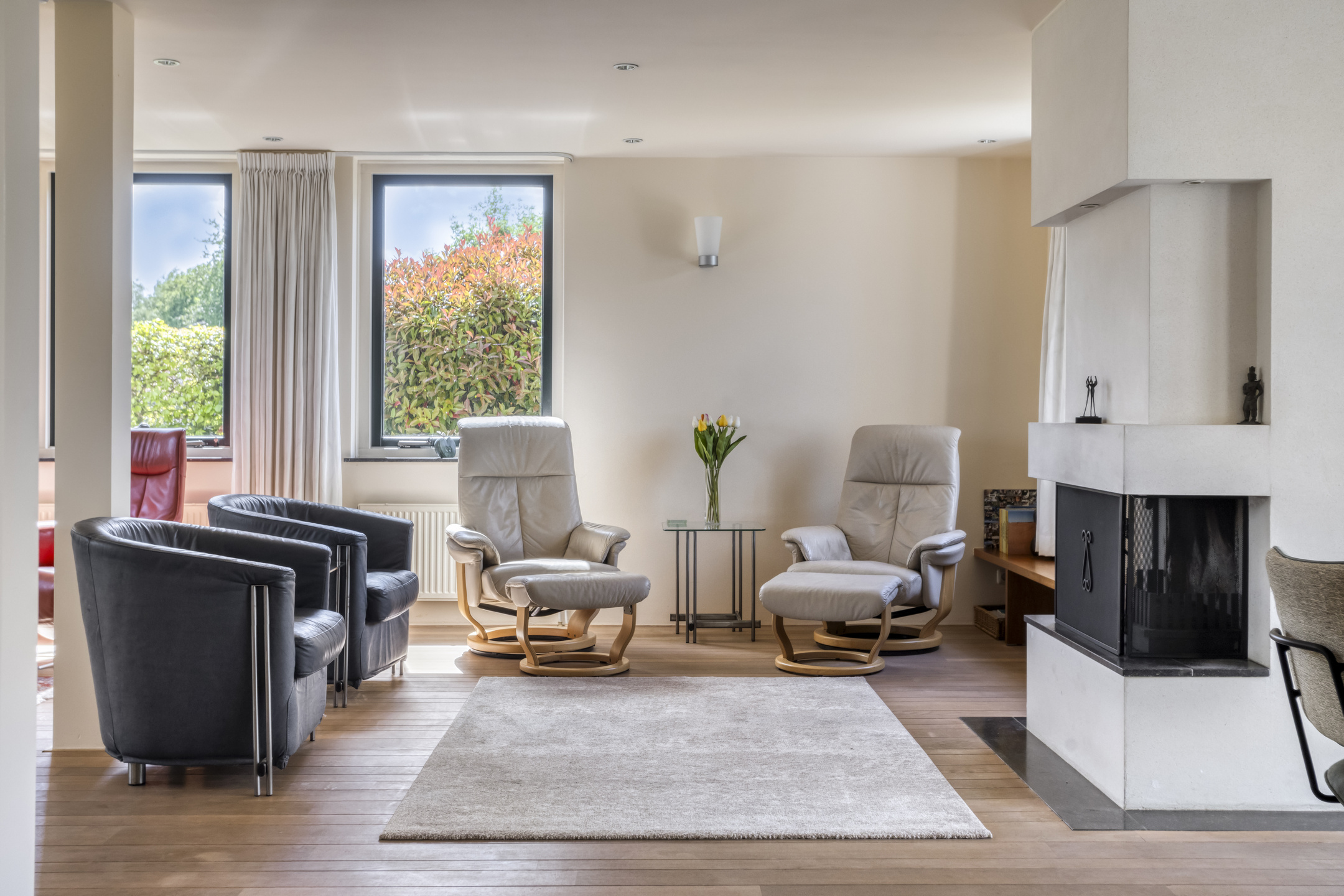 Ruime entree met toilet, vaste kast, meterkast en toegang tot de lichte woonkamer met harmonicadeuren naar de tuin. In de woonkamer valt direct op hoeveel ruimte en licht er is, dankzij de uitbouw aan de voor- en zijkant en de grote raampartijen rondom.