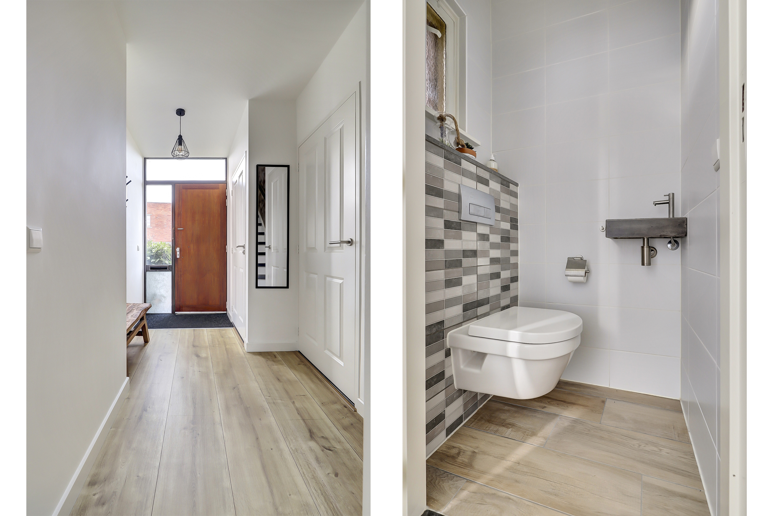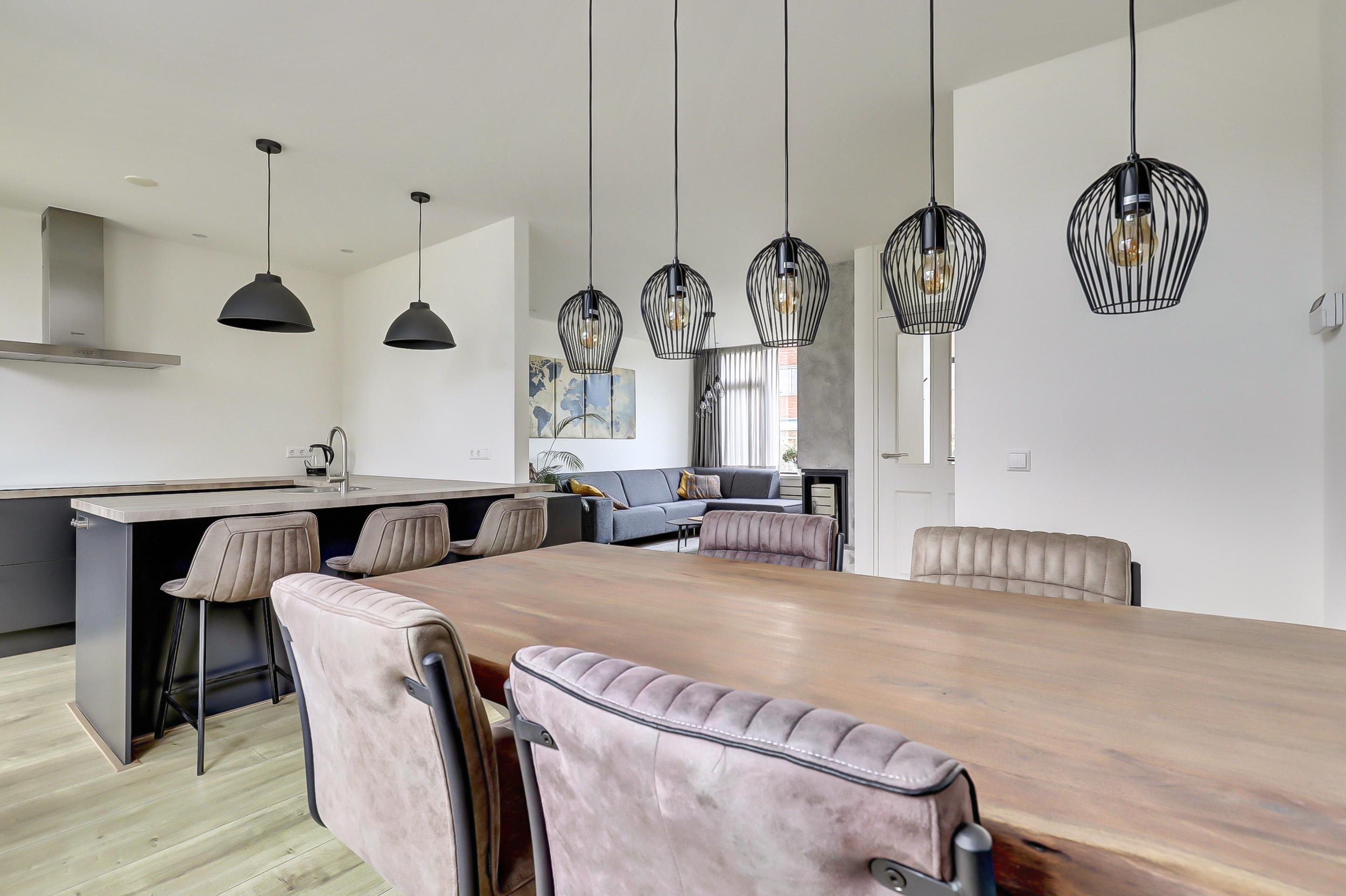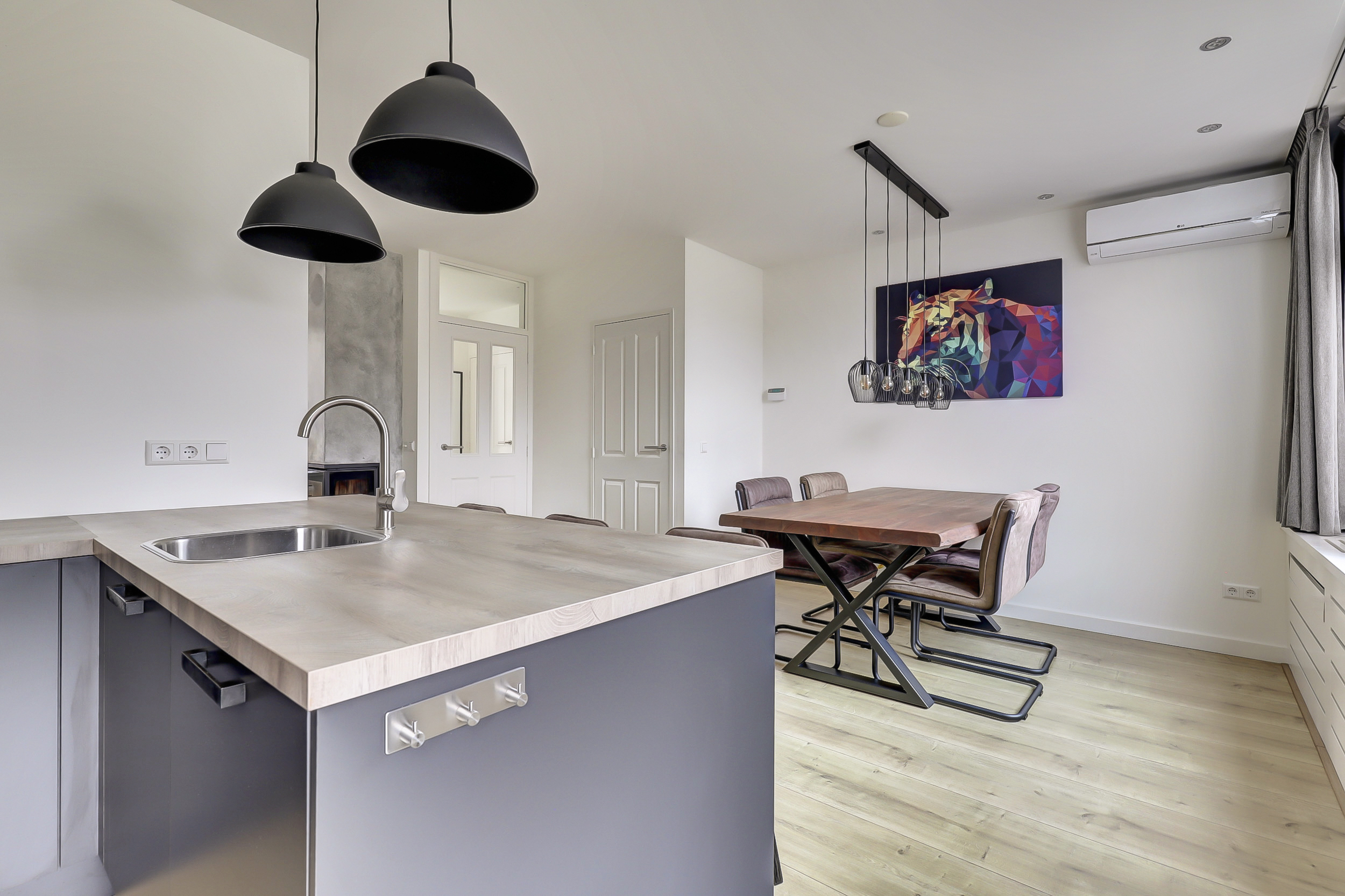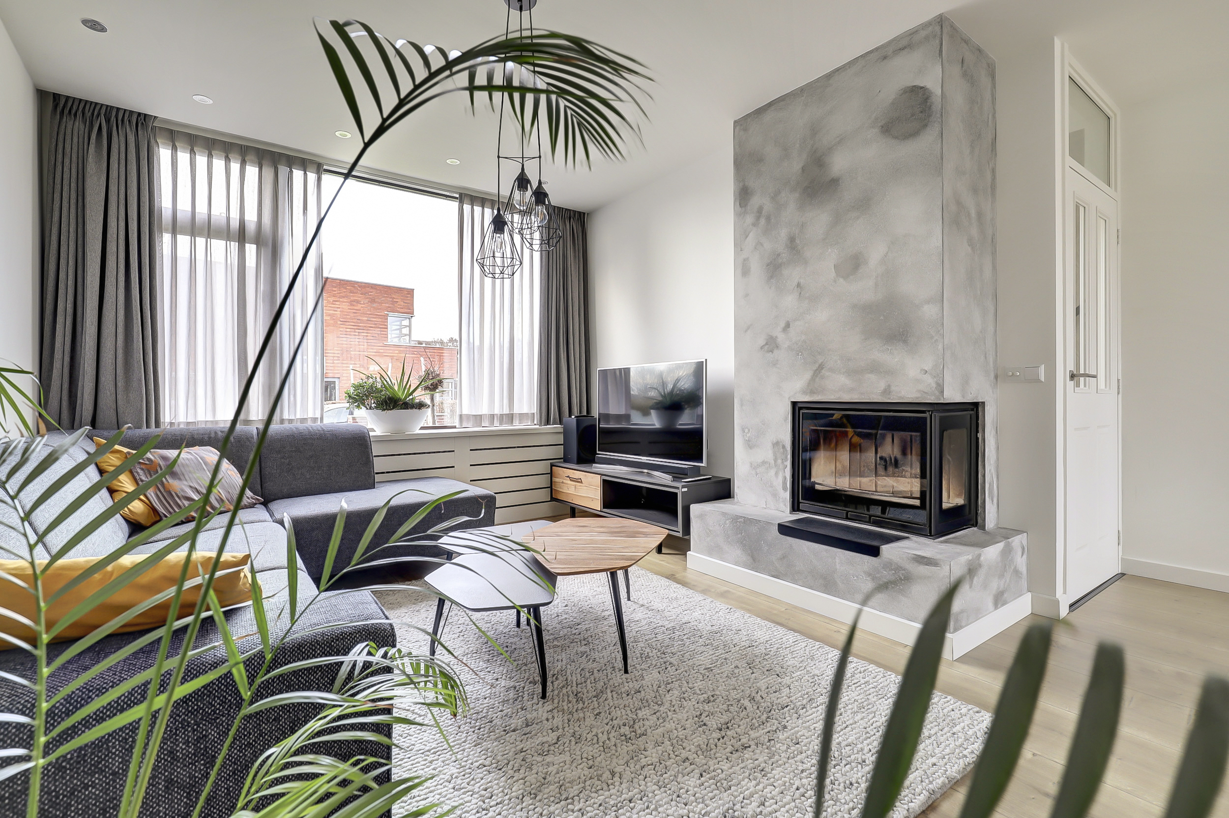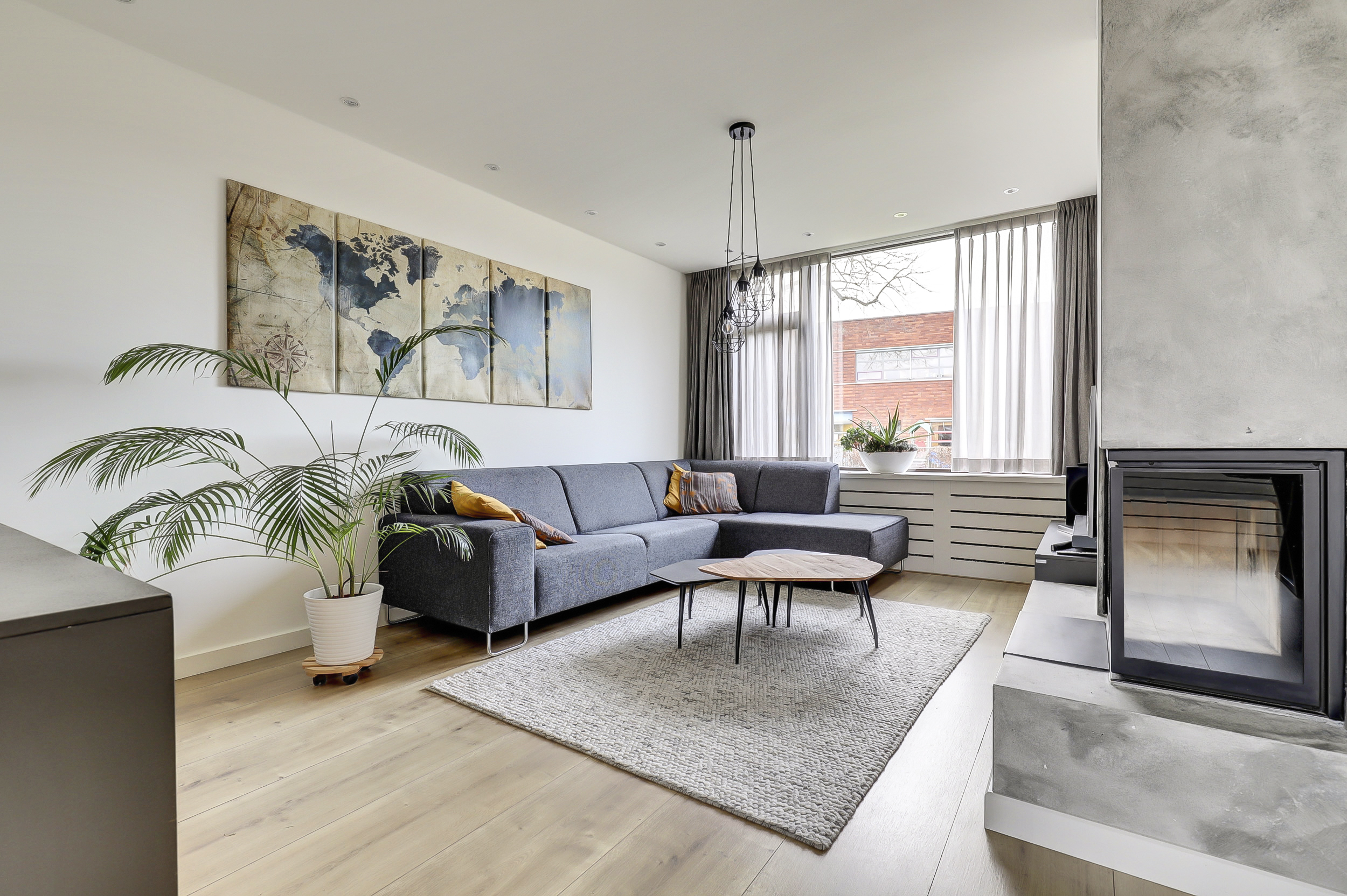 Je komt binnen in een verzorgde hal met meterkast, trapopgang en een modern uitgevoerd toilet met fontein. Vanuit hier stap je de woonkamer in: een lichte, open leefruimte met grote raampartijen, veel daglicht en een sfeervolle open haard als warm middelpunt. Een fijne, rustige plek waar wonen echt prettig aanvoelt.