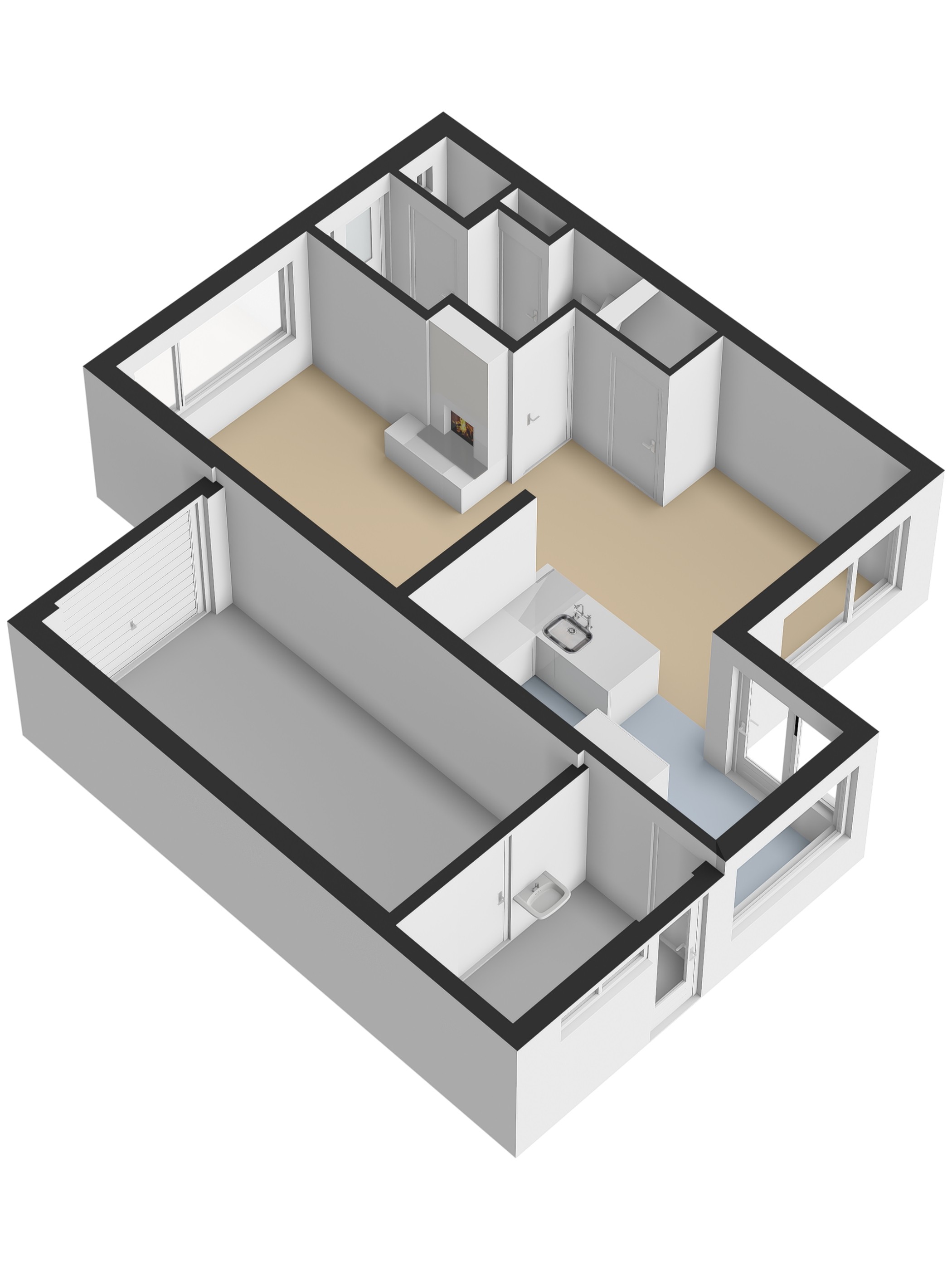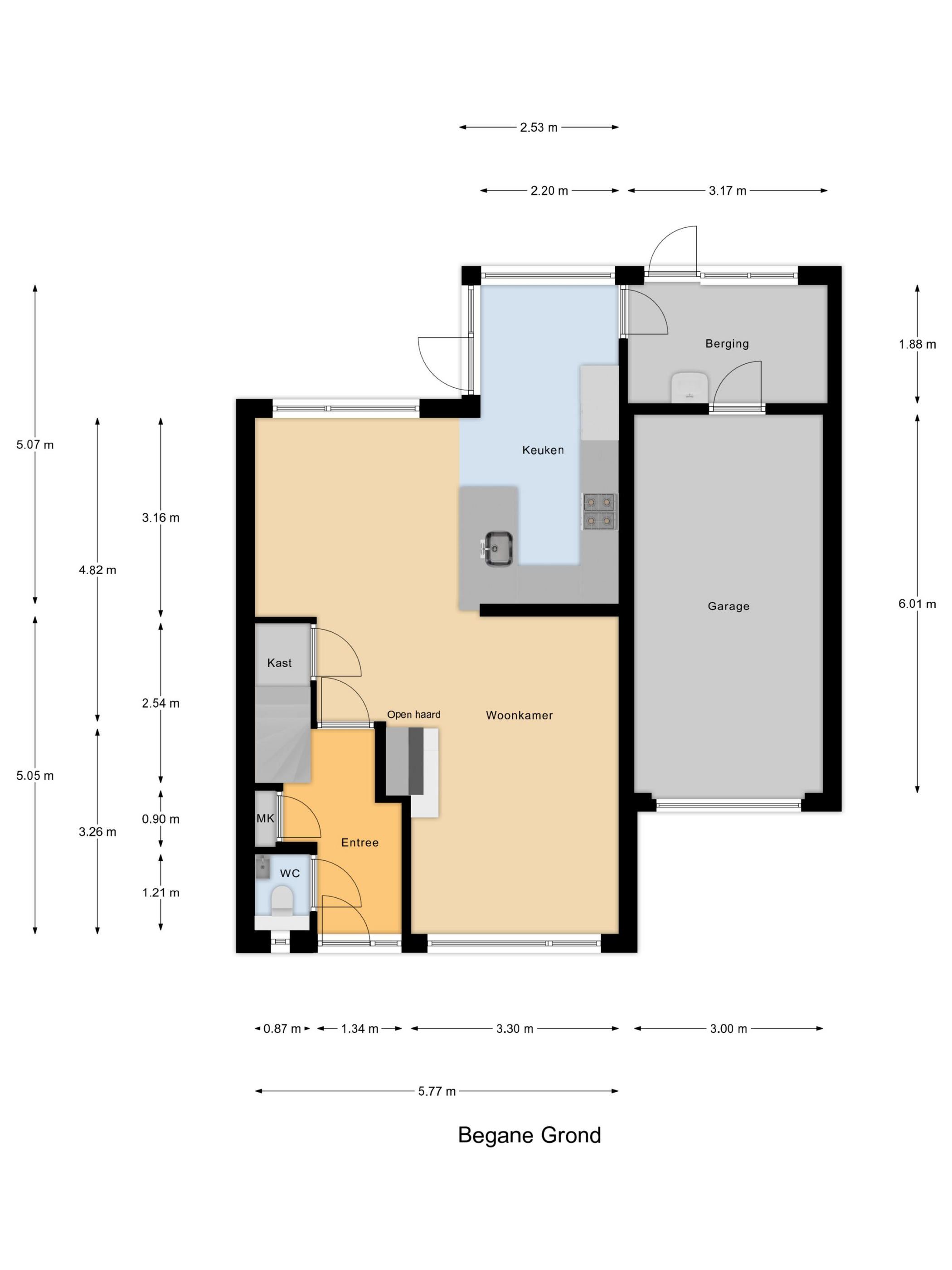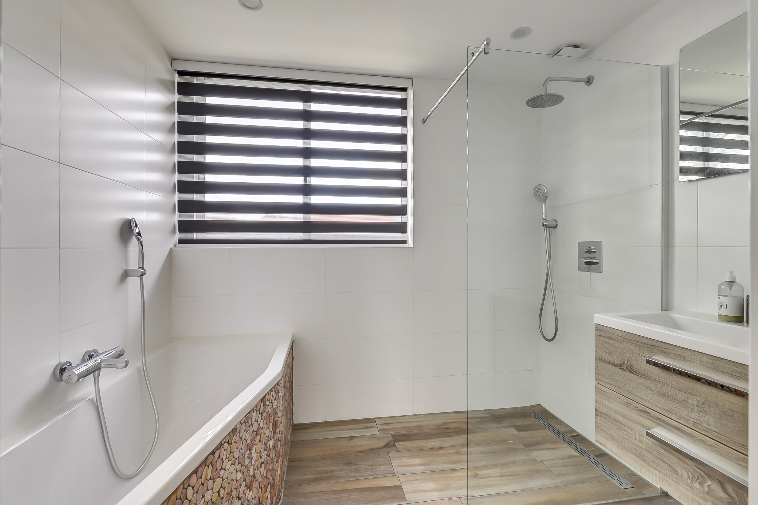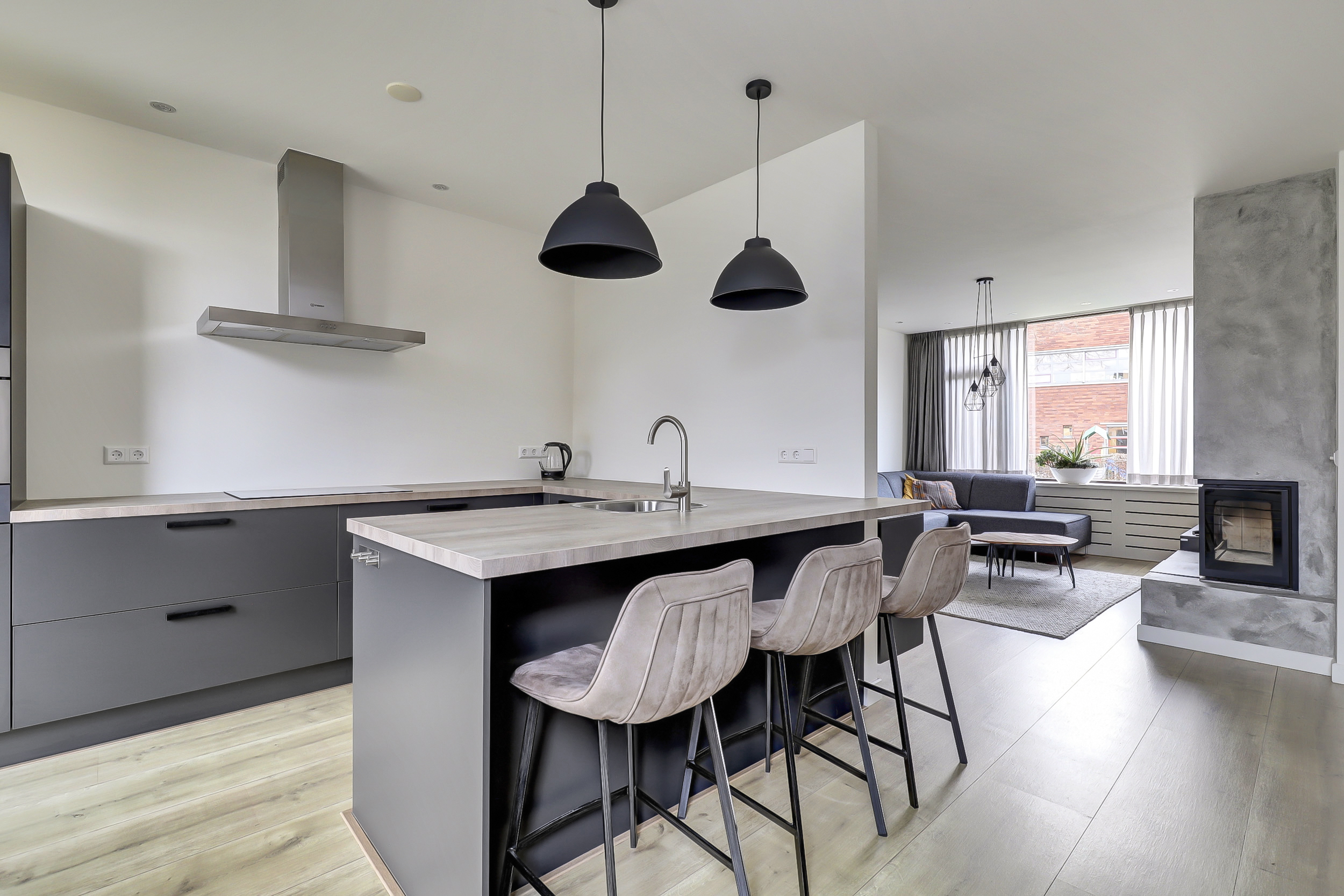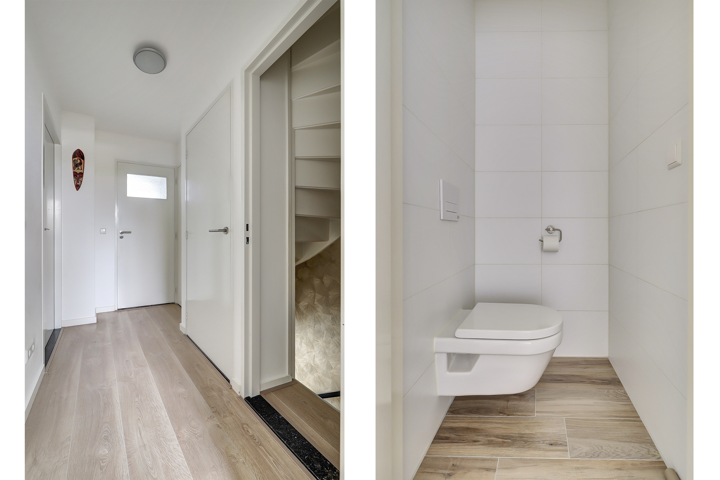 Je komt binnen in een verzorgde hal met meterkast, trapopgang en een modern uitgevoerd toilet met fontein. Vanuit hier stap je de woonkamer in: een lichte, open leefruimte met grote raampartijen, veel daglicht en een sfeervolle open haard als warm middelpunt. Een fijne, rustige plek waar wonen echt prettig aanvoelt.