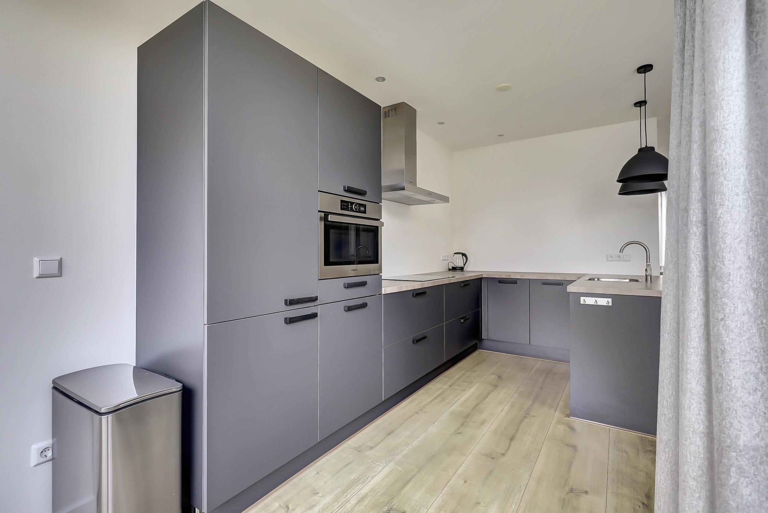 Aan de achterzijde ligt de open keuken in U-opstelling met schiereiland. Een praktische én gezellige opstelling, waar koken en samen zijn moeiteloos samengaan. De keuken is uitgerust met een koelkast en vriezer, combi-oven, vaatwasser en een inductiekookplaat (2021), met volop werkruimte en bergruimte.