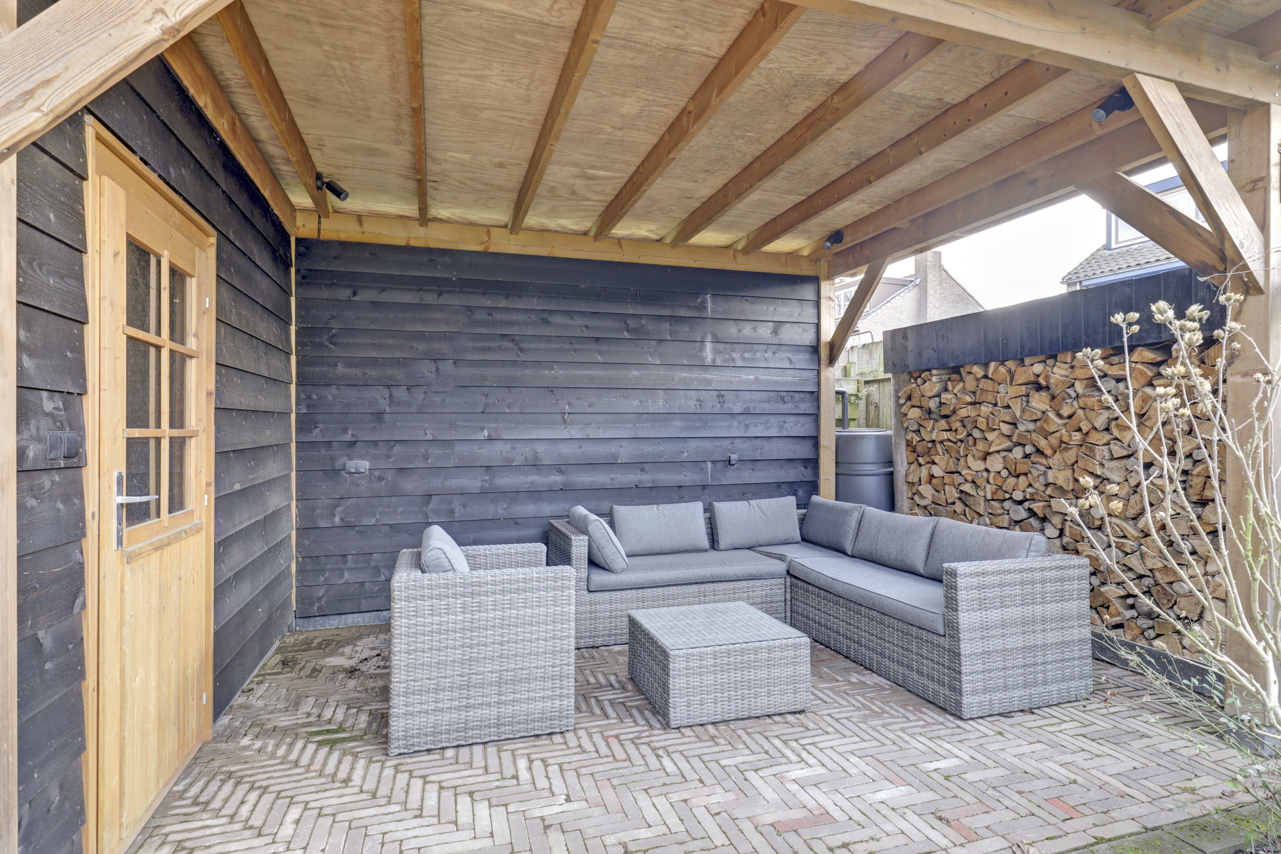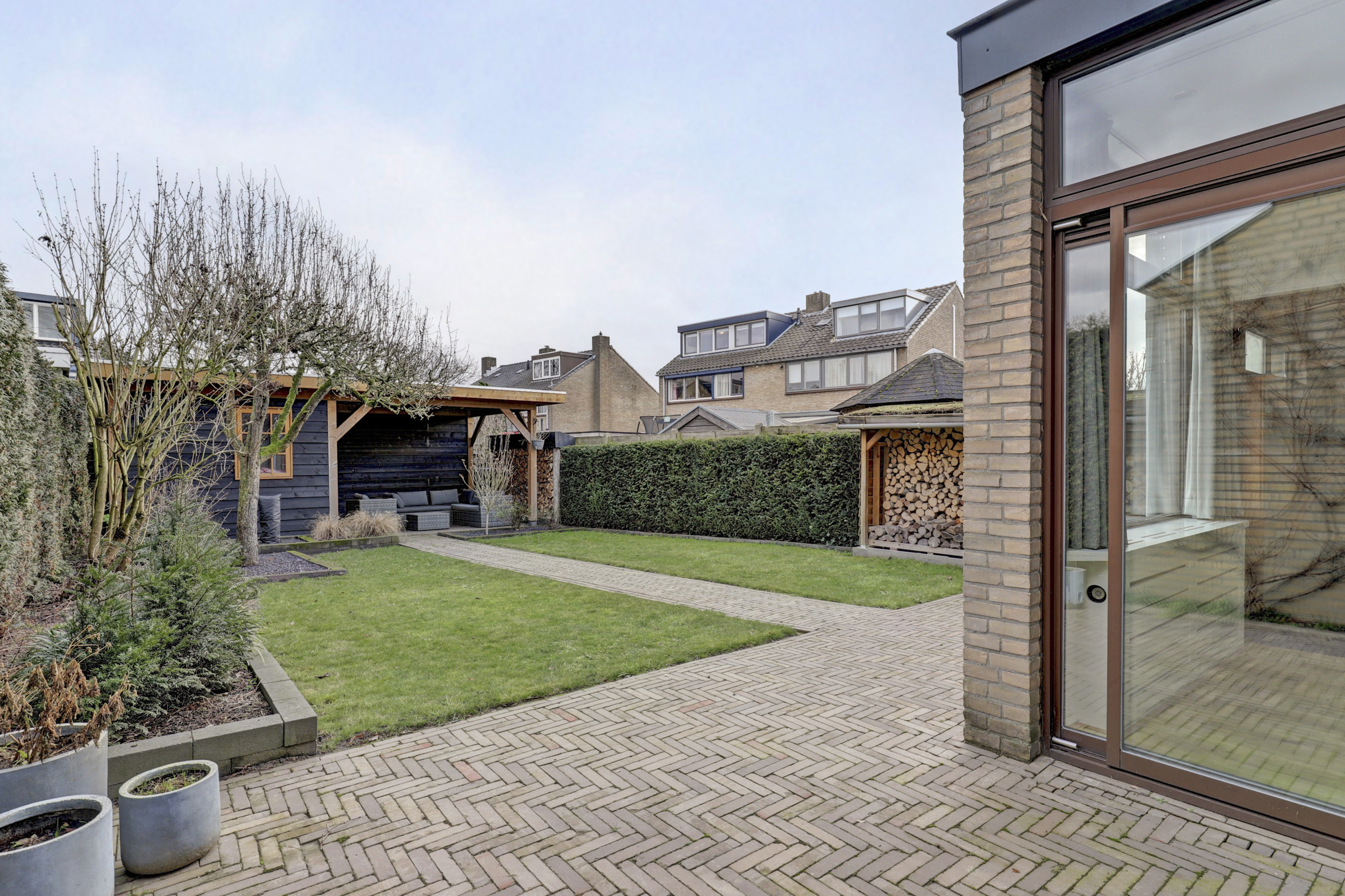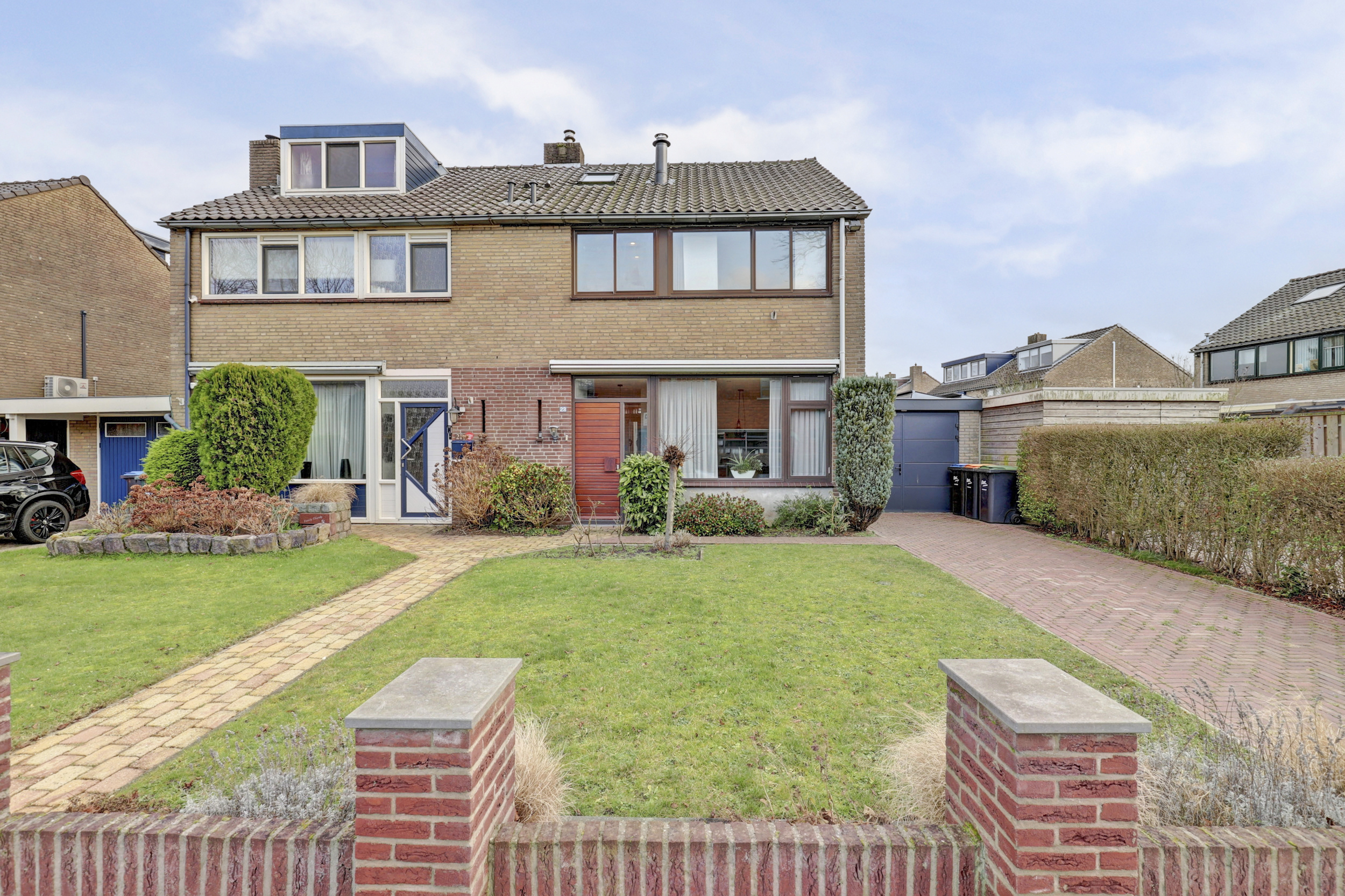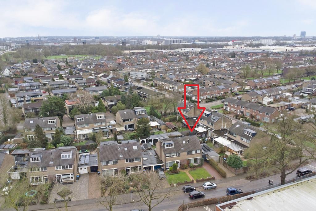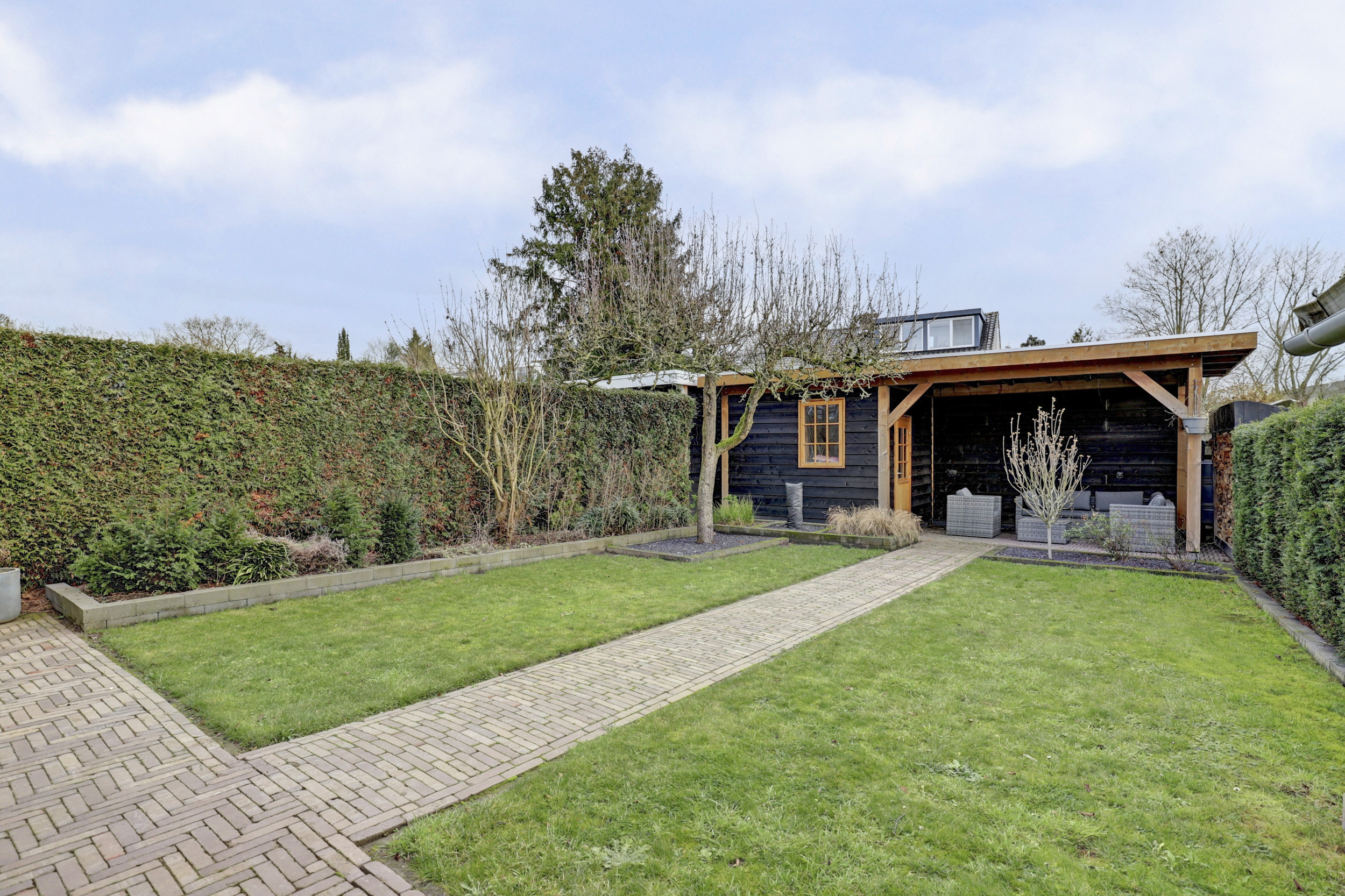 Aan de voorzijde beschikt de woning over een nette voortuin met eigen oprit — parkeren doe je hier gewoon op eigen terrein. De achtertuin ligt gunstig op het zuidoosten en is ingericht met meerdere terrassen, een overkapping en een extra tuinhuis. Een fijne buitenruimte waar je van het vroege voorjaar tot het najaar optimaal kunt genieten van zon, rust en privacy.