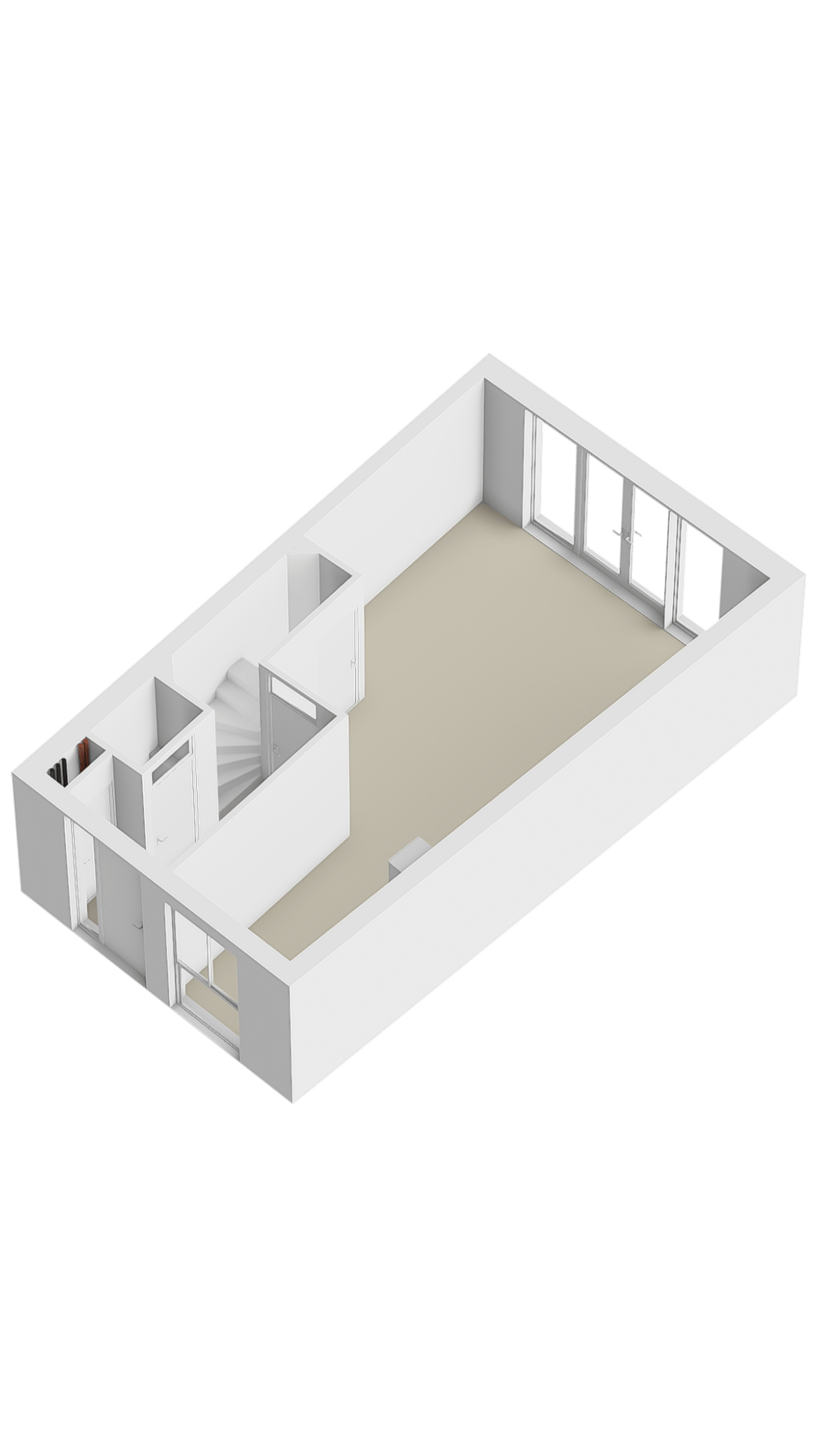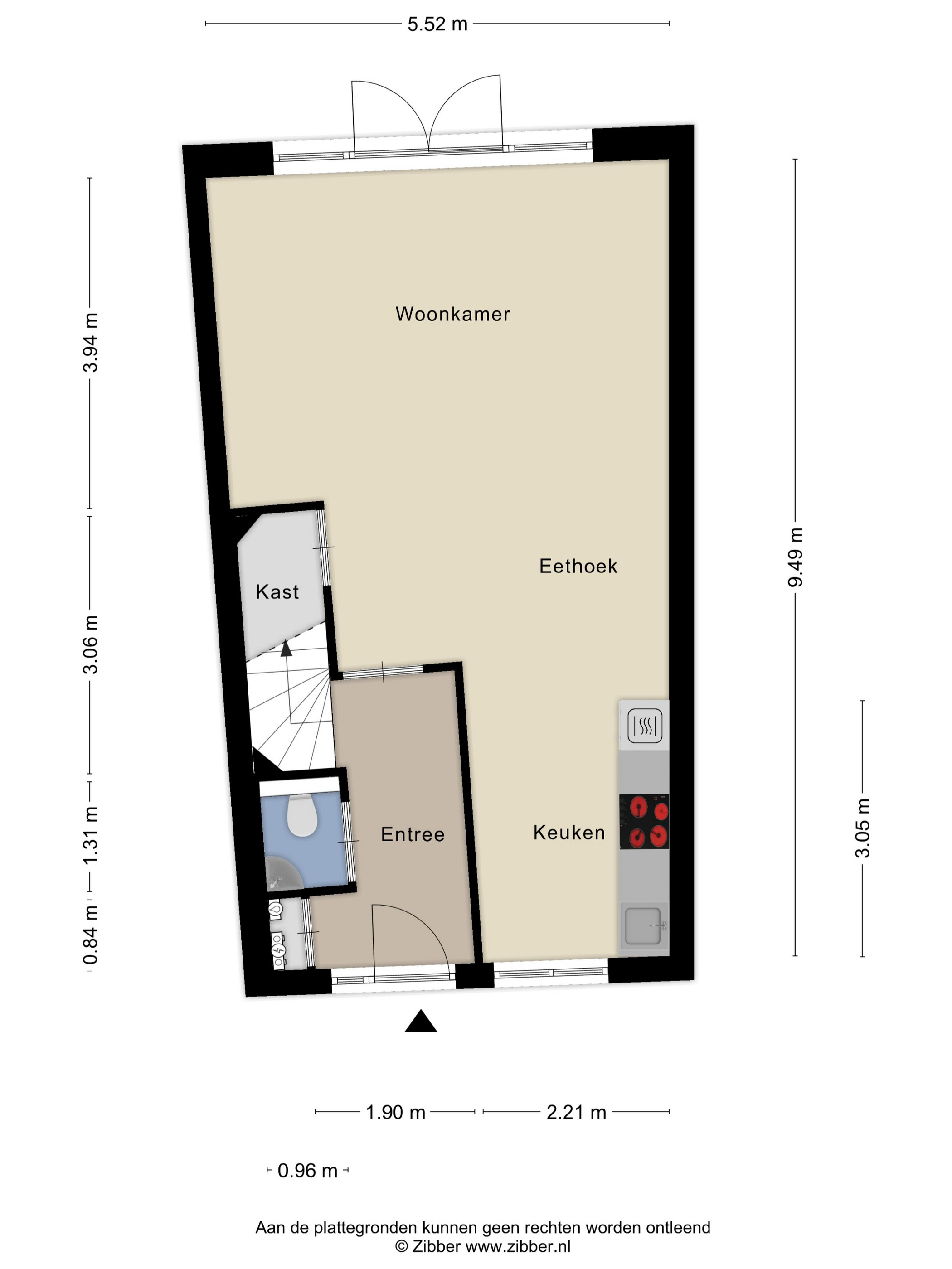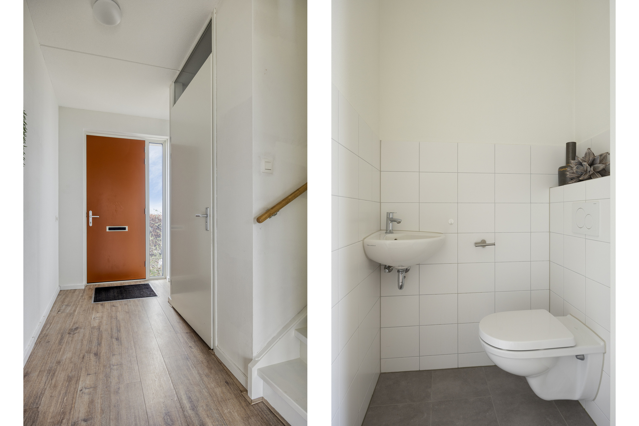 We komen binnen in de hal met trapopgang naar de eerste verdieping, toegang tot de meterkast, de nette toiletruimte en uiteraard de woonkamer.