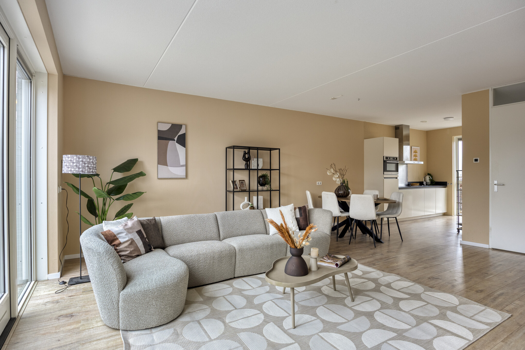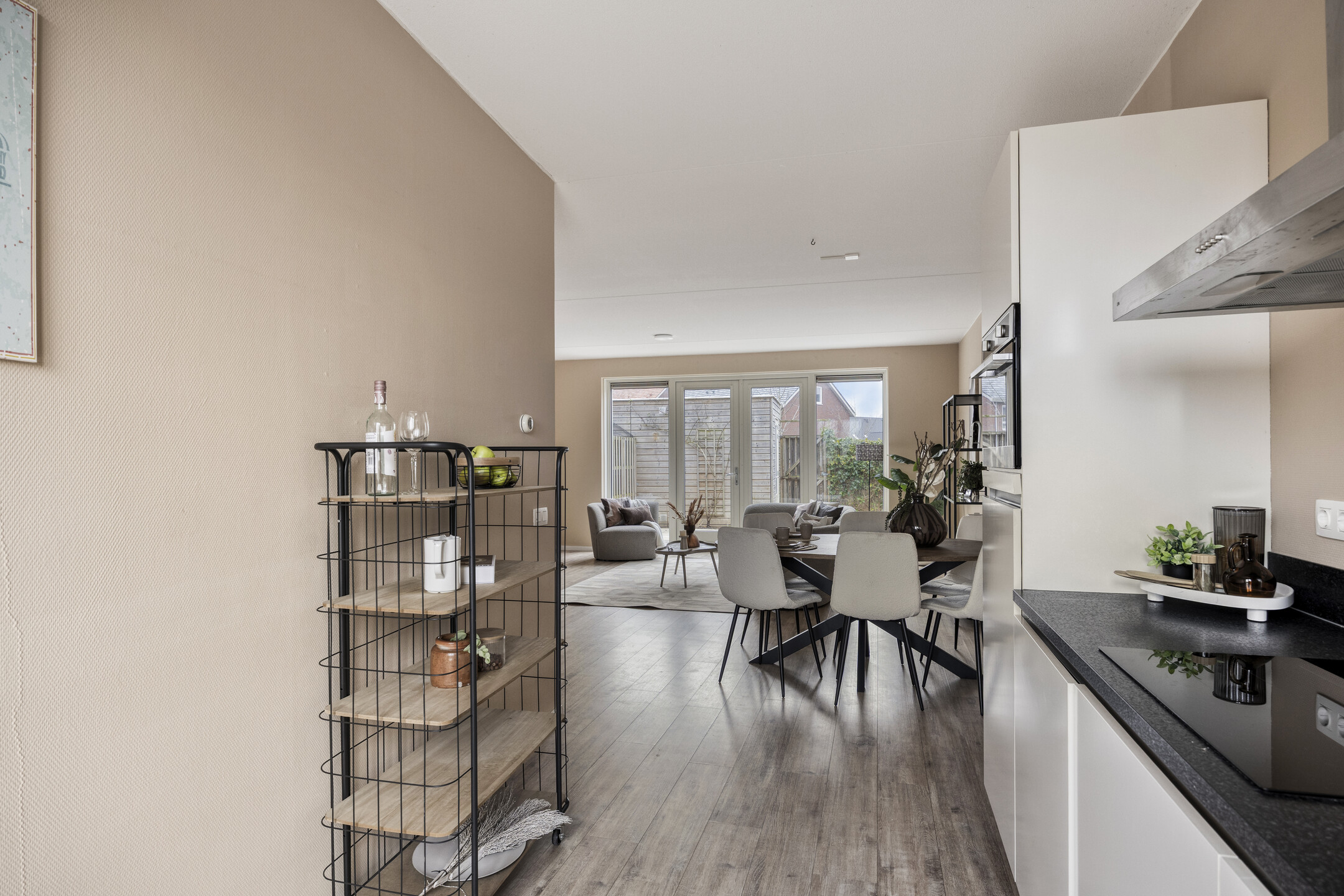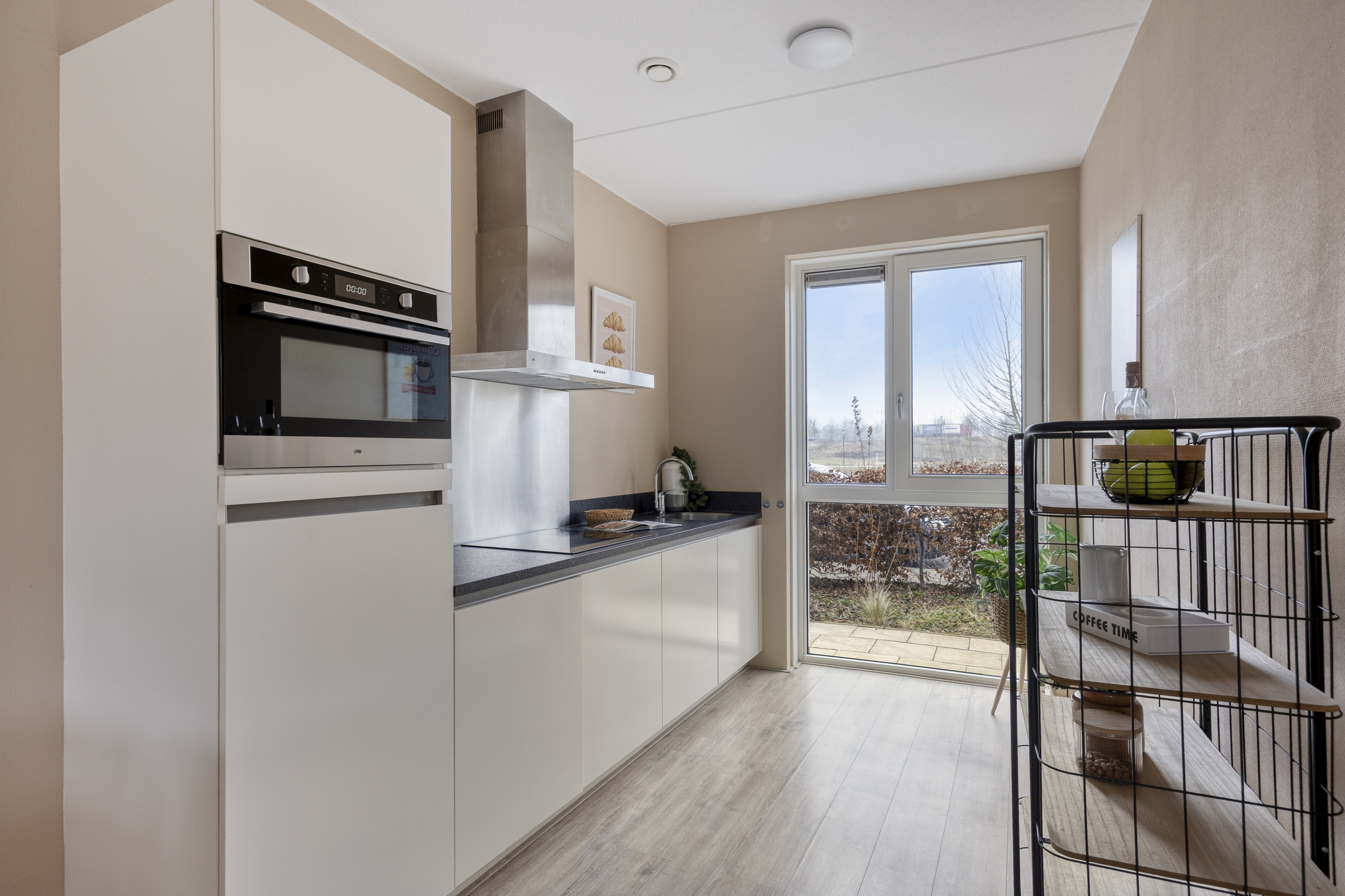 Aan de voorzijde van de woonkamer is de open keuken gesitueerd. De grote raampartijen zorgen niet alleen voor veel daglichttoetreding, maar ook voor een prettige kijk op het park tegenover de woning.