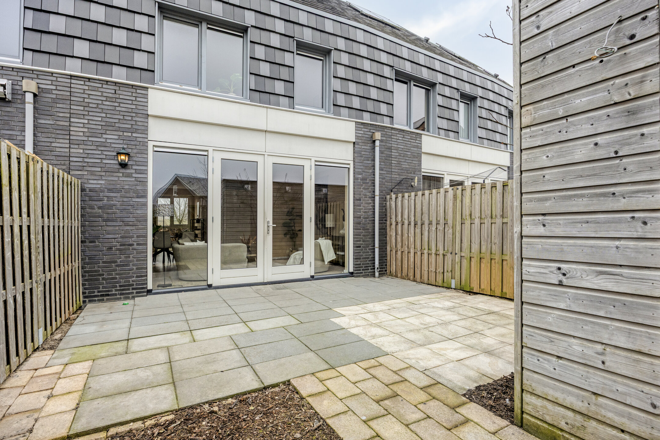 Aan de achterzijde van de woonkamer is plek voor een fijne zithoek met zicht op de tuin. De openslaande deuren kun je op een mooie dag lekker open zetten. De tuin is gelegen op het zuidwesten waardoor je de hele middag en avond in het zonnetje kunt zitten. De afstand tot de achterburen is groot door de aanwezigheid van een parkeerplein. Hierdoor heb je geen directe inkijk; wel zo fijn als je in de tuin zit. Dit parkeerplein biedt een eigen parkeerplek. De houten berging is handig voor de fietsen en tuinspullen.