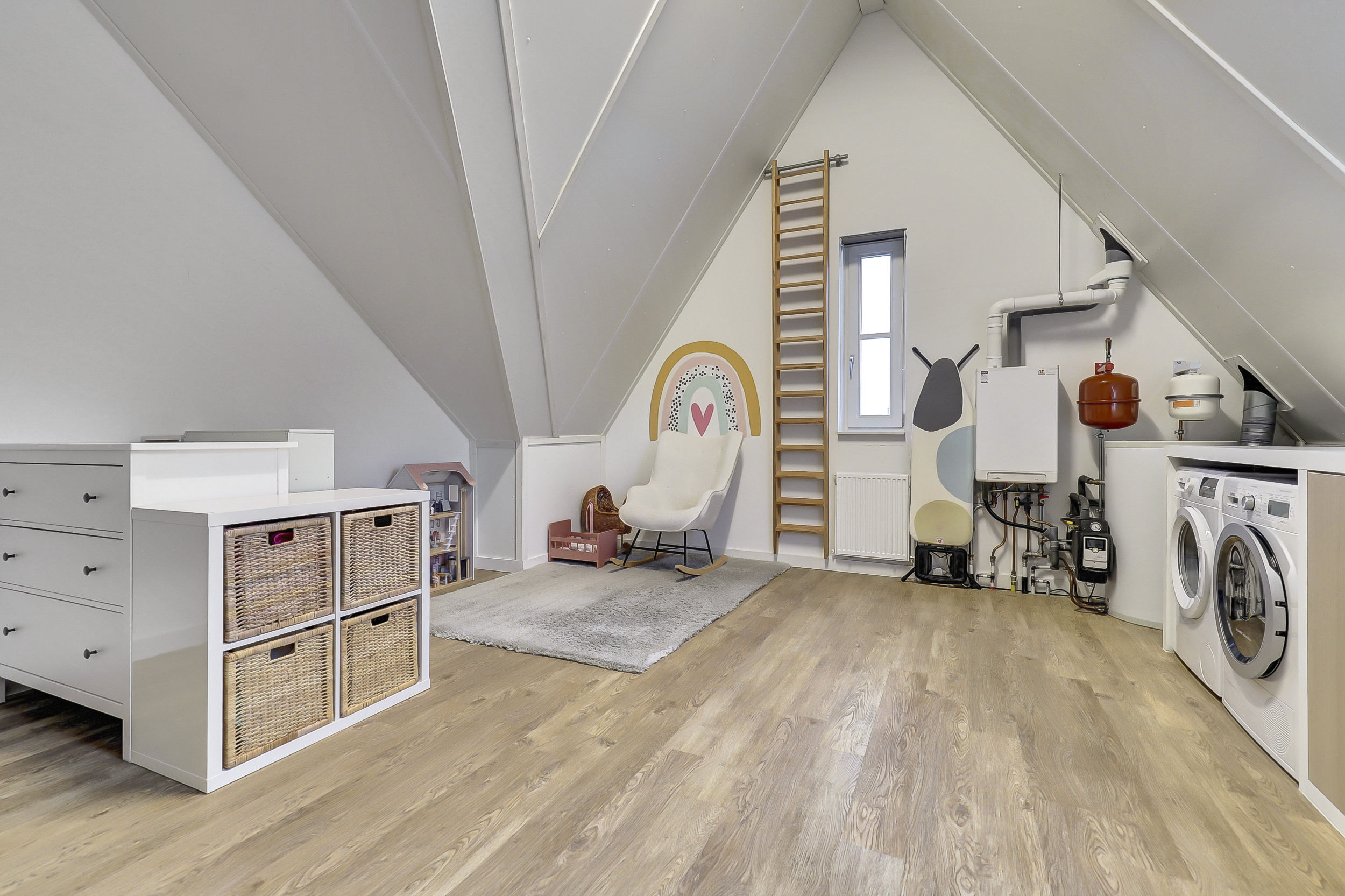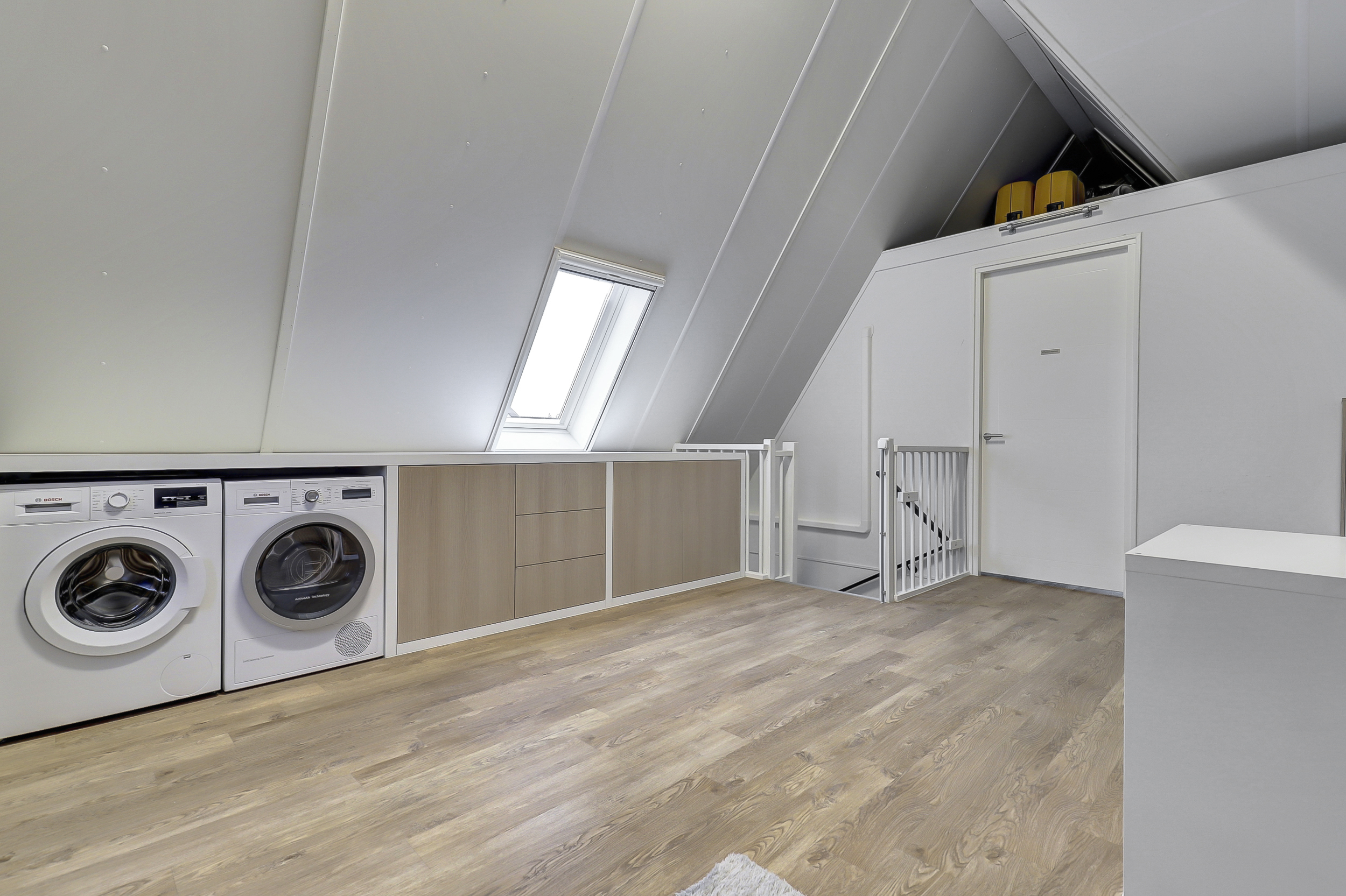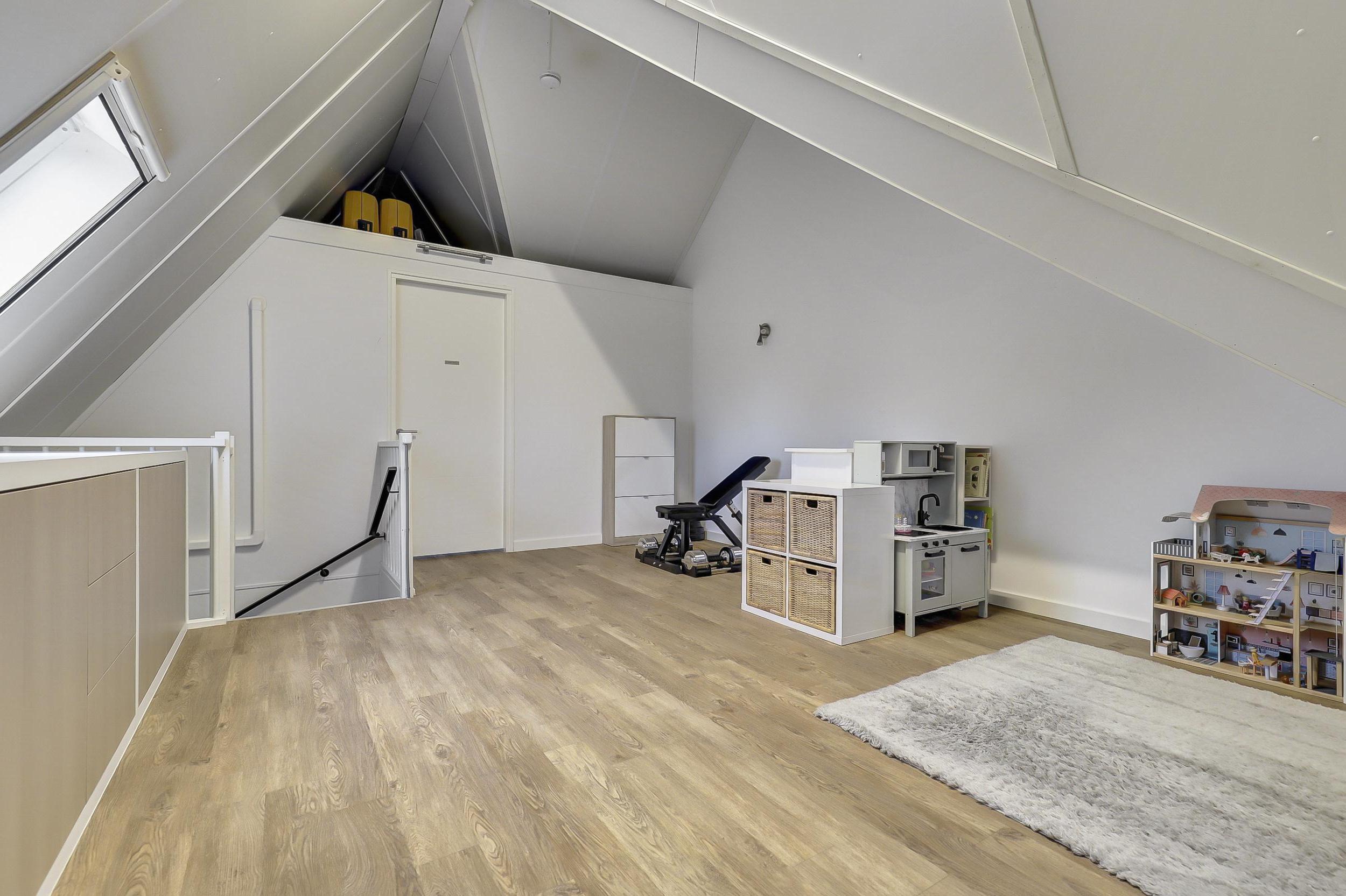 Zeer royale multifunctionele voorzolder en 4de slaapkamer. De voorzolder geeft veel mogelijkheden, heeft een mooie hoogte tot in de nok en is naar eigen wens nog verder in te delen/te gebruiken. Hier bevinden zich tevens de opstelplaats voor de Cv-ketel (Intergas HRE (2016), de mechanische ventilatie box en de zonneboiler), dakvenster met de verdonkeringsscherm en hor, luxe maatwerk kast met ruimte om de wasmachine en droger in te plaatsen en extra bergruimte op de vliering. De slaapkamer heeft een airco-unit, spotjes en dakvenster met de verdonkeringsscherm en hor. De gehele verdieping is voorzien van PVC-vloer, verwarming en houten draaikiepramen met horren.