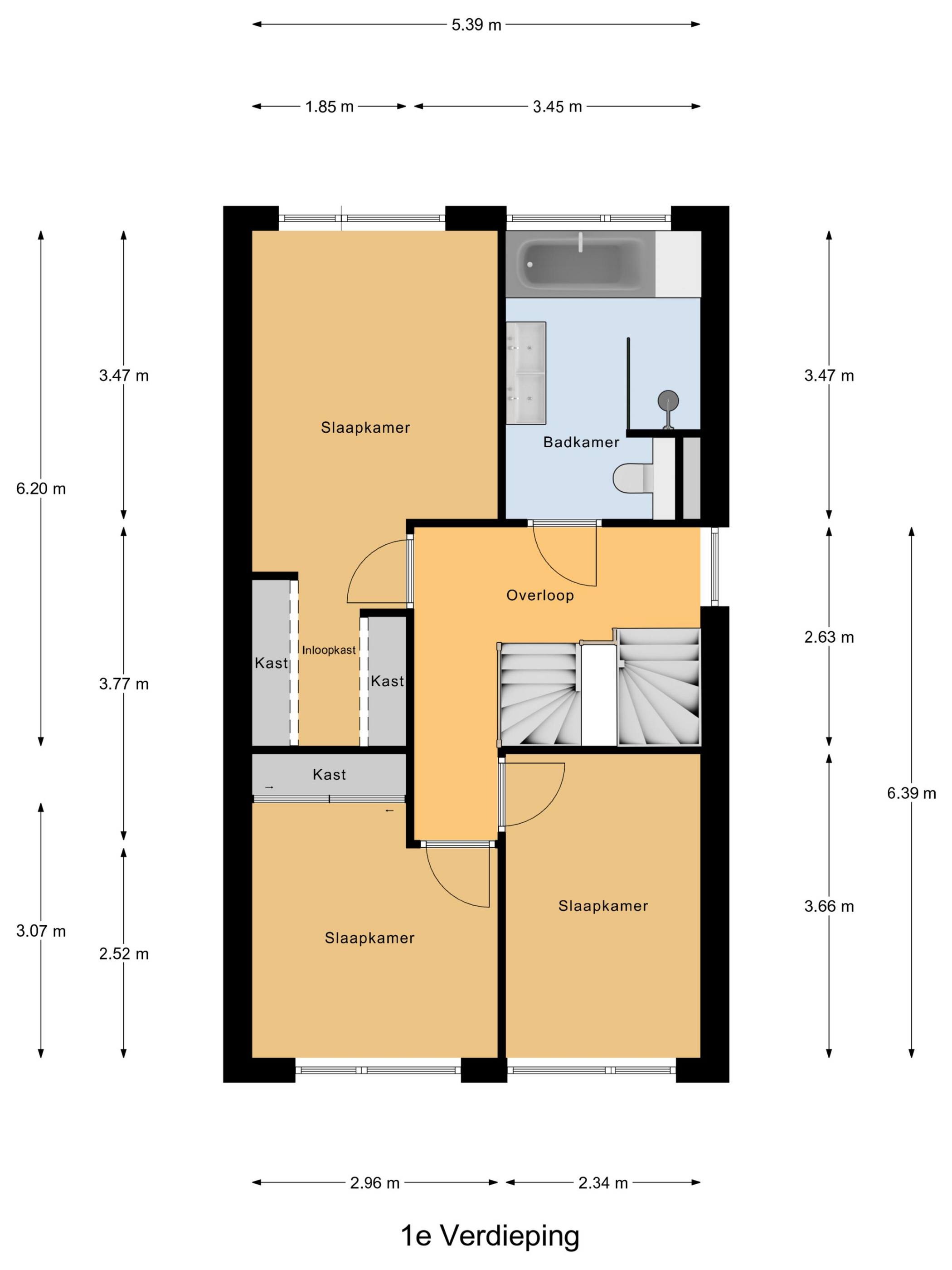 Via de vaste trap (mooi bekleed met hout) bereik je de overloop met raam en toegang tot de 3 slaapkamers, de badkamer en trapopgang naar de 2de verdieping. De 3 slaapkamers zijn voorzien van PVC vloer, strakke wand, spuitwerk plafondafwerking en houten draaikiepramen met horren en rolluiken. De master bedroom is aan de achterzijde gelegen en tevens voorzien van inloopkast en airco-unit. 1 van de slaapkamers aan de voorzijde heeft een vaste schuifkastenwand. De moderne badkamer heeft een ligbad, inloopdouche met regen- en handdouche, dubbel wastafelmeubel met extra zijkast, wandcloset, grote verwarmde spiegel, designradiator, draaikiepraam met rolluik en de badkamer is geheel betegeld in lichte kleur.