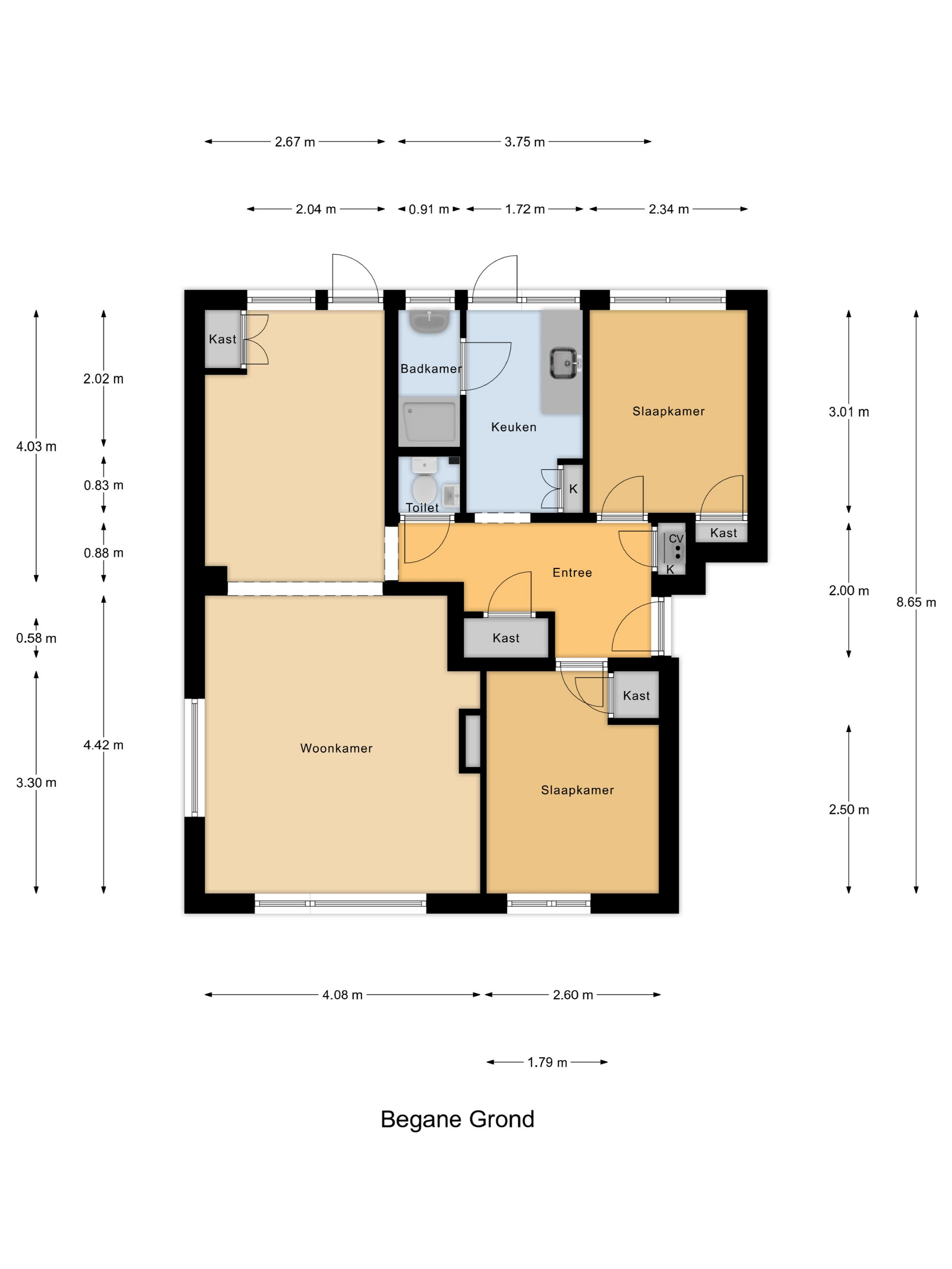 Vanuit deze centrale ruimte zijn vrijwel alle vertrekken direct toegankelijk: de kamer en suite, de keuken, beide slaapkamers en de toiletruimte. De hal beschikt over twee kasten waarvan in één ervan de cv-ketel (AWB 2015) is geplaatst.