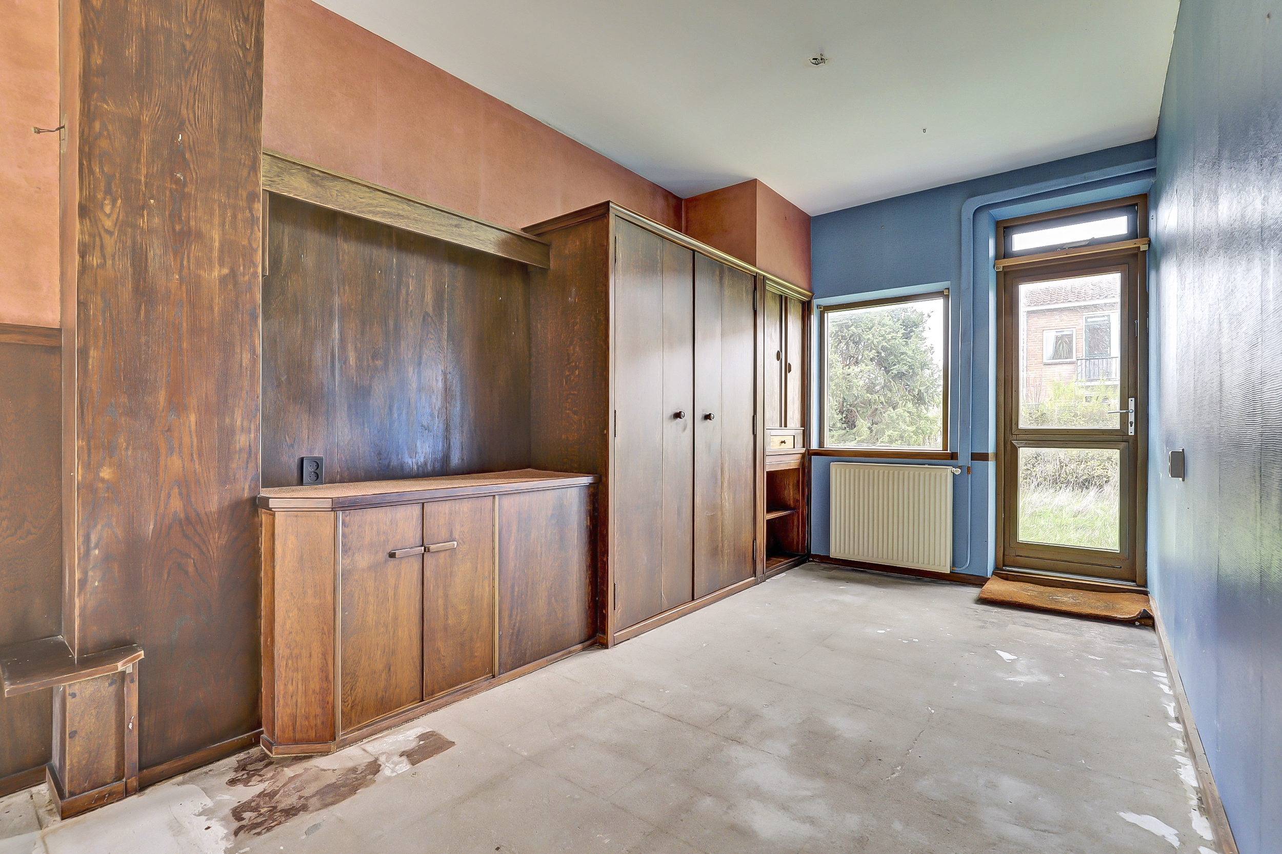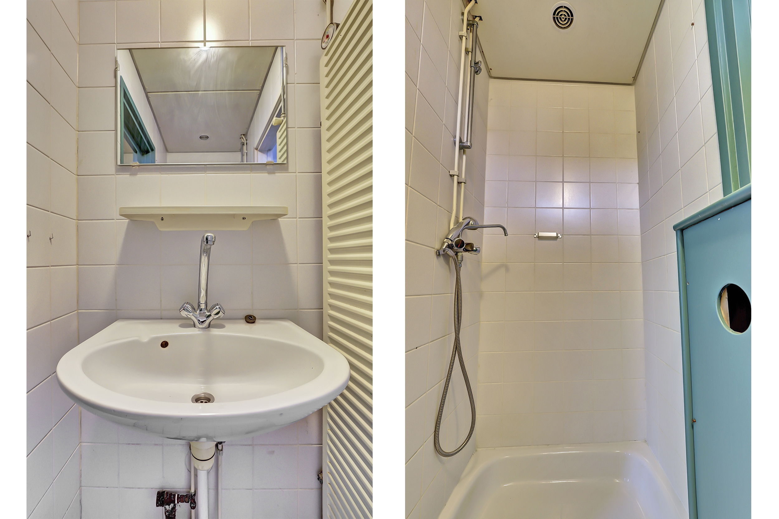 De kamer en suite ligt aan de tuinzijde en geeft direct toegang tot de achtertuin. De afwerking is eenvoudig en vraagt om modernisering, maar