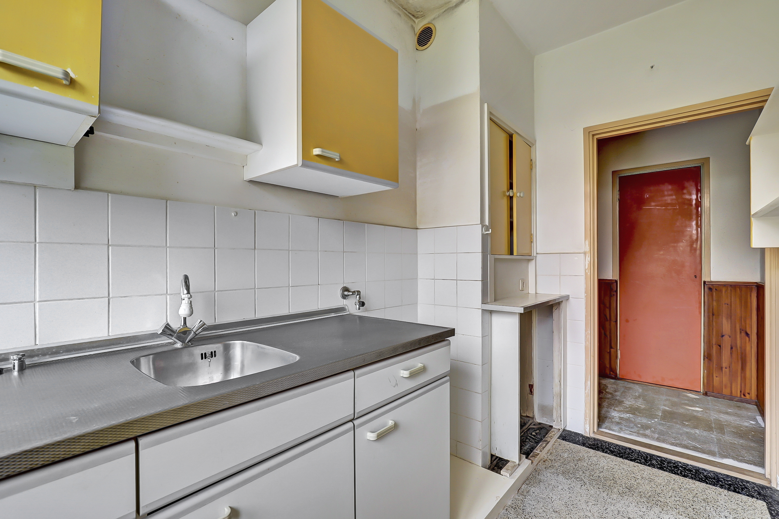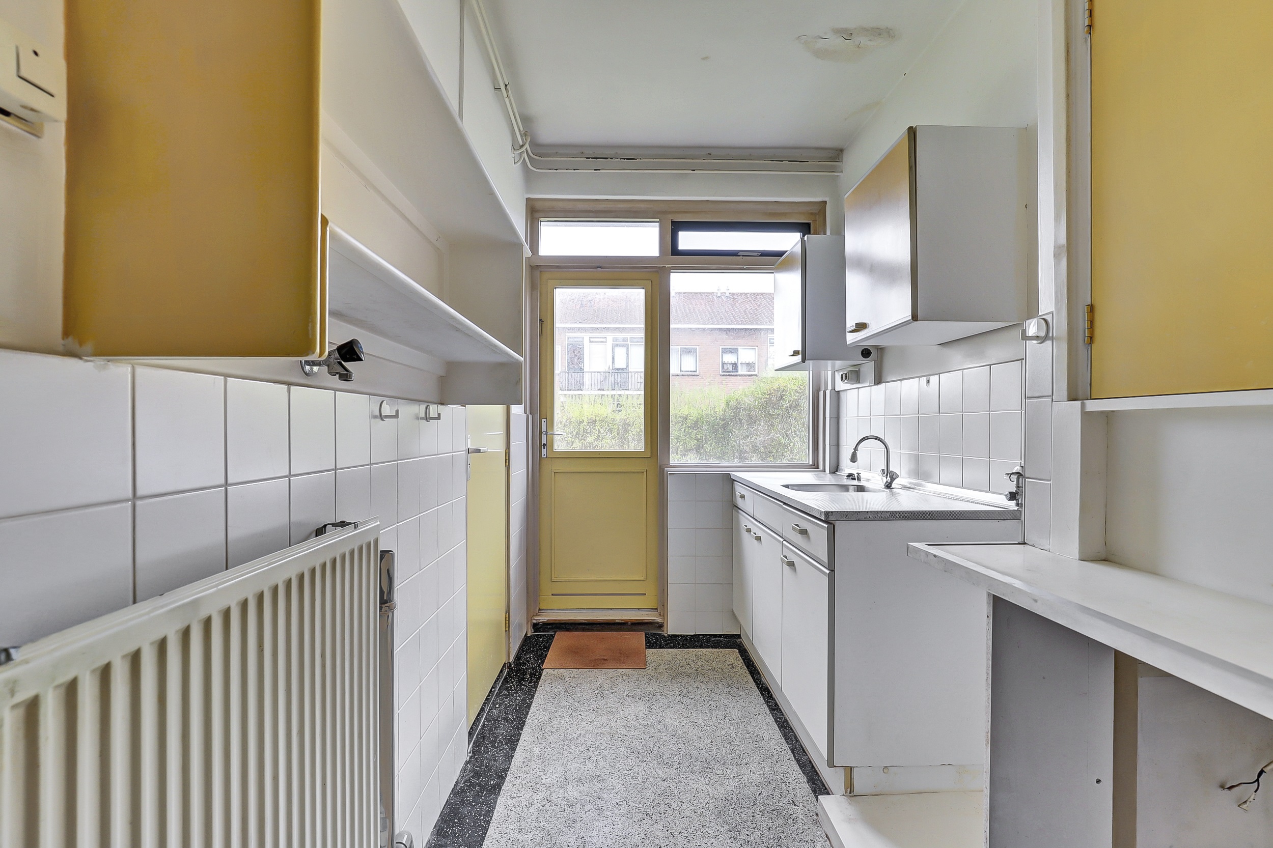 De keuken bevindt zich eveneens aan de achterzijde en is basic uitgevoerd. De aanwezige voorzieningen functioneren, maar sluiten niet aan bij hedendaagse woonwensen. Vanuit de keuken is de badkamer bereikbaar; deze is dus niet direct toegankelijk vanuit de hal. De badkamer is eenvoudig ingericht met een douche en wastafel.