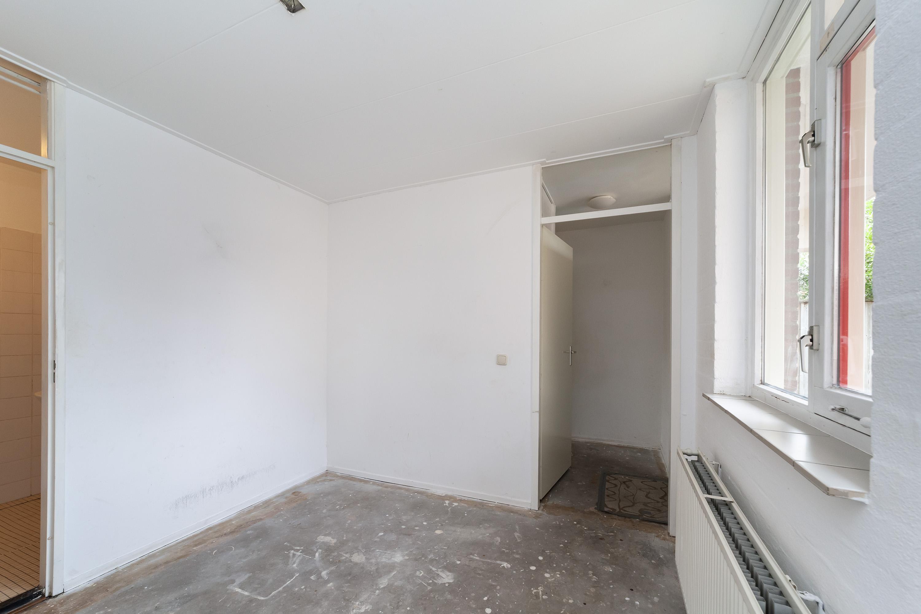 Aan de achterzijde van het appartement bevindt zich de slaapkamer, rustig gelegen en met directe toegang tot de badkamer. Dankzij de ligging aan de binnenzijde van het complex slaap je hier heerlijk stil. De badkamer is voorzien van een wastafel, douche en de aansluiting voor de wasmachine. Hier vind je tevens de CV-ketel (Intergas 2025).