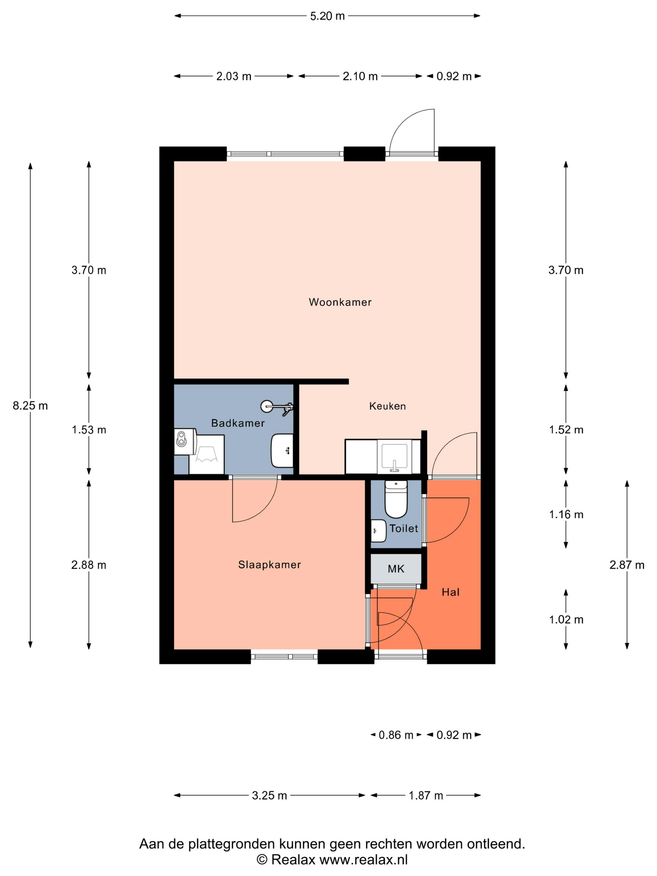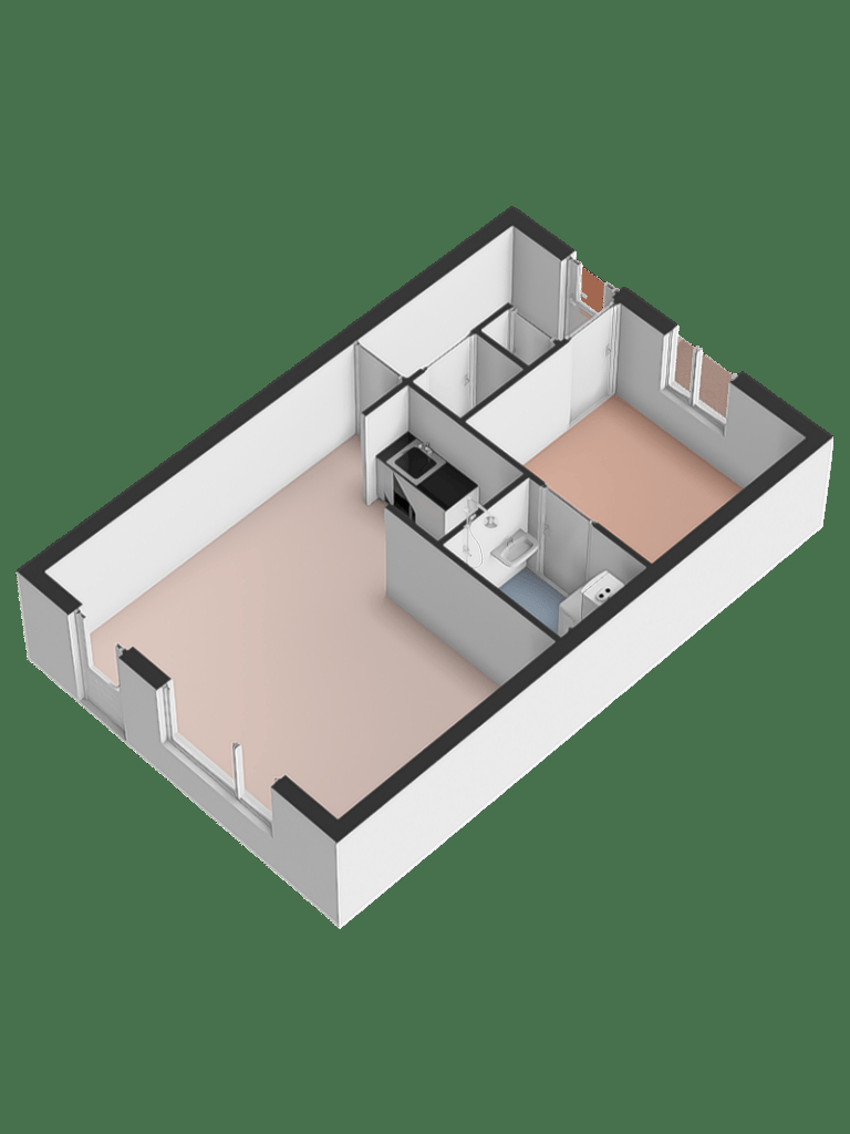 Via de parkeerplaats bereik je de voordeur van het appartement. Je komt binnen in de hal, waar direct links de slaapkamer en de badkamer te vinden zijn. Loop je verder, dan vind je aan de rechterzijde het separaat toilet en de meterkast. De eenvoudige (open) keuken bevindt zich aan de linkerzijde.