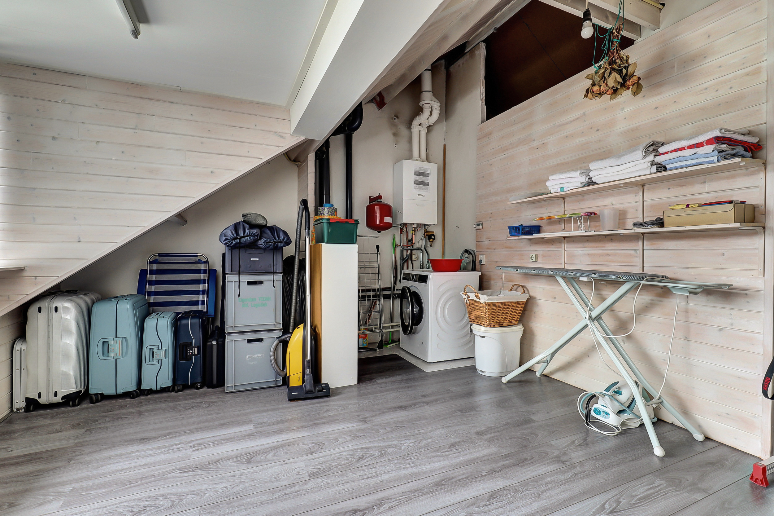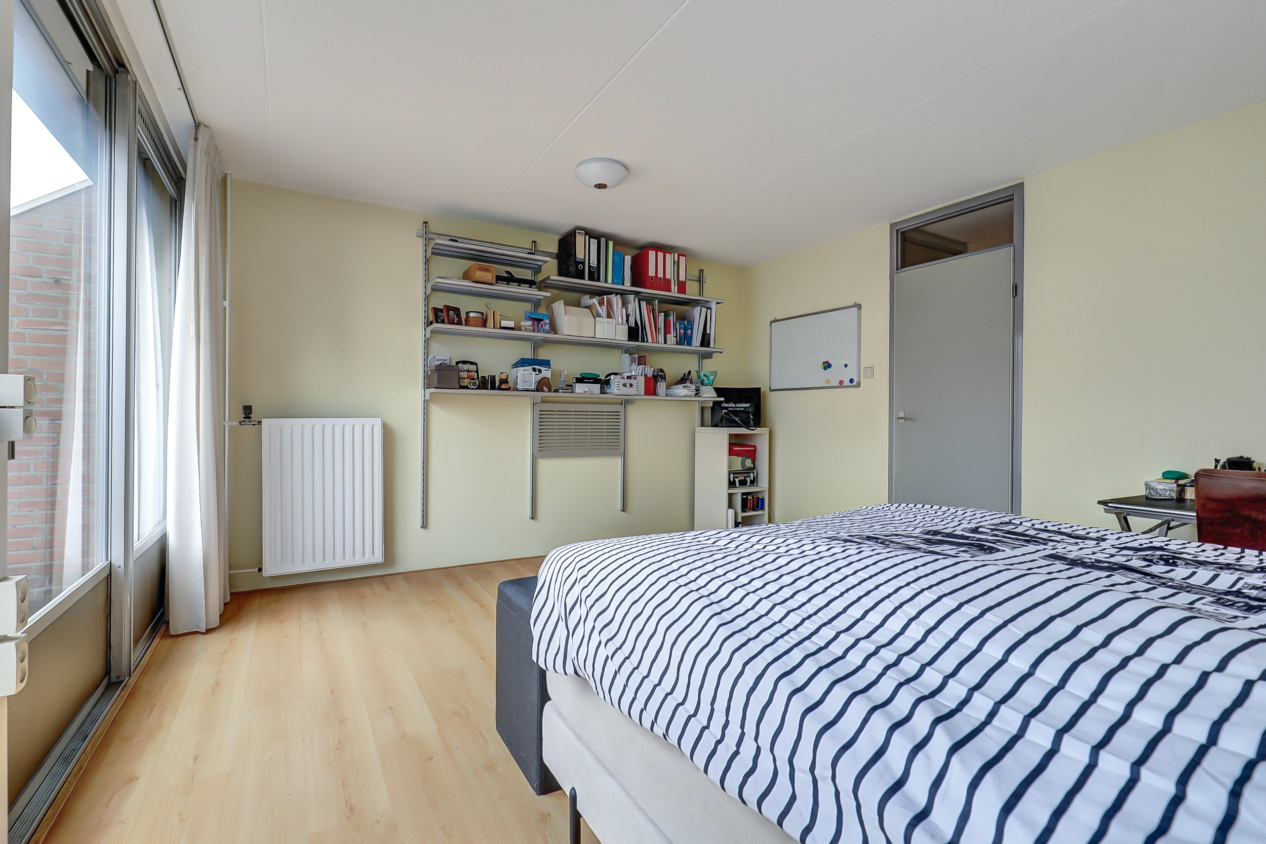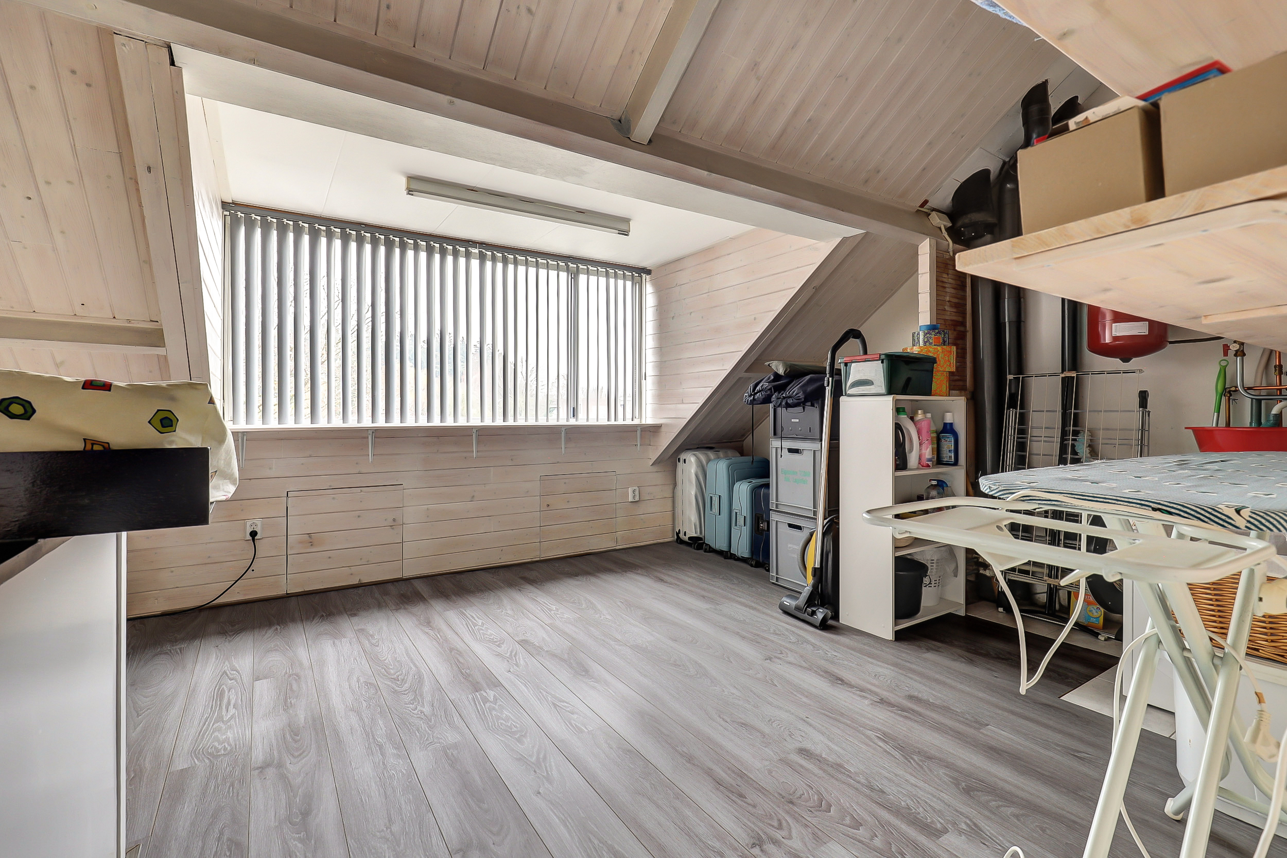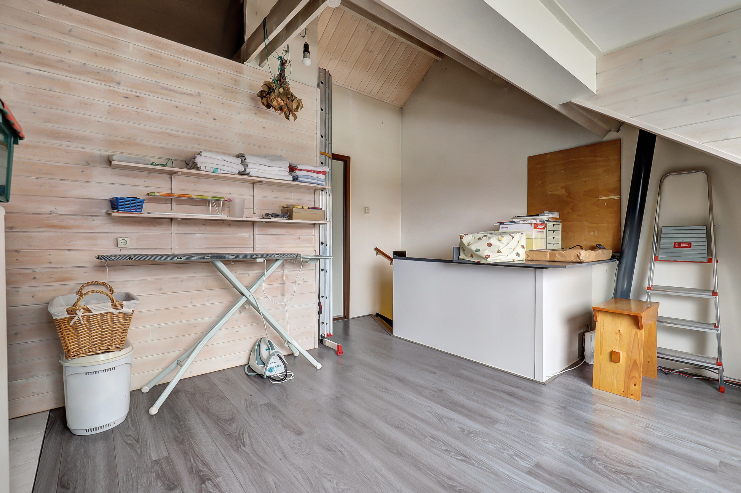 Via een vaste trap bereiken we de tweede verdieping. Hier bevindt zich de derde slaapkamer. Daarnaast is er extra bergruimte aanwezig, waardoor deze verdieping ook praktisch is voor opslag of een werkplek aan huis.