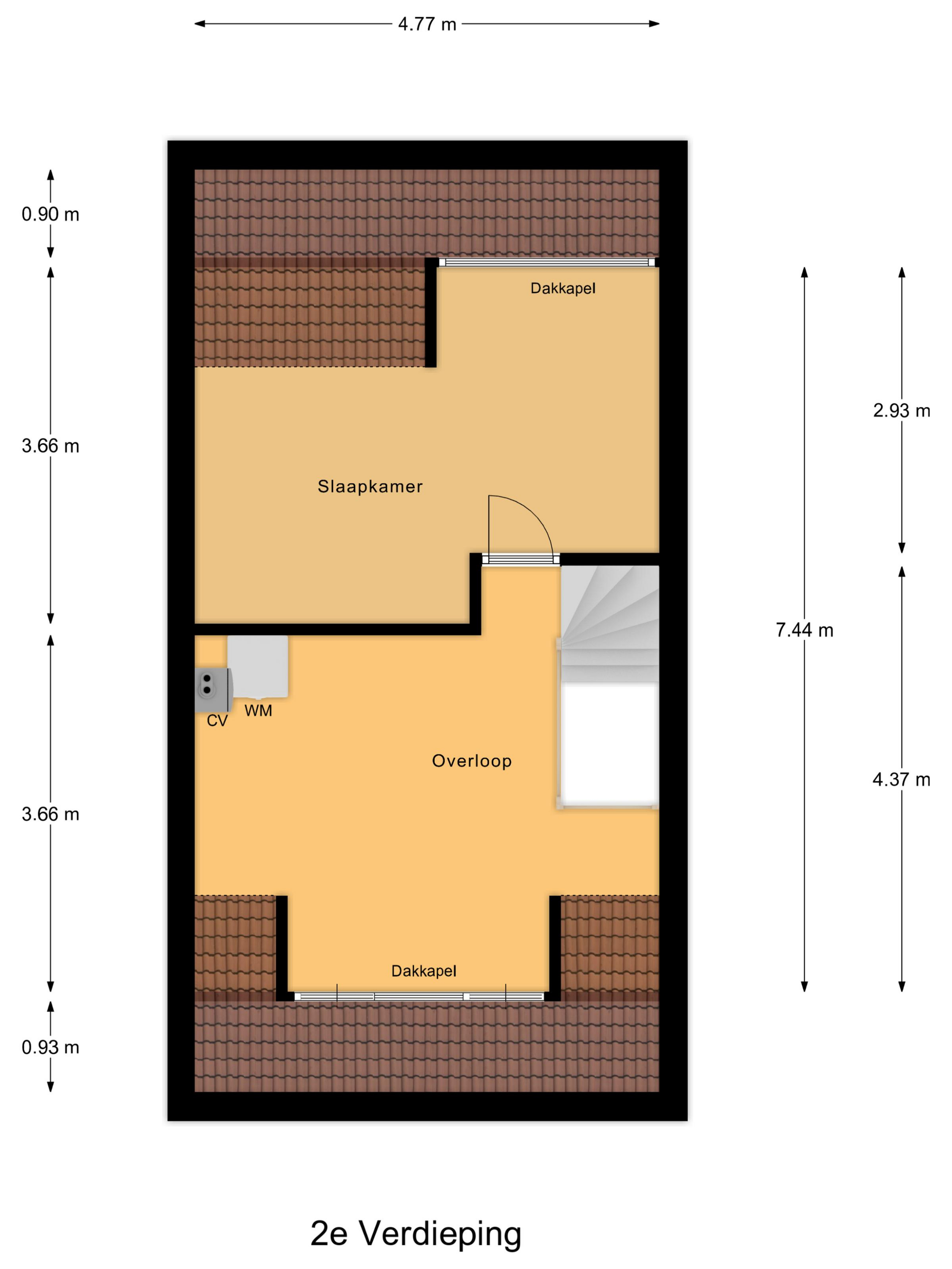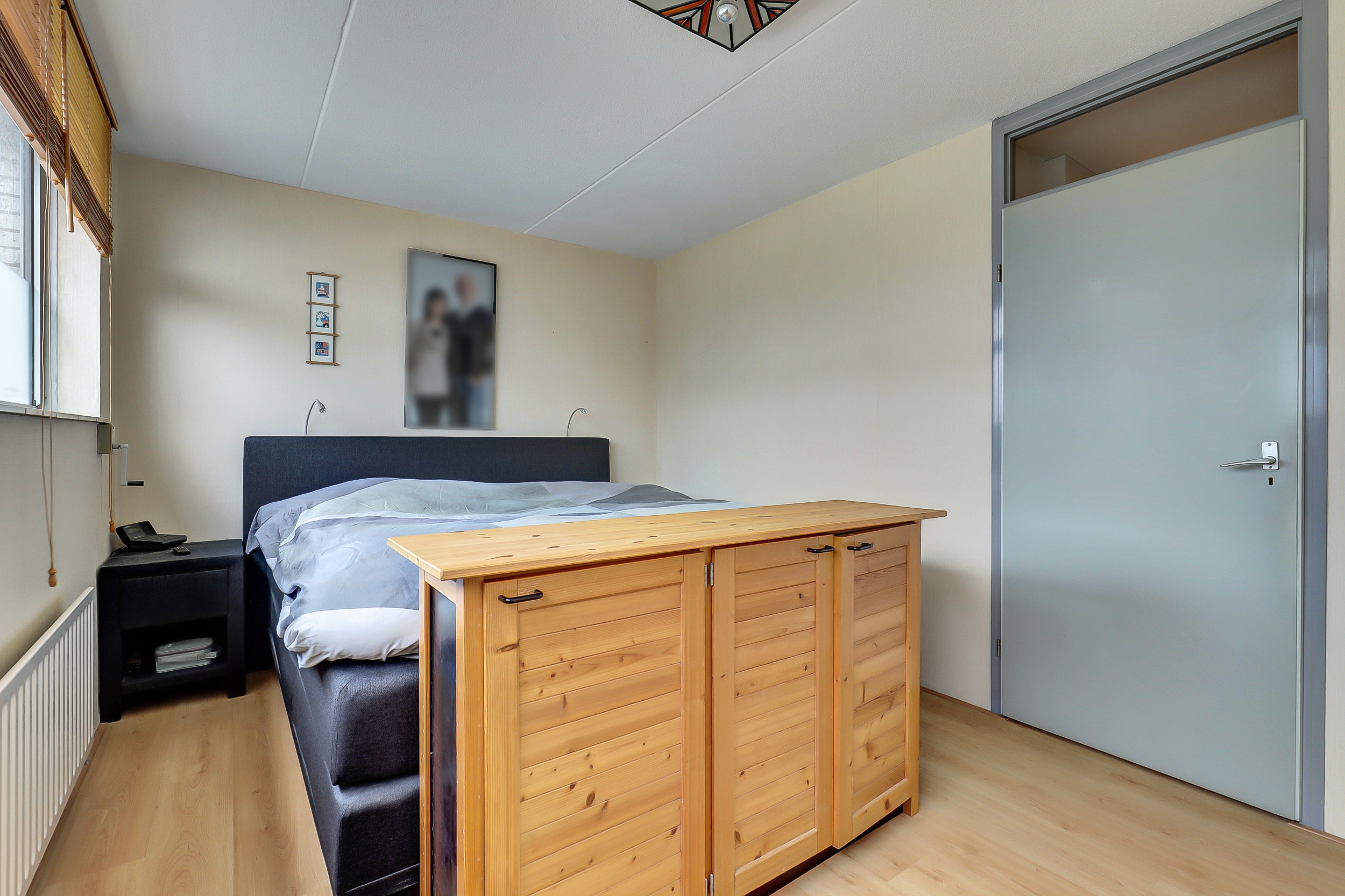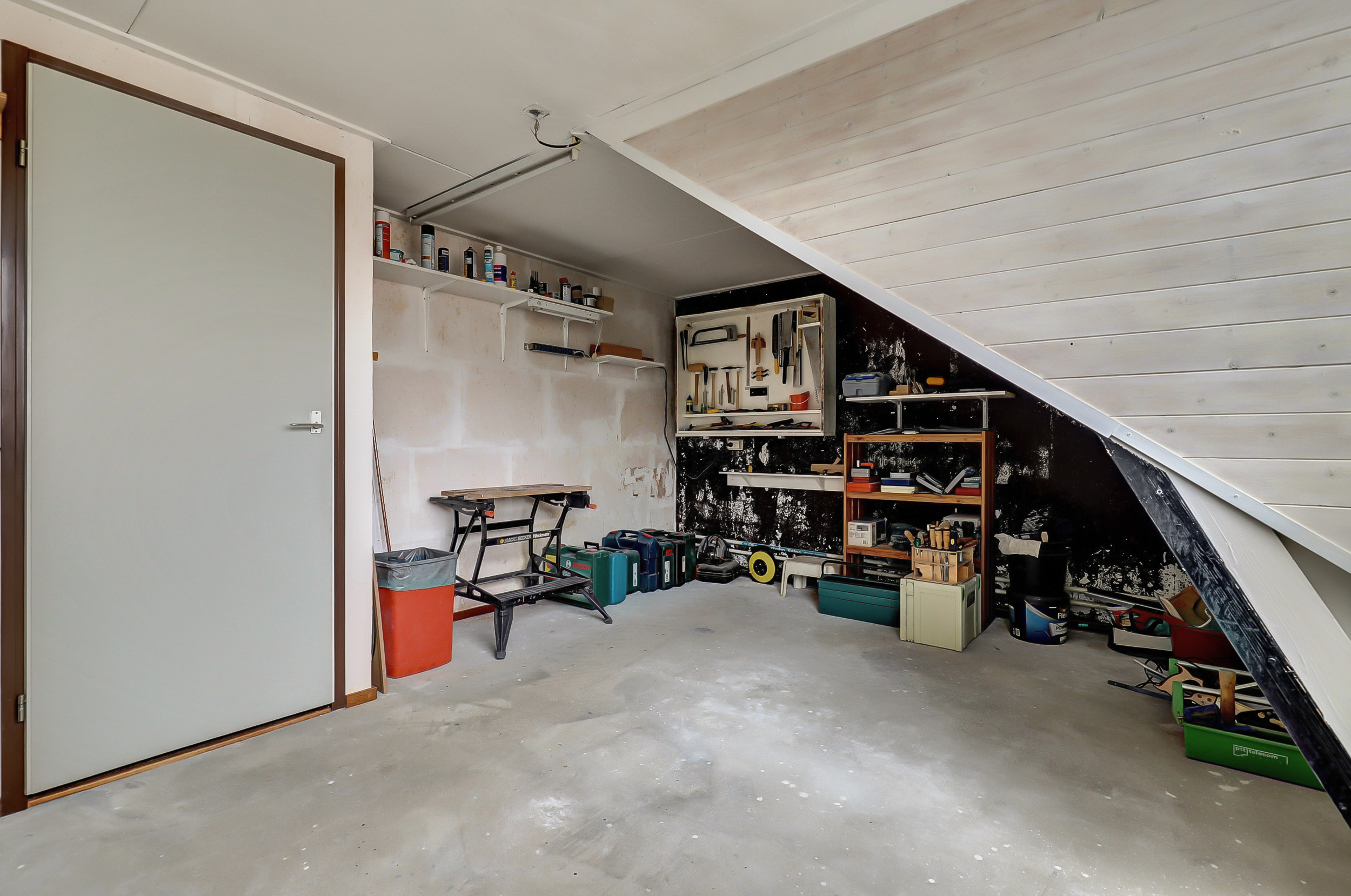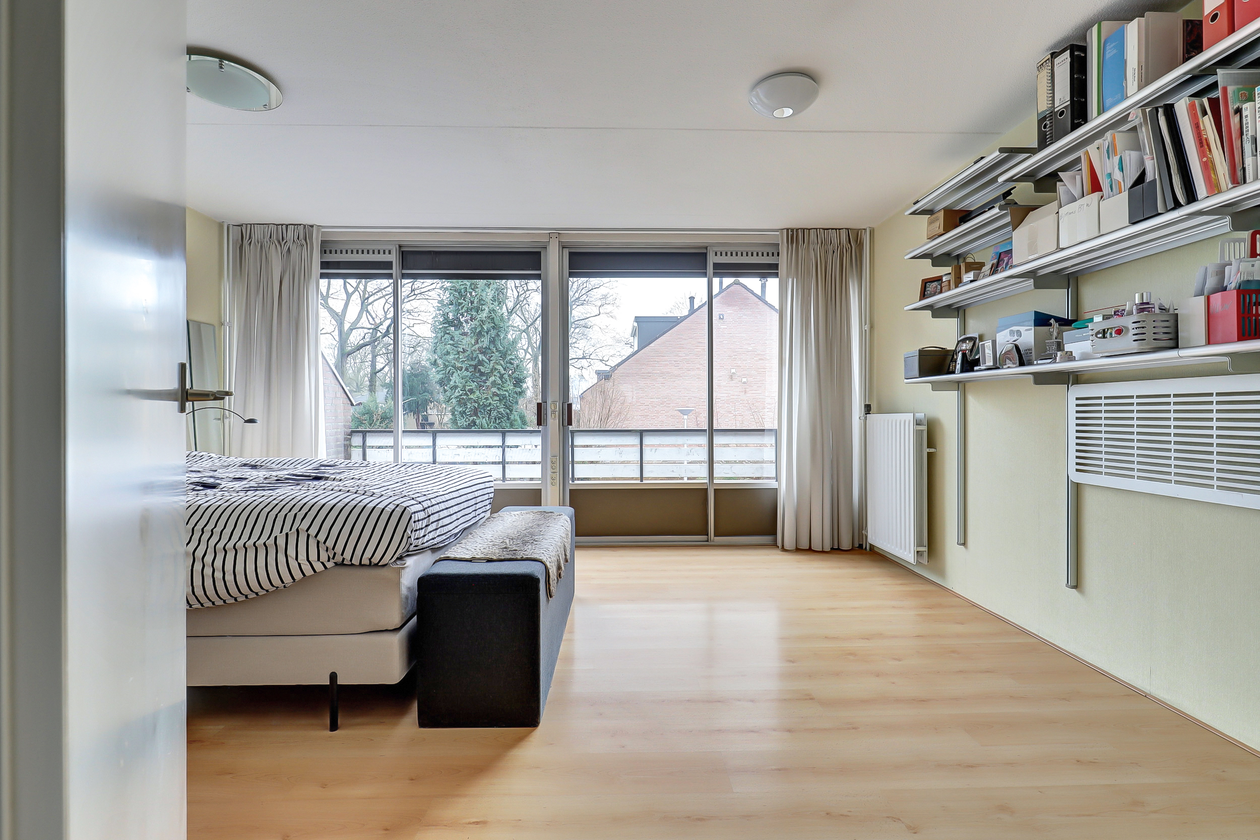 Via een vaste trap bereiken we de tweede verdieping. Hier bevindt zich de derde slaapkamer. Daarnaast is er extra bergruimte aanwezig, waardoor deze verdieping ook praktisch is voor opslag of een werkplek aan huis.