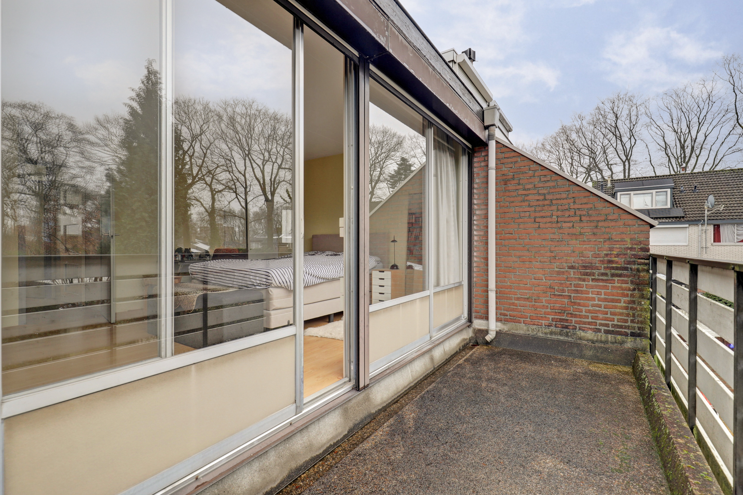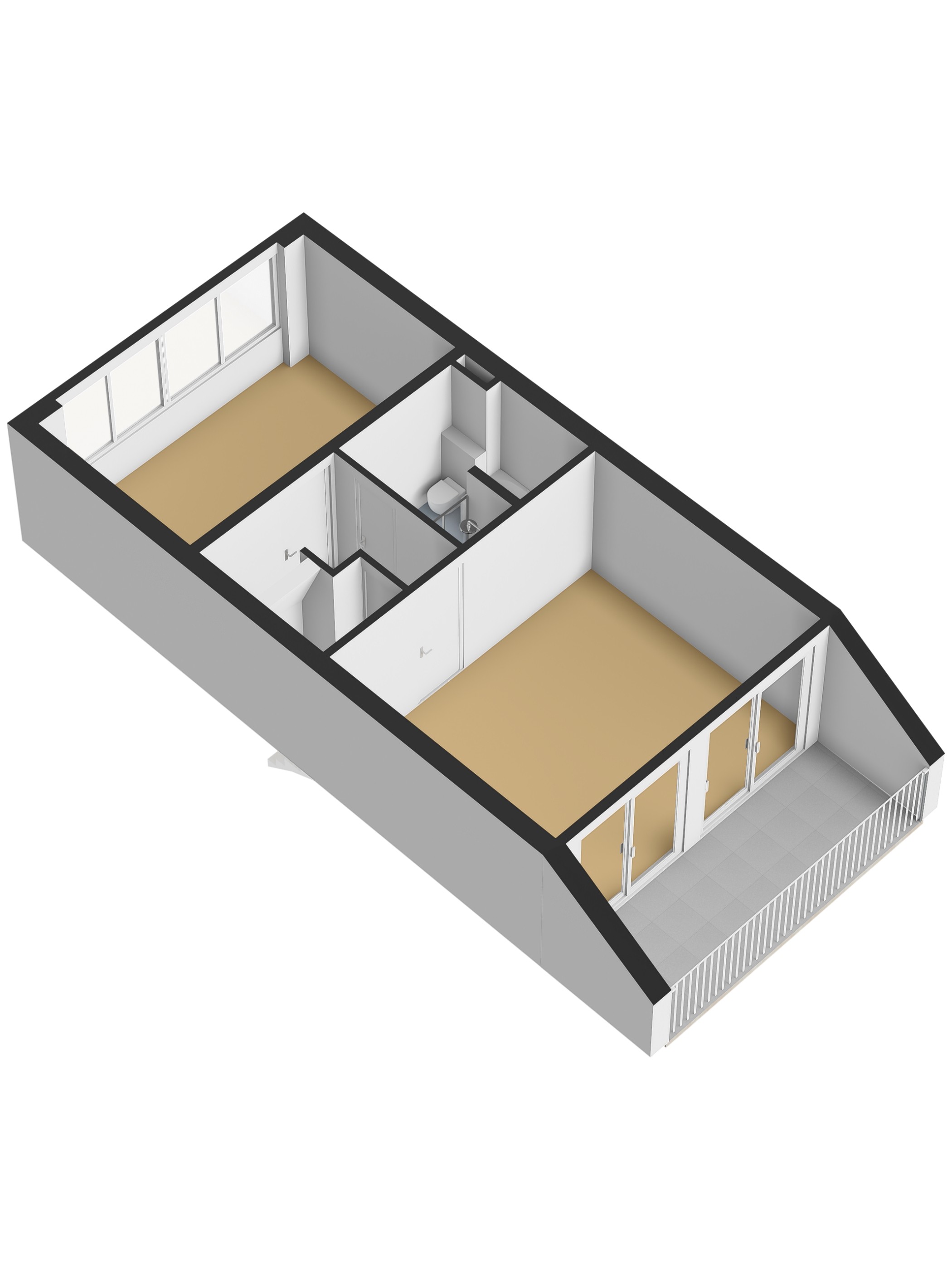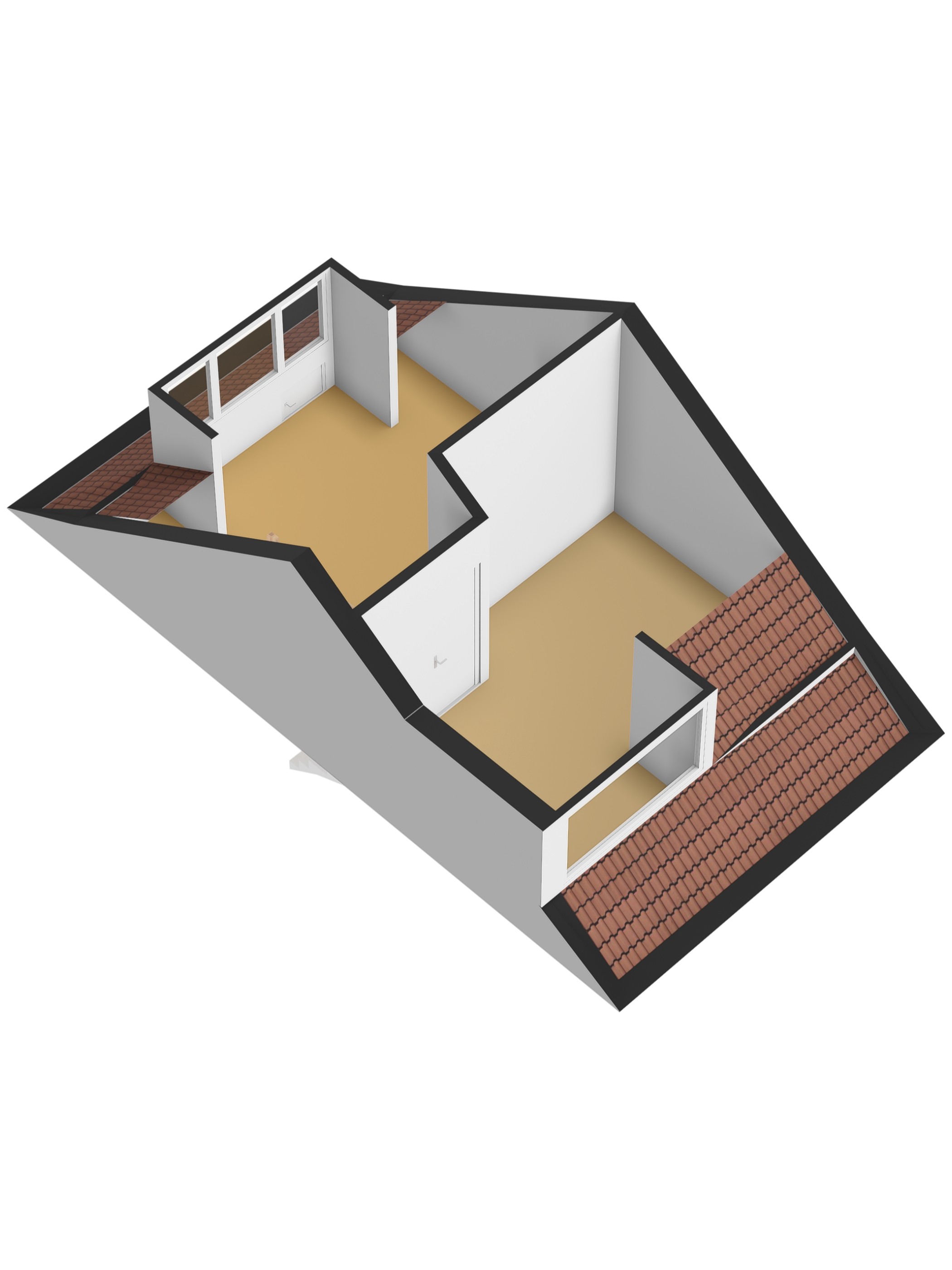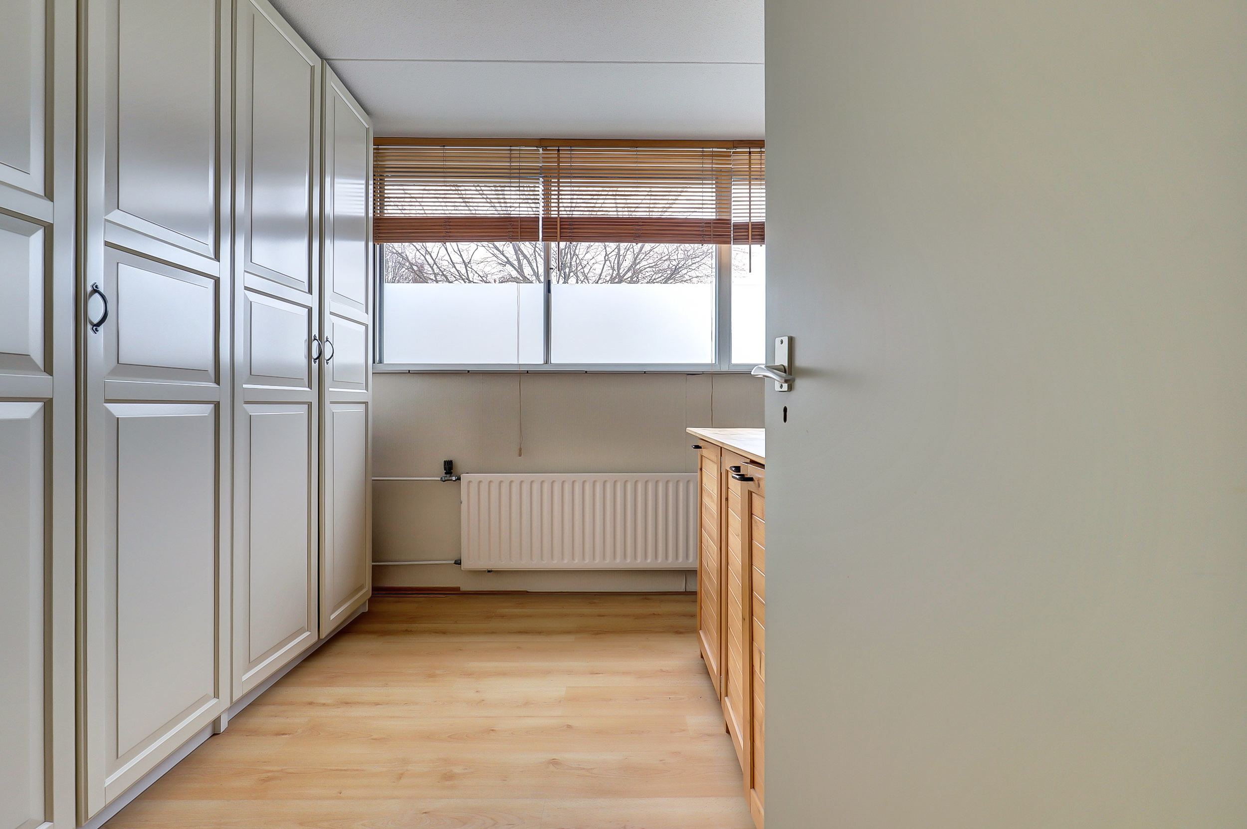 Via een vaste trap bereiken we de tweede verdieping. Hier bevindt zich de derde slaapkamer. Daarnaast is er extra bergruimte aanwezig, waardoor deze verdieping ook praktisch is voor opslag of een werkplek aan huis.