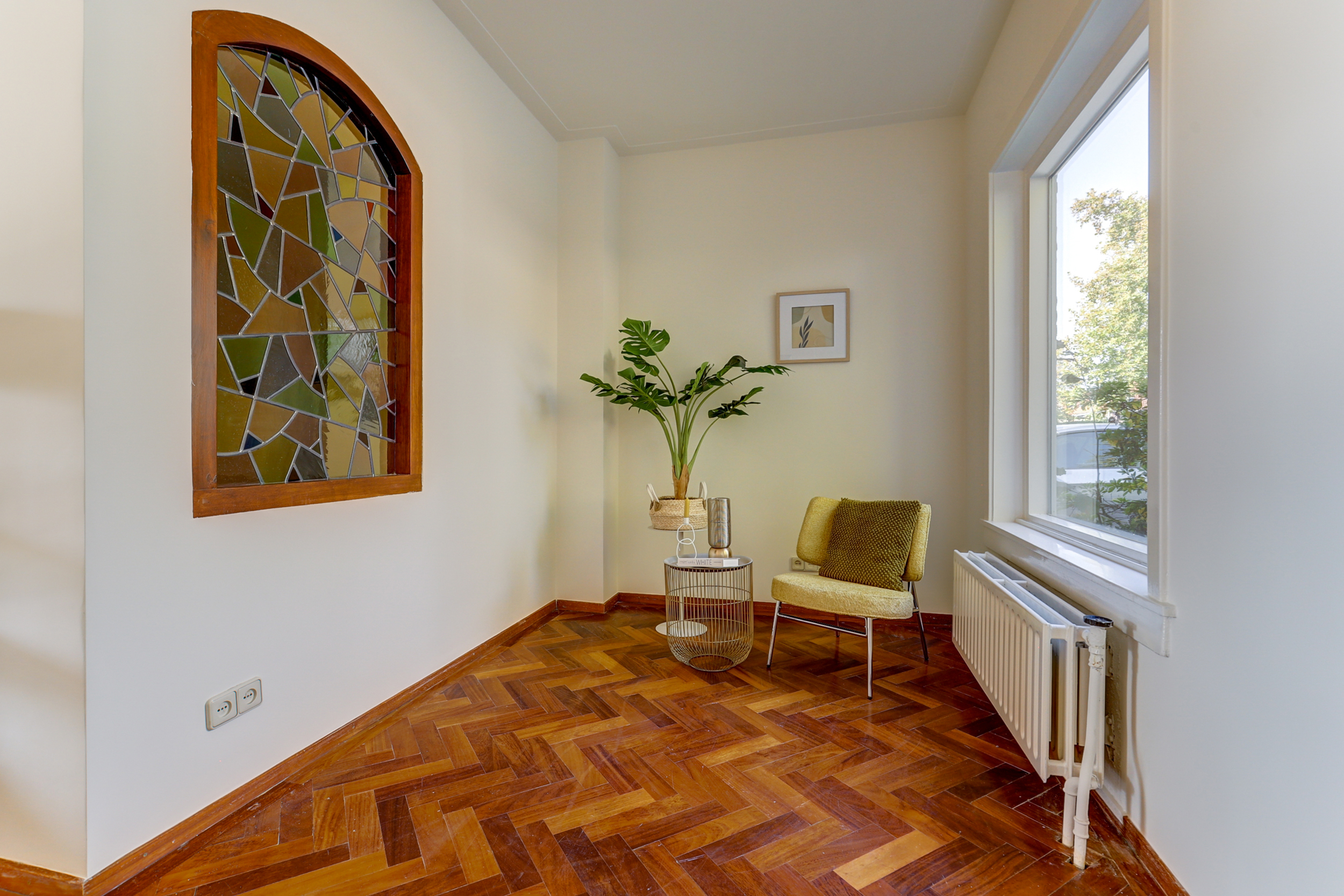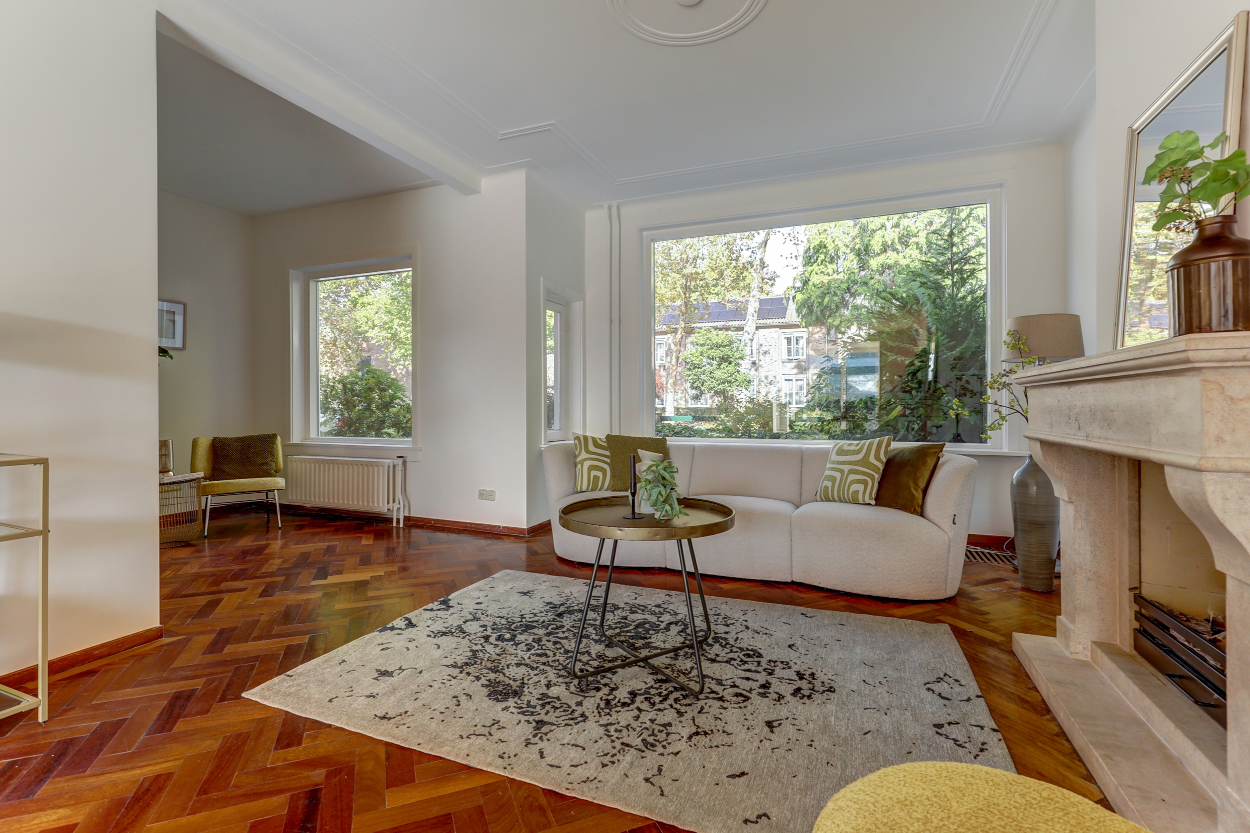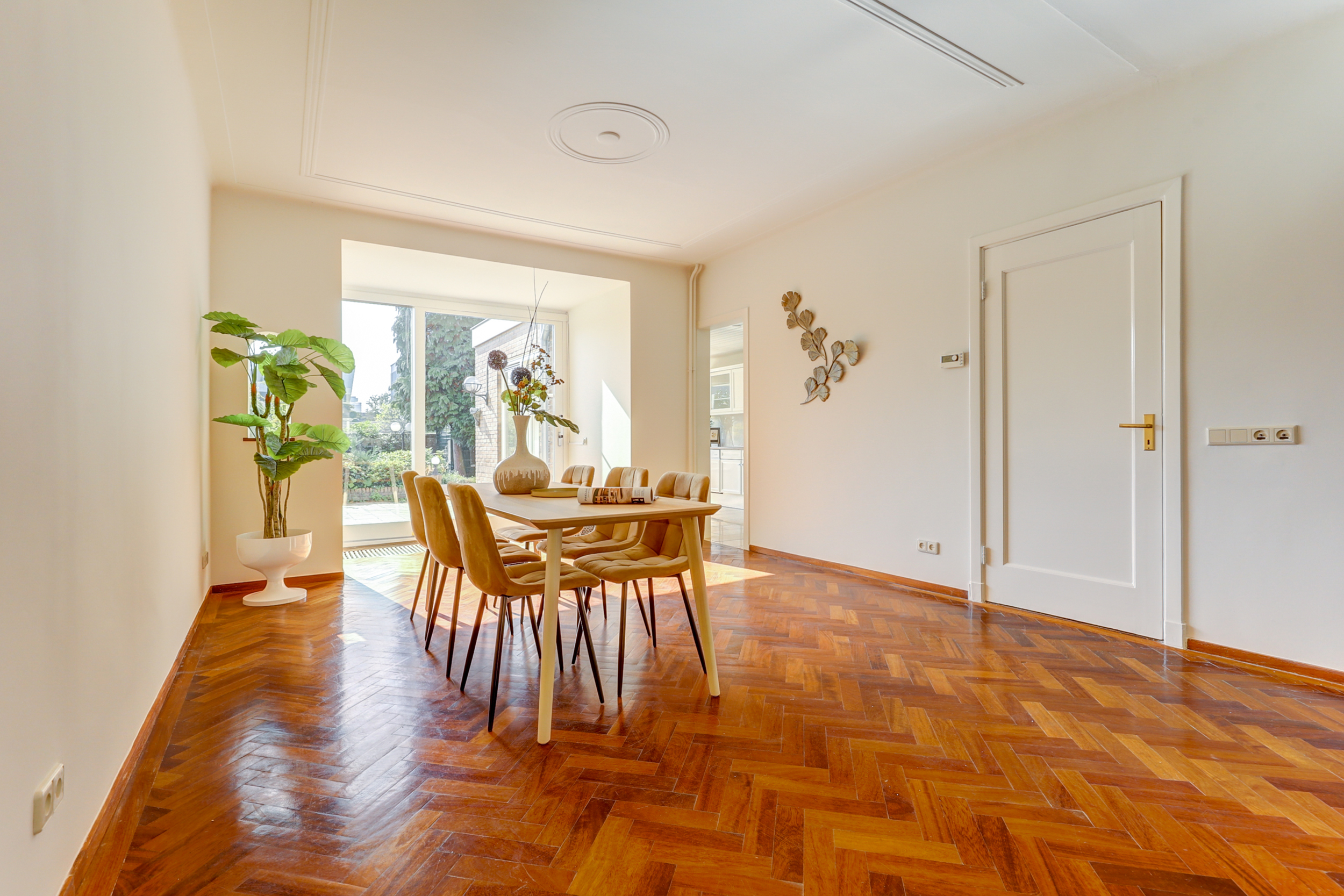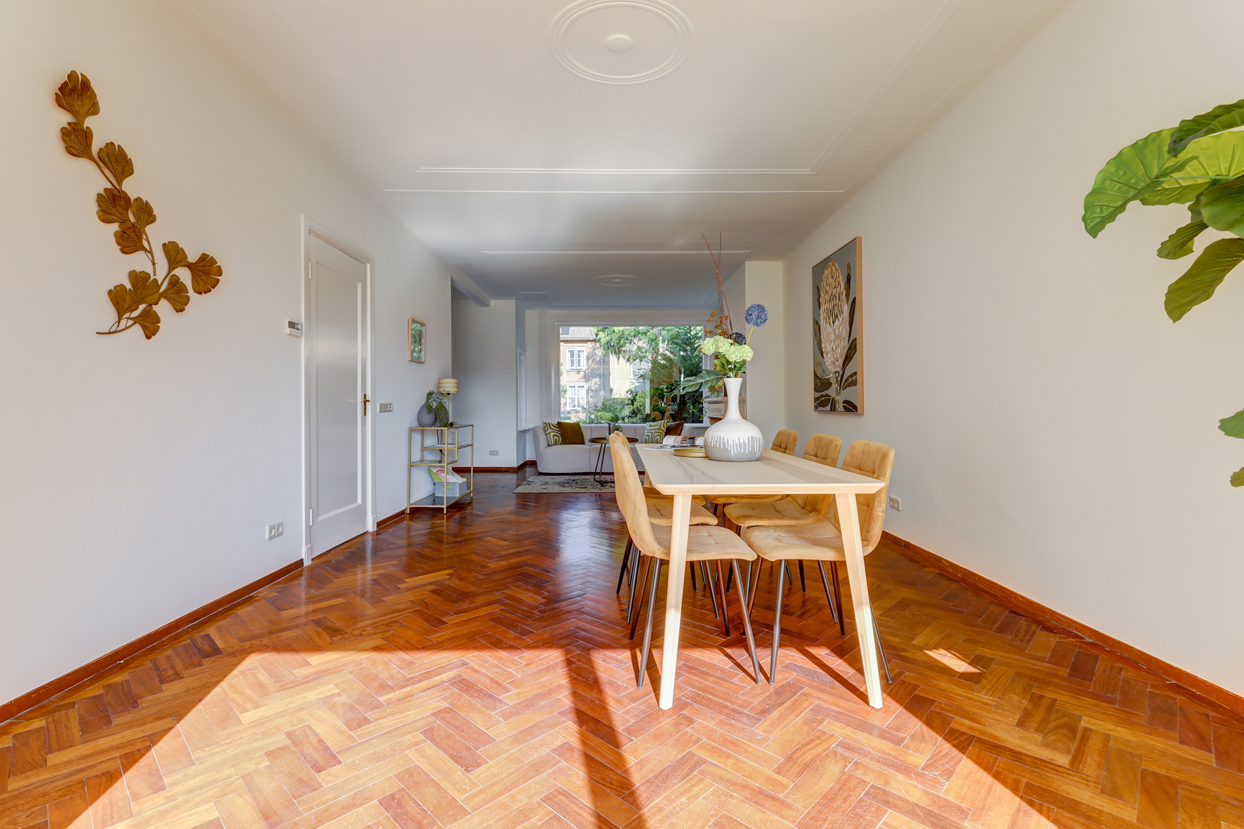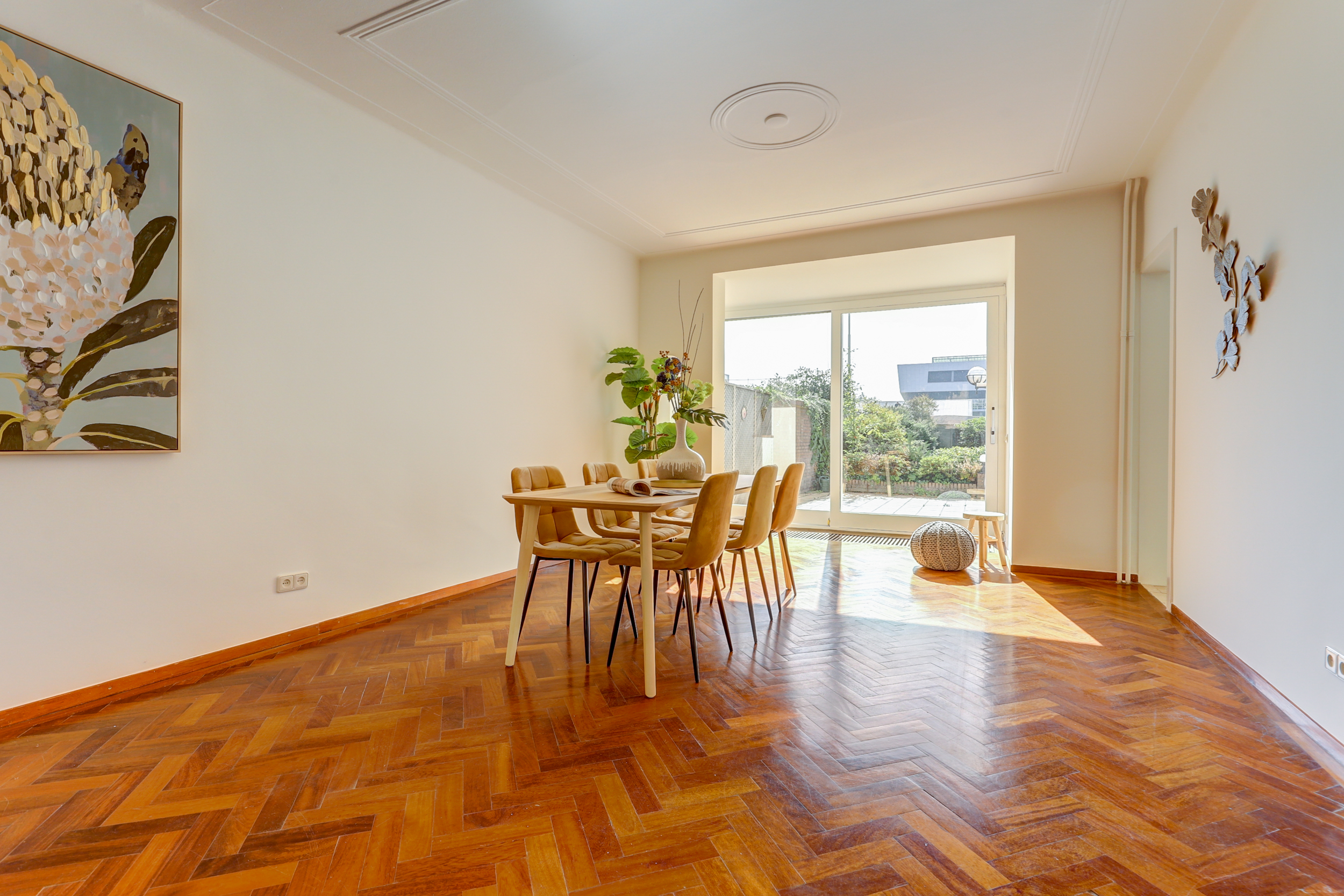 De hal met marmeren vloer geeft direct een gevoel van klasse. In de woonkamer met uitbouw zorgen de schuifpui en grote ramen voor een prettige lichtinval en een fijne verbinding met de diepe tuin. De parketvloer voegt warmte toe, terwijl de originele elementen de sfeer bepalen.