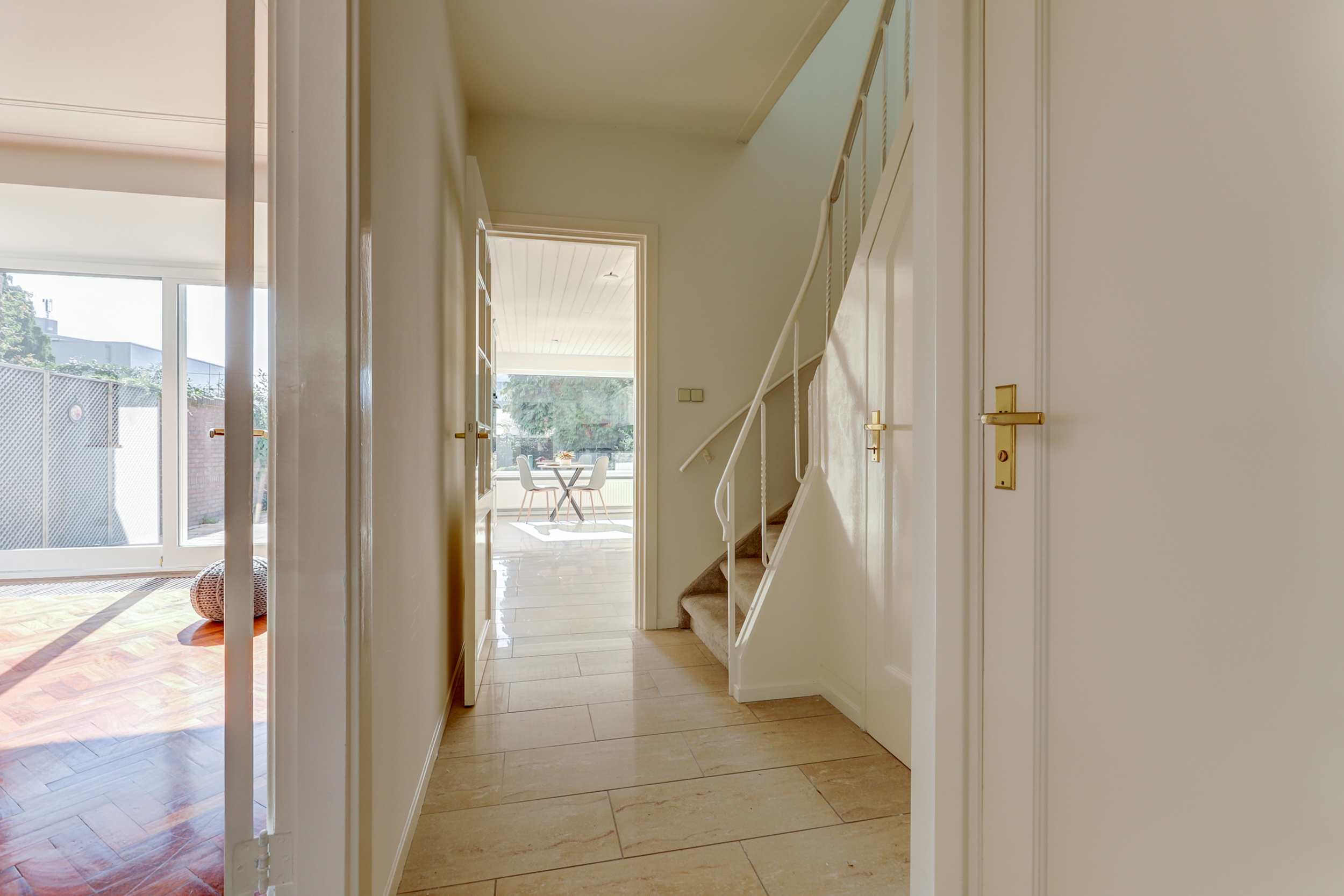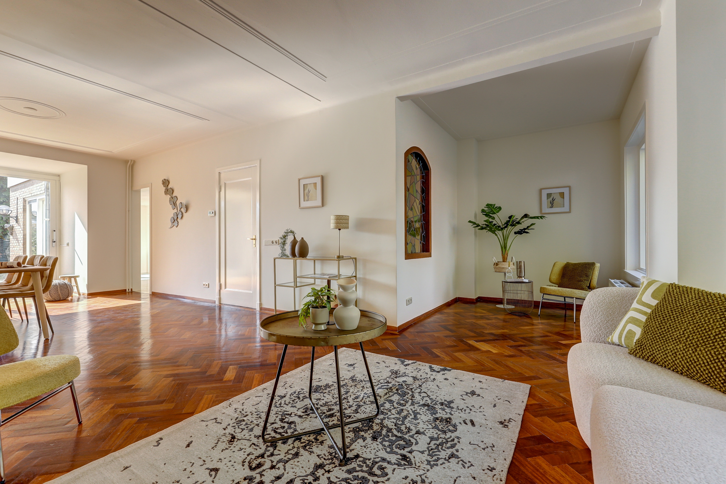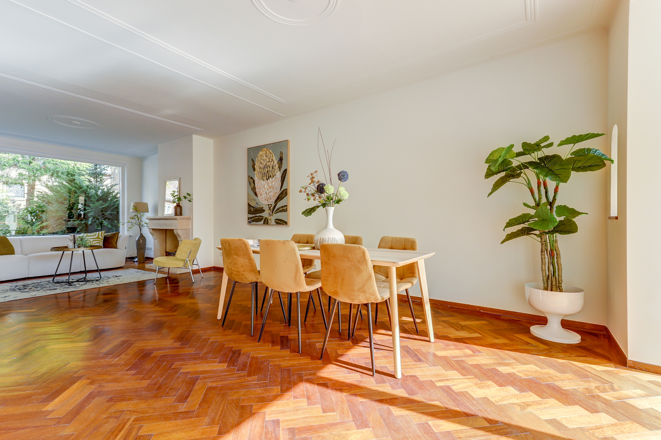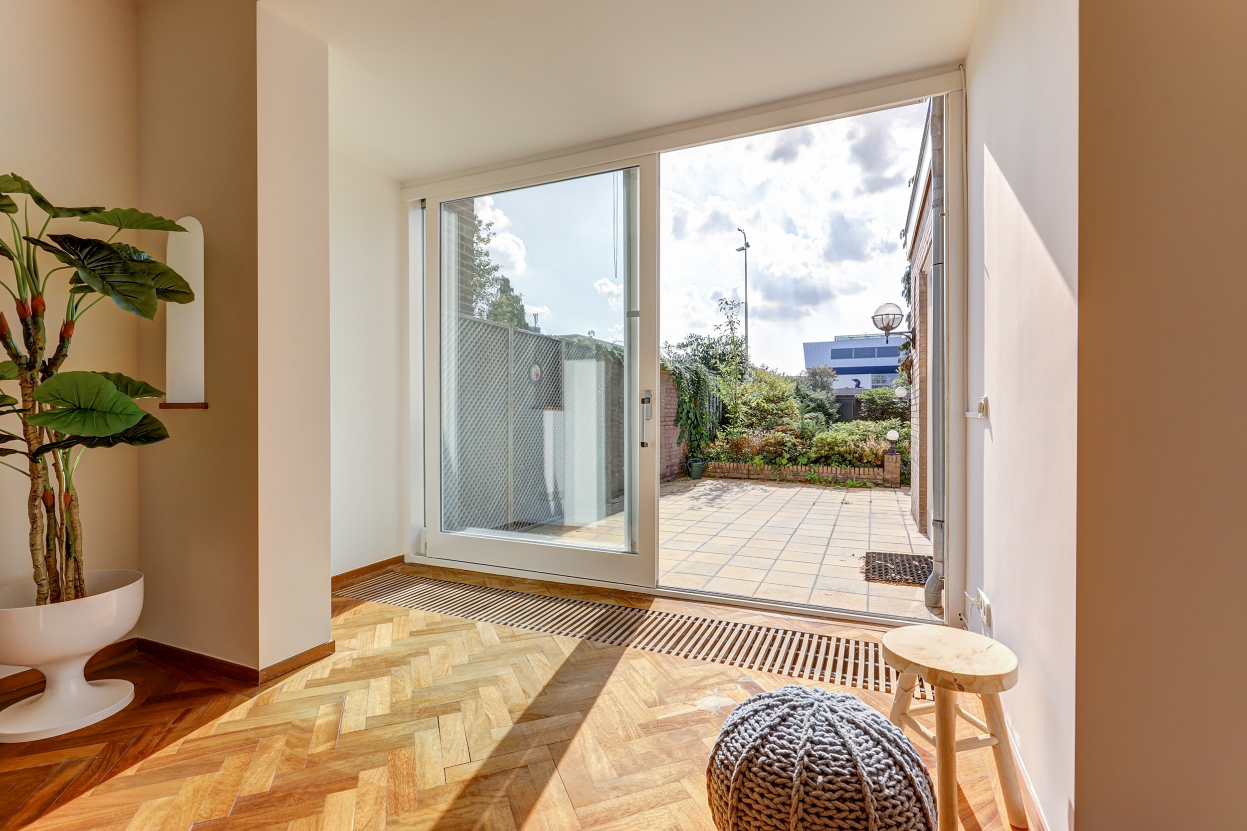 De hal met marmeren vloer geeft direct een gevoel van klasse. In de woonkamer met uitbouw zorgen de schuifpui en grote ramen voor een prettige lichtinval en een fijne verbinding met de diepe tuin. De parketvloer voegt warmte toe, terwijl de originele elementen de sfeer bepalen.