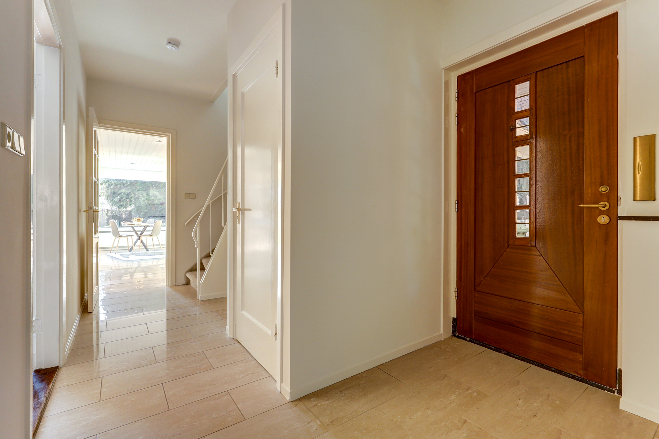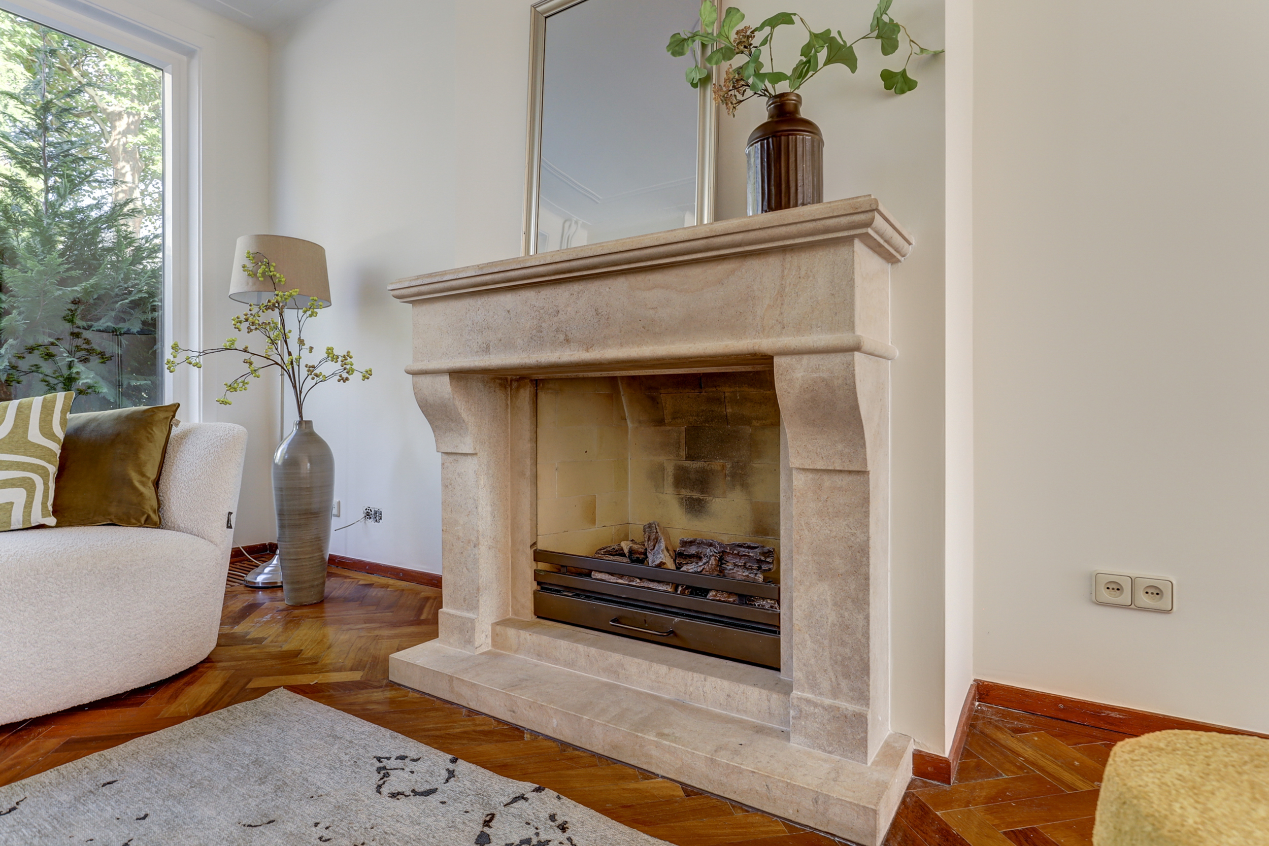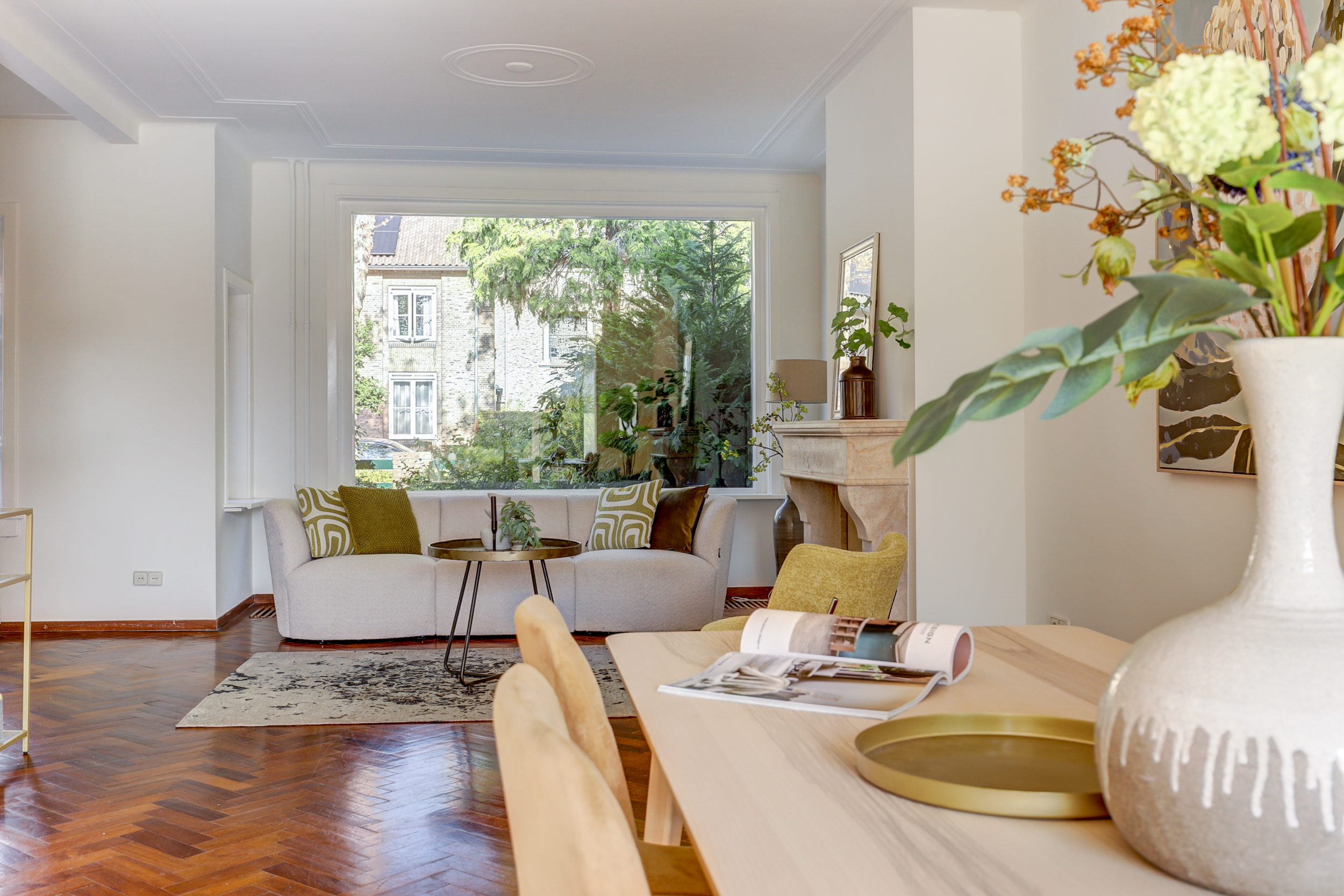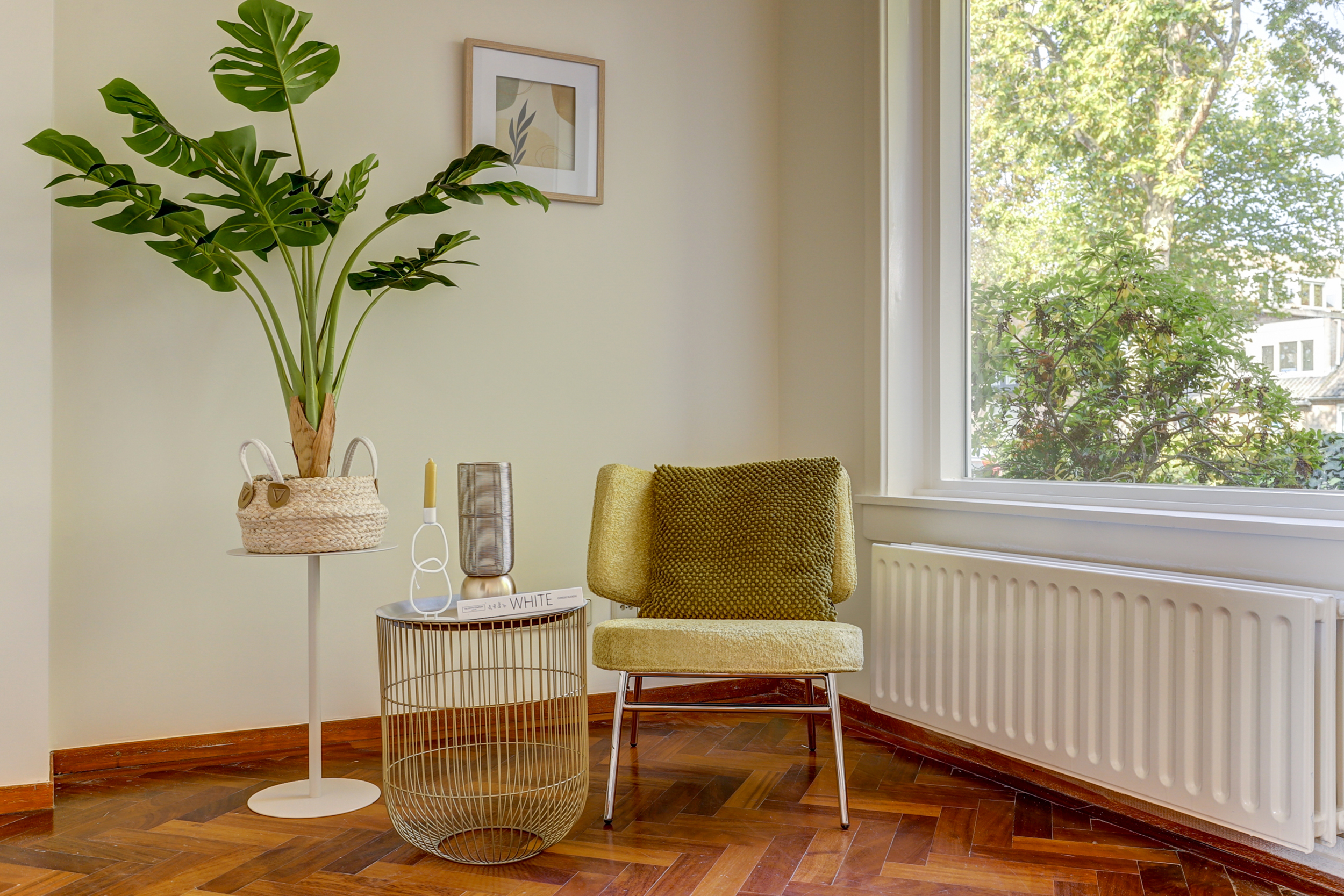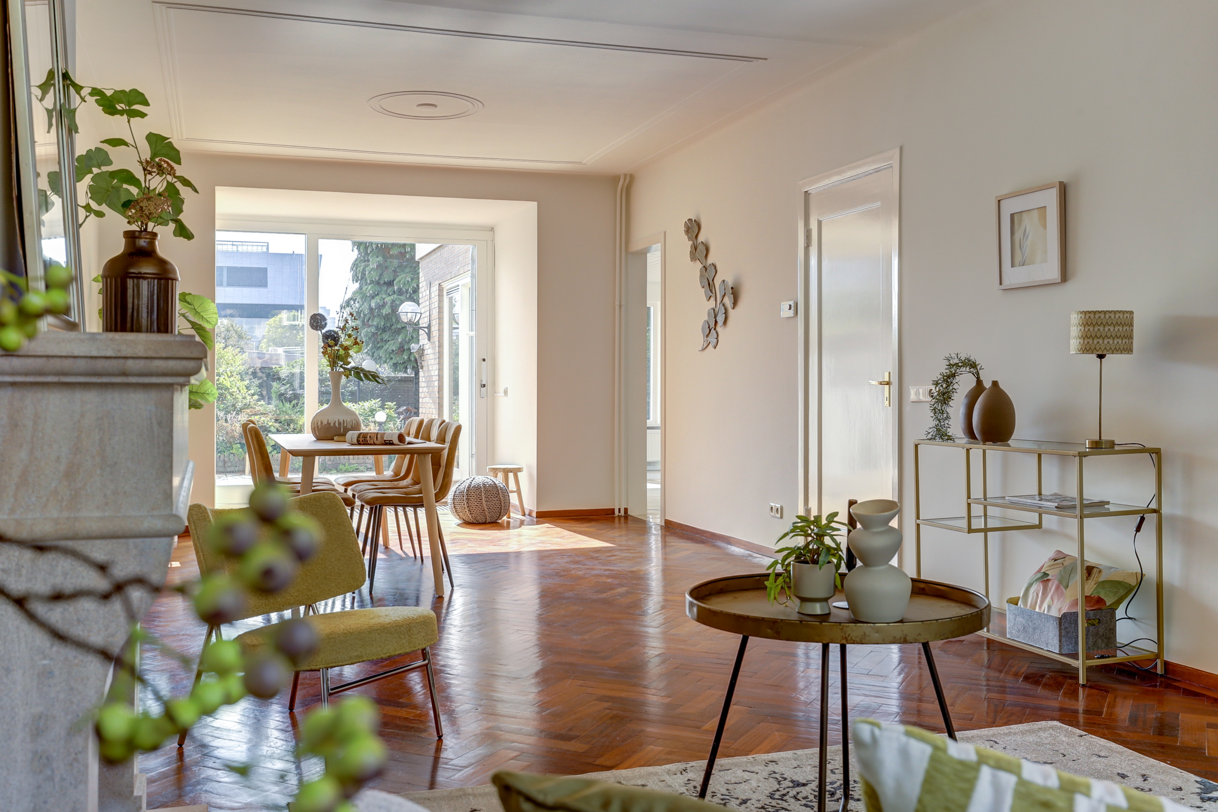 De hal met marmeren vloer geeft direct een gevoel van klasse. In de woonkamer met uitbouw zorgen de schuifpui en grote ramen voor een prettige lichtinval en een fijne verbinding met de diepe tuin. De parketvloer voegt warmte toe, terwijl de originele elementen de sfeer bepalen.