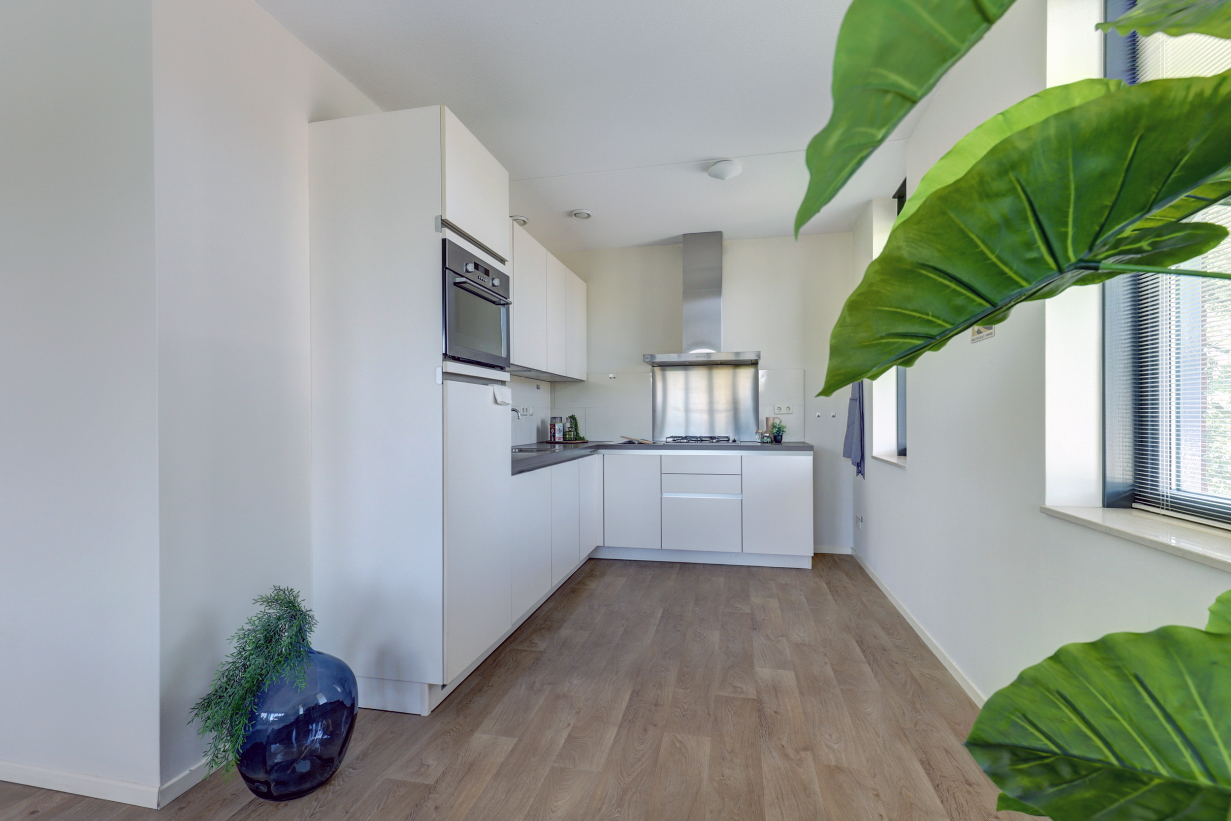 Binnen valt het daglicht als eerste op. De woonkamer is ruim opgezet en heeft aan de voor- én zijkant grote raampartijen die open kunnen. Op zomerse dagen zet je alles wijd open voor frisse lucht en een directe connectie met buiten; op koelere dagen geniet je van het royale licht en het vrije zicht. De open keuken sluit logisch aan. Denk aan voldoende werkblad en ruimte voor de aanwezige inbouwapparatuur. Koken, bijpraten, krantje erbij—het gebeurt hier allemaal in één vloeiende ruimte.