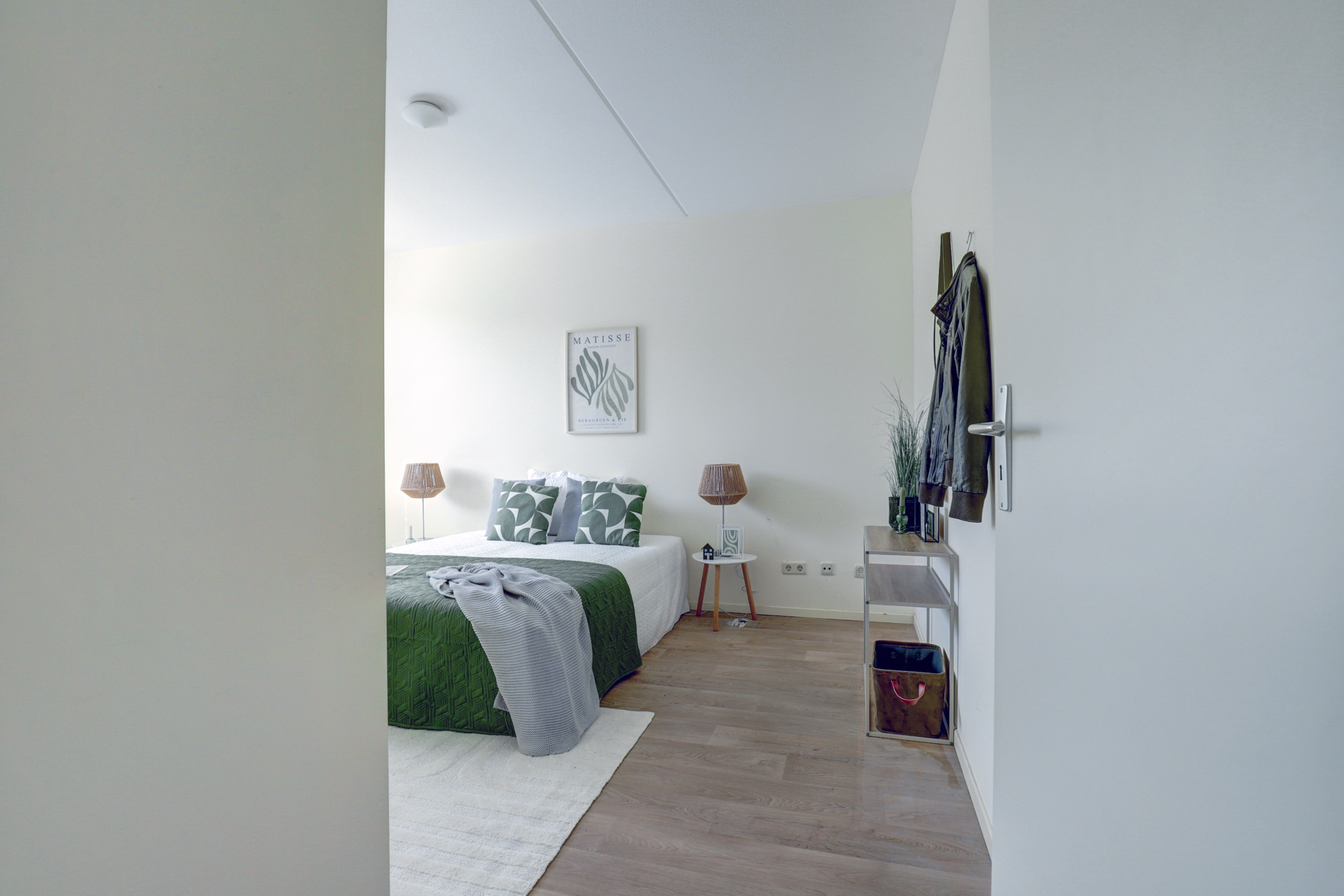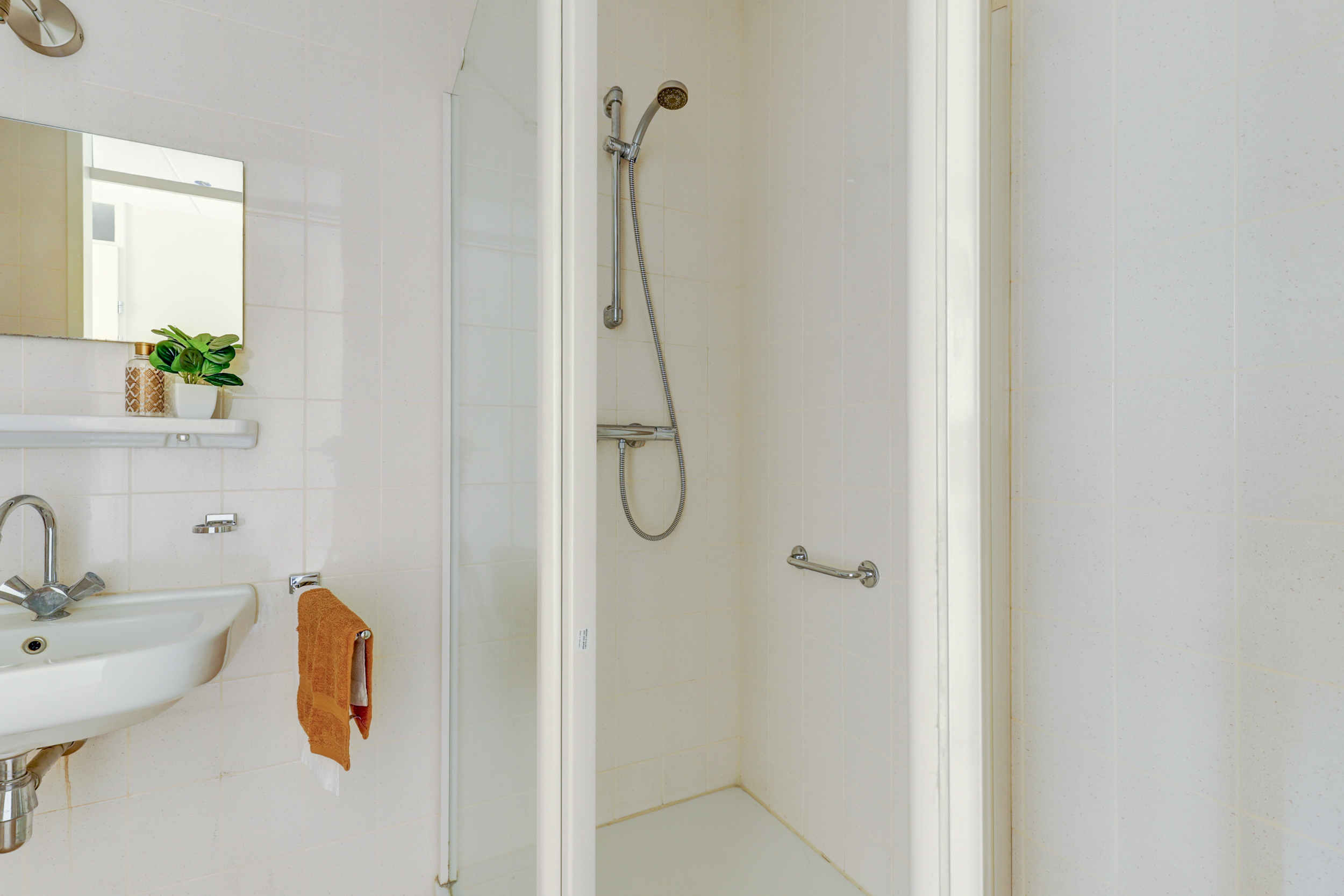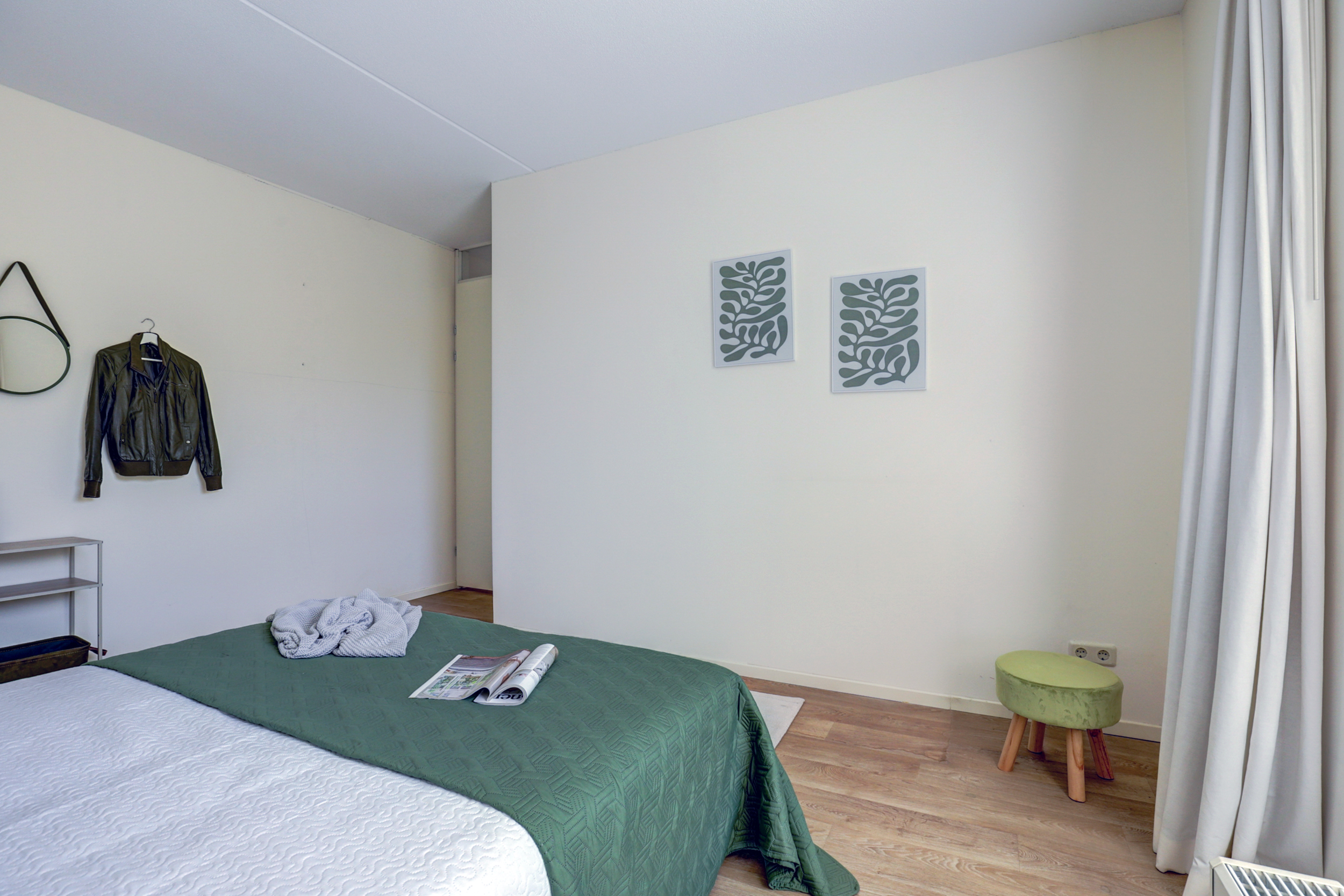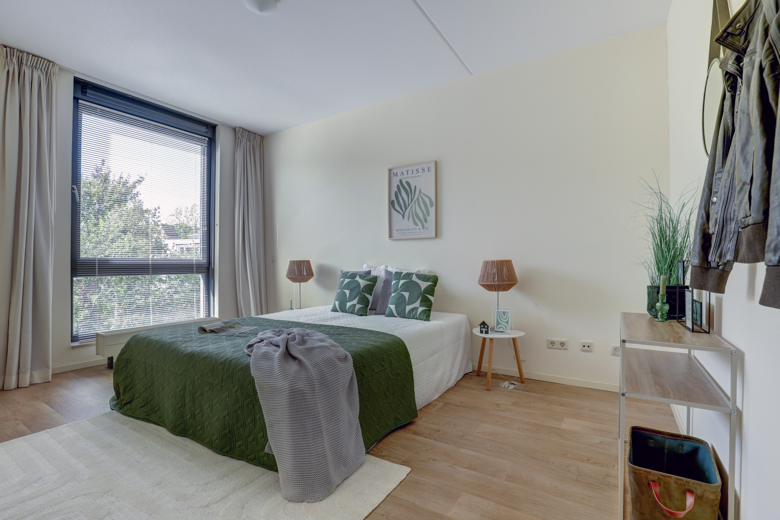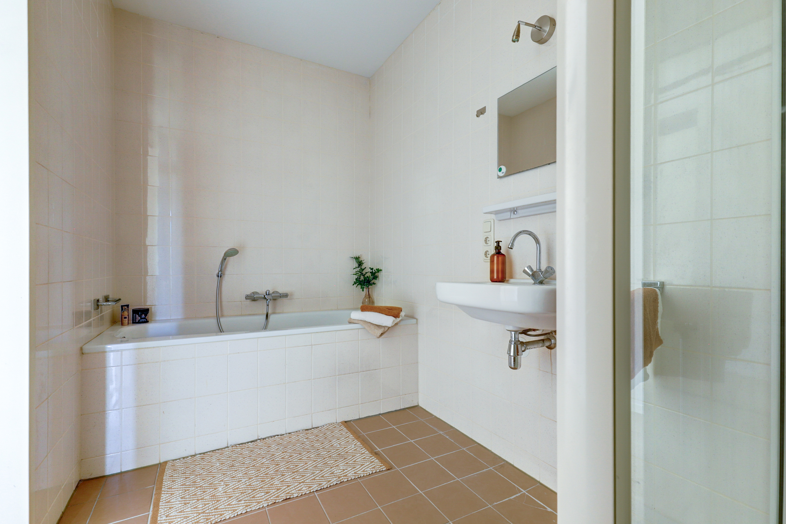 Het appartement is ingedeeld met twee volwaardige slaapkamers. De hoofdslaapkamer biedt ruimte voor een groot bed en kastenwand; de tweede kamer is ideaal als logeerkamer, hobbyruimte of rustige thuiswerkplek. De badkamer is compleet: een volwaardig ligbad voor ontspanning, een aparte douche en een wastafel. Alles netjes, licht en praktisch. Handig is de grote interne berging/technische ruimte (fijn voor voorraad en was), terwijl je fietsen en seizoensspullen kwijt kunt in de berging onder het complex.