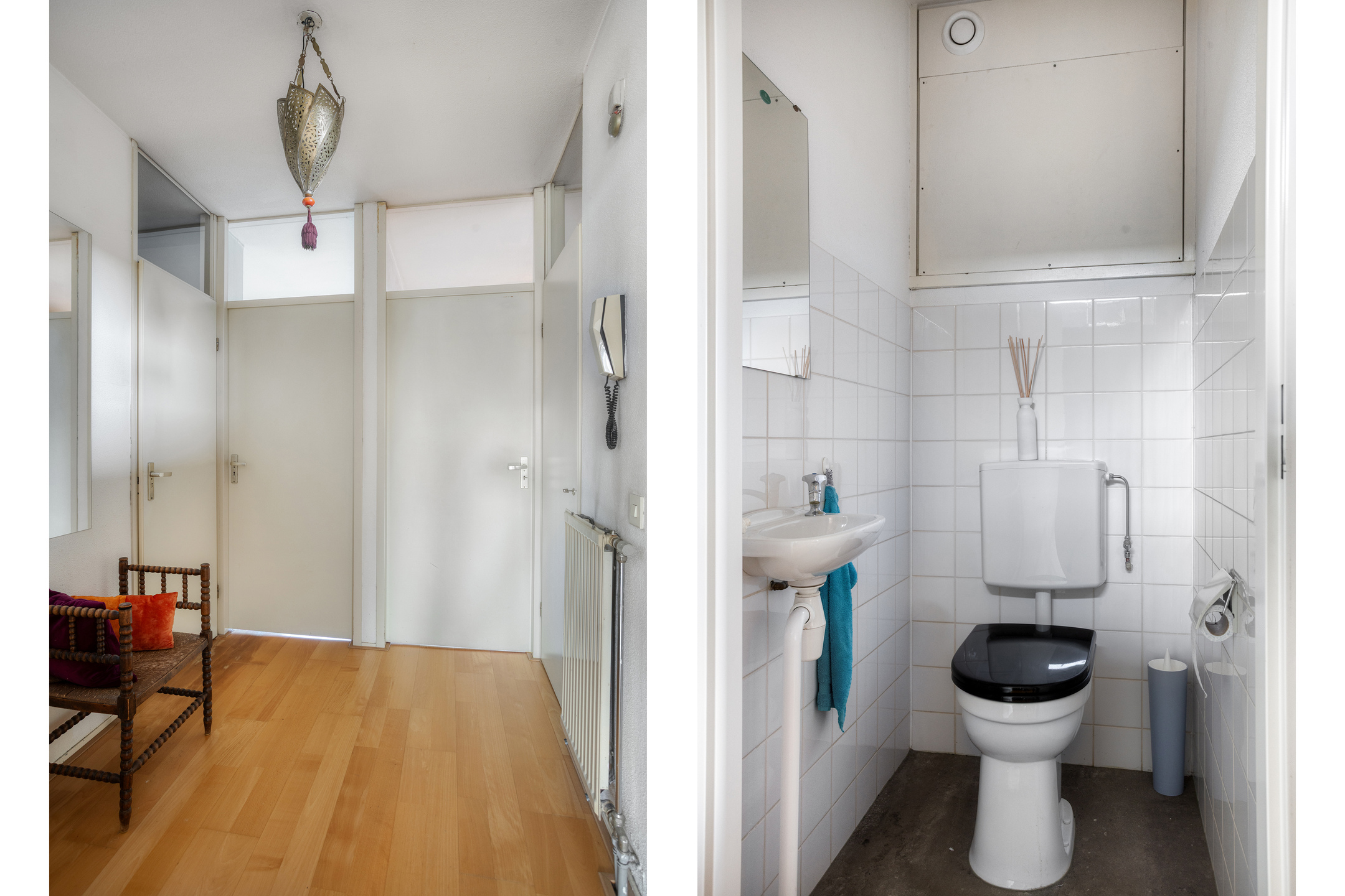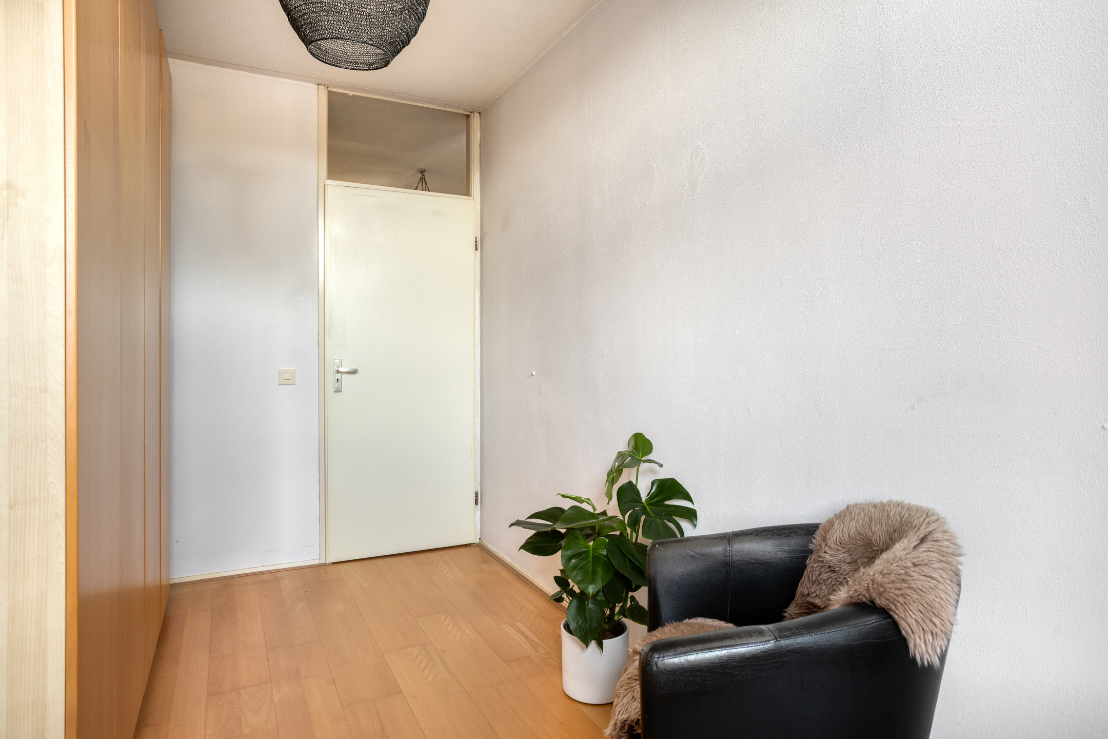 Via het portiek bereik je de vierde verdieping, waar dit appartement is gelegen. De hal vormt het centrale punt van de woning en geeft toegang tot alle vertrekken.