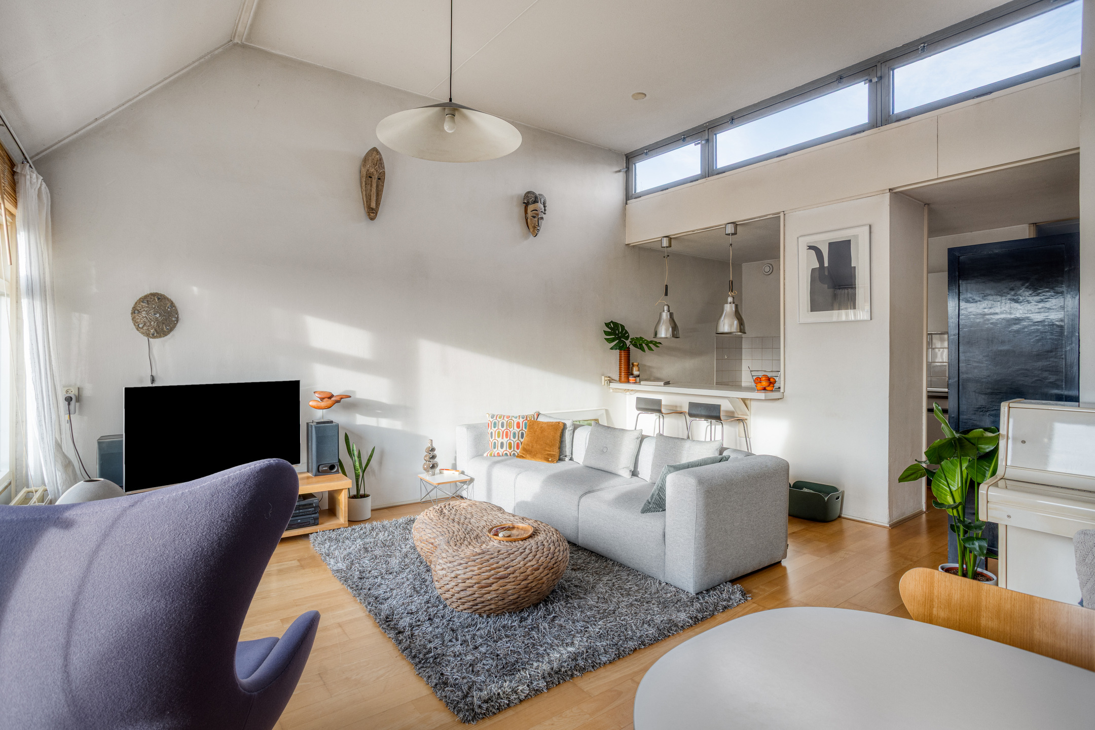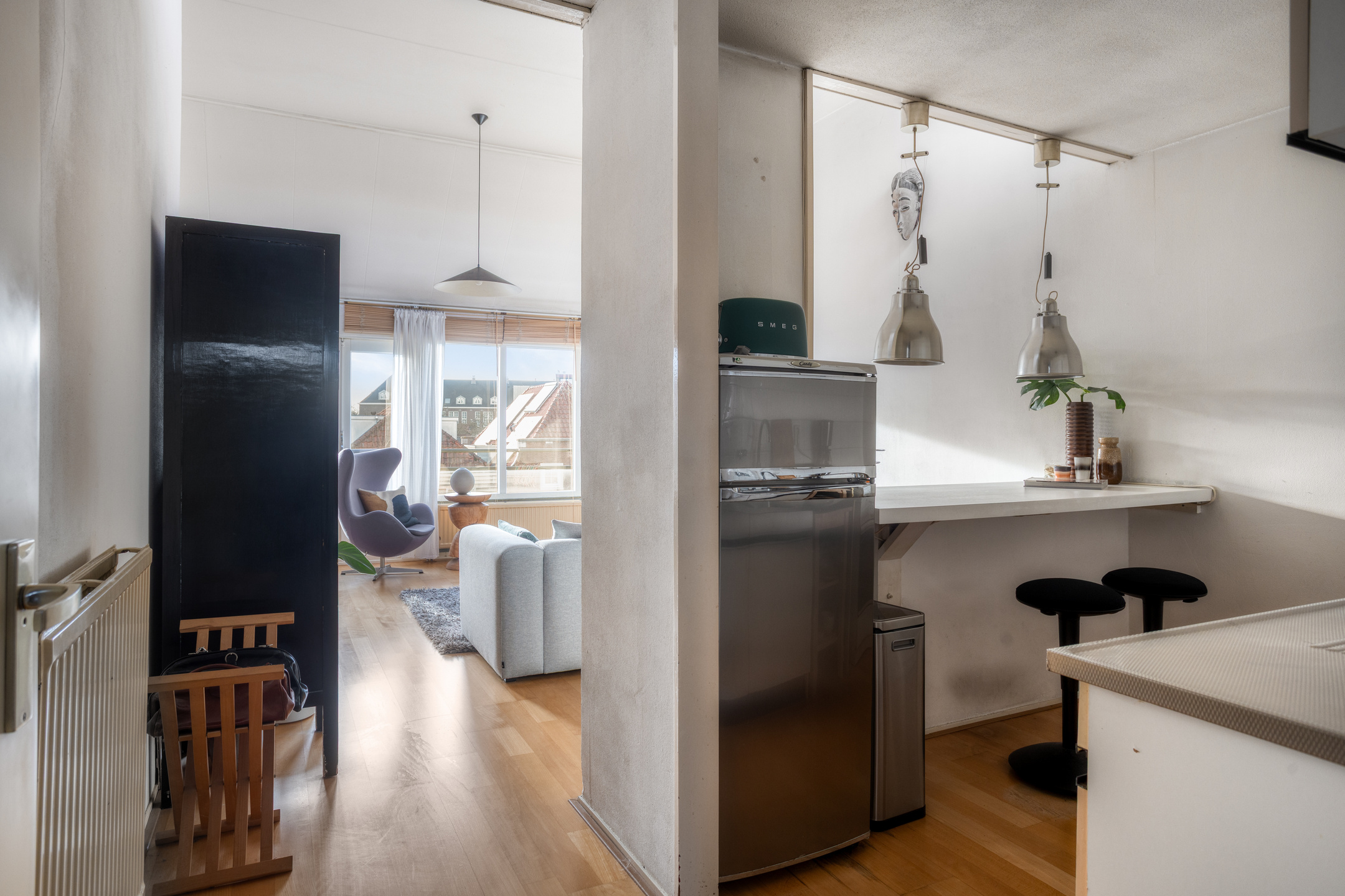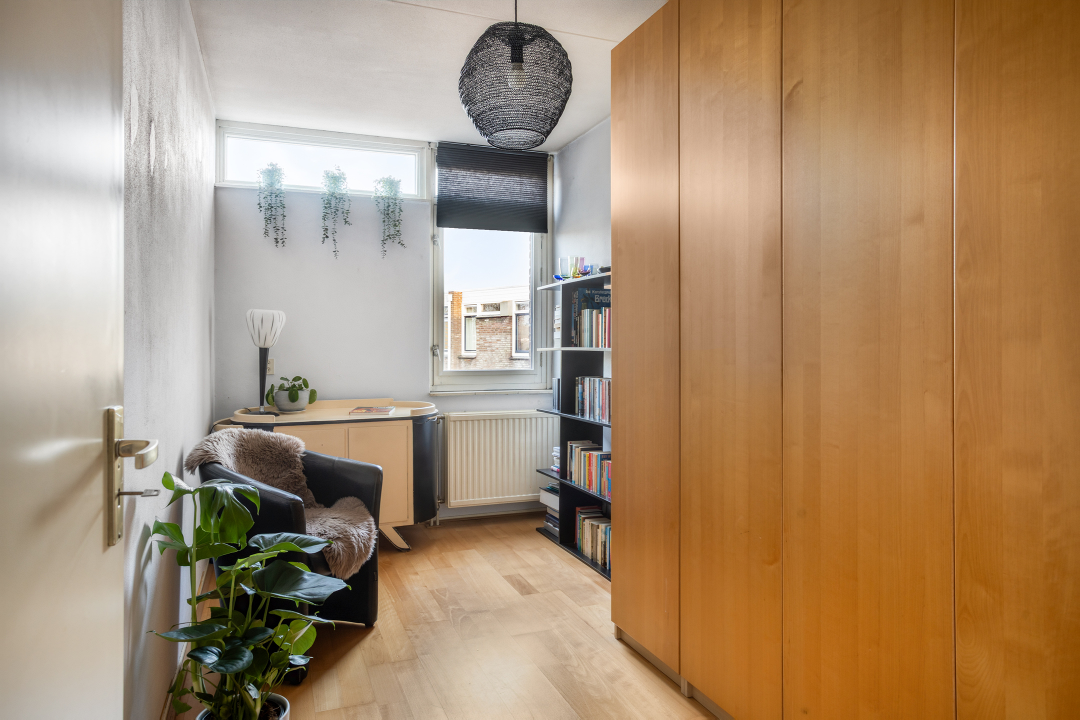 De woonkamer aan de voorzijde is zonder twijfel het hart van het appartement. De hoge plafonds zorgen direct voor een verrassend ruimtelijk effect, terwijl de grote raampartijen aan de voor- en bovenzijde zorgen voor veel daglicht en een vrij gevoel. De ligging op de bovenste verdieping maakt dat je hier niet alleen rust ervaart, maar ook meer lucht, licht en privacy dan gebruikelijk. Vanuit de woonkamer stap je het balkon op, een fijne plek om even buiten te zitten en van de hoogte en de omgeving te genieten. In de woonkamer bevindt zich bovendien een praktische bergkast, ideaal voor extra opbergruimte zonder dat dit ten koste gaat van de leefruimte.