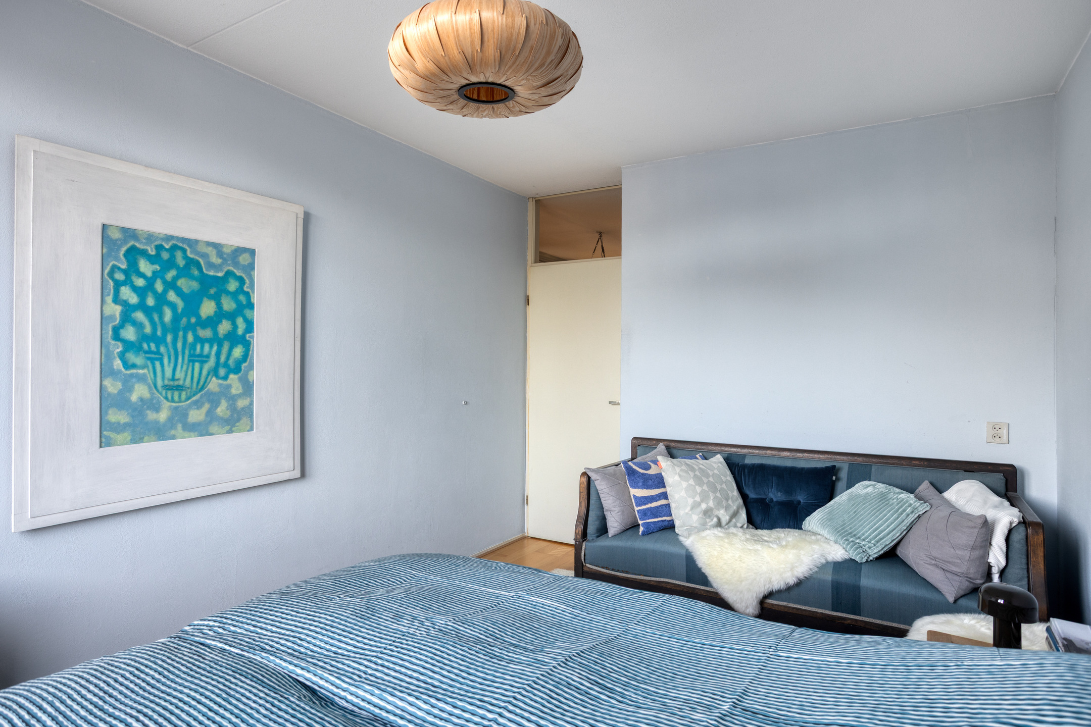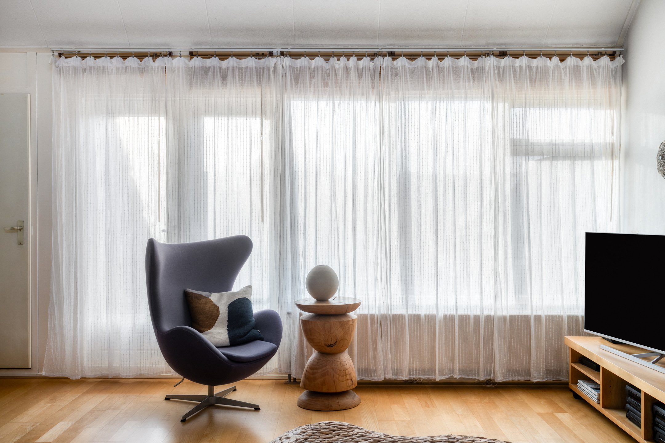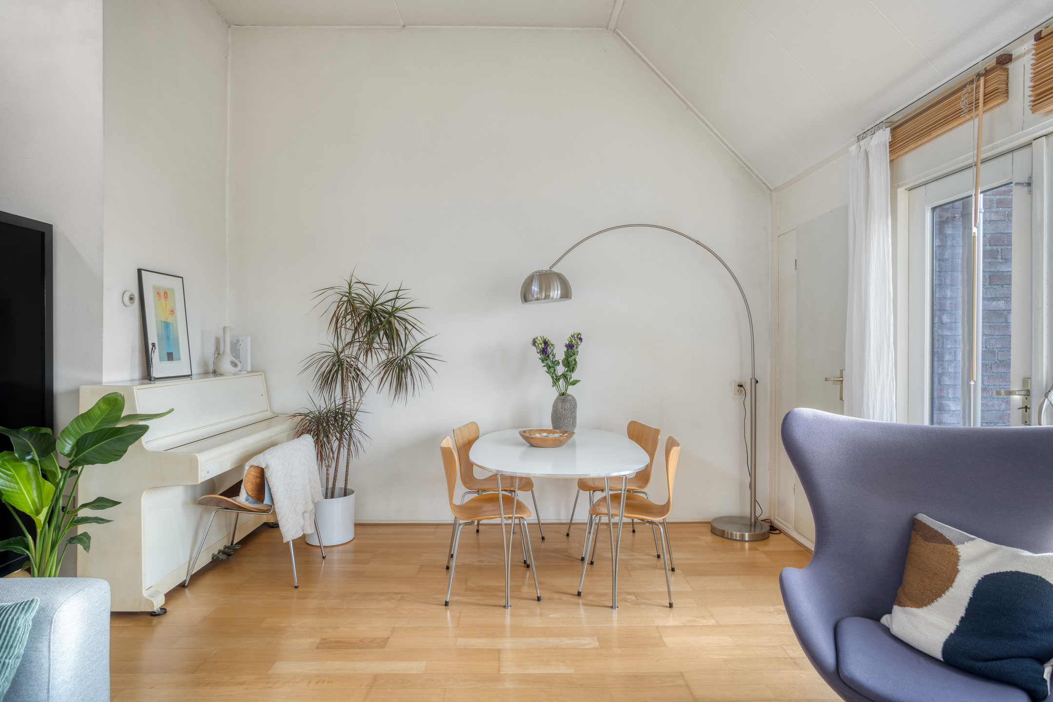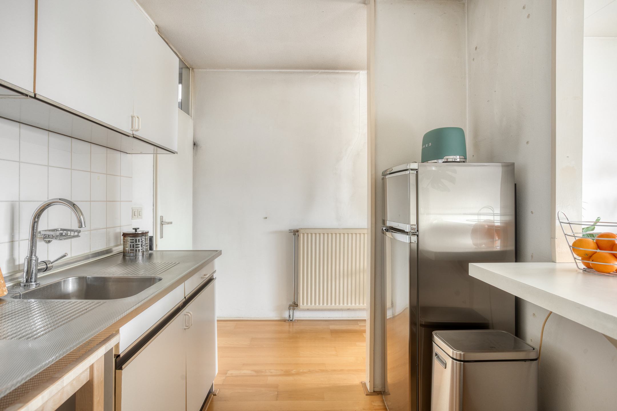 De woonkamer aan de voorzijde is zonder twijfel het hart van het appartement. De hoge plafonds zorgen direct voor een verrassend ruimtelijk effect, terwijl de grote raampartijen aan de voor- en bovenzijde zorgen voor veel daglicht en een vrij gevoel. De ligging op de bovenste verdieping maakt dat je hier niet alleen rust ervaart, maar ook meer lucht, licht en privacy dan gebruikelijk. Vanuit de woonkamer stap je het balkon op, een fijne plek om even buiten te zitten en van de hoogte en de omgeving te genieten. In de woonkamer bevindt zich bovendien een praktische bergkast, ideaal voor extra opbergruimte zonder dat dit ten koste gaat van de leefruimte.