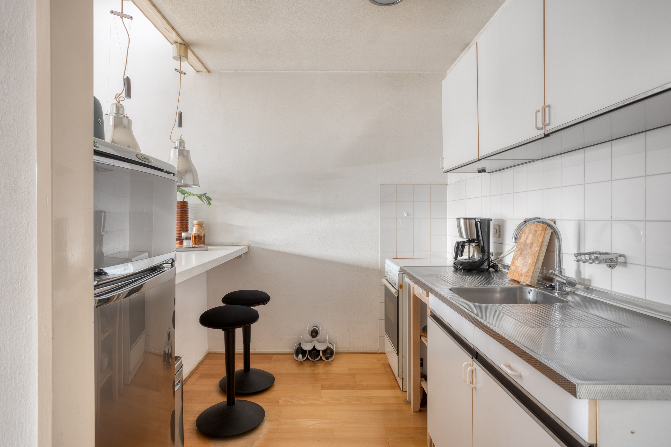 Aansluitend ligt de halfopen keuken in wandopstelling, uitgevoerd in een basisopstelling en voorzien van een gasfornuis, oven en koelkast. De baropstelling zorgt voor een open verbinding met de woonkamer, waardoor koken en wonen hier moeiteloos samengaan.