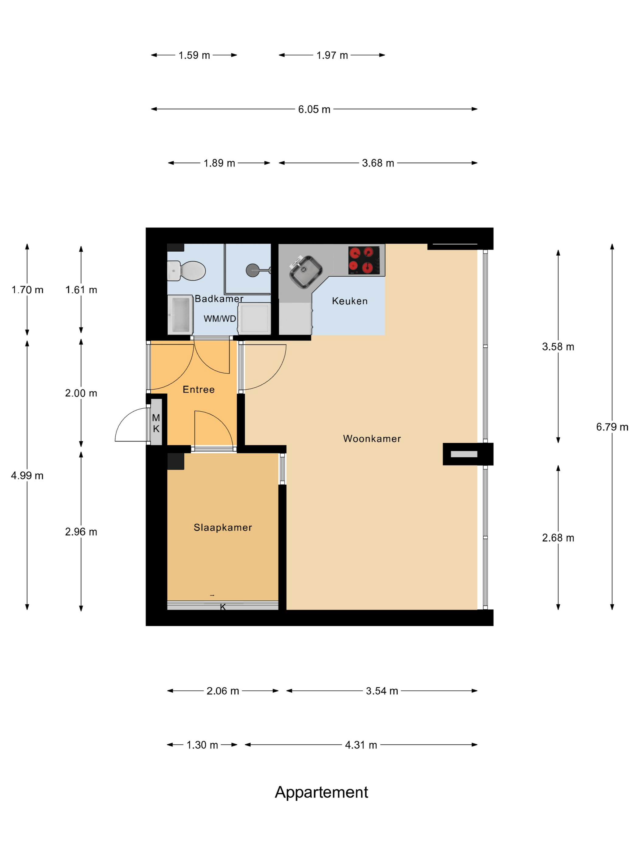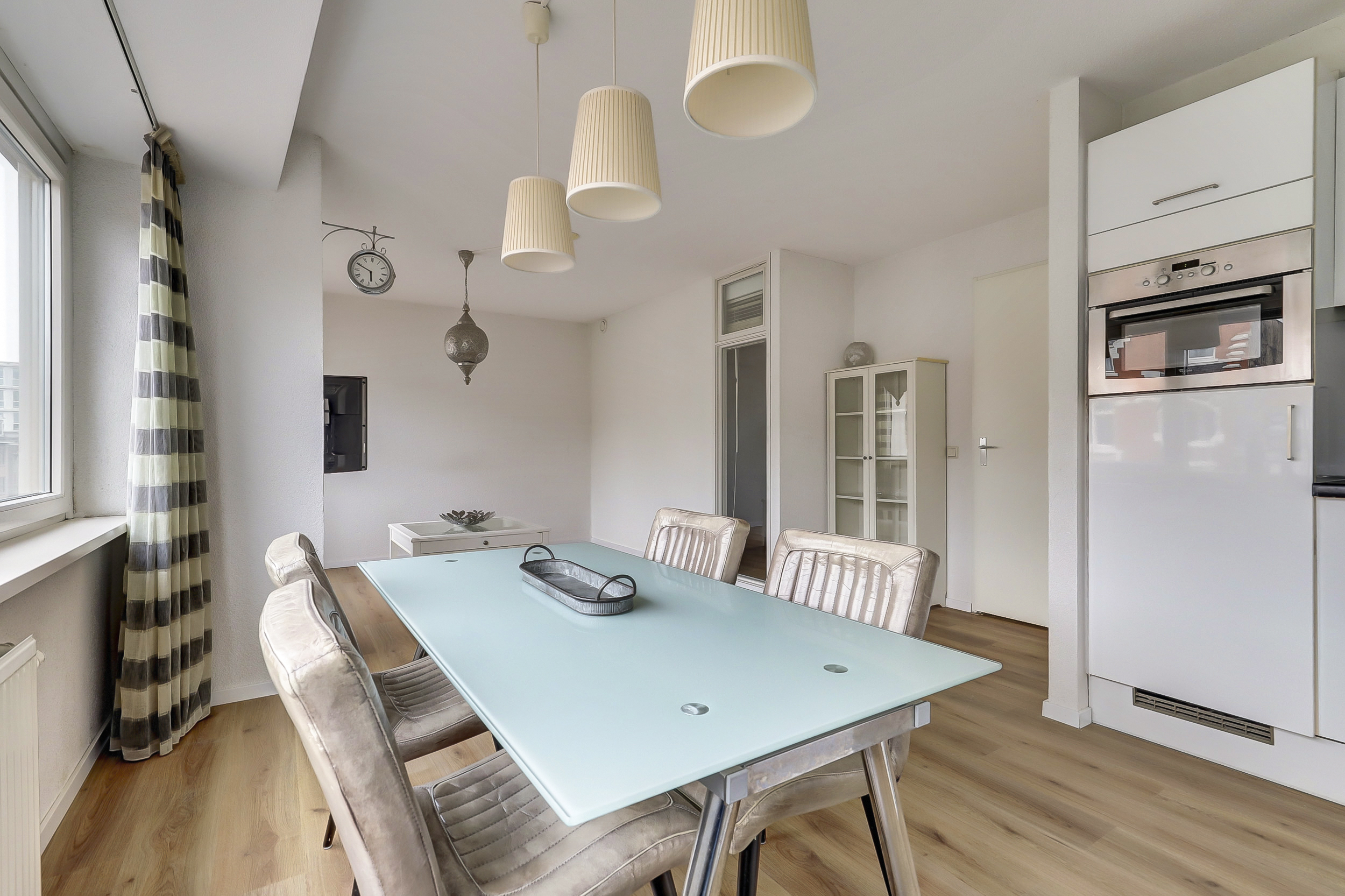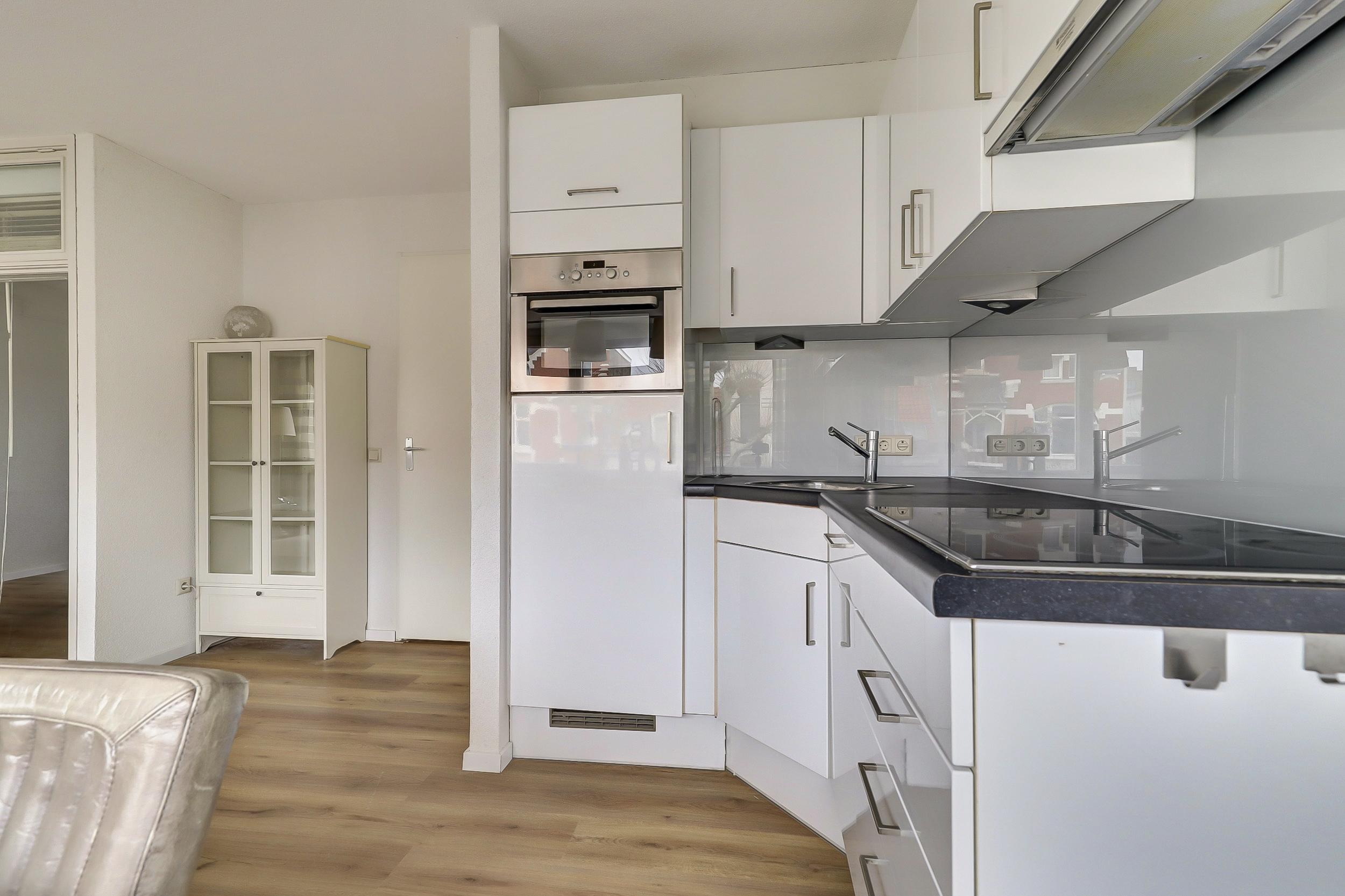 De woonkamer is slim ingedeeld en voelt groter dan je misschien zou verwachten. In combinatie met de open keuken ontstaat er een sociale en praktische leefruimte. De moderne keuken is uitgerust met diverse inbouwapparatuur, waaronder een inductiekookplaat, koelkast, vriesvak en vaatwasser.