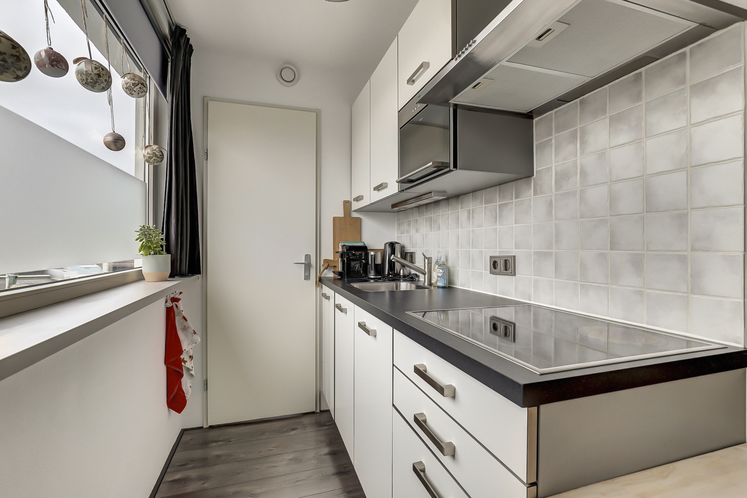 De woon-/slaapkamer biedt voldoende ruimte voor wonen, slapen en studeren en staat in open verbinding met de keuken. De keuken is praktisch ingericht en voorzien van een keramische kookplaat, afzuiging en een koelkast met vriesvak. Daarnaast ligt de bijkeuken, ideaal voor extra opslag en het plaatsen van een wasmachine en/of droger.