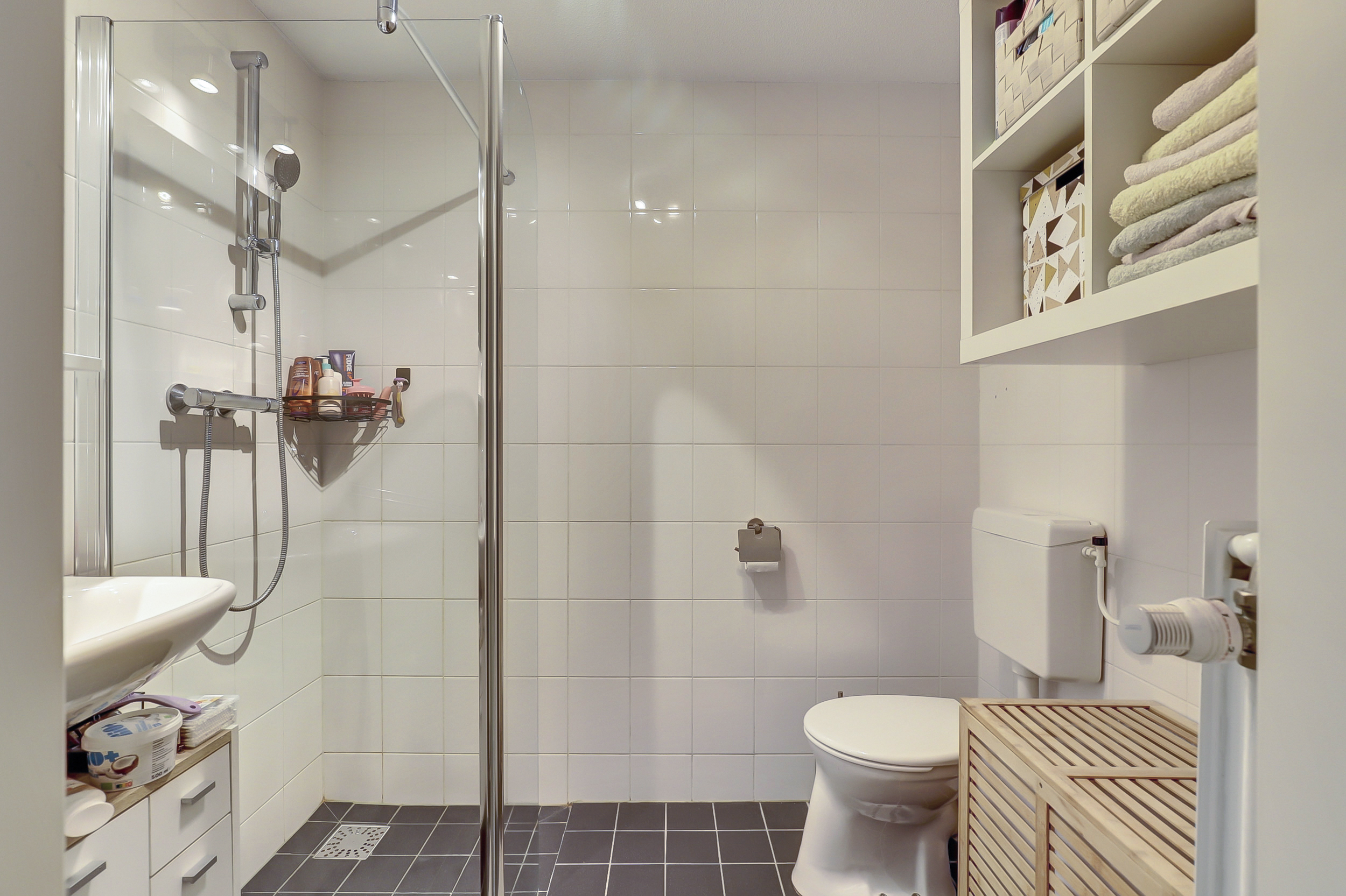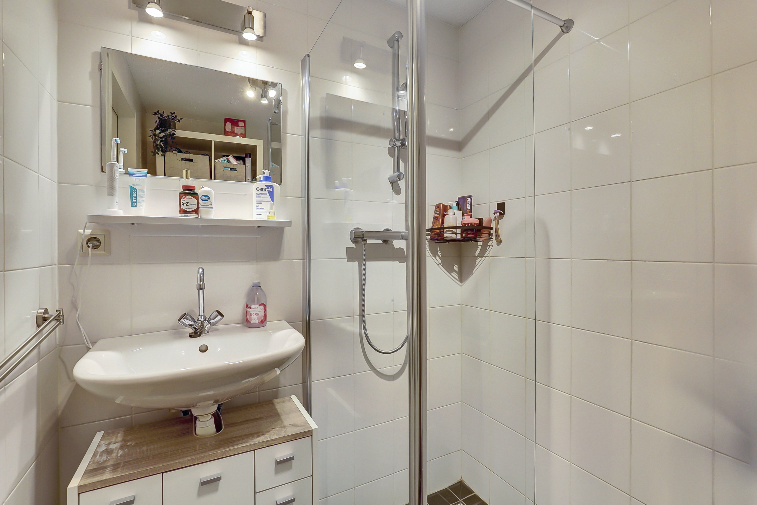 De badkamer is compact maar compleet en beschikt over een douchehoek, toilet en vaste wastafel. De meterkast bevindt zich op de centrale gang, evenals een gedeelde externe berging.