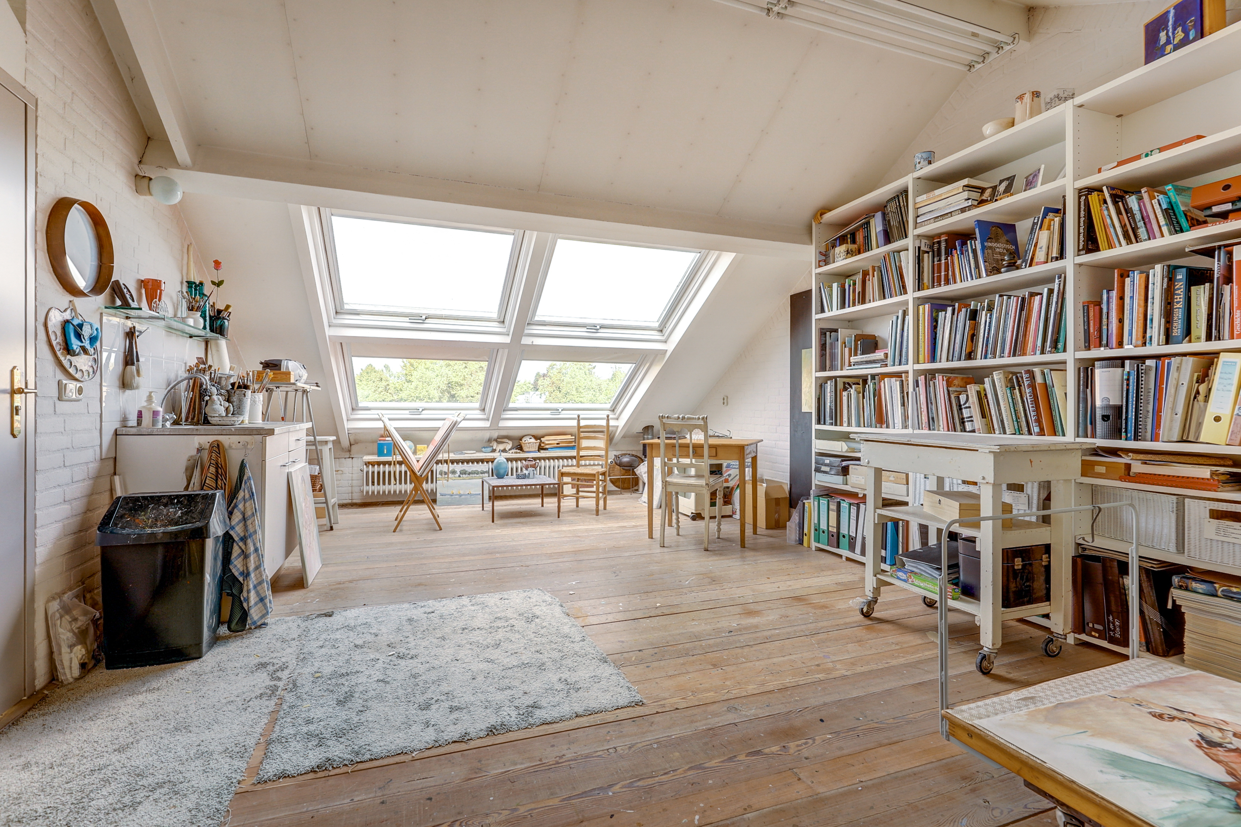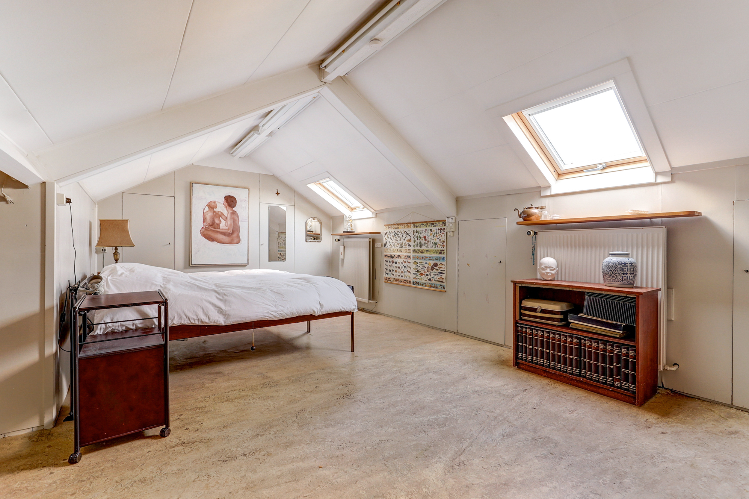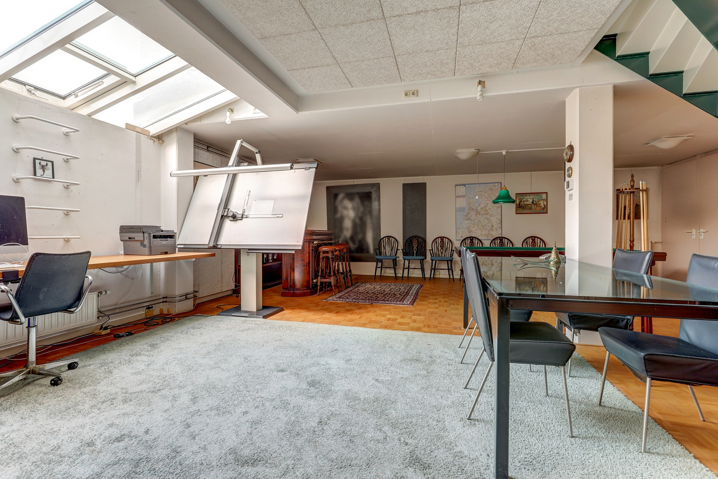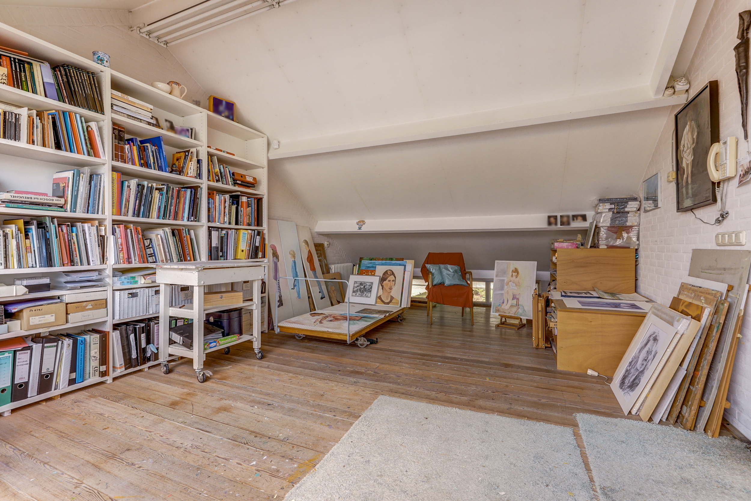 Daarnaast is er boven de inpandige garage nog een royale kamer, welke momenteel in gebruik is als atelier. Deze ruimte heeft prachtige lichtinval door de 4 dakvensters en heeft tevens een pantryblokje met koud en warm water en is voorzien van verwarming.