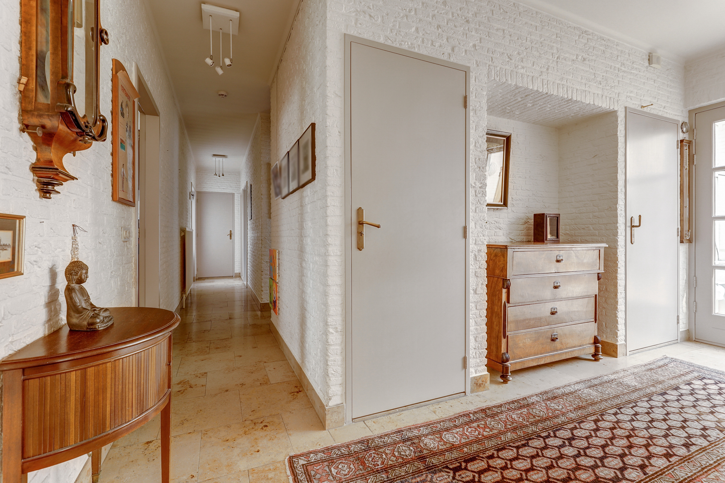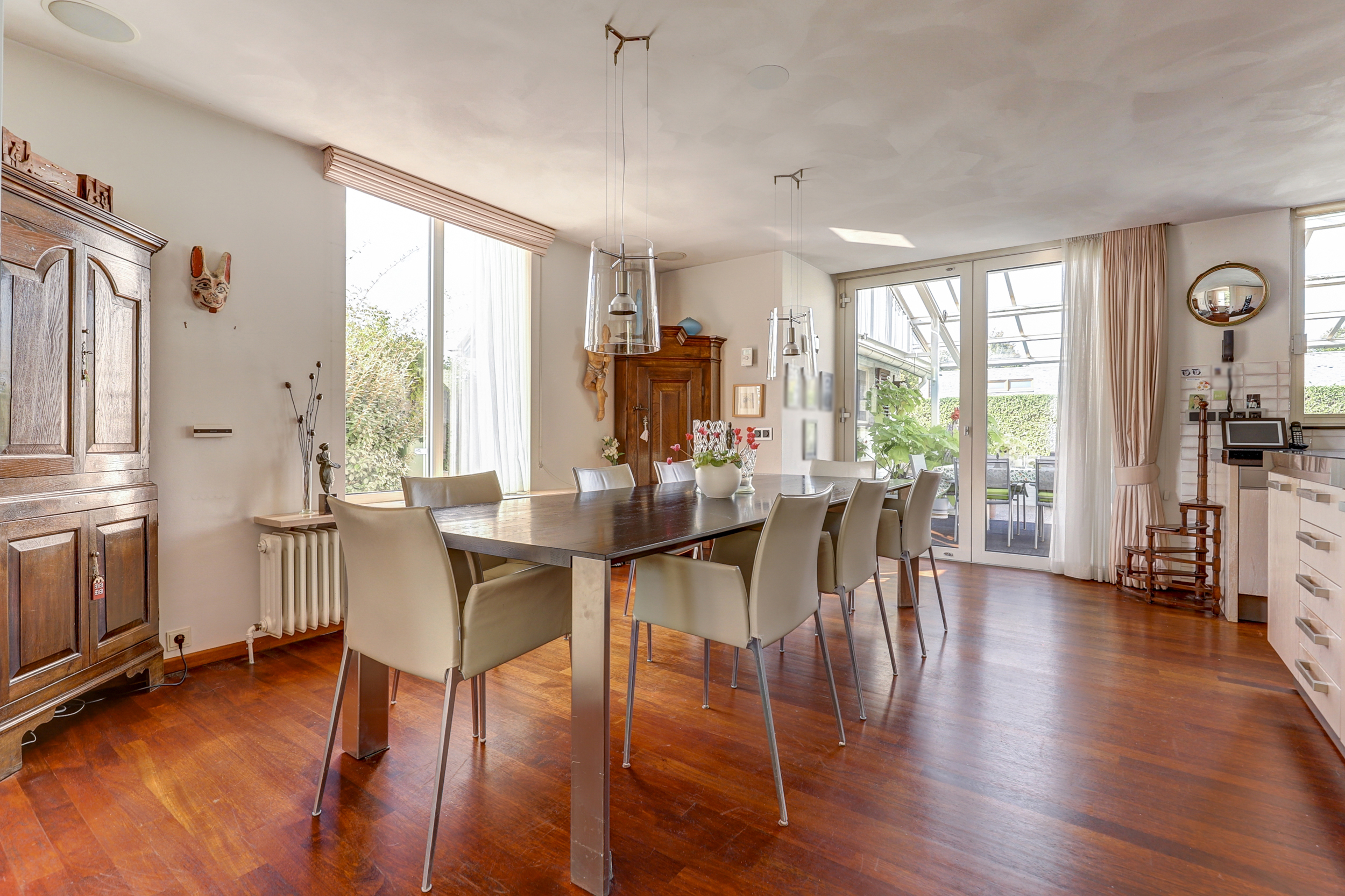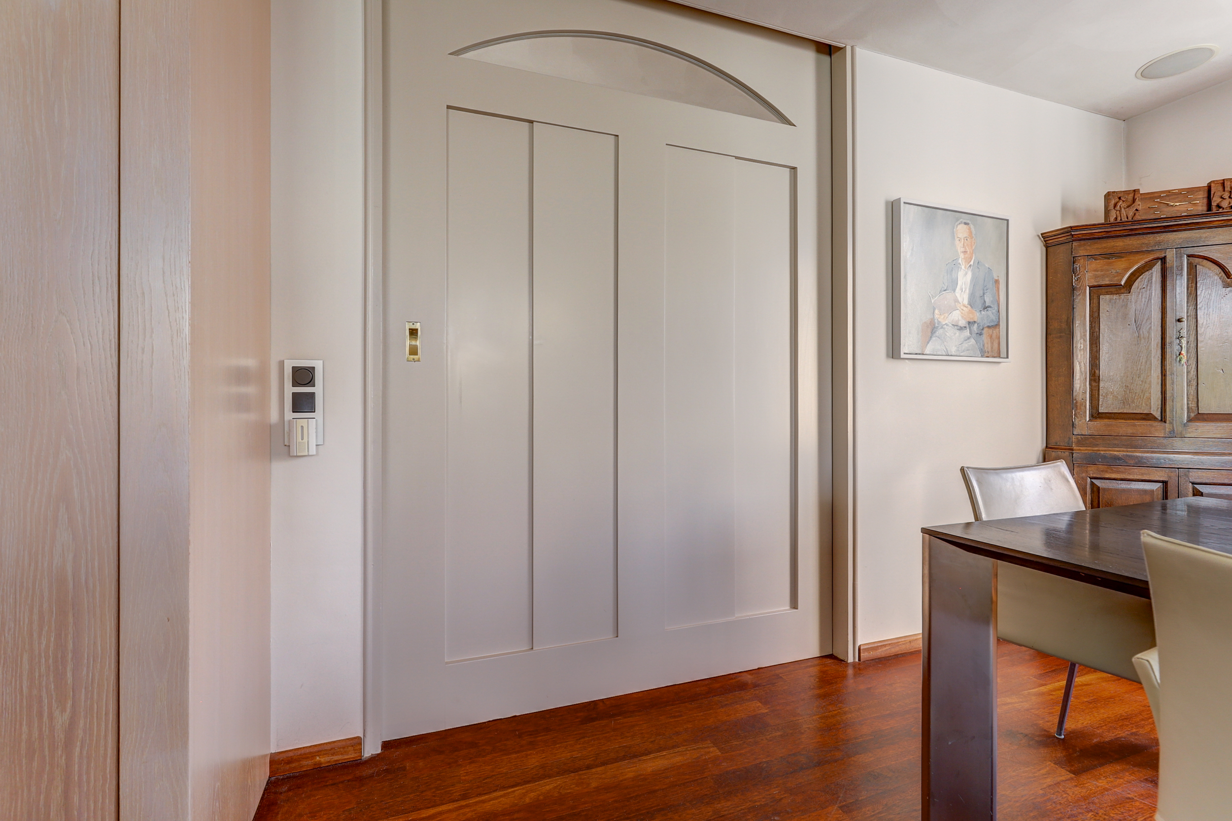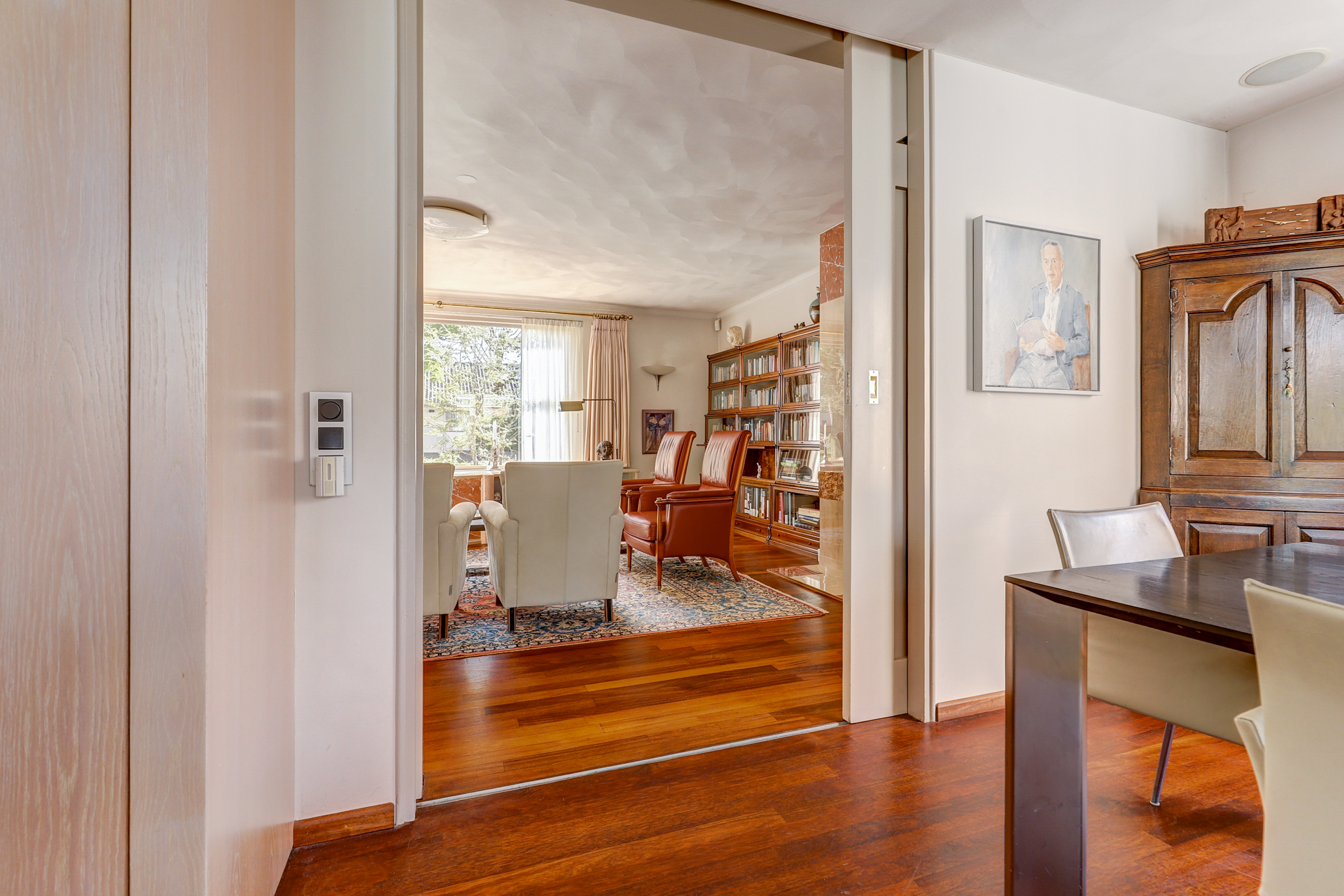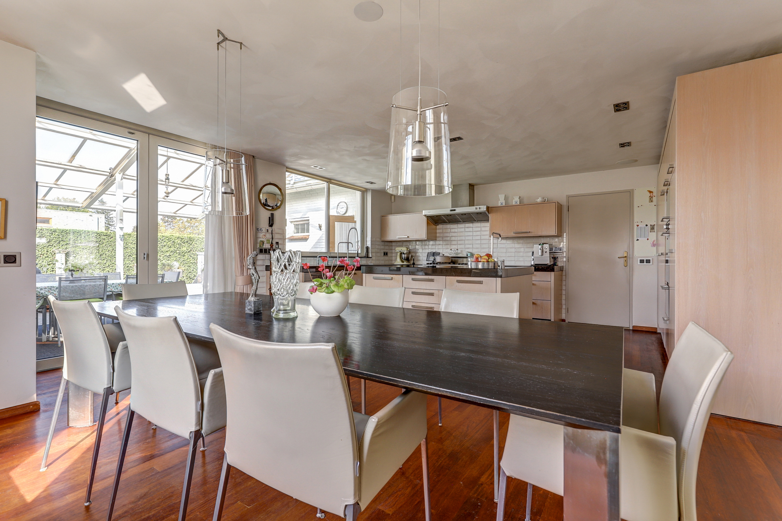 Binnenkomend door een robuuste mooie voordeur en de moderne entree treed je een zee van licht tegemoet en door de mooie hoogte en het sfeervolle glazen dak is dit wel een echt een binnenkomst. De entree/hal heeft een mooi natuursteen vloer (Jura marmer), openslaande deuren naar de achtertuin, garderobe nis.