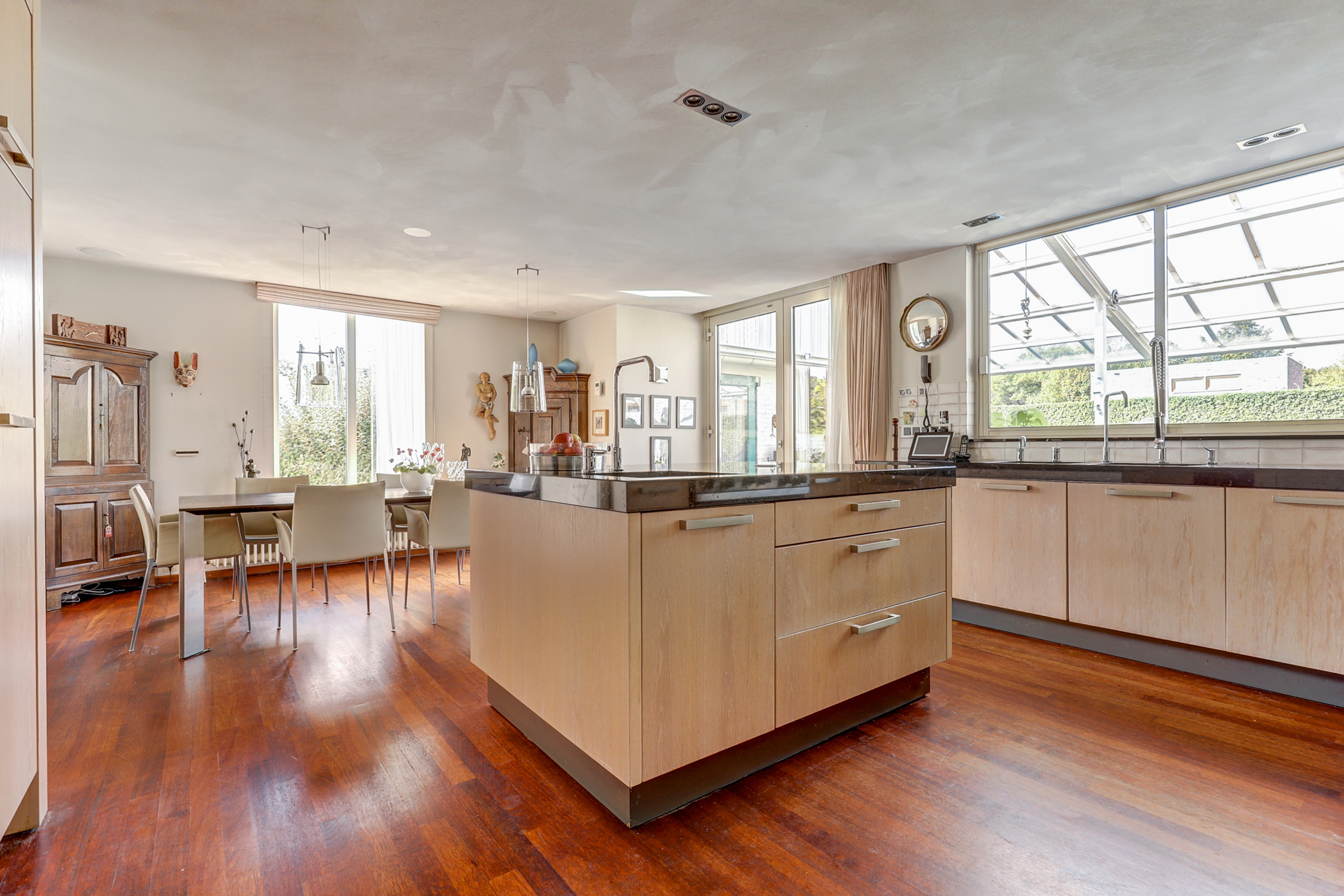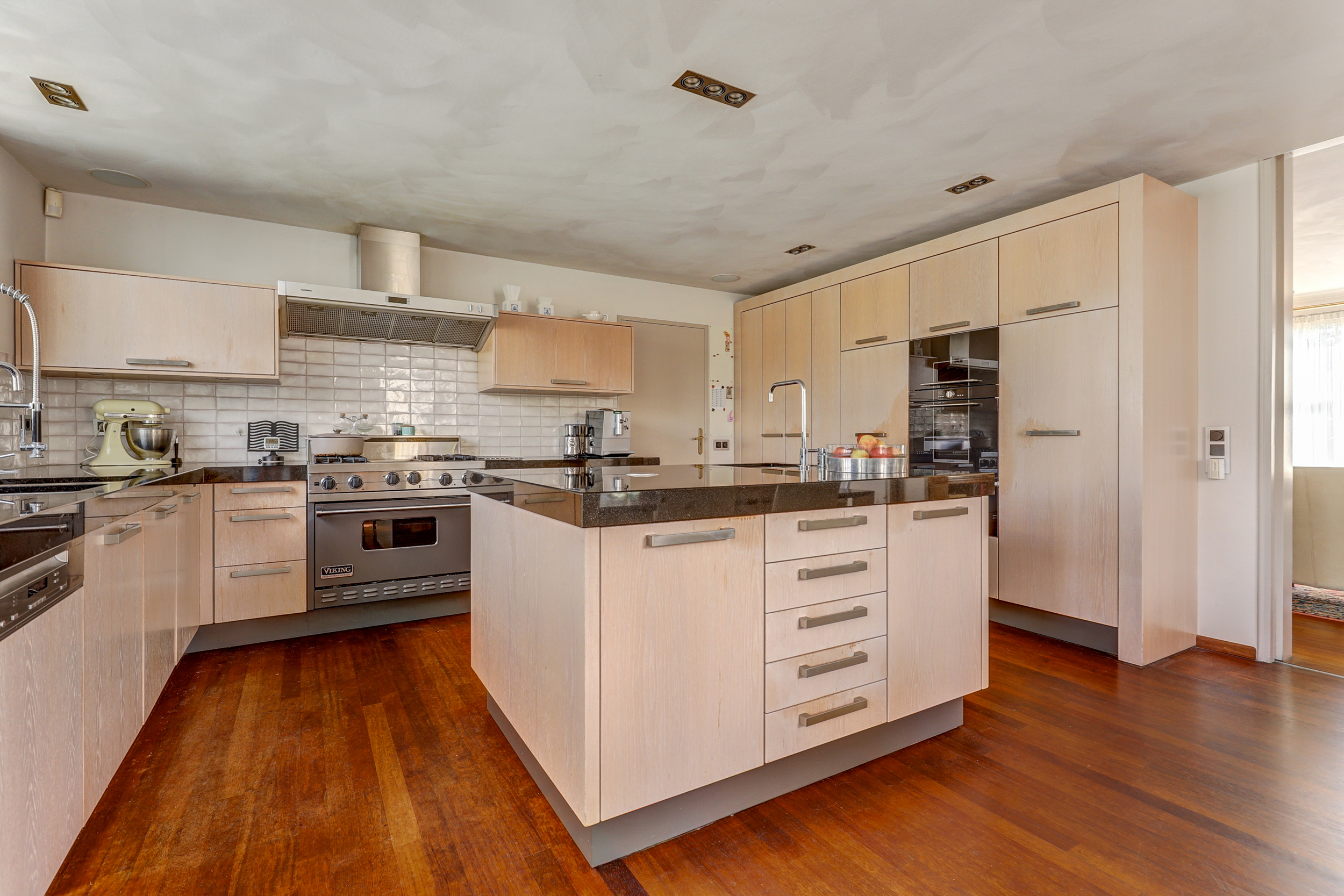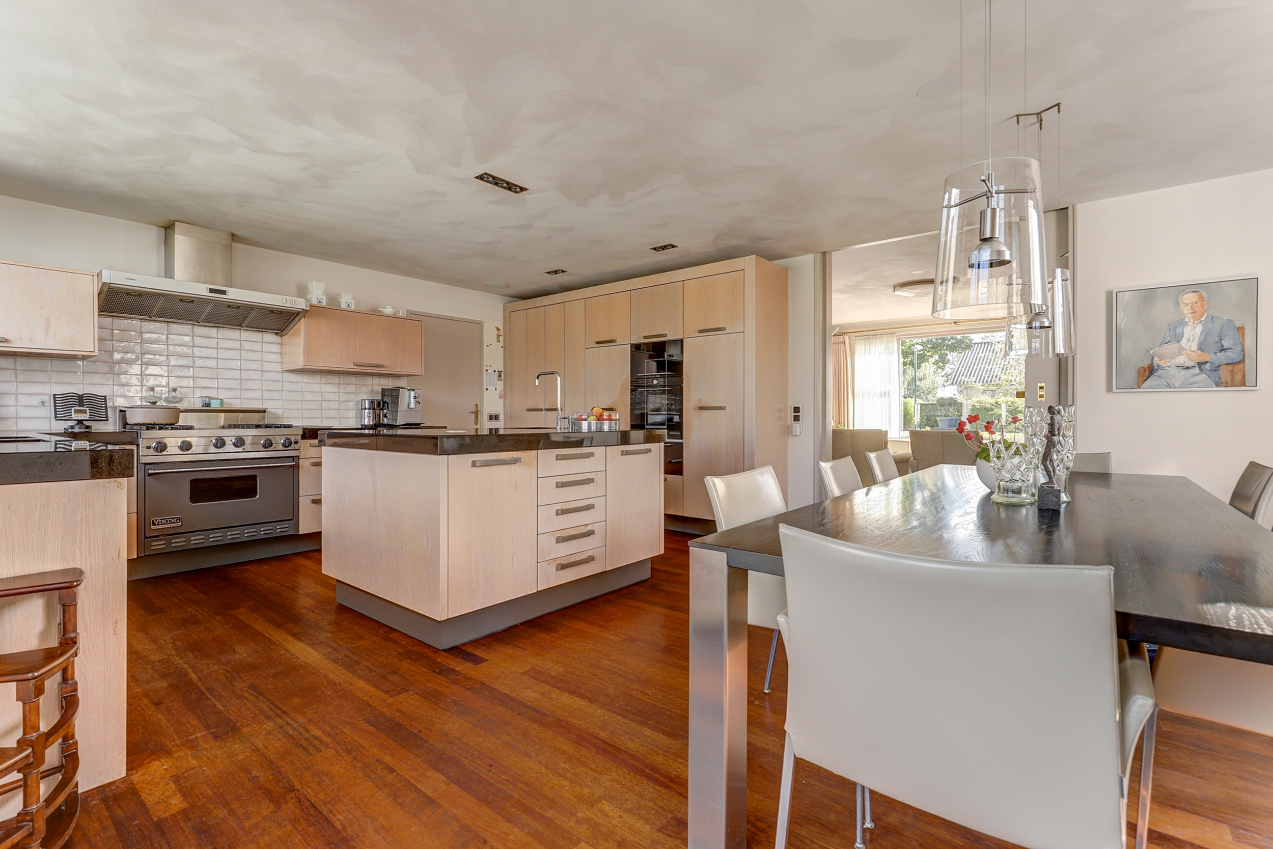 De sfeervolle woonkamer met o.a. gashaard, parketvloer, schuurplafond, vaste kast en schuifdeuren naar de woonkeuken. De tuingerichte en ruime woonkeuken is aan de achterzijde gelegen en heeft openslaande deuren naar het terras met overkapping en achtertuin. Daarnaast is er een spoeleiland, veel lades en kastruimte, spotjes, boxen in het plafond, parketvloer, strakke wanden, schuurplafond en diverse inbouwapparatuur o.a. 4-pits gasfornuis (Viking) met grillplaat en grote oven, afzuiging, een hogedruk stoomoven en warmhoudoven, Miele, koelkast, vaatwasser en Quooker.