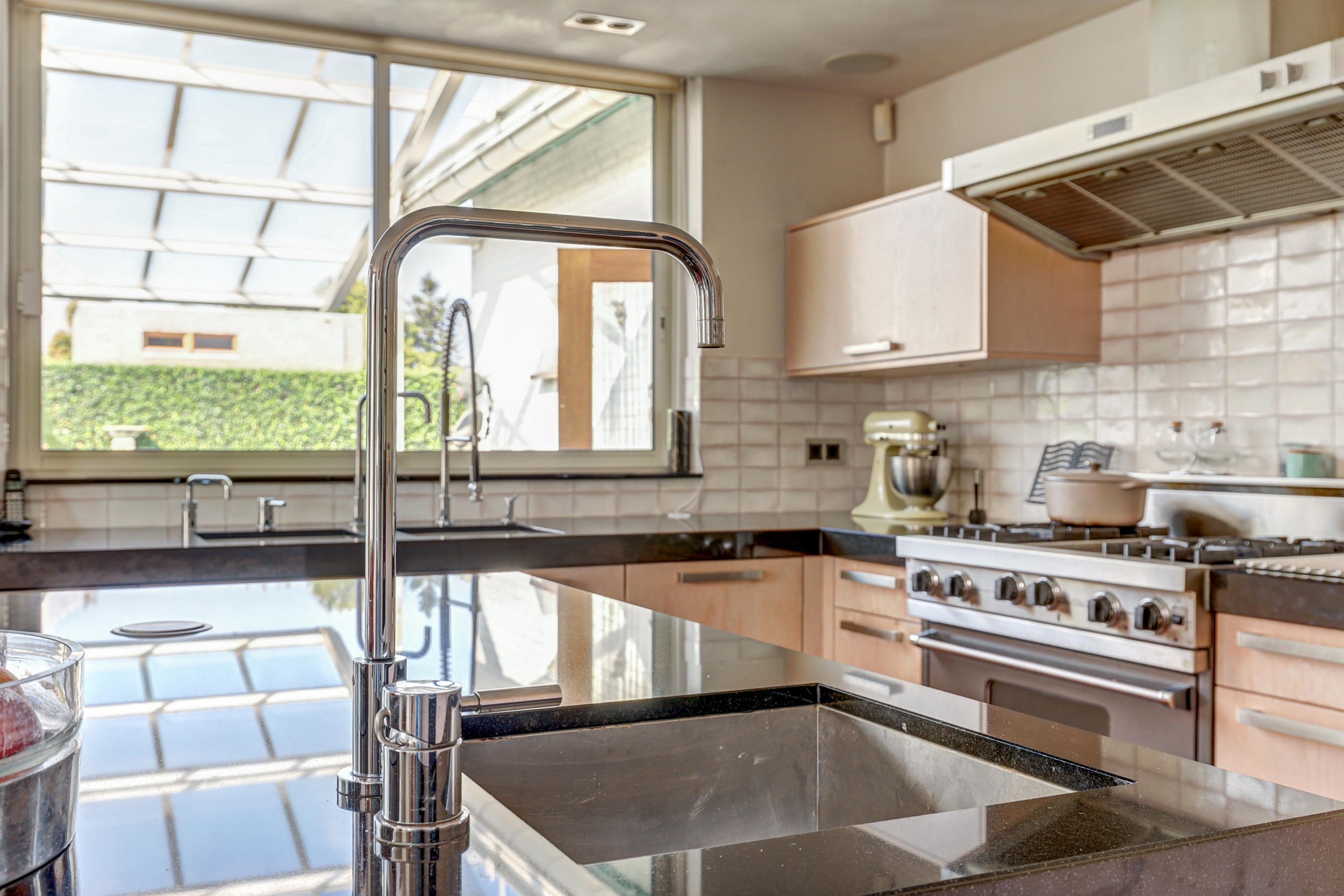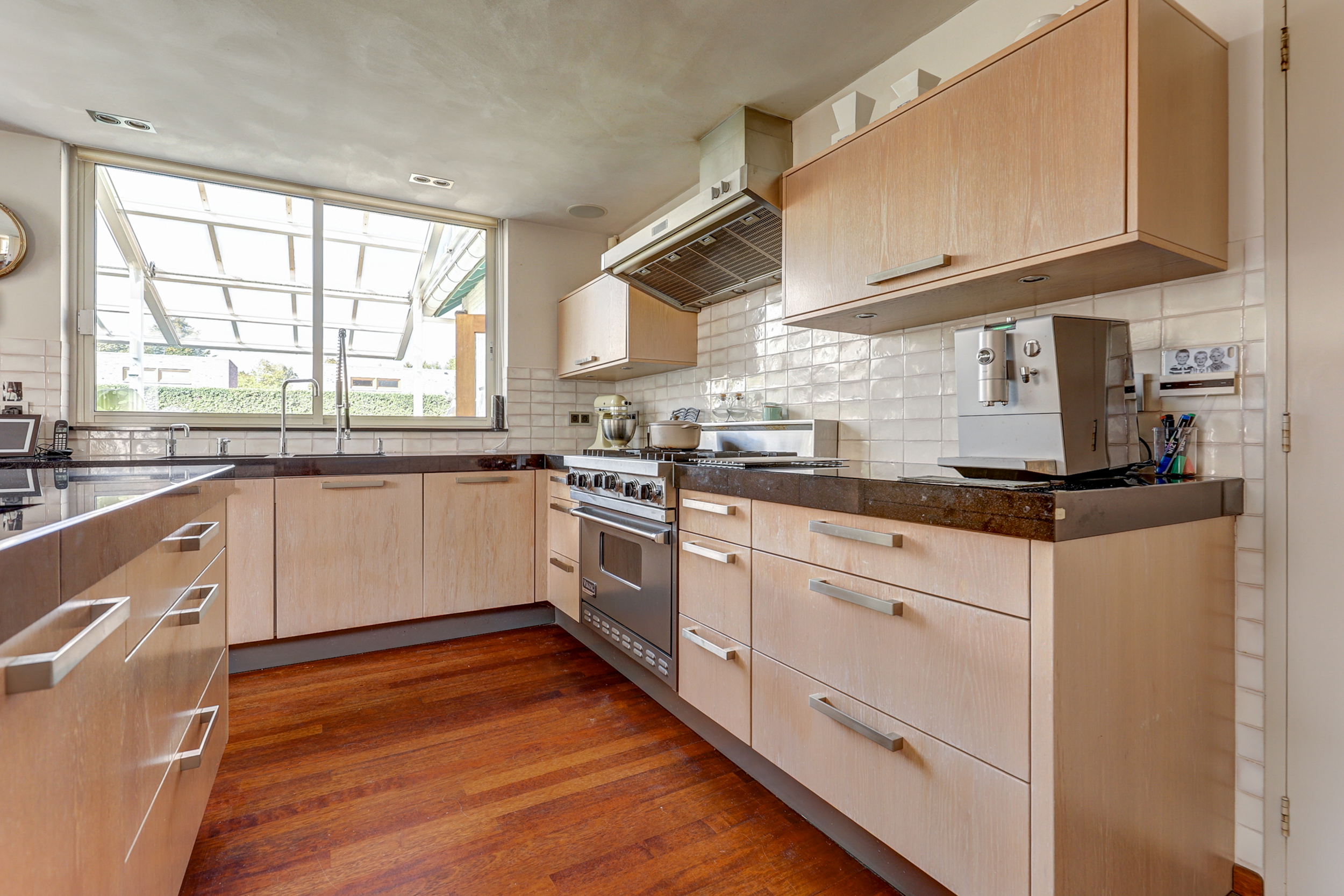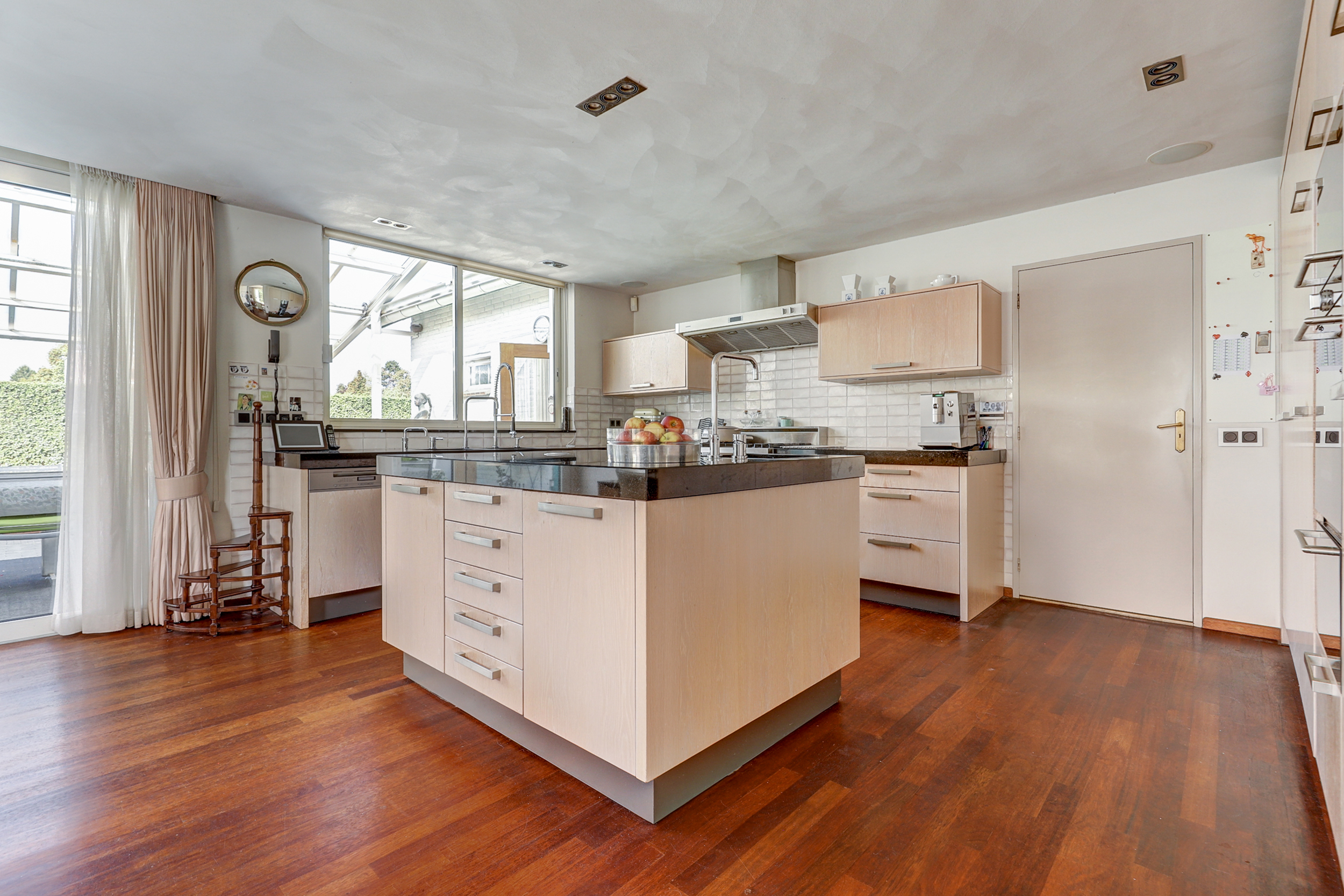 De sfeervolle woonkamer met o.a. gashaard, parketvloer, schuurplafond, vaste kast en schuifdeuren naar de woonkeuken. De tuingerichte en ruime woonkeuken is aan de achterzijde gelegen en heeft openslaande deuren naar het terras met overkapping en achtertuin. Daarnaast is er een spoeleiland, veel lades en kastruimte, spotjes, boxen in het plafond, parketvloer, strakke wanden, schuurplafond en diverse inbouwapparatuur o.a. 4-pits gasfornuis (Viking) met grillplaat en grote oven, afzuiging, een hogedruk stoomoven en warmhoudoven, Miele, koelkast, vaatwasser en Quooker.