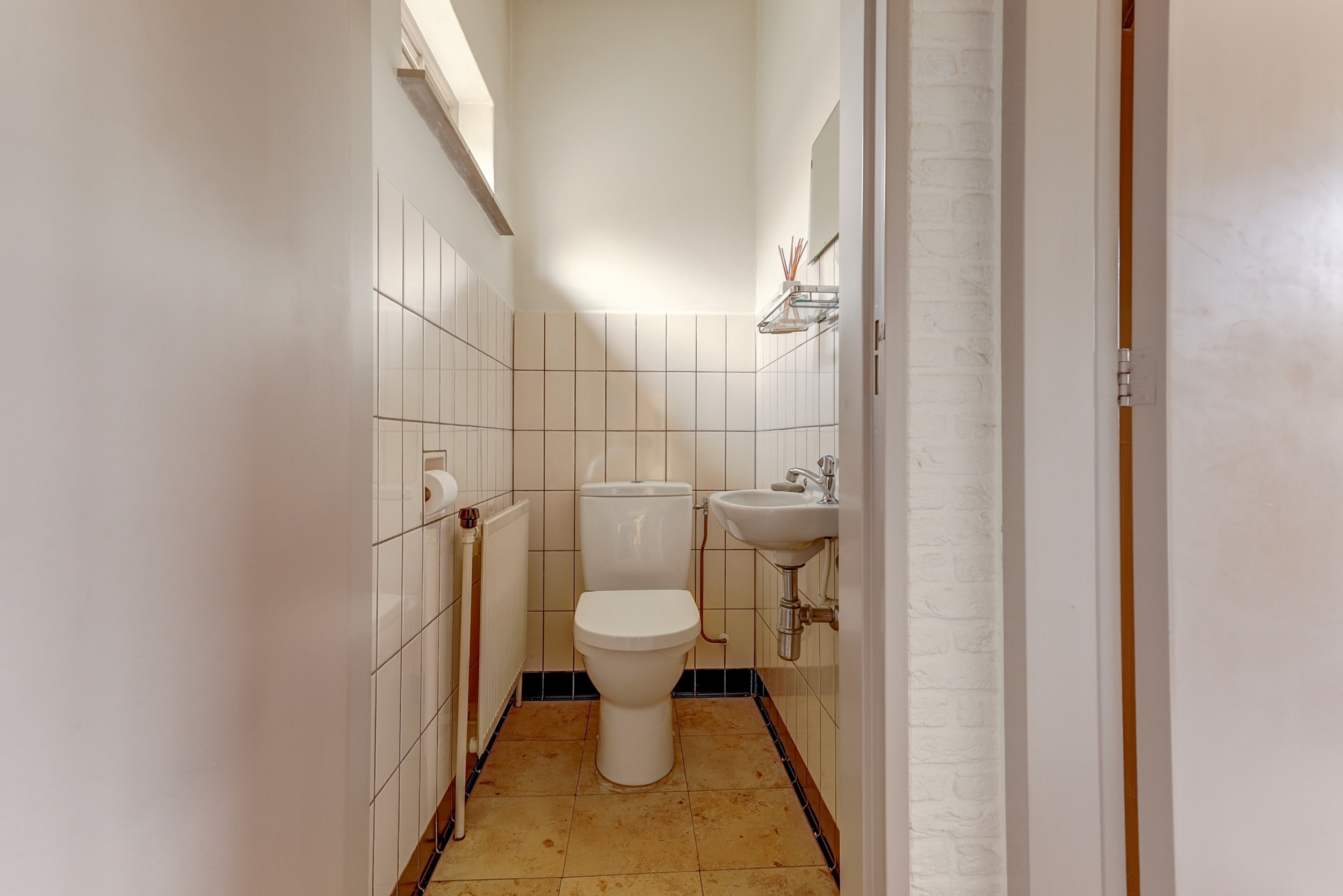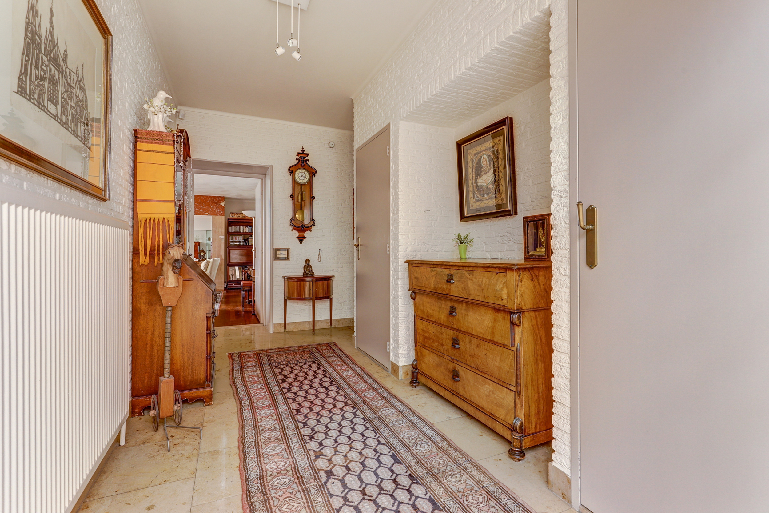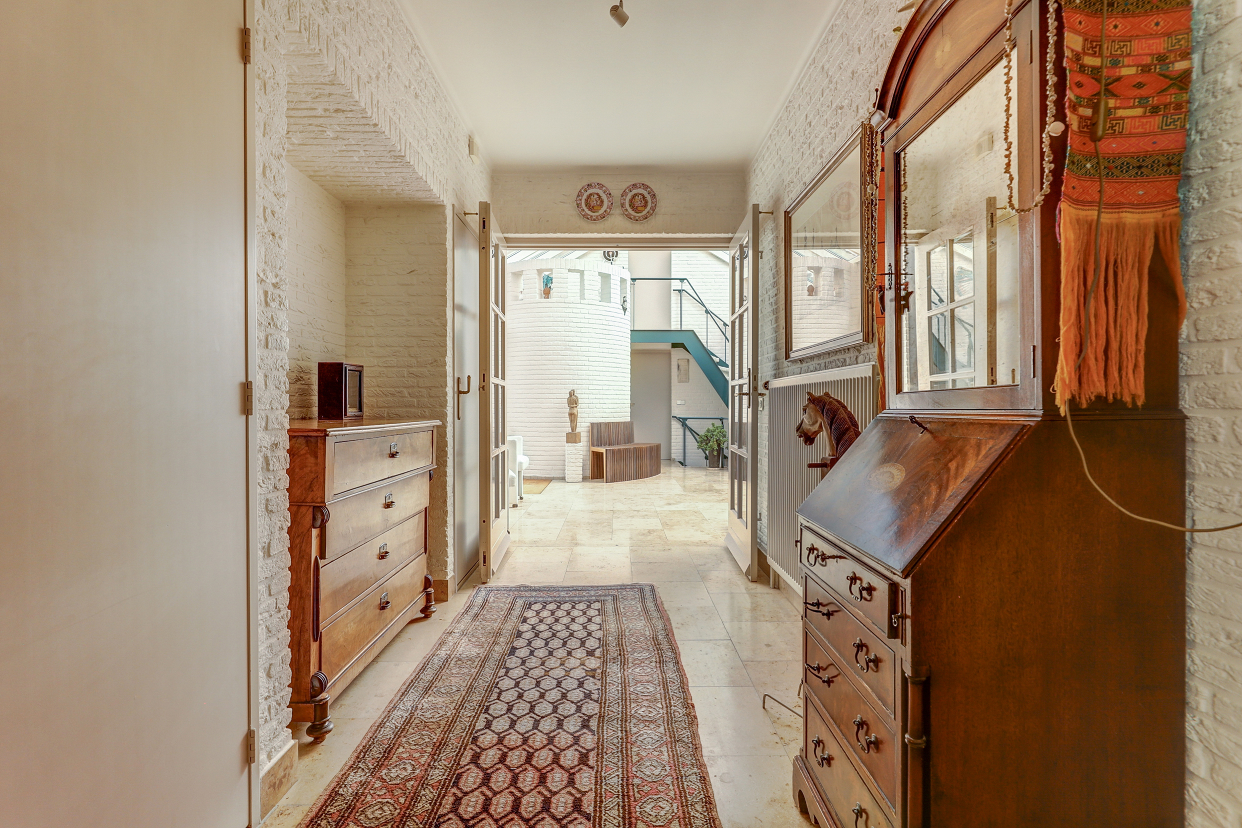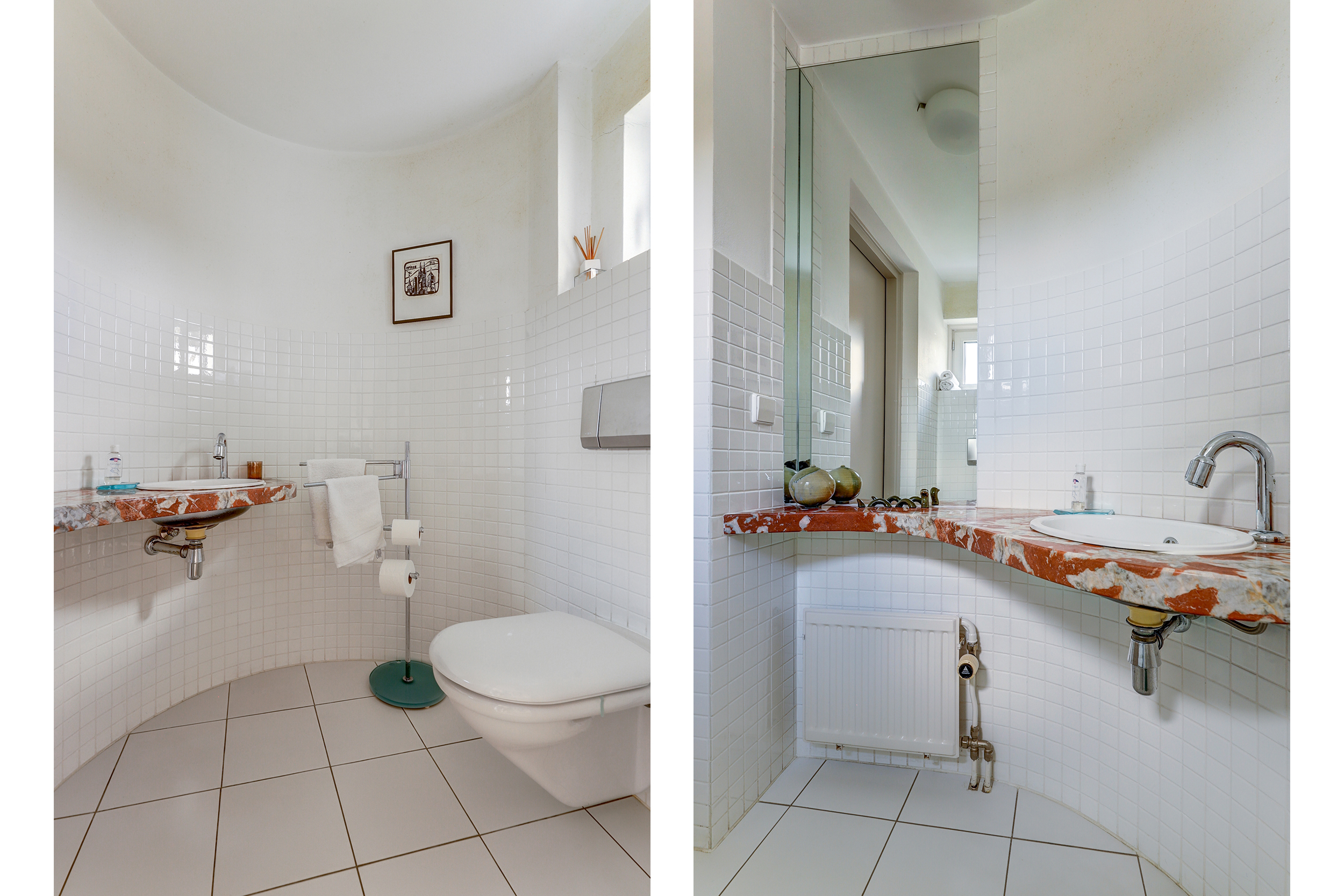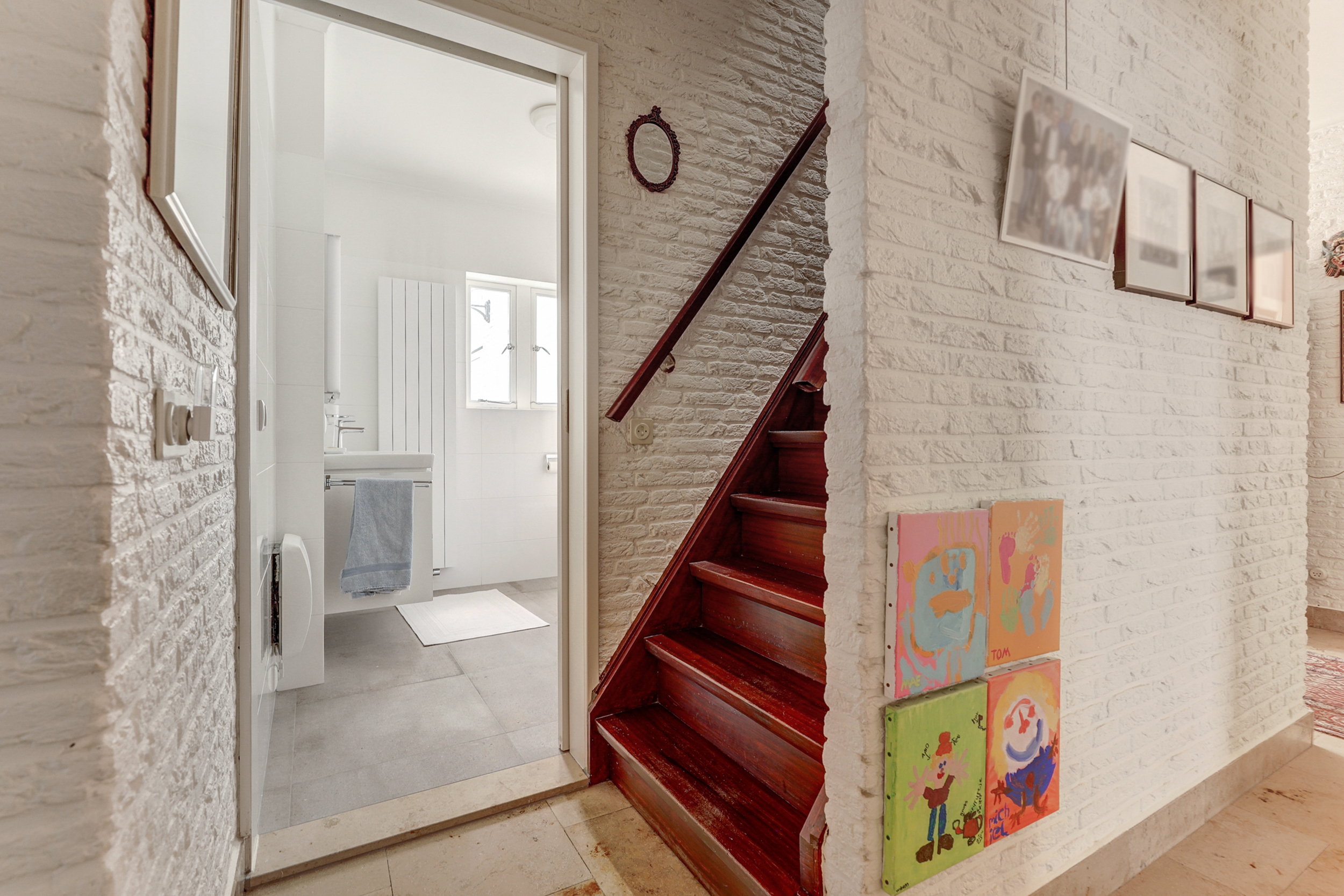 De hal geeft toegang tot de inpandige garage, de speelse ronde toiletruimte met wandcloset, fontein en raampje, de trapopgang naar de 1ste verdiepingen en het souterrain.