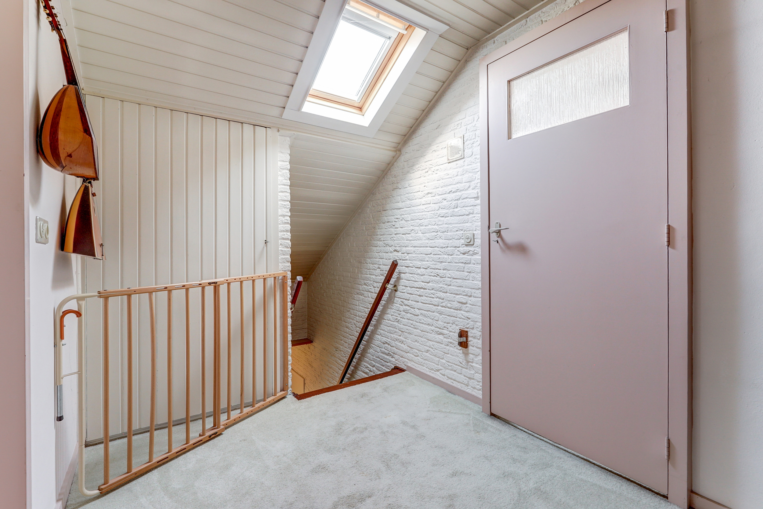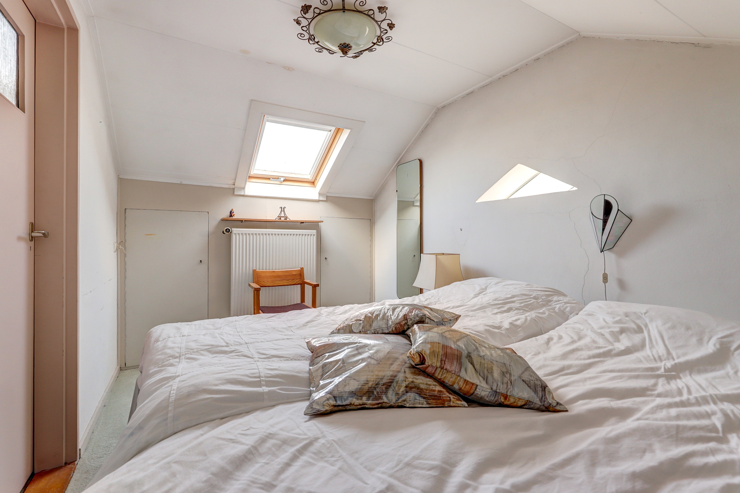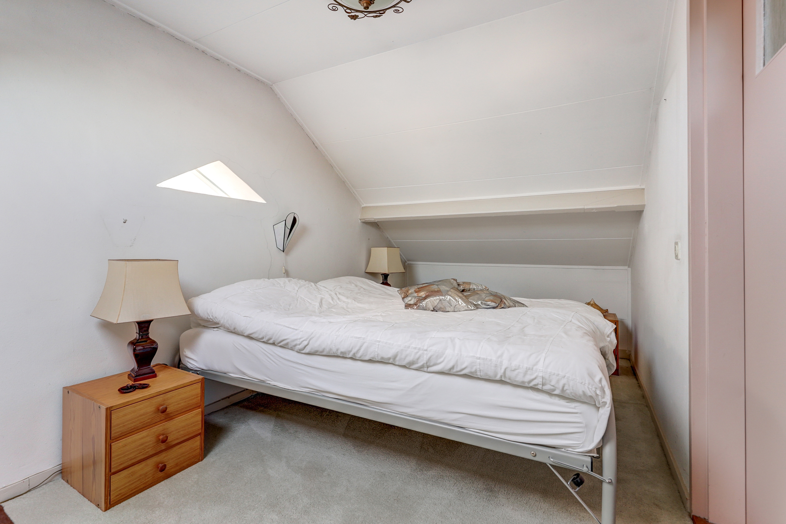 Via de trapgang kom je op de overloop met dakvenster, knieschotten voor extra bergruimte en toegang tot de 2 slaapkamers. De grootste slaapkamer is zeer royaal en heeft 2 dakvensters, vaste kasten, wastafel met koud en warm water en knieschotten. De 2de slaapkamer heeft een dakvenster en een vaste kast die toegang geeft naar een royale bergruimte. Deze bergruimte heeft een hoogte van ca. 1,30 m.