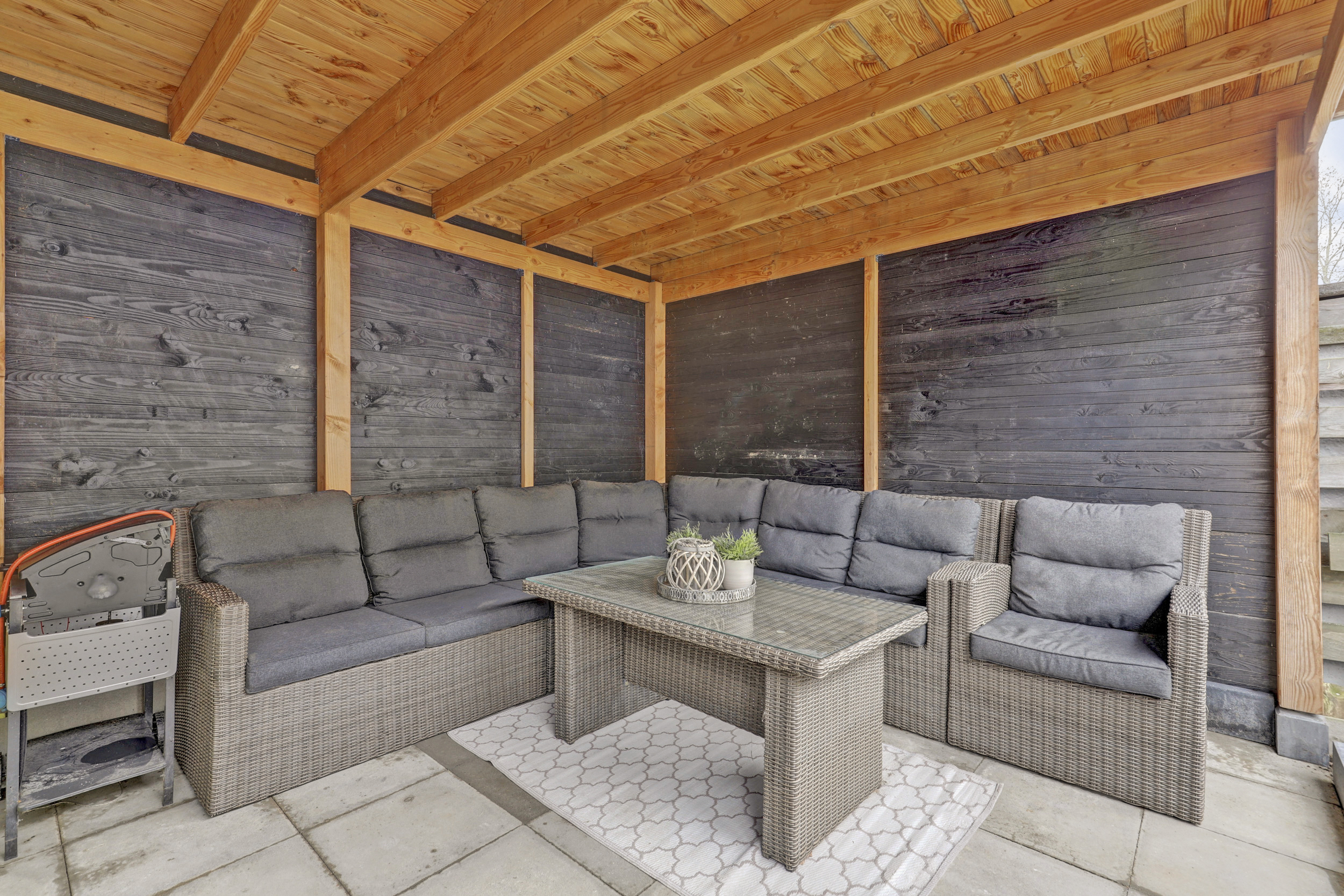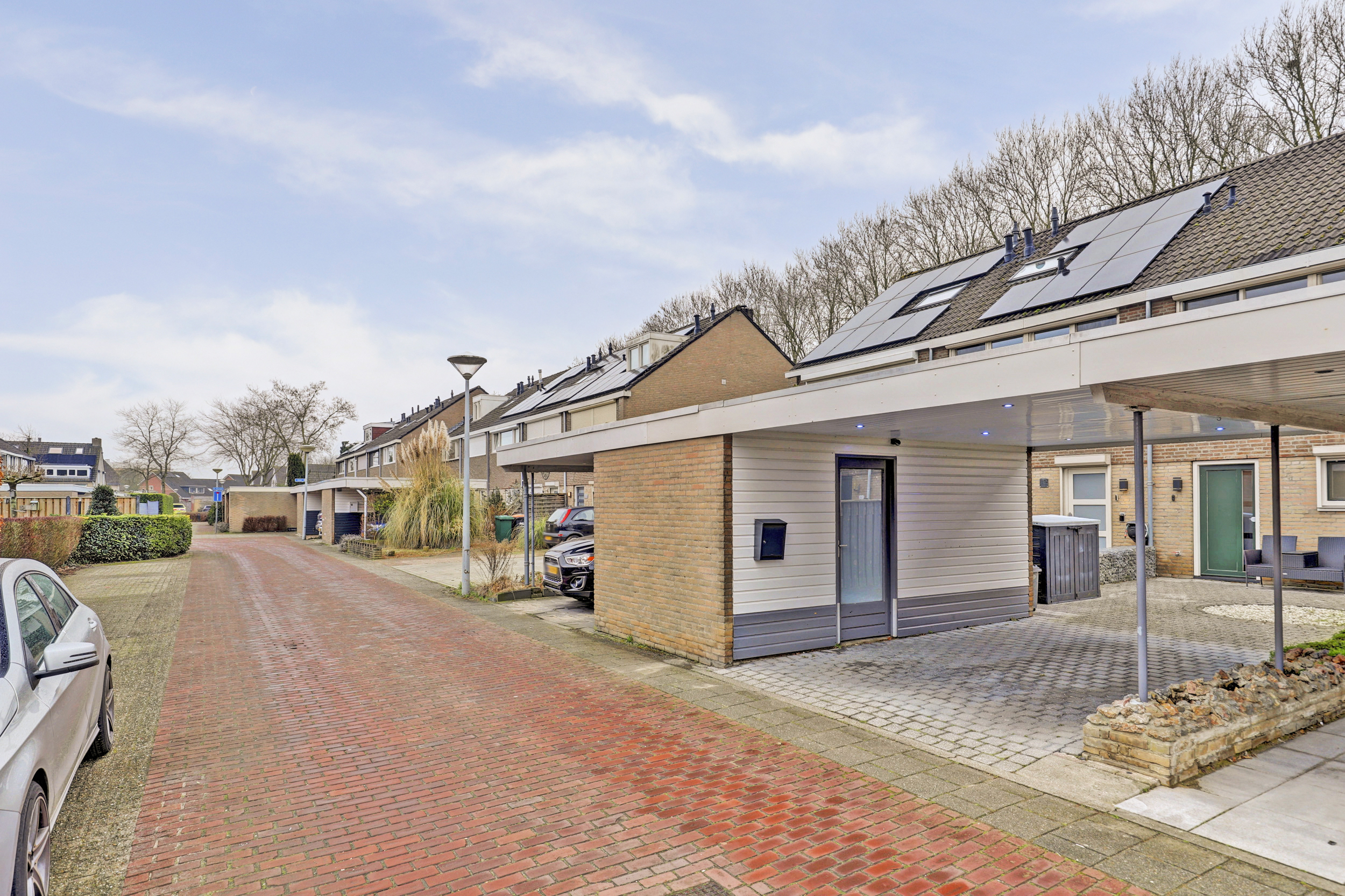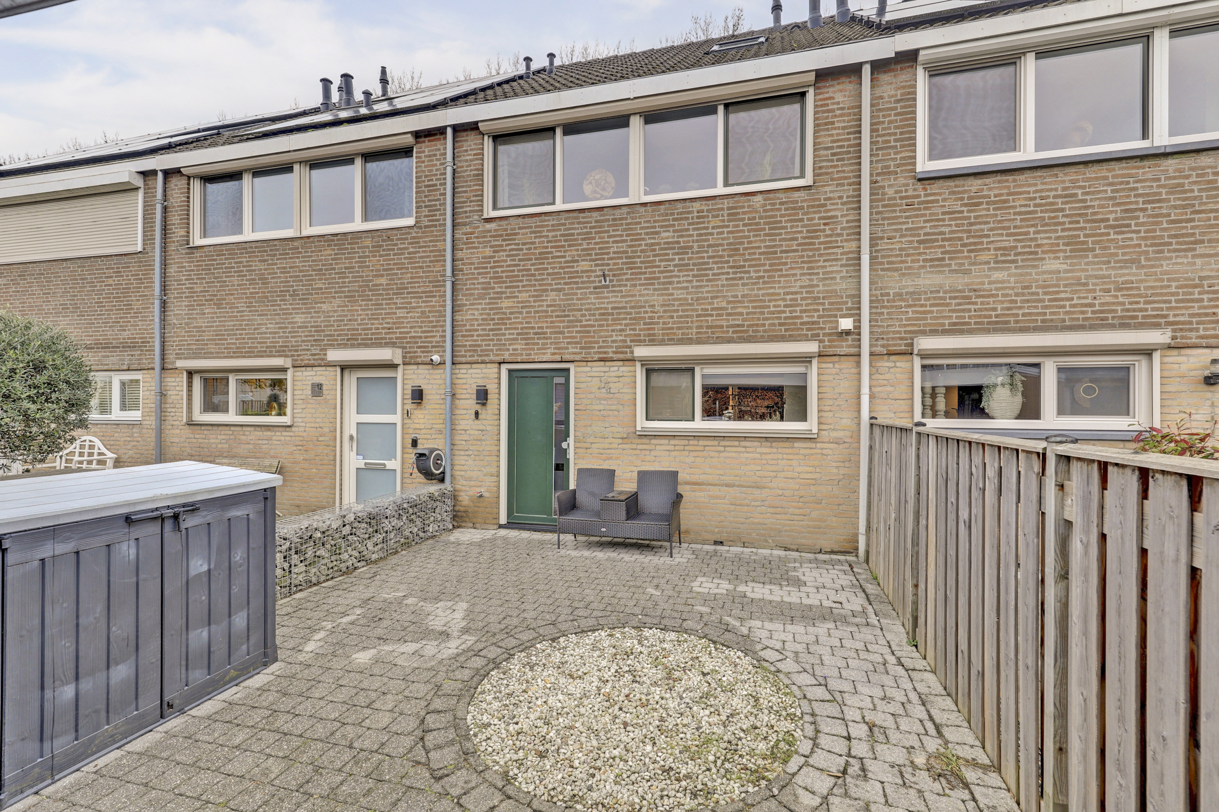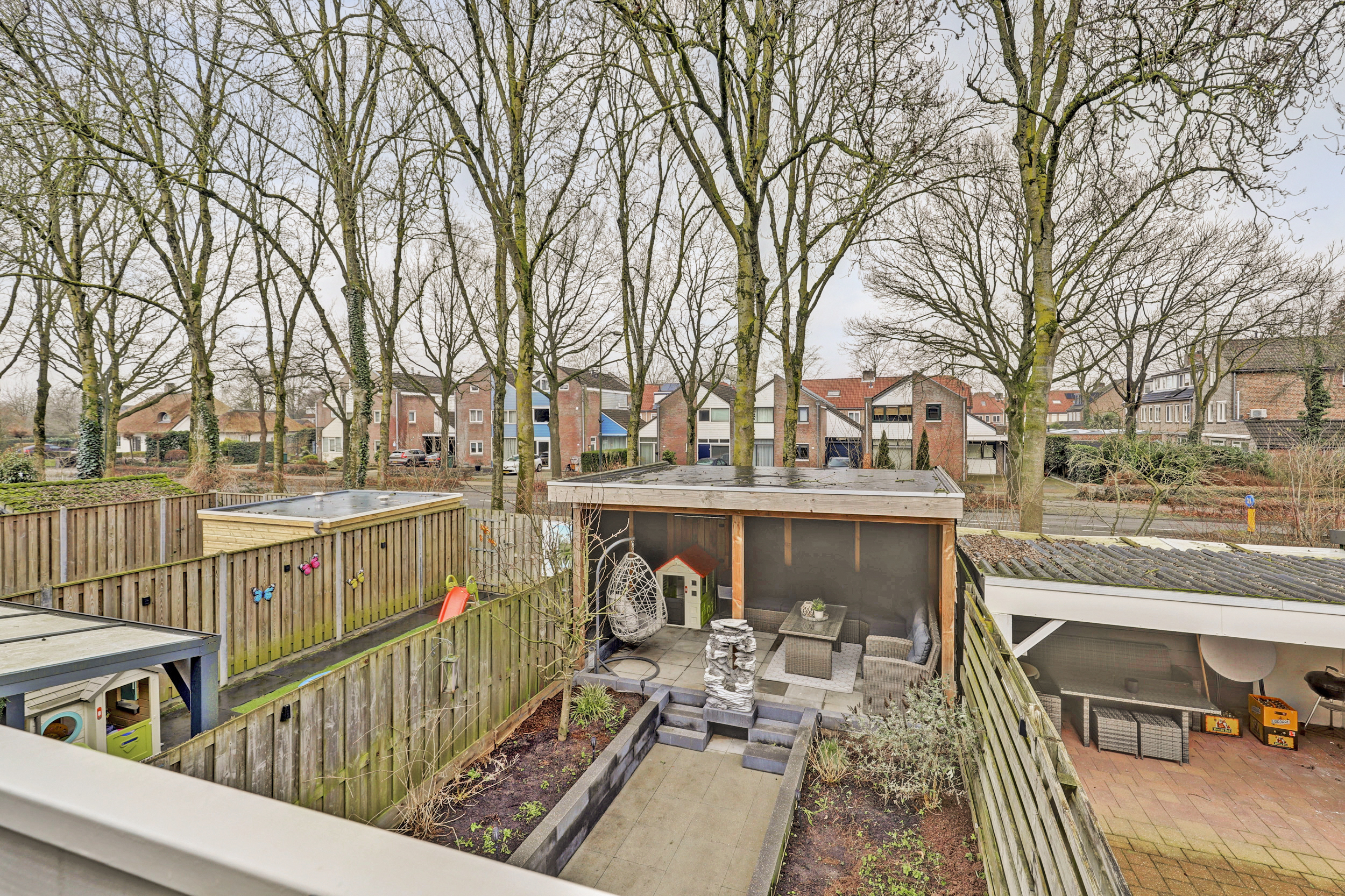 De achtertuin is circa 11 meter diep en gelegen op het noordwesten. Voldoende zon voor de zonliefhebber en doordat er aan de achterzijde geen bebouwing is beschikt de tuin over voldoende privacy. Fraaie overkapping. Aan de voorzijde van de woning bevindt zich de stenen berging en is er parkeergelegenheid voor een auto onder de carport.