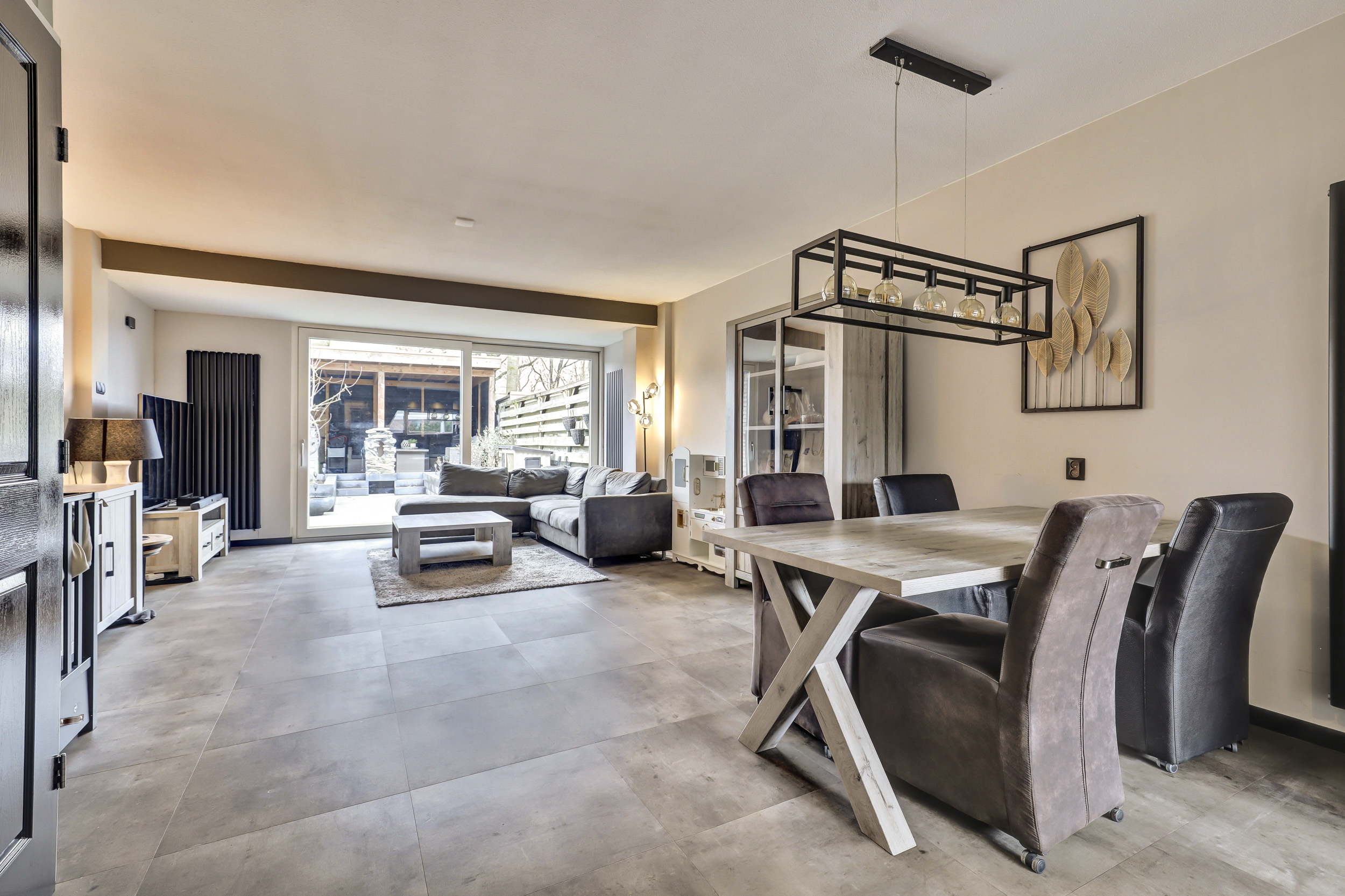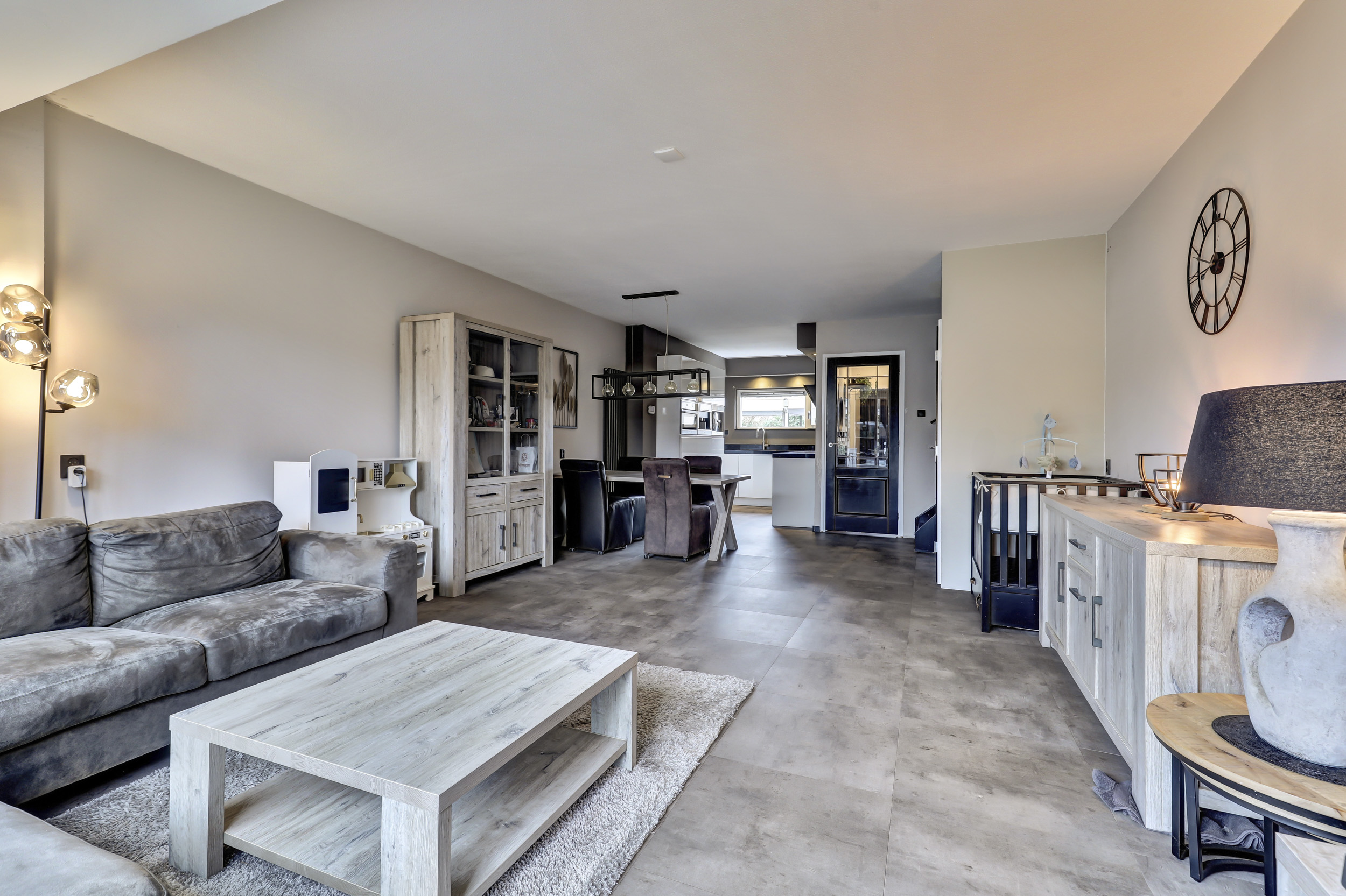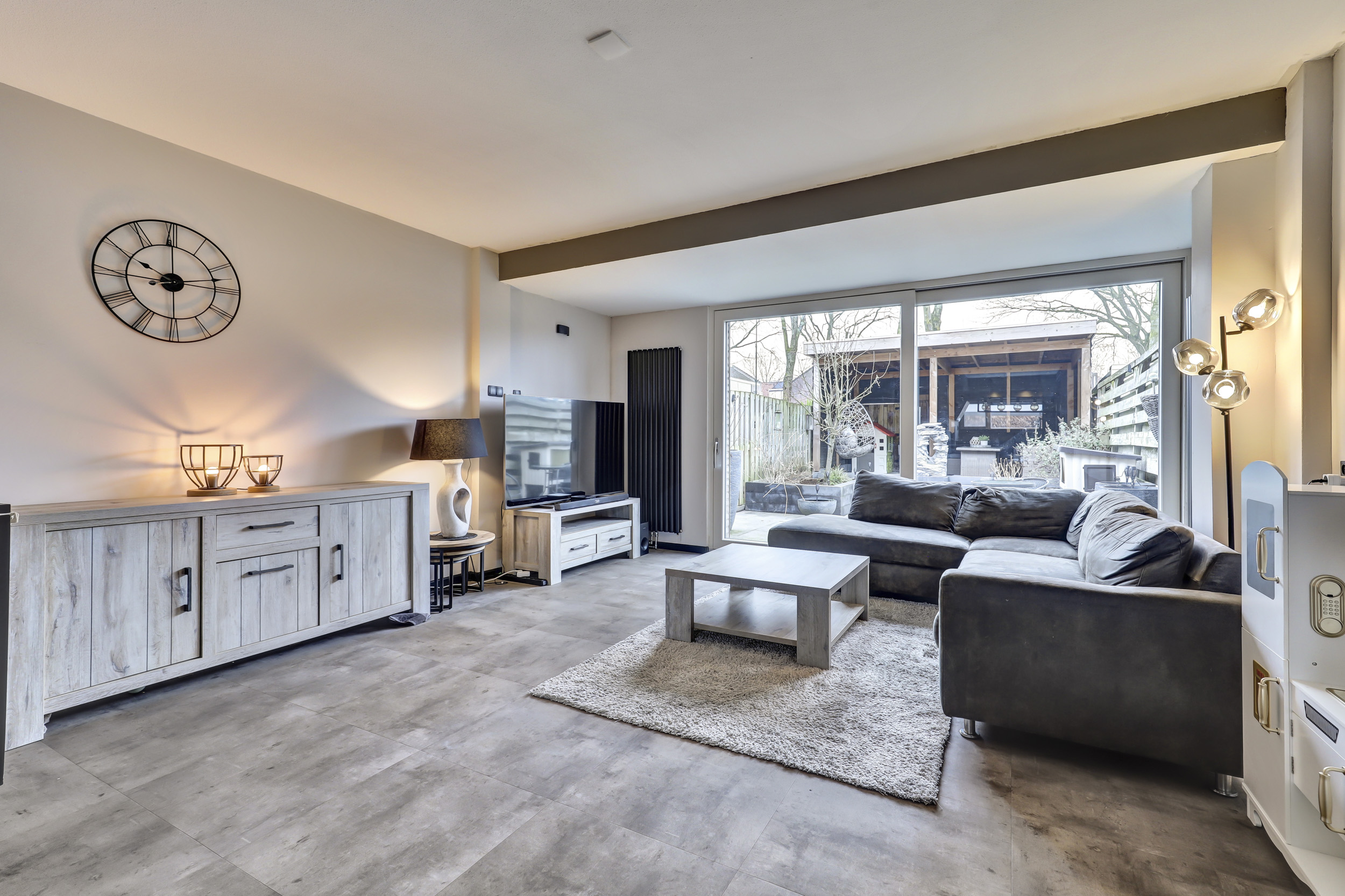 De woonkamer is ruim, tuingericht en aan de achterzijde een stukje uitgebouwd. De achtergevel is tevens voorzien van een grote kunststof schuifpui voorzien van veel glas welke toegang biedt tot de achtertuin. De gehele begane grond is voorzien van een fraaie PVC-tegelvloer. In de woonkamer is de trapopgang naar de eerste verdiepingsvloer.